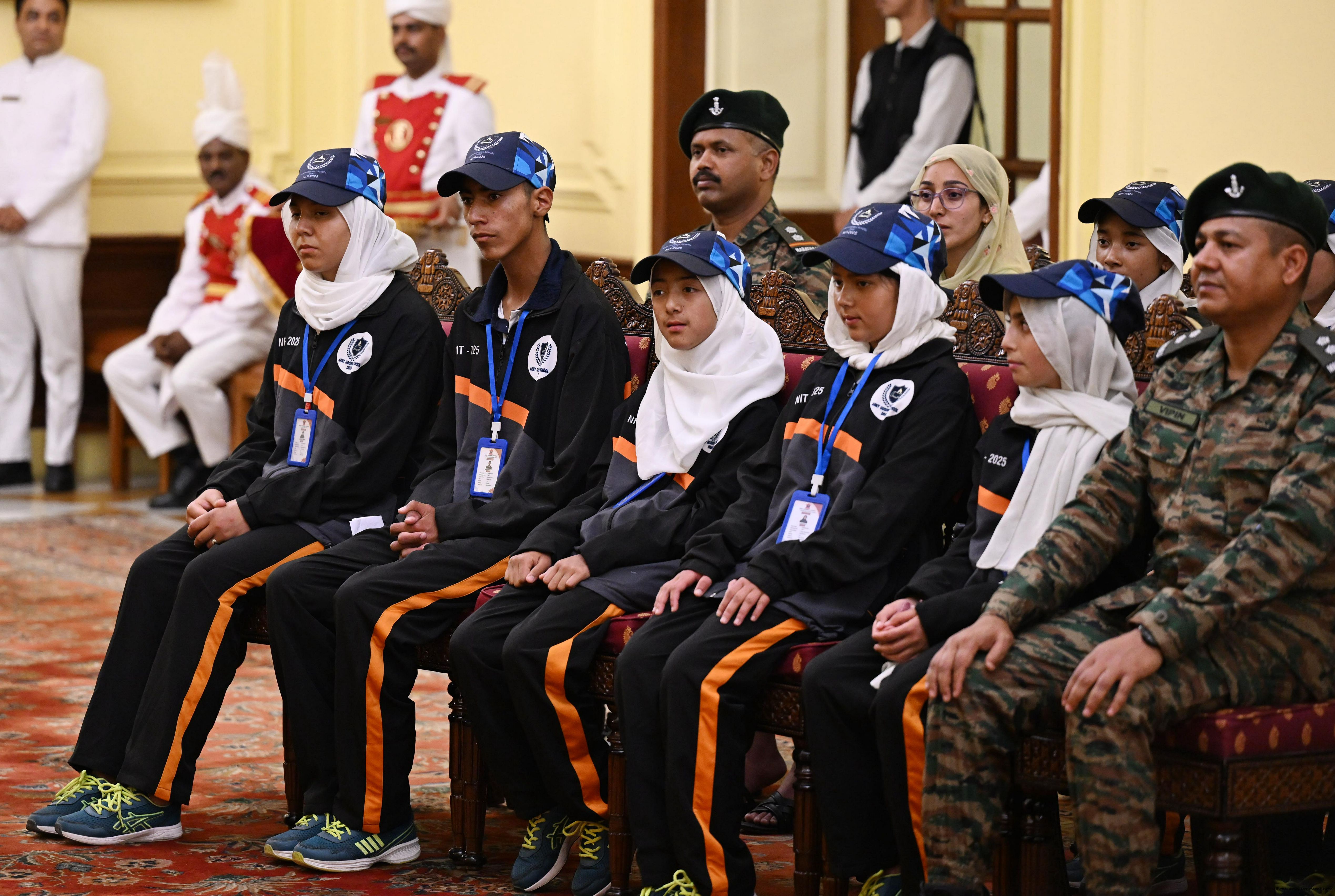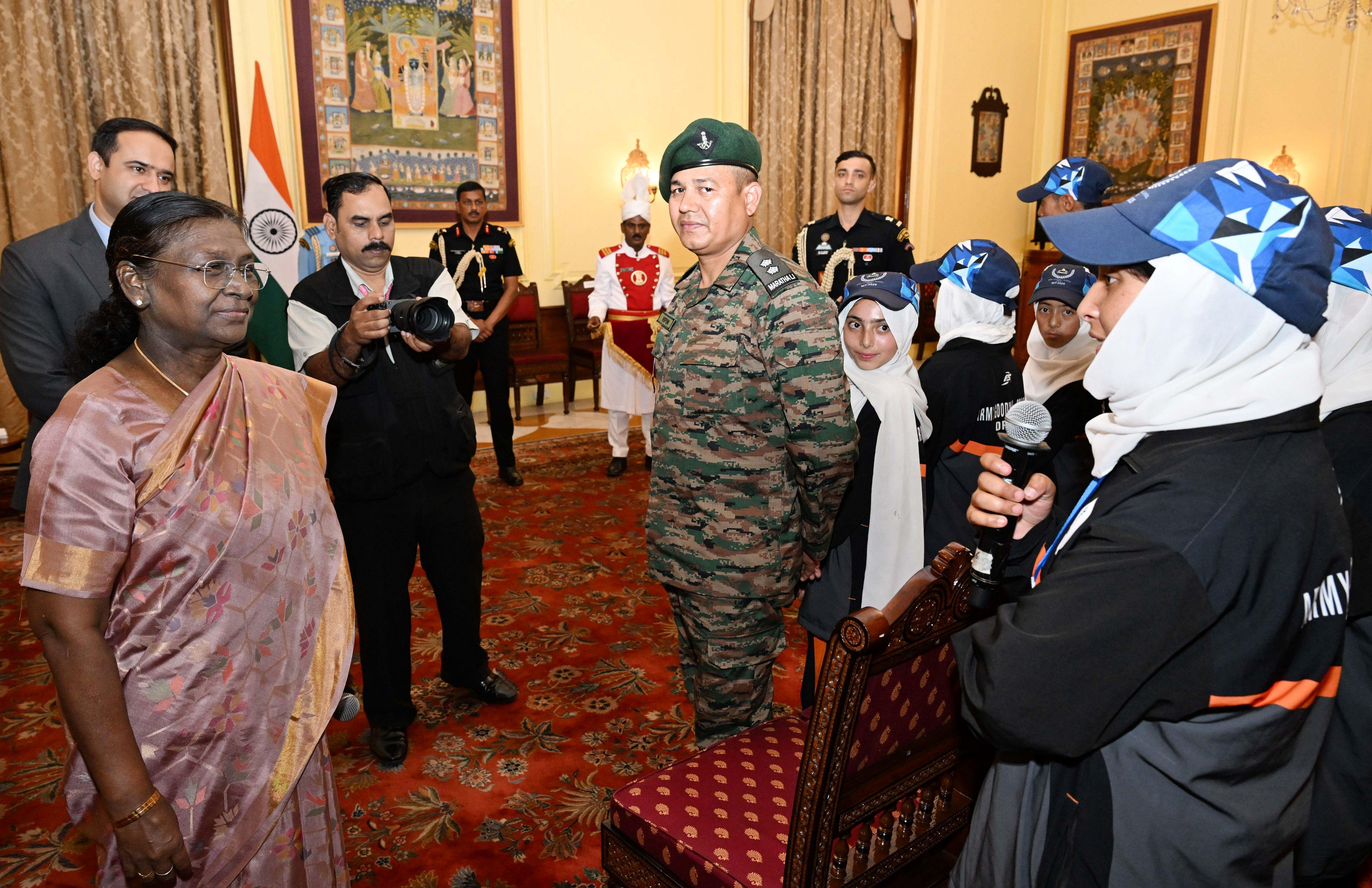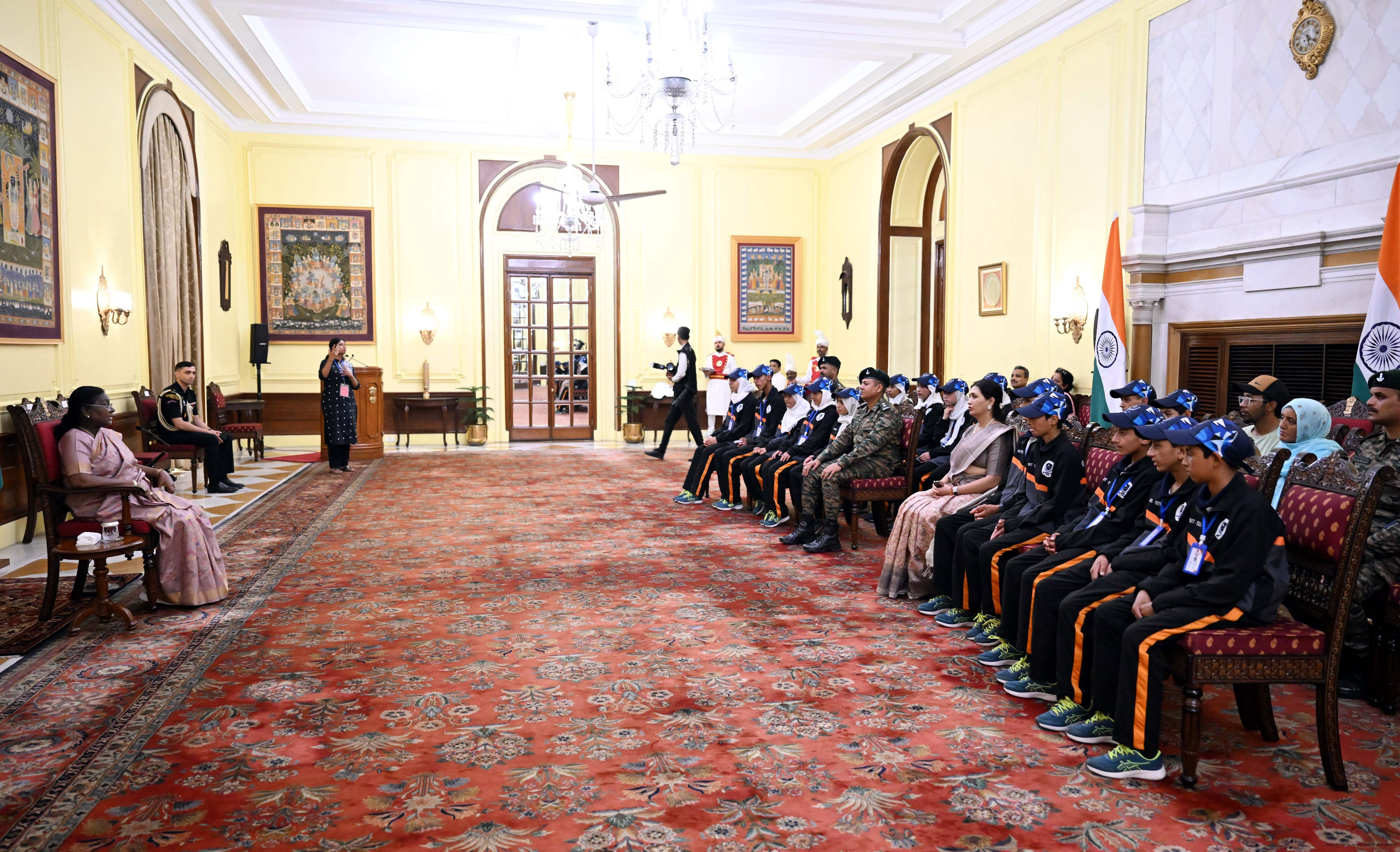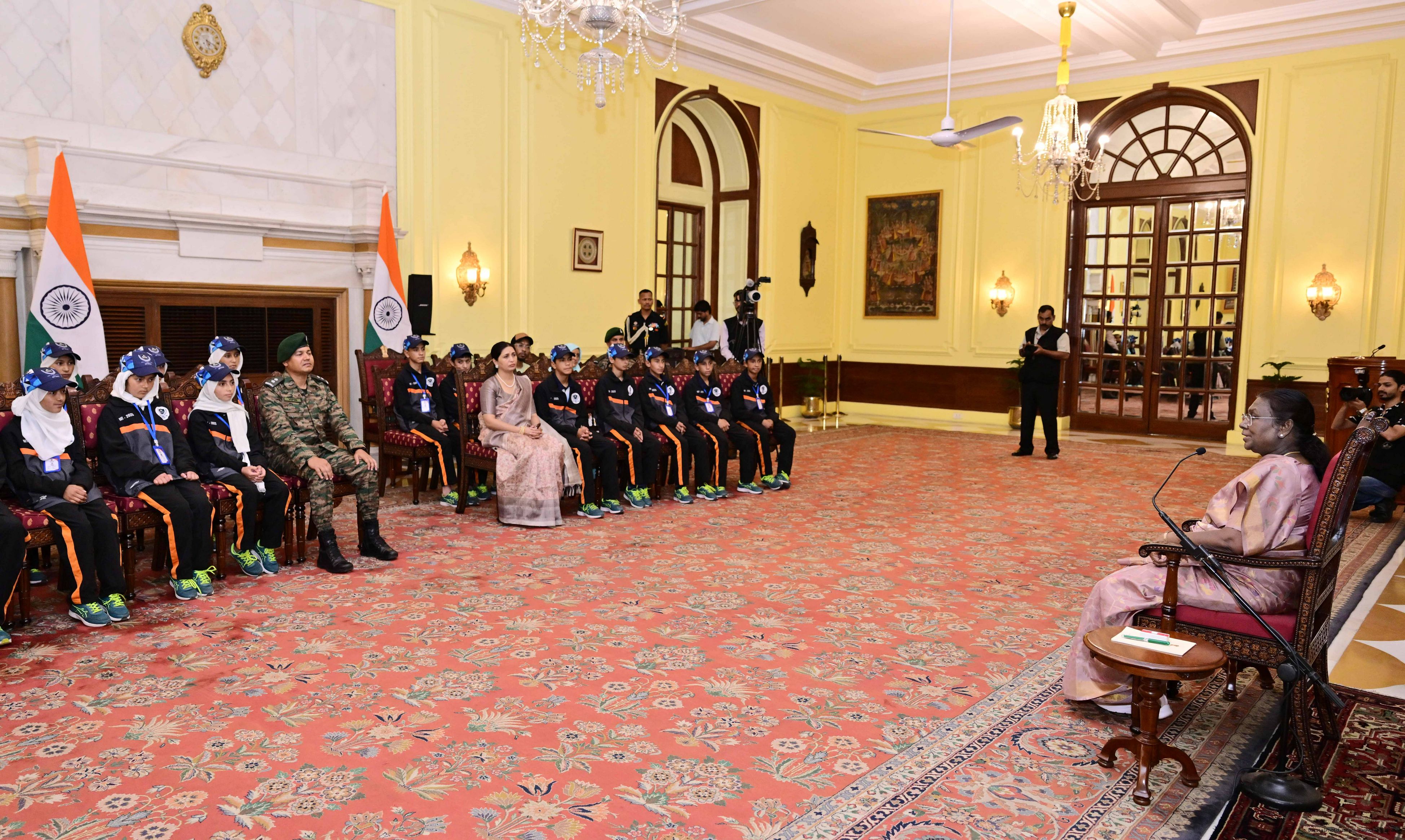 | Caption: | A group of students from Army Goodwill School, Dras, Ladakh called on the President of India, Smt. Droupadi Murmu at Rashtrapati Bhavan June 3, 2025. The group visited Rashtrapati Bhavan as part of the National Integration Tour. |