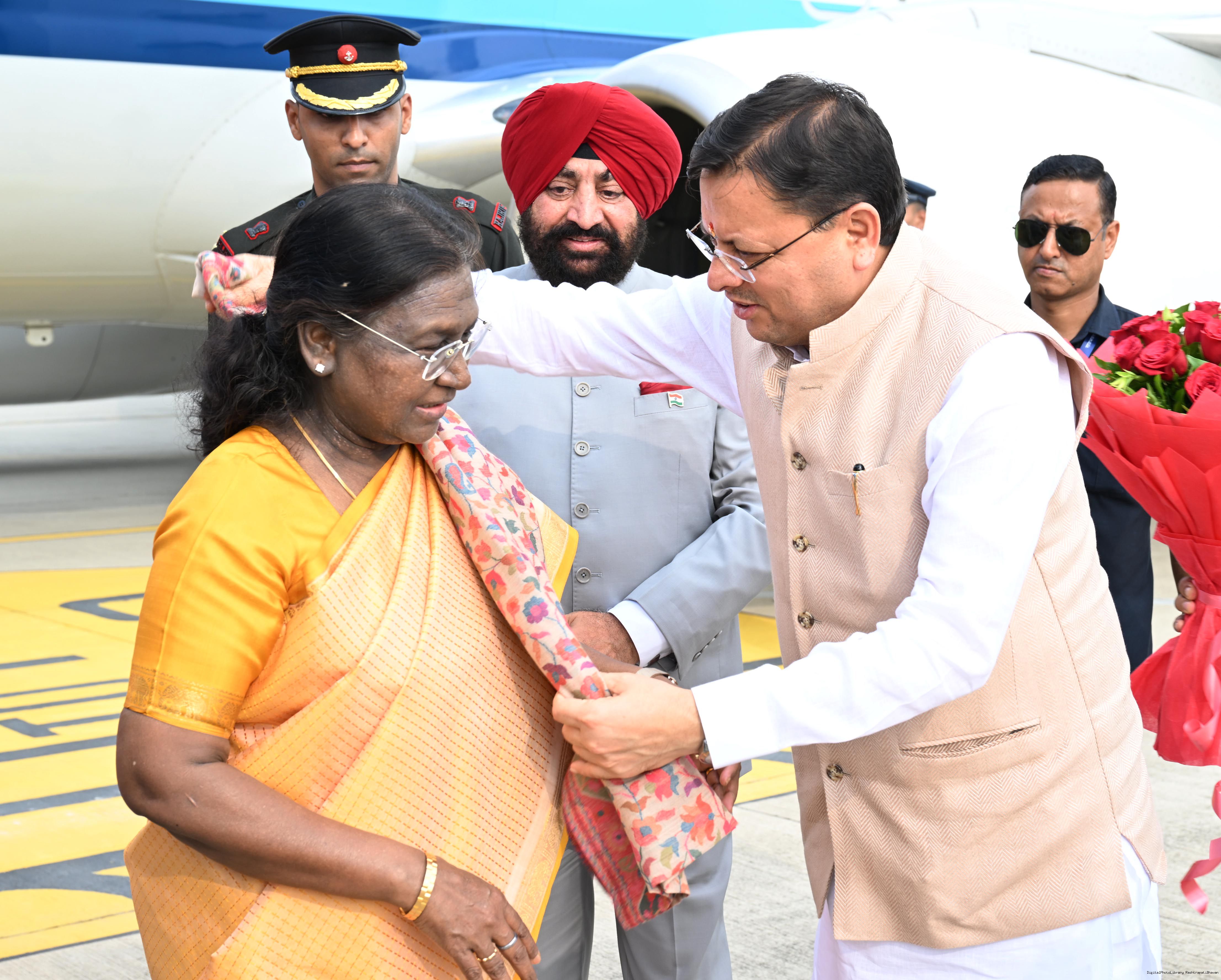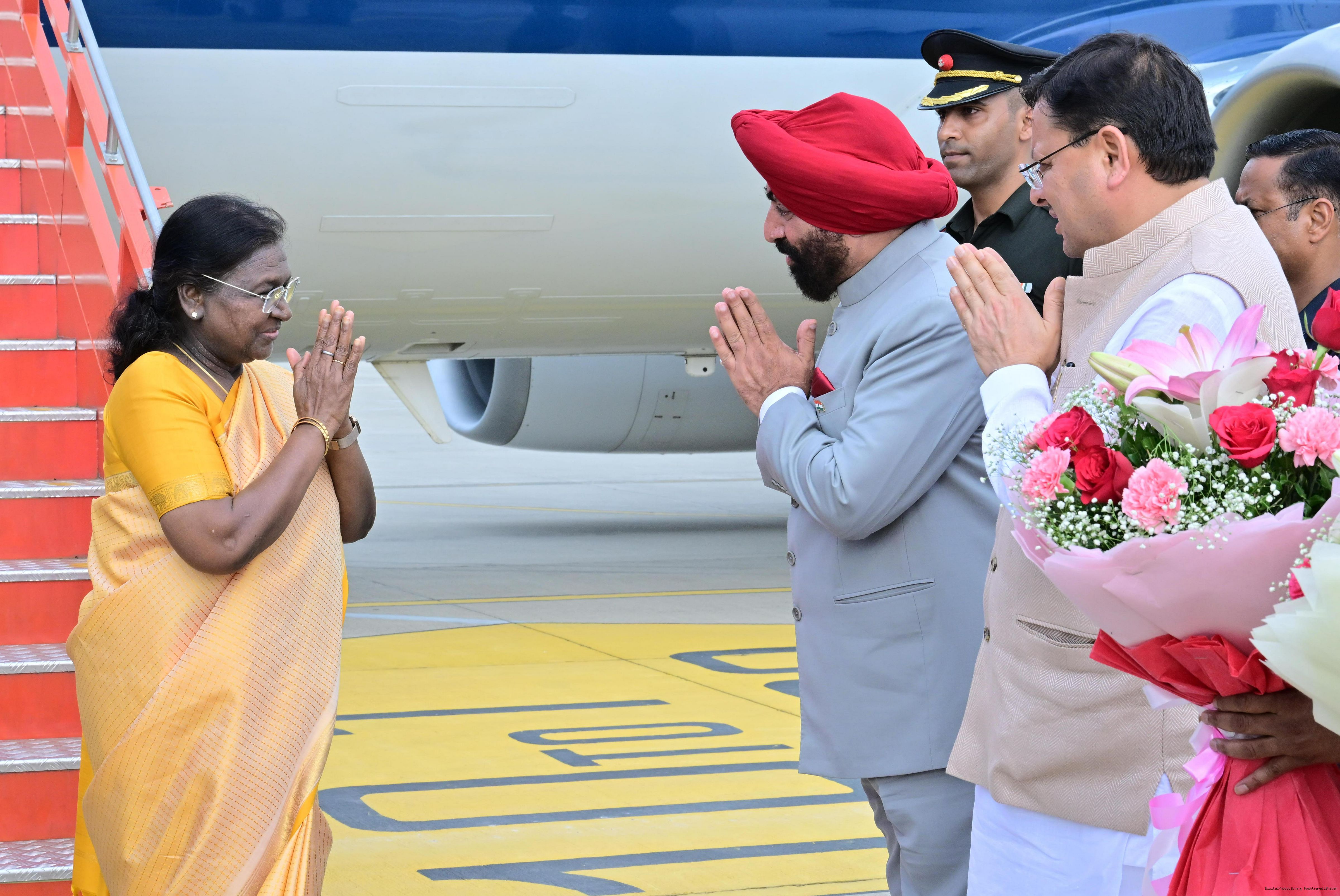 | Caption: | The Governor of Uttarakhand, Lt Gen Gurmit Singh (Retd.) and Chief Minister, Shri Pushkar Singh Dhami received the President of India, Smt Droupadi Murmu on her arrival at Dehradun on June 19, 2025. |