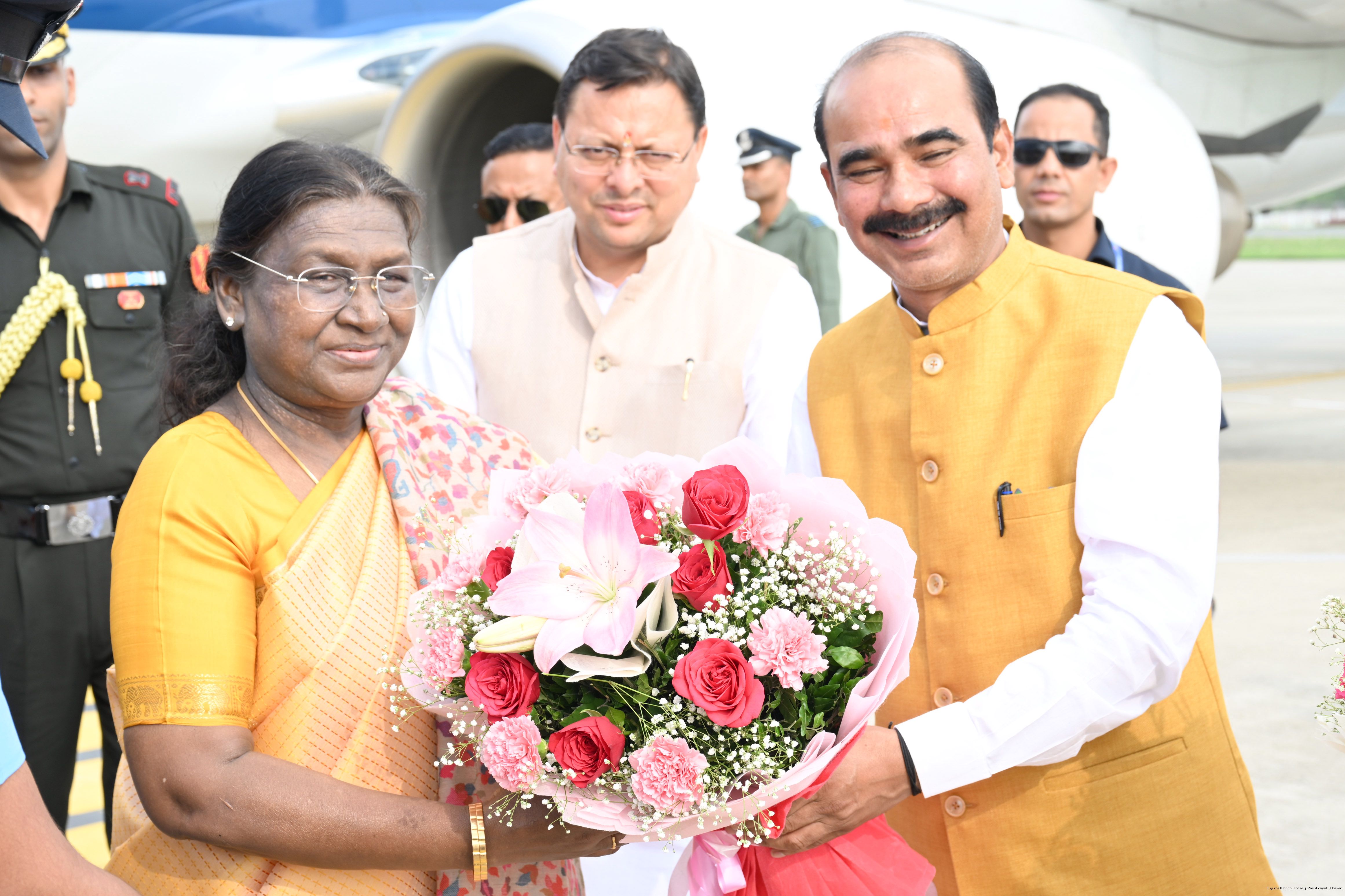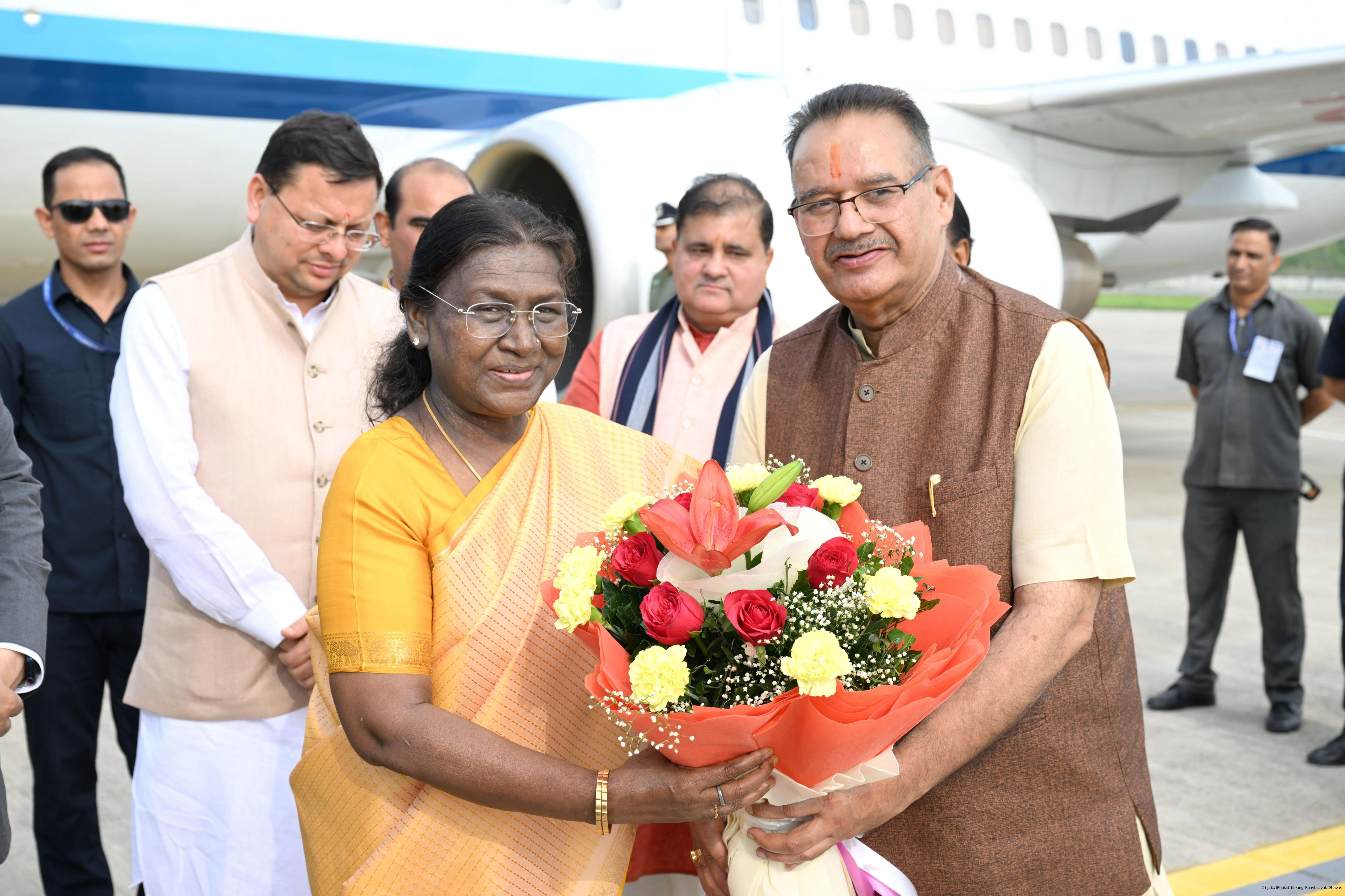 | Caption: | The Governor of Uttarakhand, Lt Gen Gurmit Singh (Retd.) and Chief Minister, Shri Pushkar Singh Dhami received the President of India, Smt Droupadi Murmu on her arrival at Dehradun on June 19, 2025. |