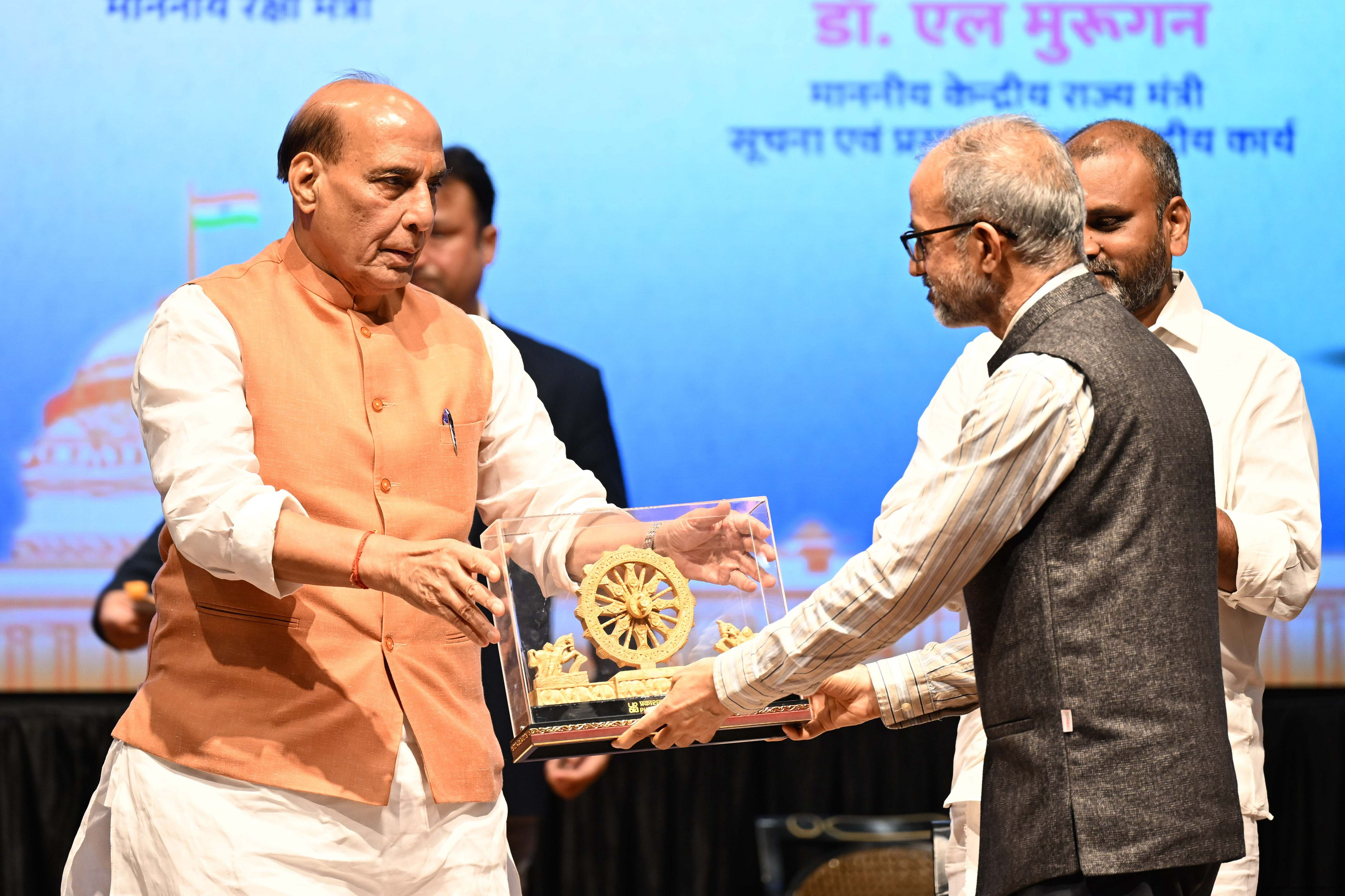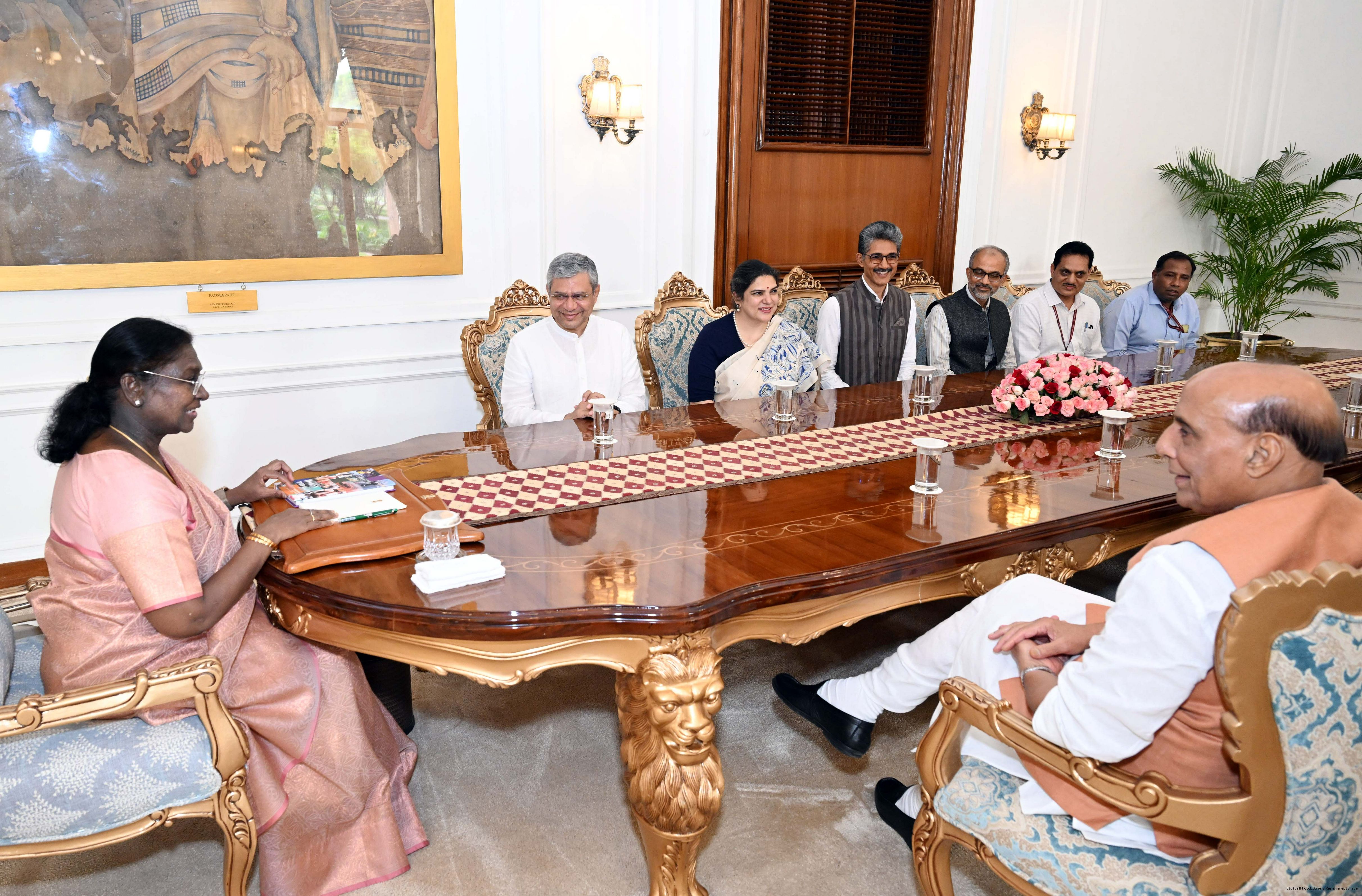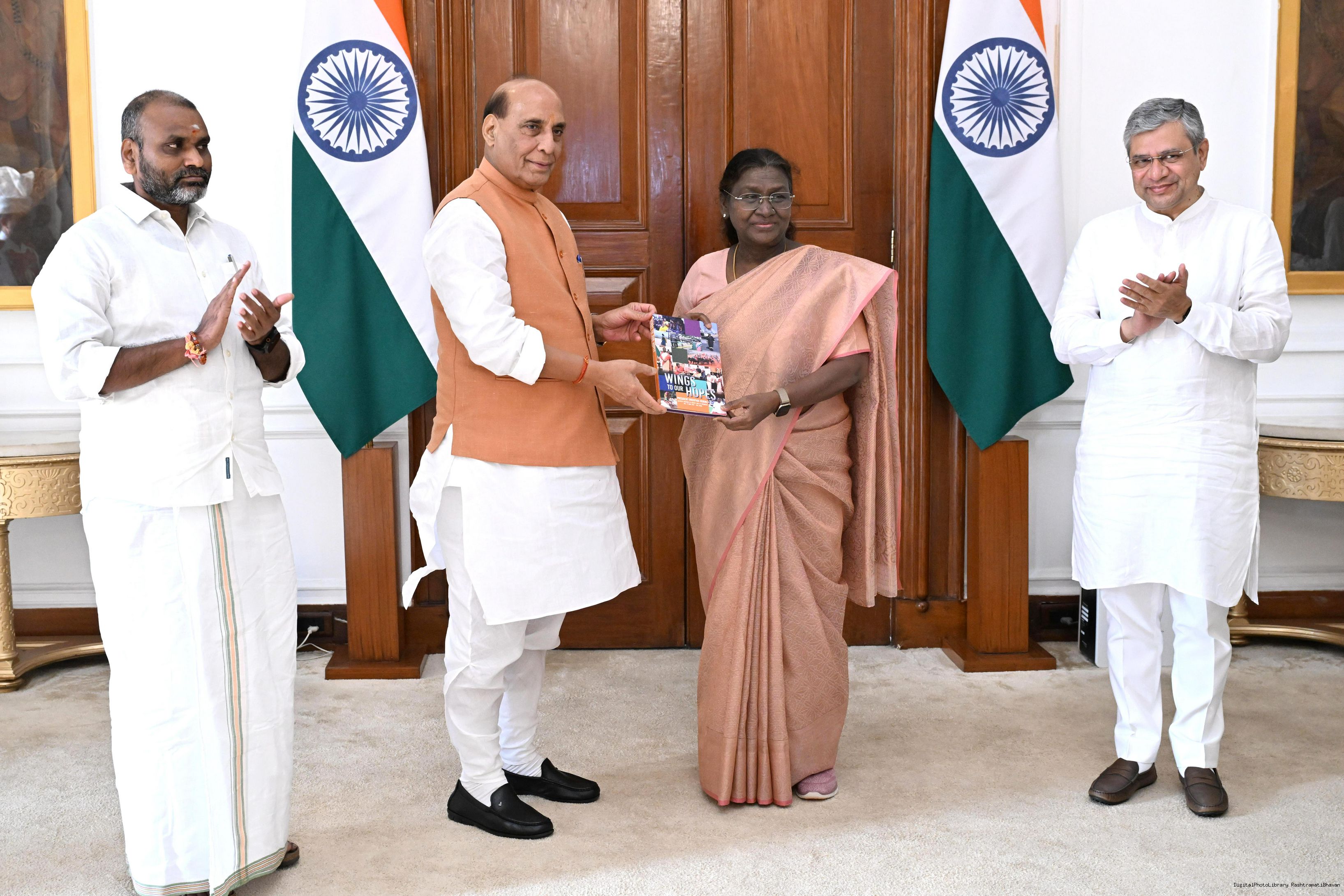 | Caption: | Raksha Mantri, Shri Rajnath Singh, along with Minister of Information Broadcasting, Shri Ashwini Vaishnaw and Minister of State for Information Broadcasting, Dr L. Murugan, presented first copies of the second volume of the books ‘Wings to Our Hopes’ and ‘Aashaon Ki Udaan’ to the President of India, Smt. Droupadi Murmu at Rashtrapati Bhavan on June 23, 2025. |
