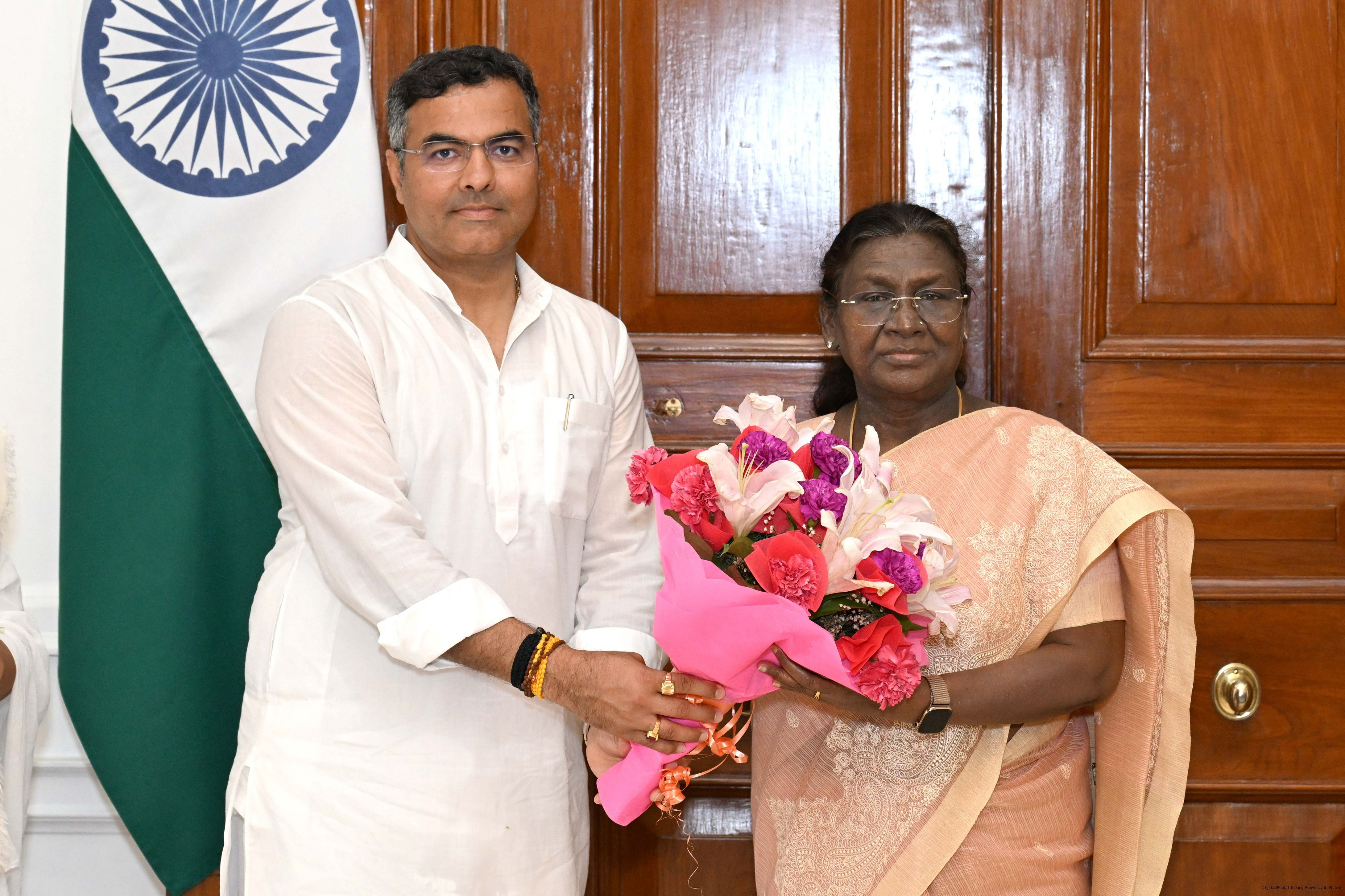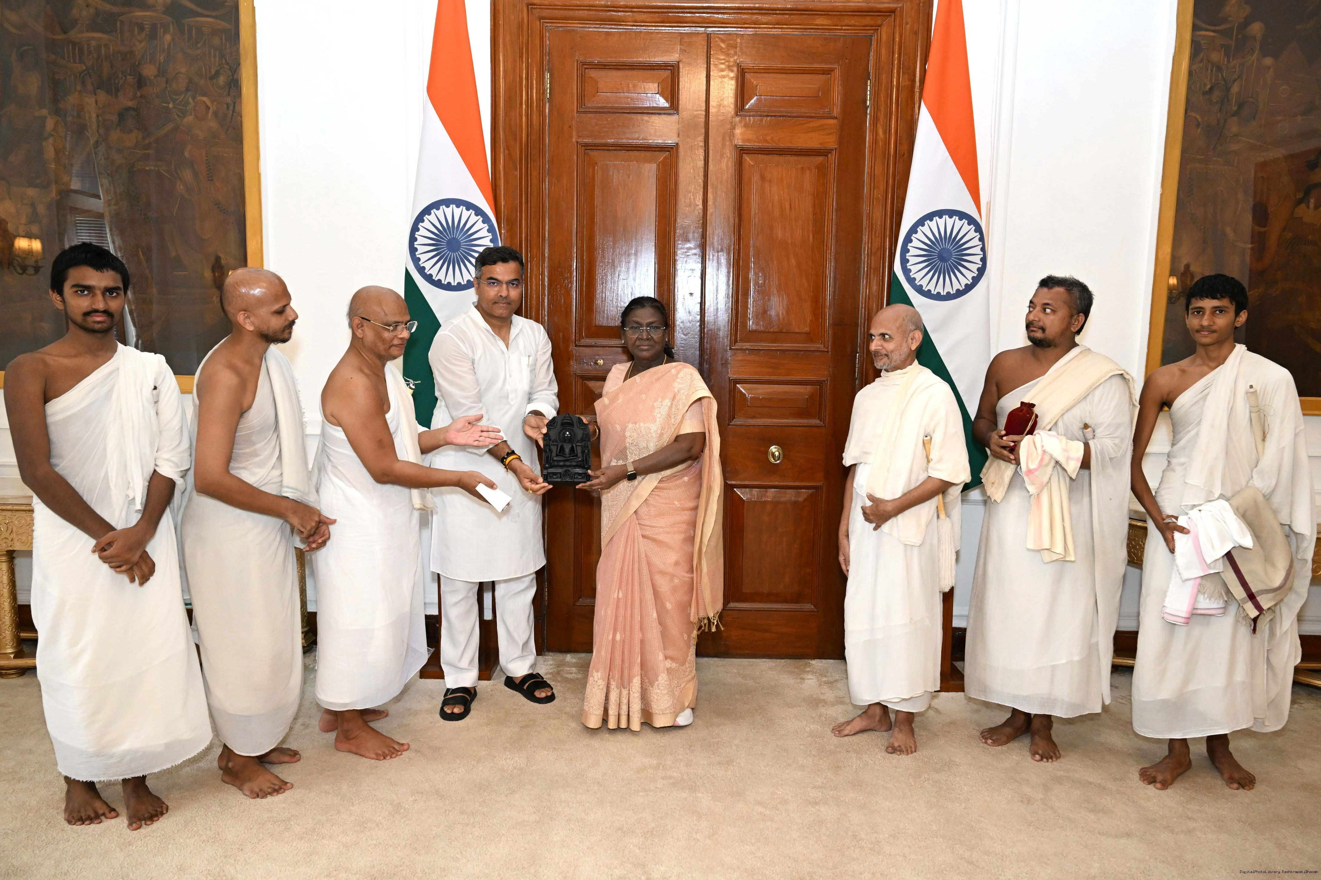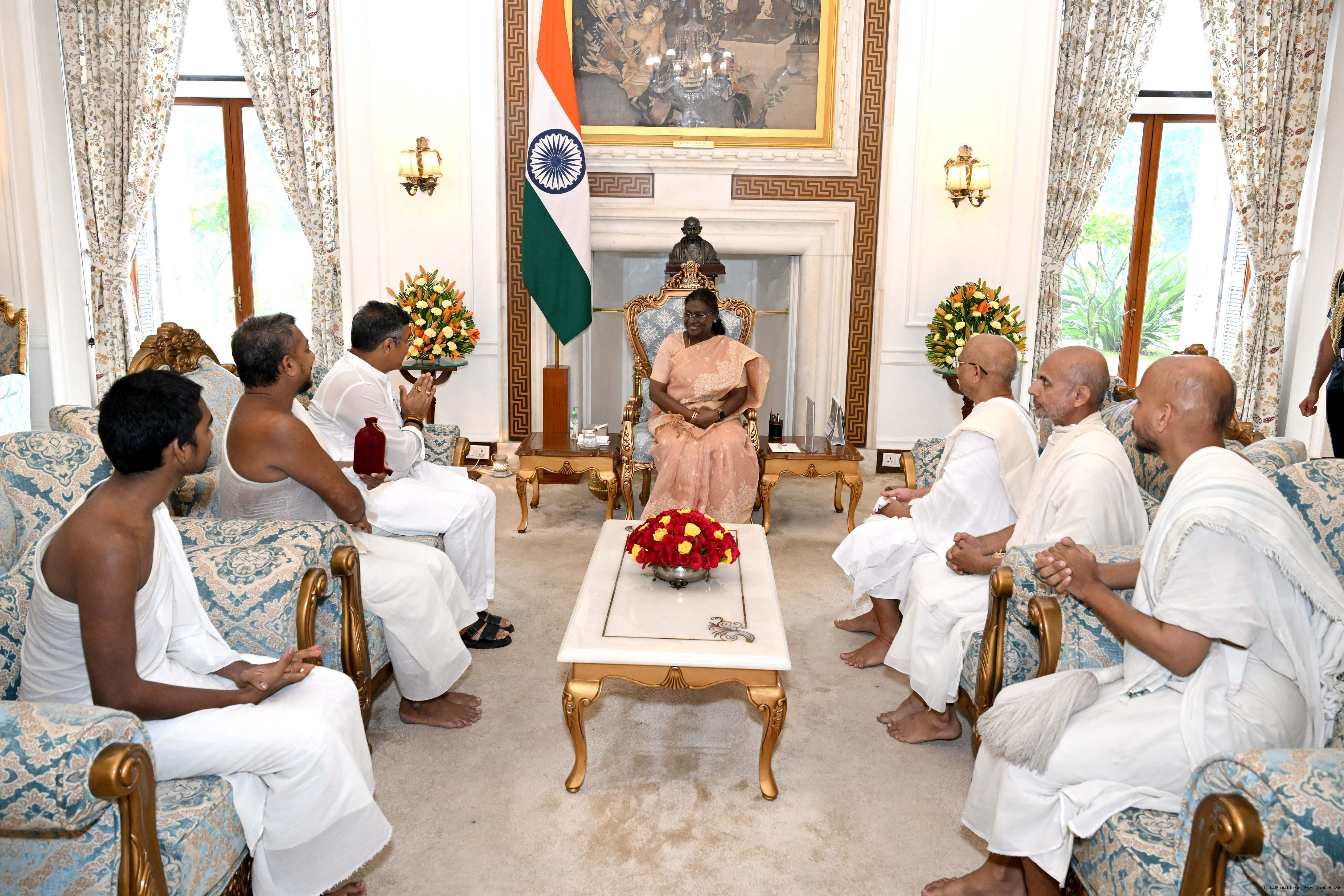 | Caption: | Shri Parvesh Sahib Singh, Minister of PWD along with Acharya Hansratna Surishwar ji Maharaj Sahab and others meeting with the President of India, Smt Droupadi Murmu at Rashtrapati Bhavan on June 23, 2025. |