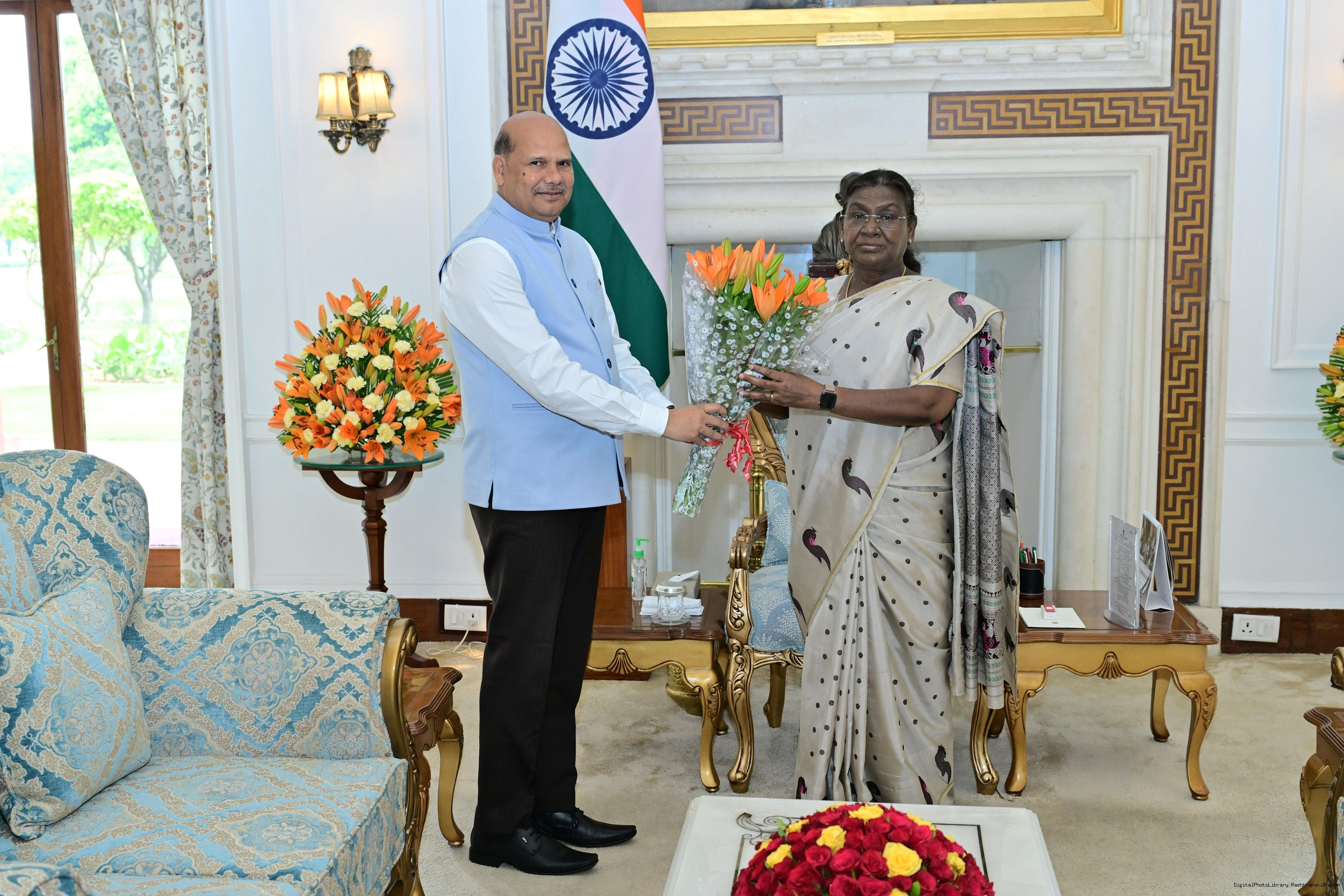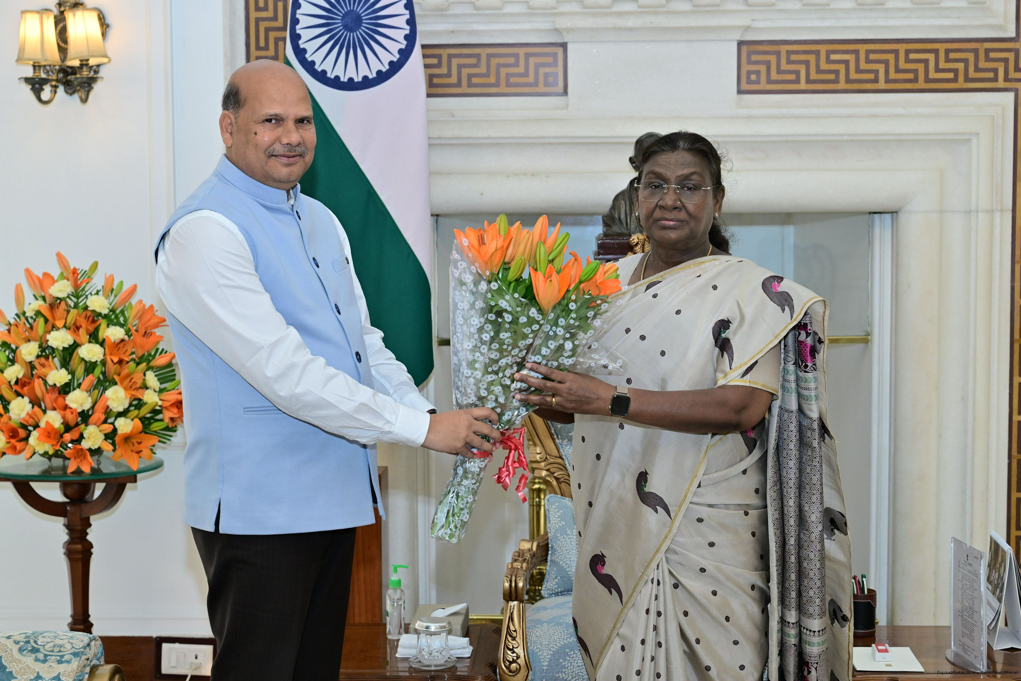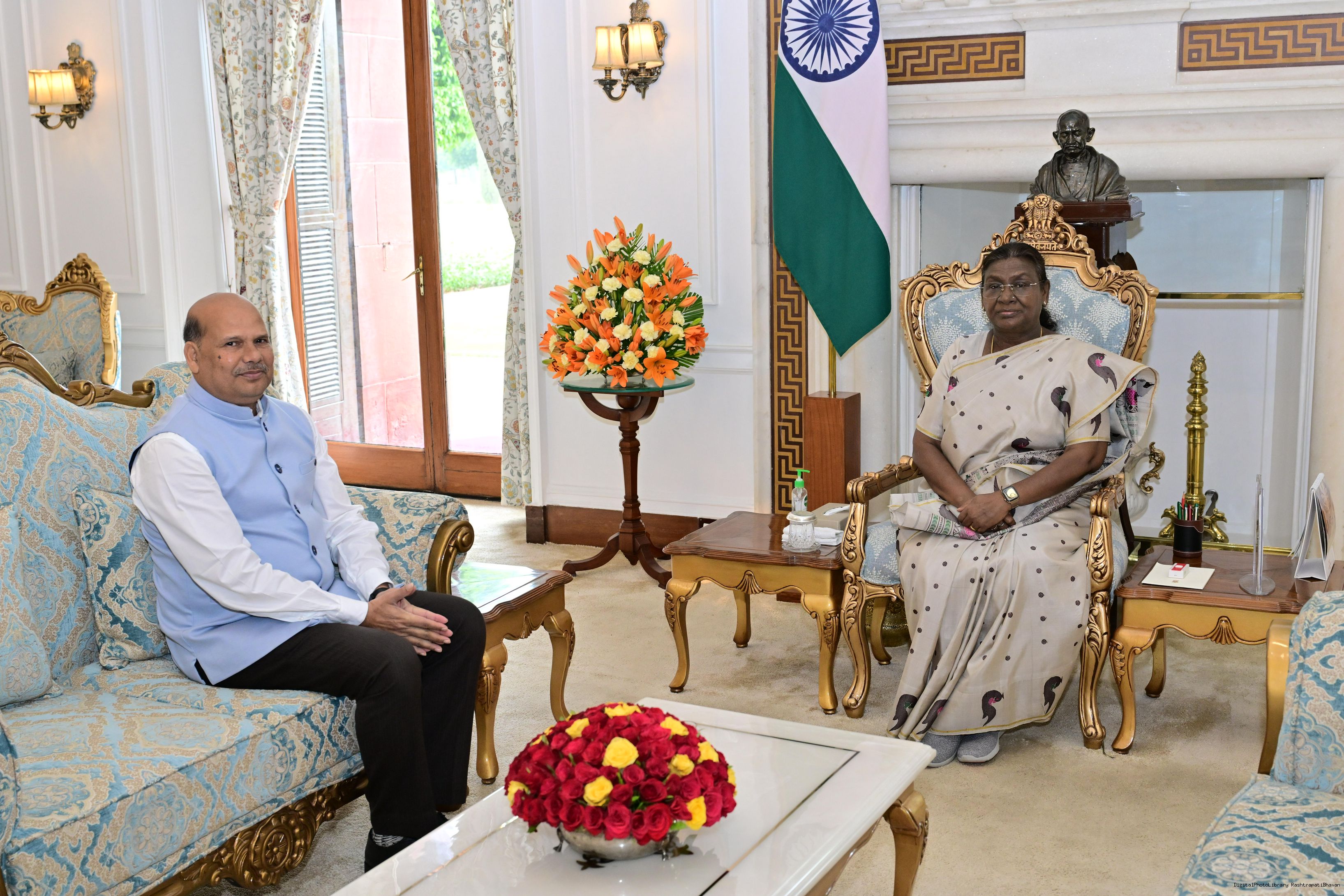 | Caption: | Prof. Byomakesh Tripathy, Vice Chancellor, Indira Gandhi National Tribal University, Amarkantak, Dist. Anuppur, MP meeting with the President of India, Smt Droupadi Murmu at Rashtrapati Bhavan on June 24, 2025. |