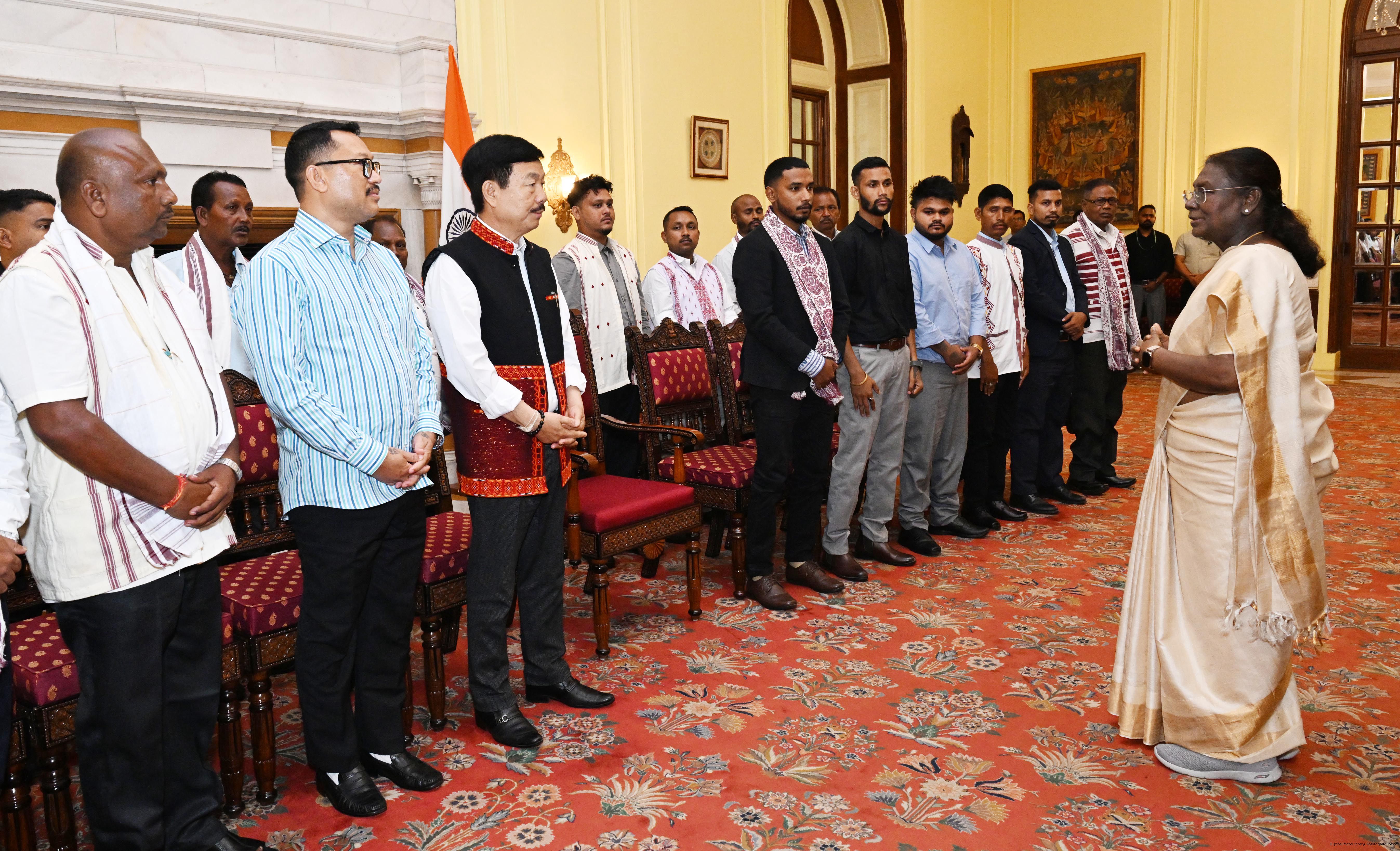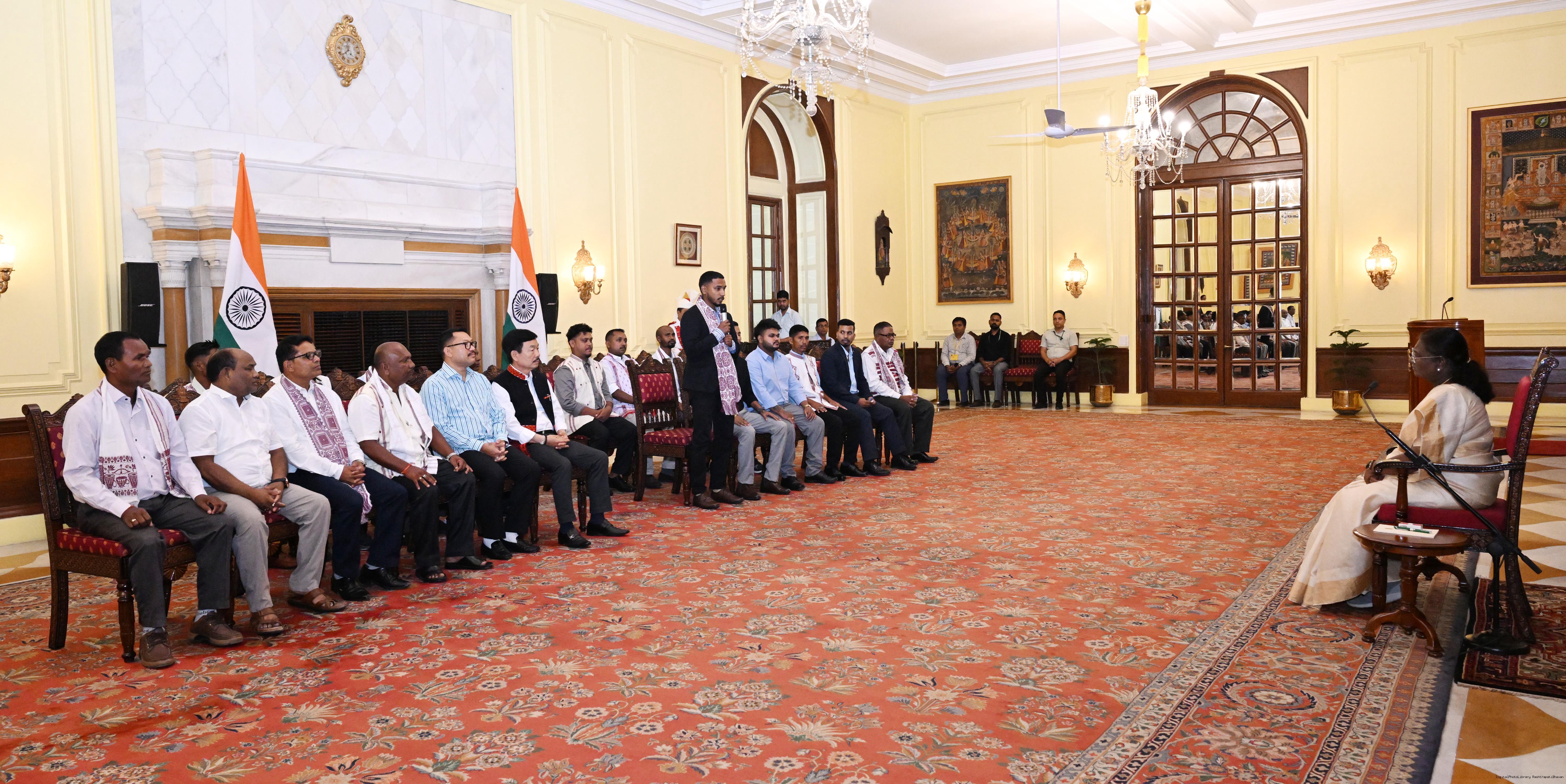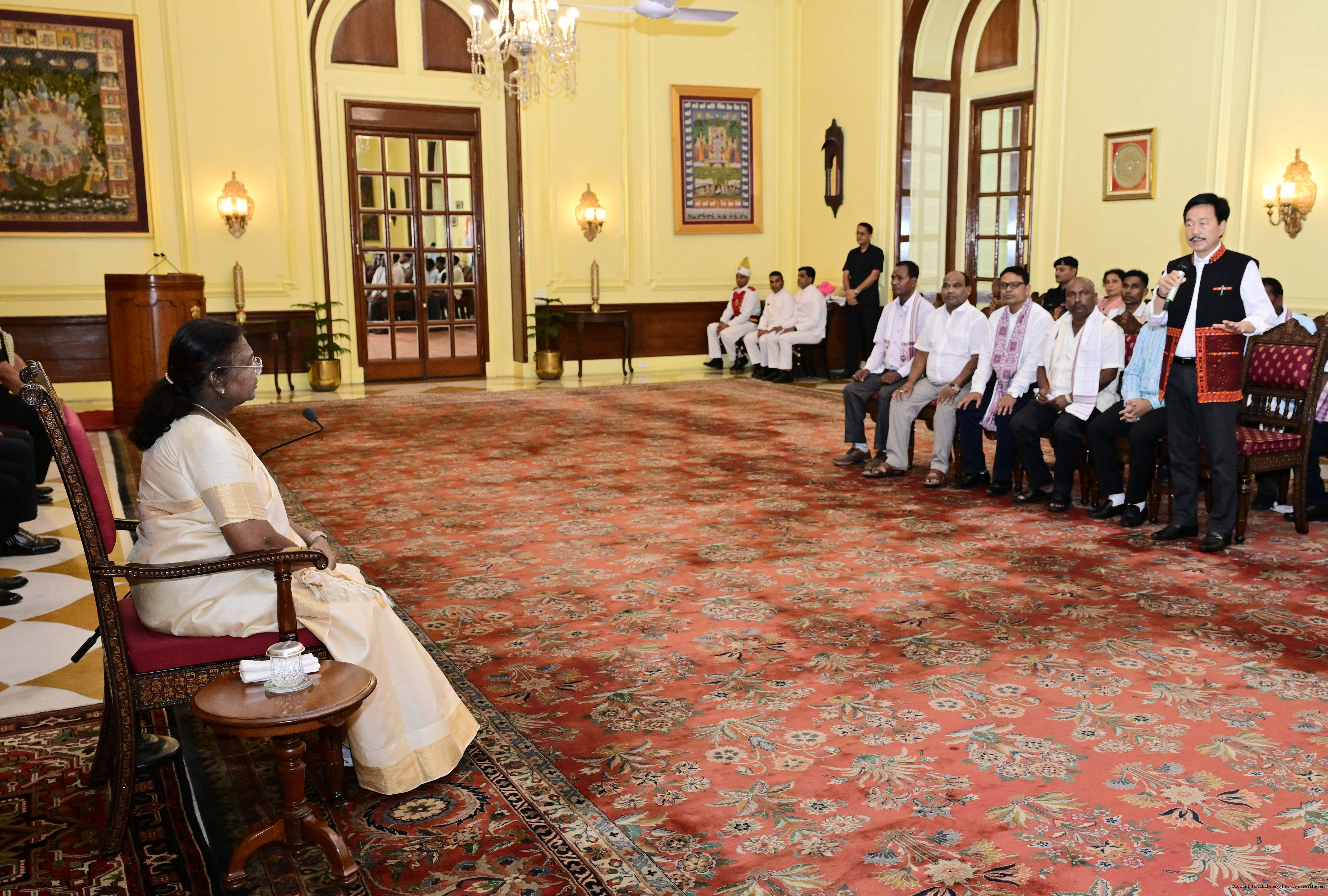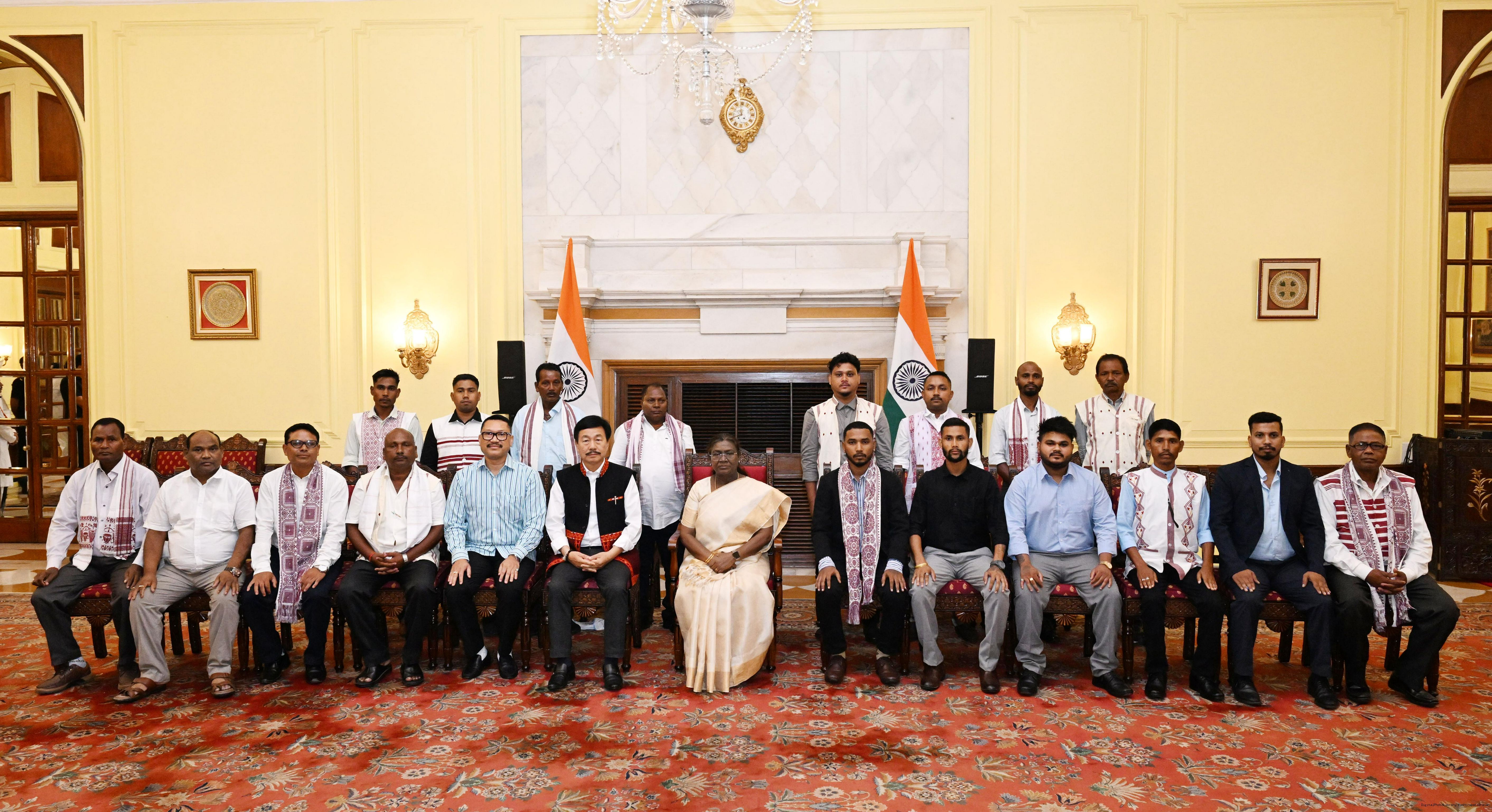 | Caption: | The President of India, Smt. Droupadi Murmu posing a group photographs with 21 persons consisting of Shri Tapir Gao, MP (Lok Sabha) from Arunachal Pradesh along with 20 others at Rashtrapati Bhavan on June 25, 2025. |