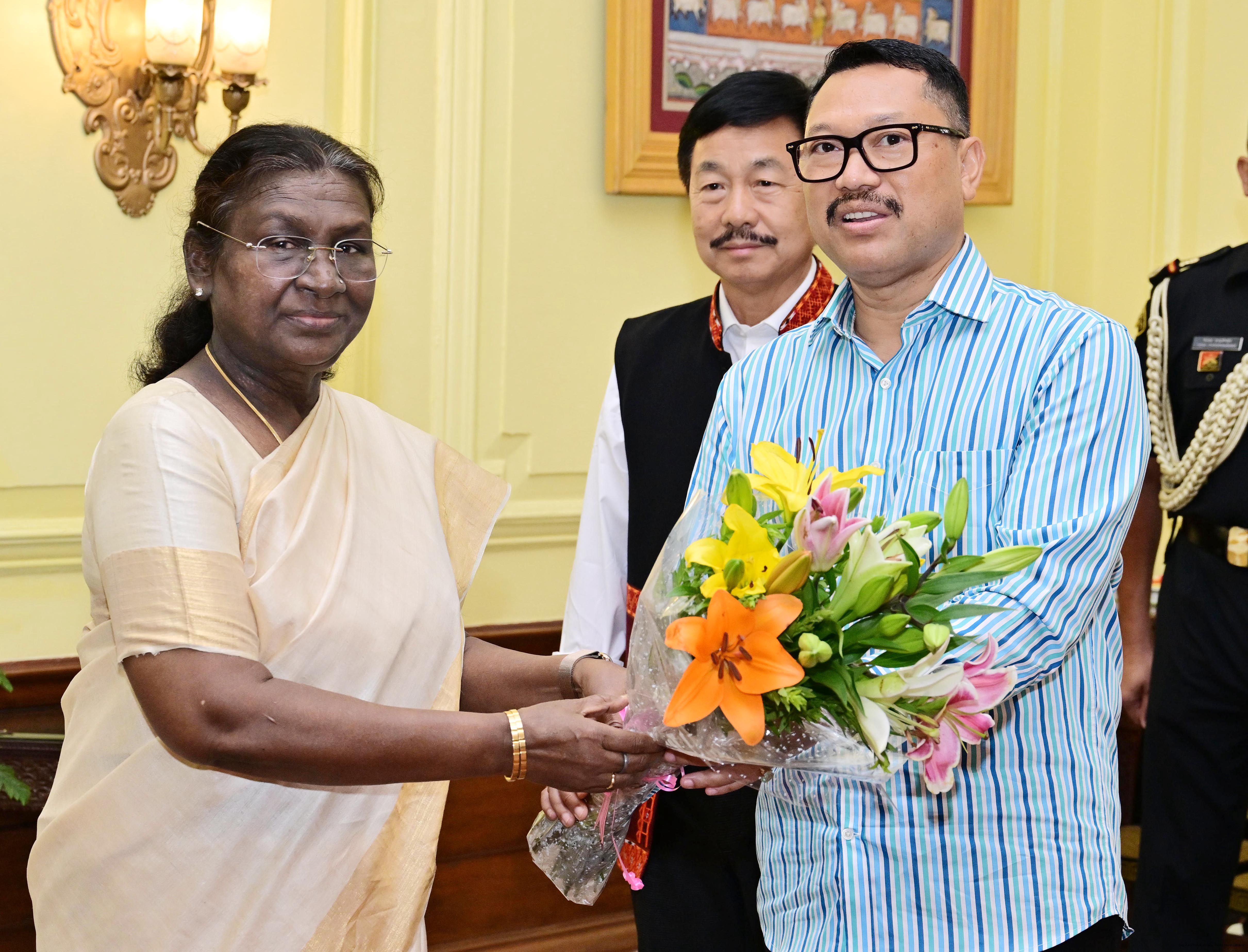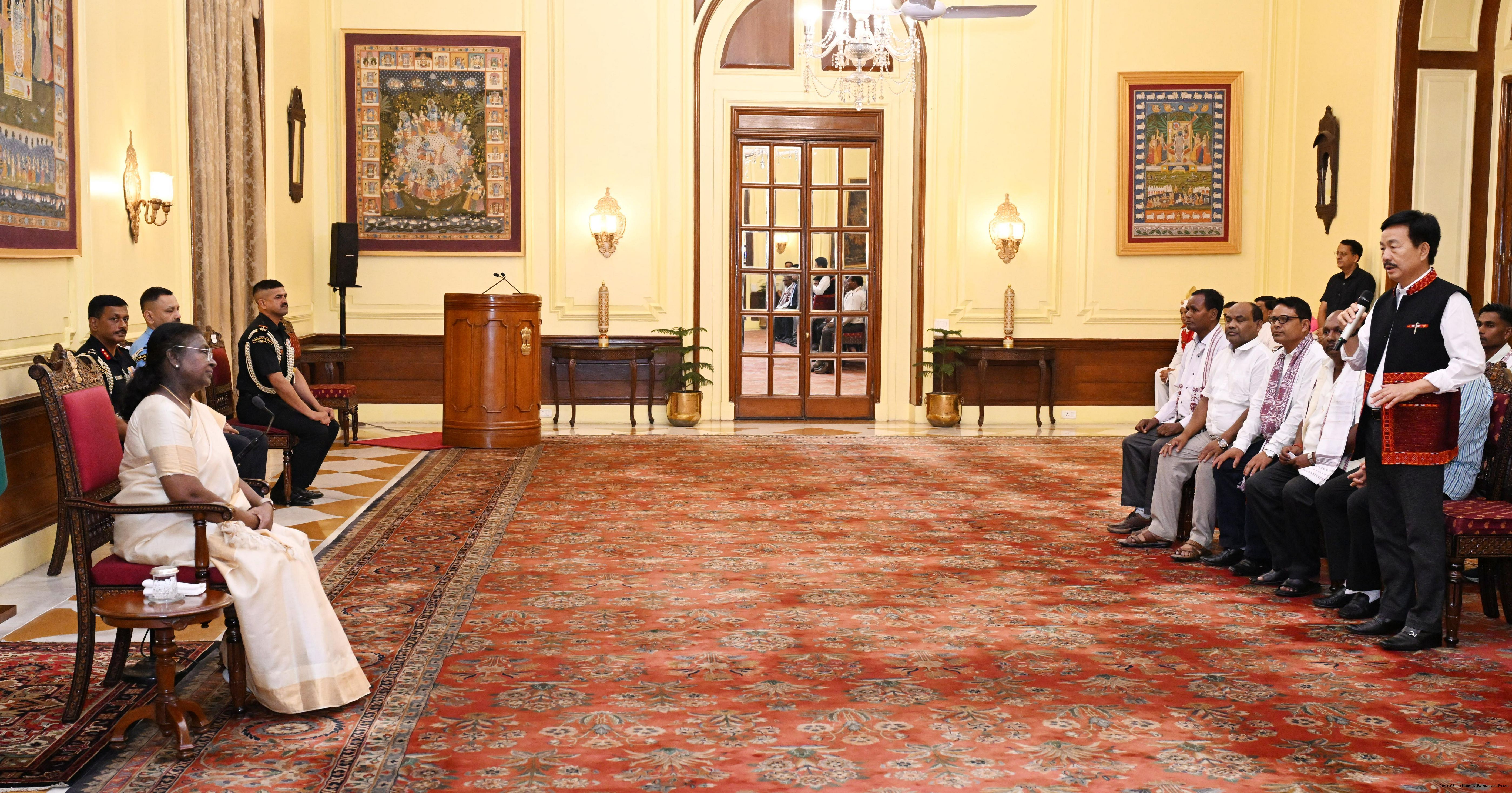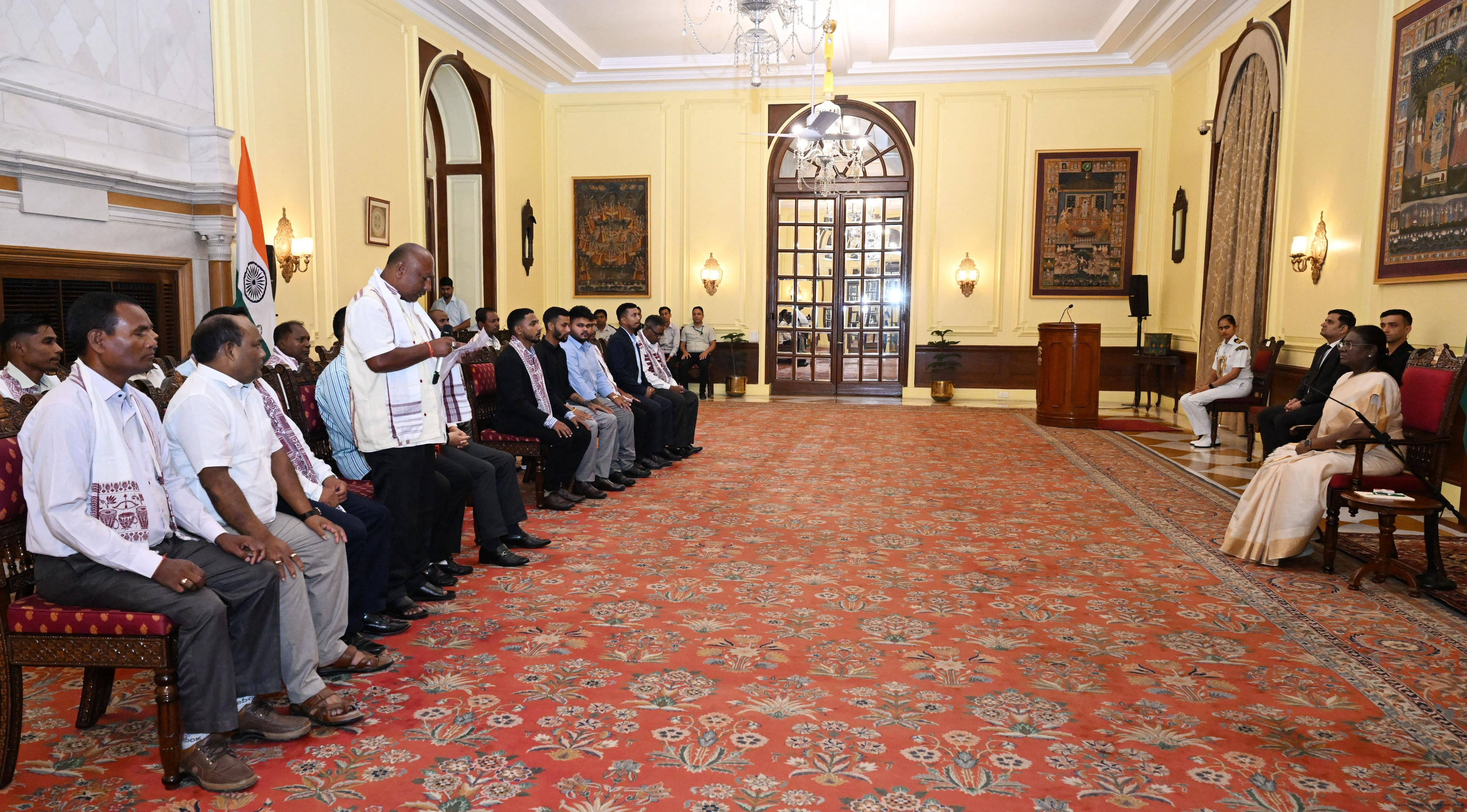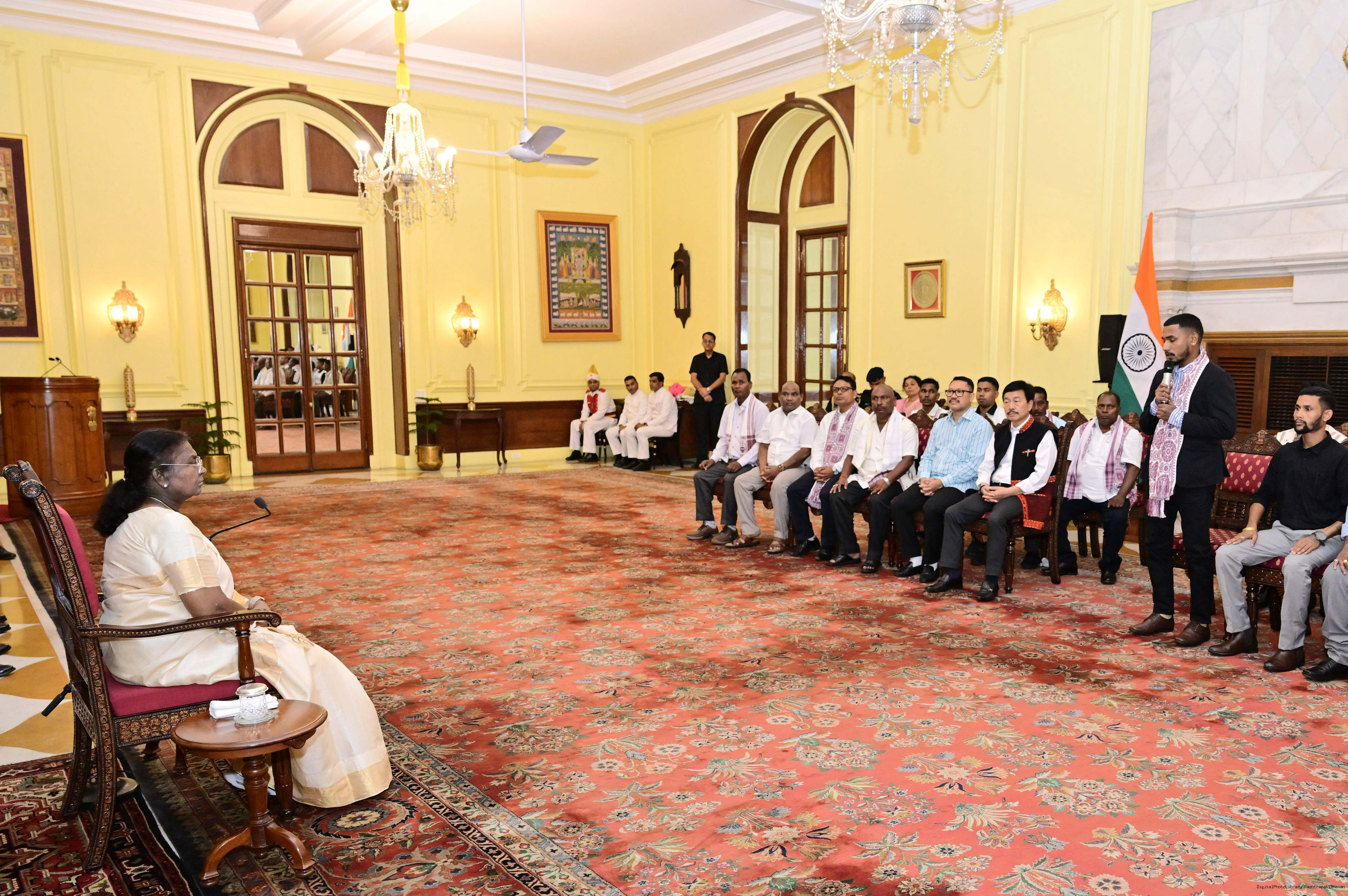 | Caption: | The President of India, Smt. Droupadi Murmu posing a group photographs with 21 persons consisting of Shri Tapir Gao, MP (Lok Sabha) from Arunachal Pradesh along with 20 others at Rashtrapati Bhavan on June 25, 2025. |