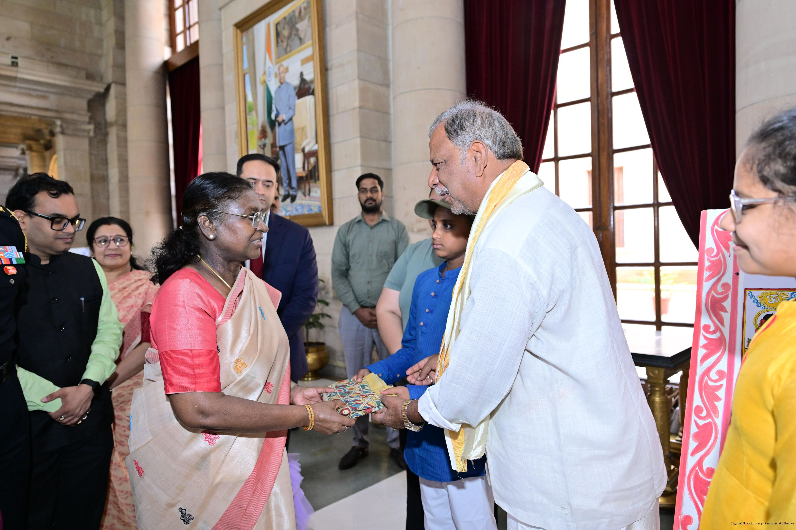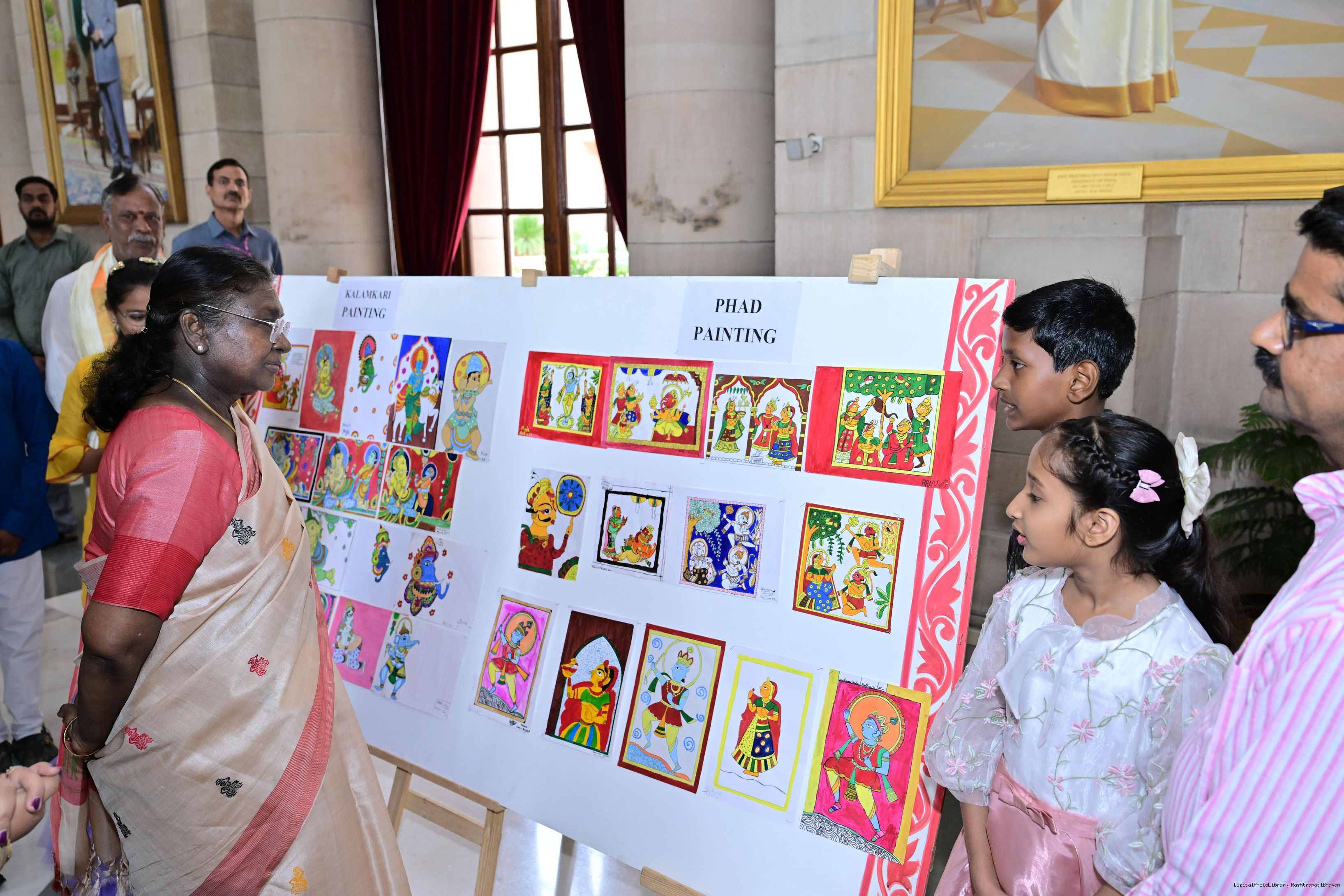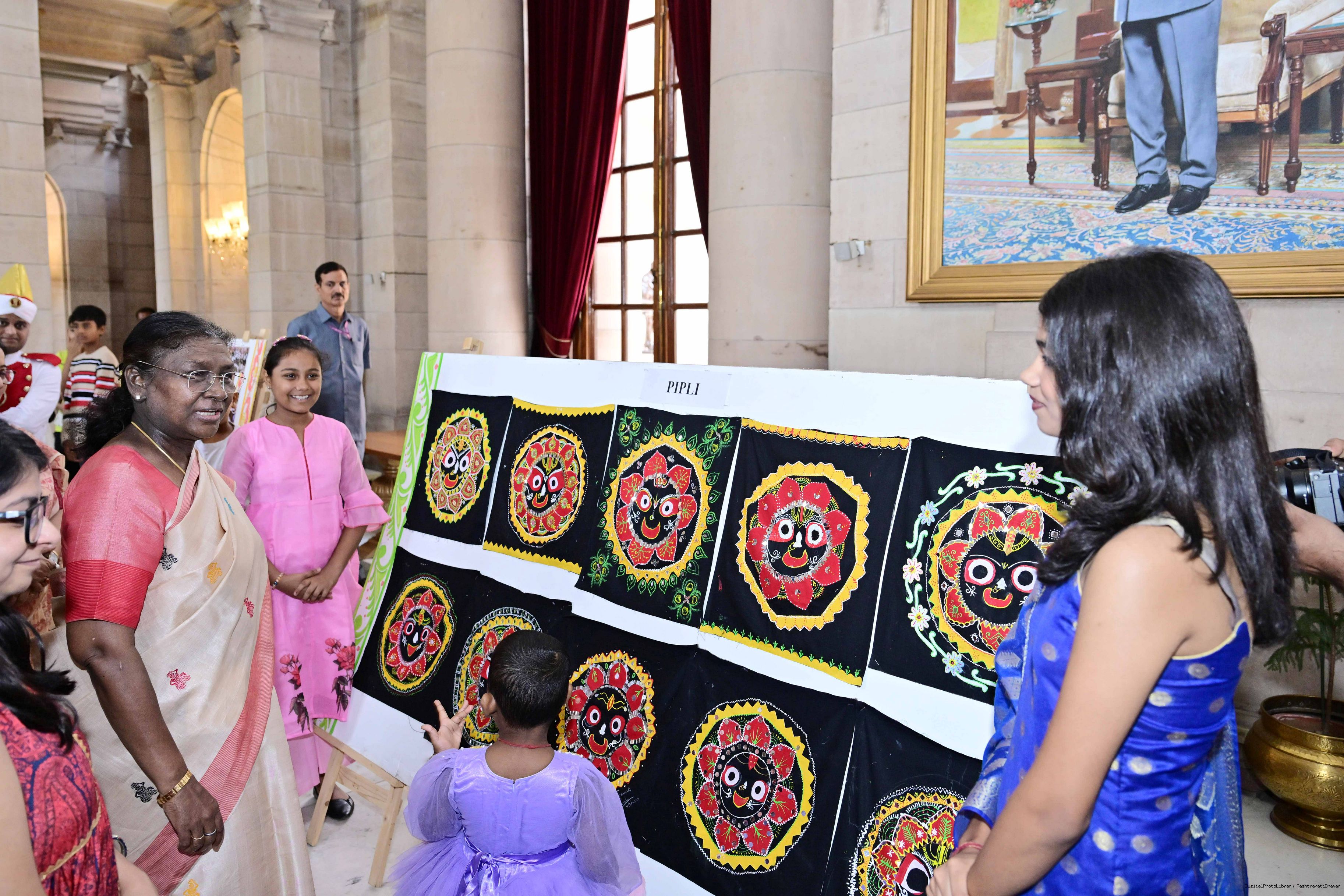 | Caption: | The President of India, Smt Droupadi Murmu interacted with photo opportunity with around 70 children from the Summer Workshop at President's Estate at Rashtrapati Bhavan on June 27, 2025. |