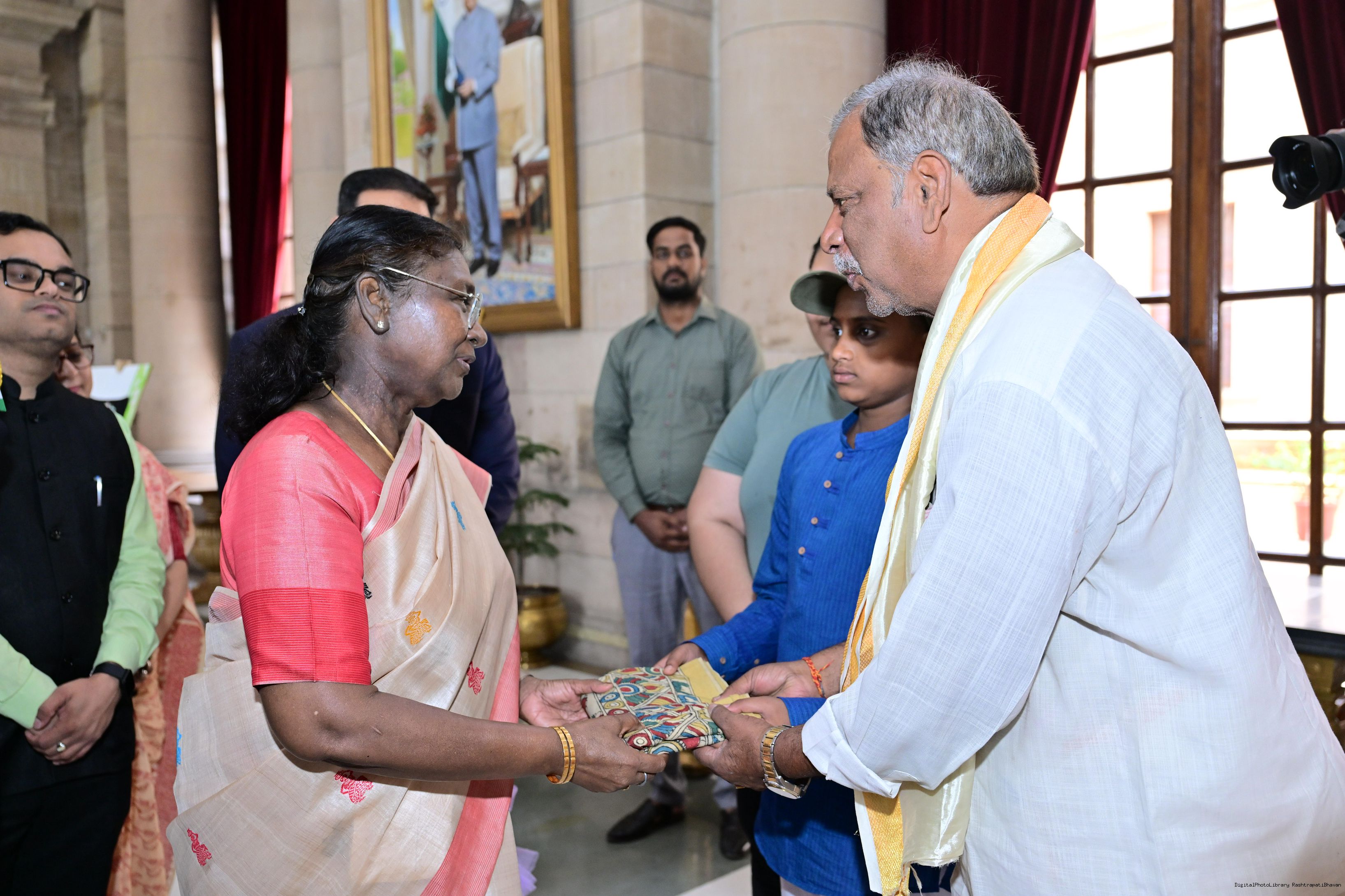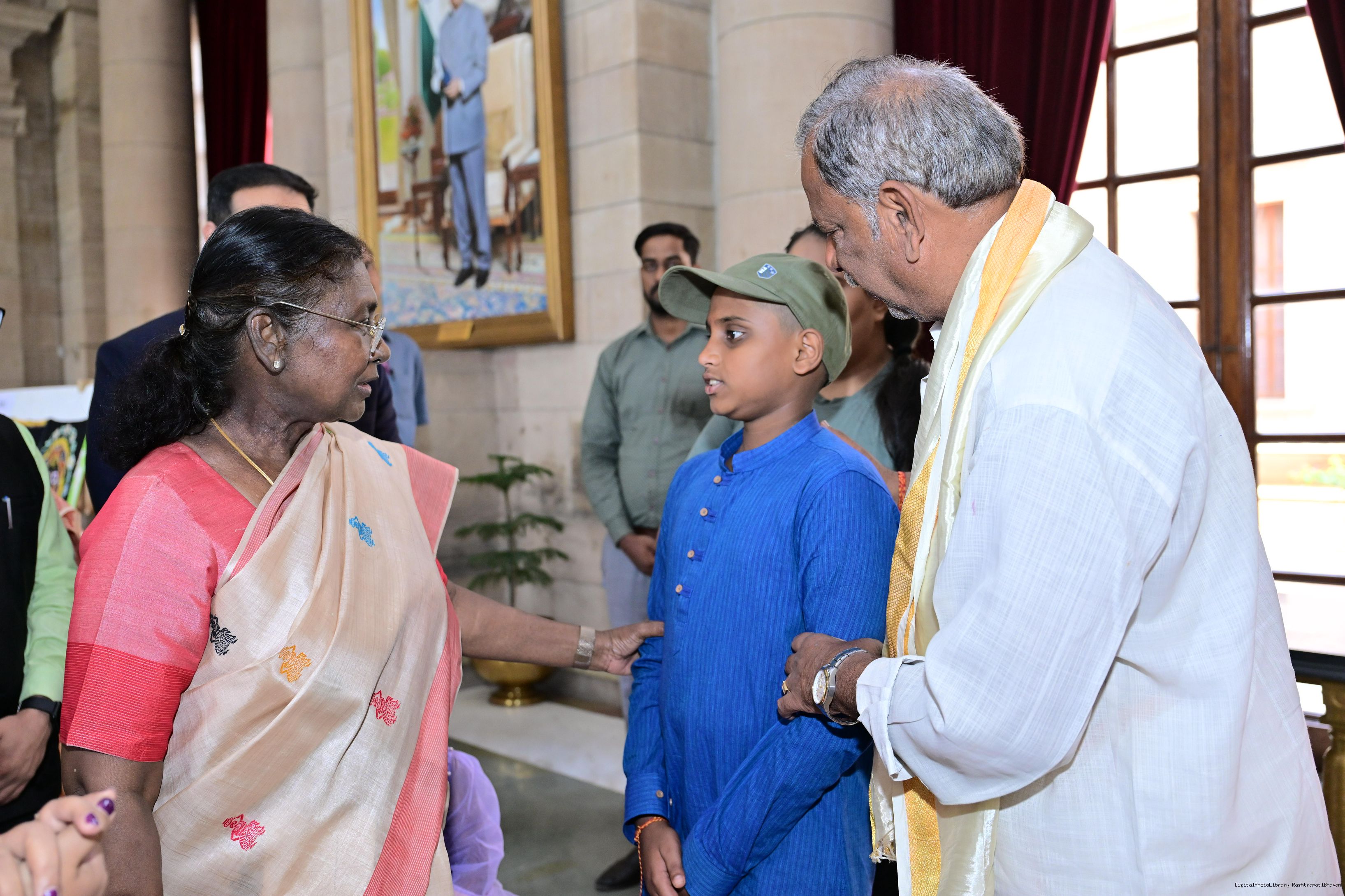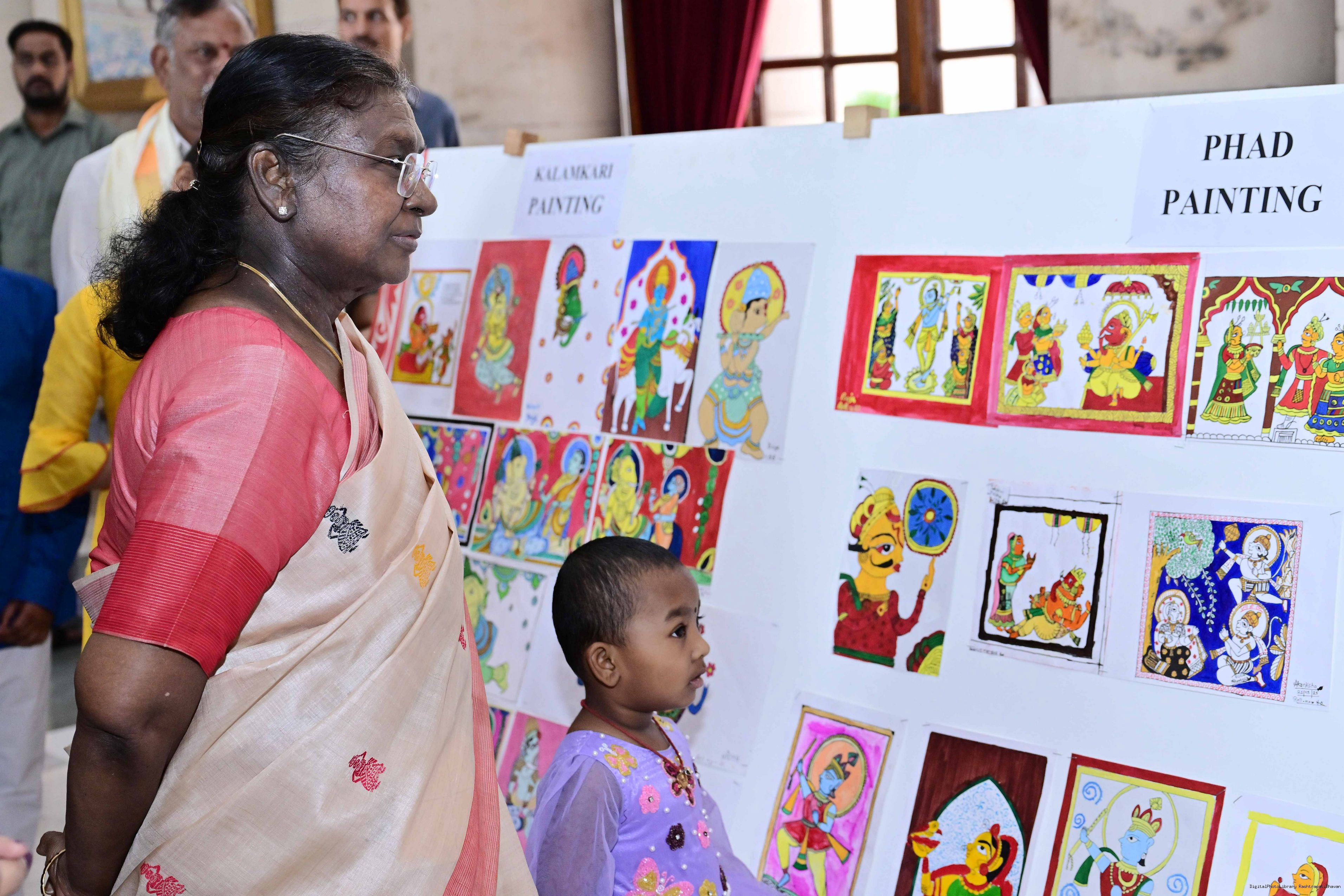 | Caption: | The President of India, Smt Droupadi Murmu interacted with photo opportunity with around 70 children from the Summer Workshop at President's Estate at Rashtrapati Bhavan on June 27, 2025. |