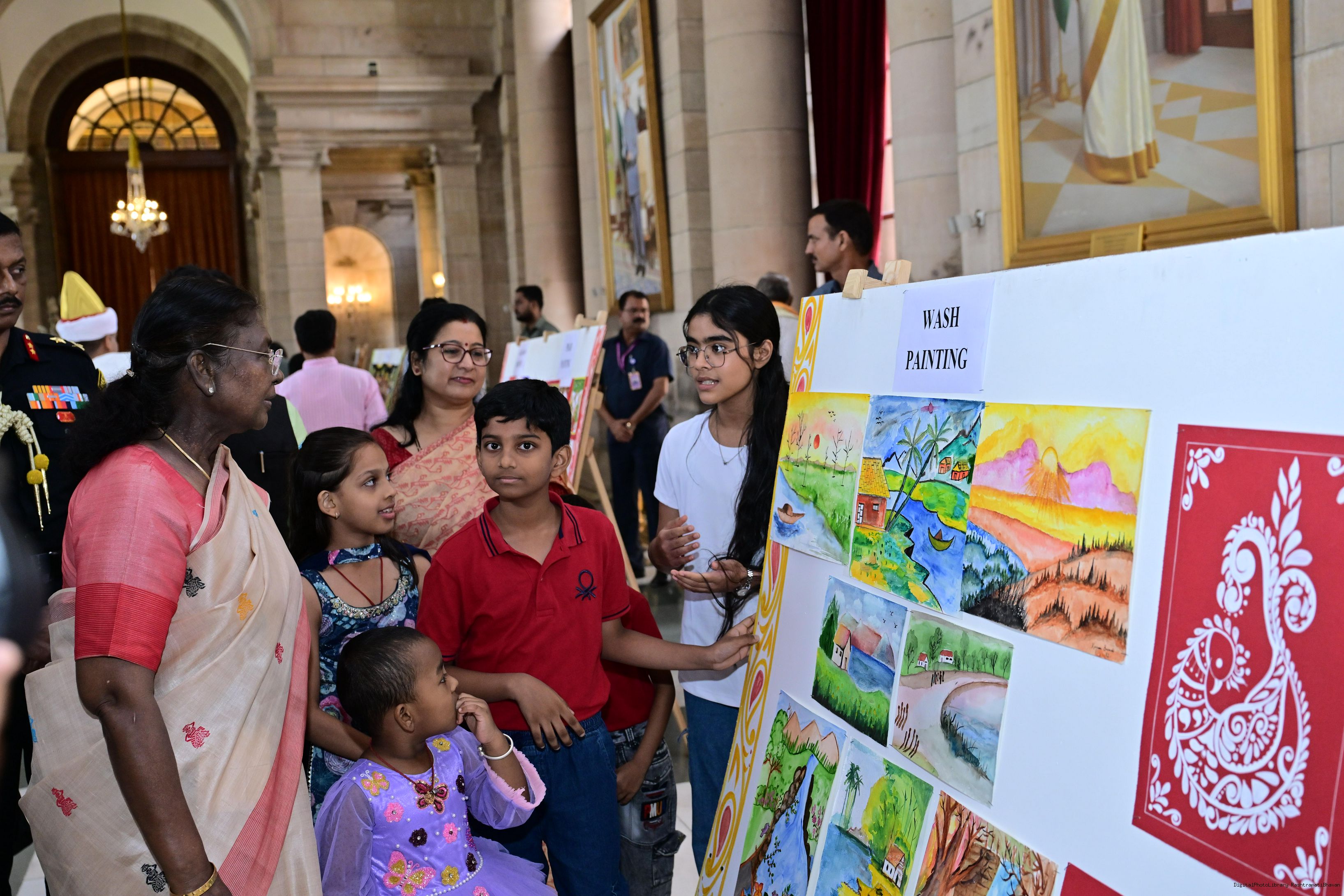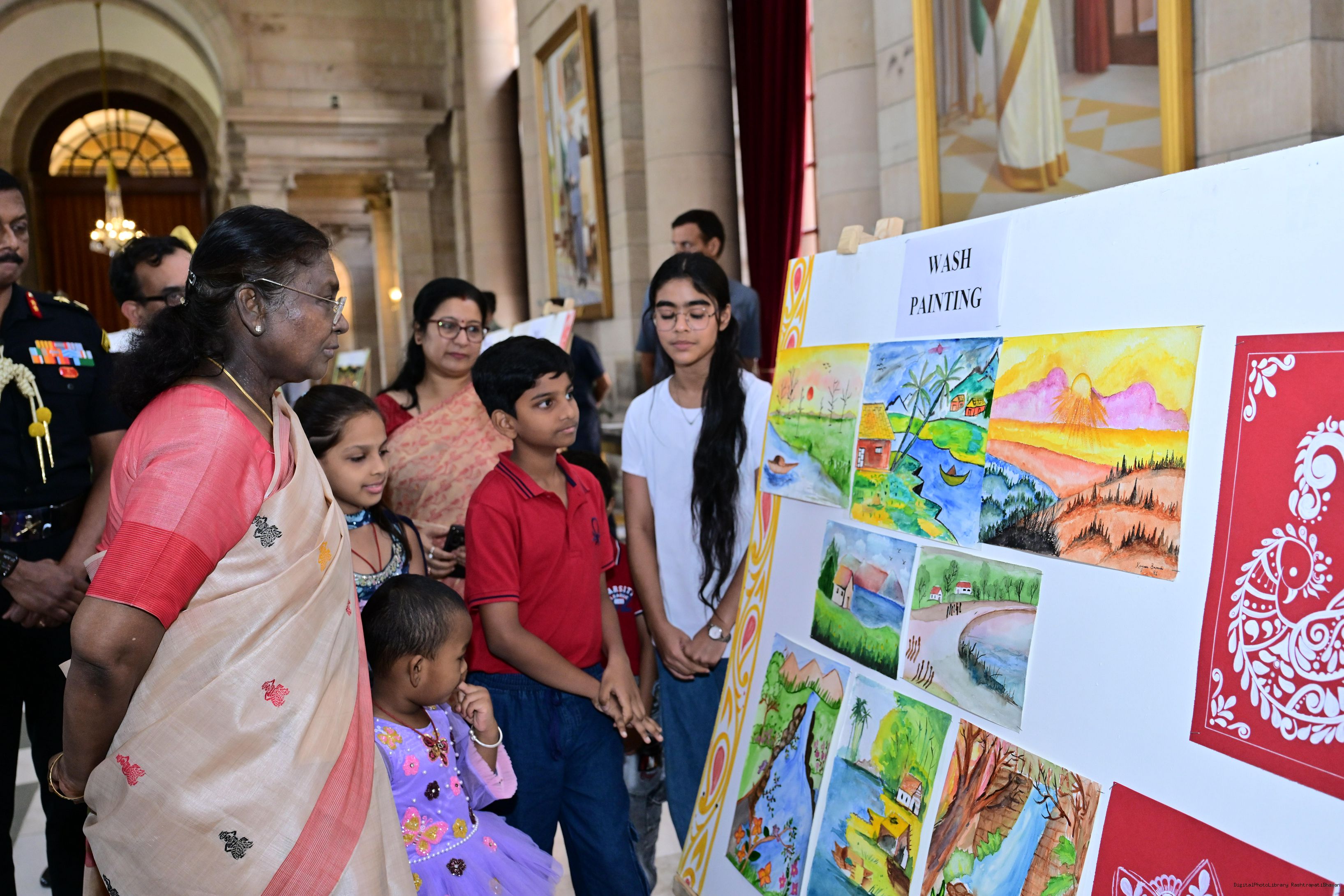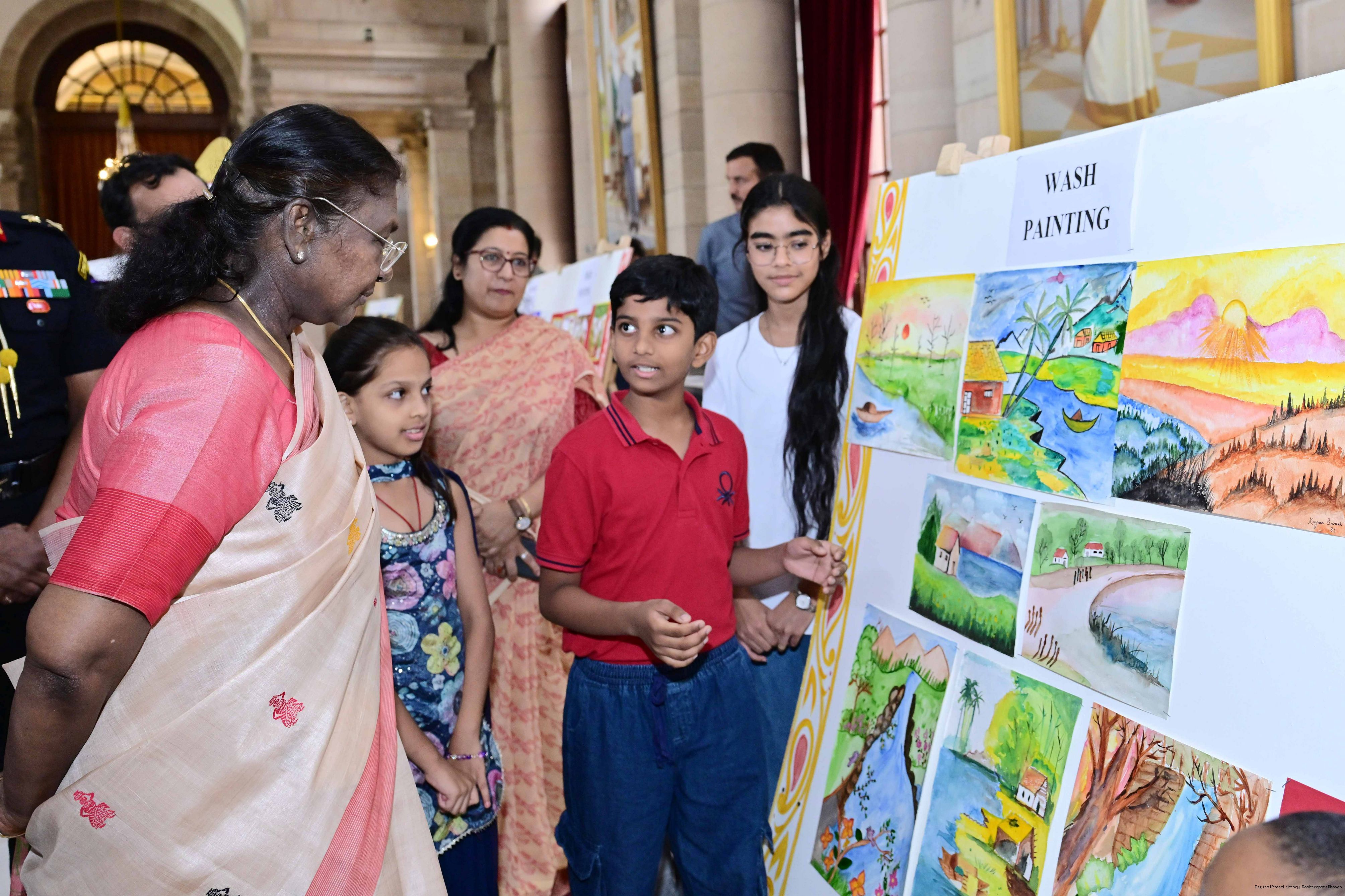 | Caption: | The President of India, Smt Droupadi Murmu interacted with photo opportunity with around 70 children from the Summer Workshop at President's Estate at Rashtrapati Bhavan on June 27, 2025. |