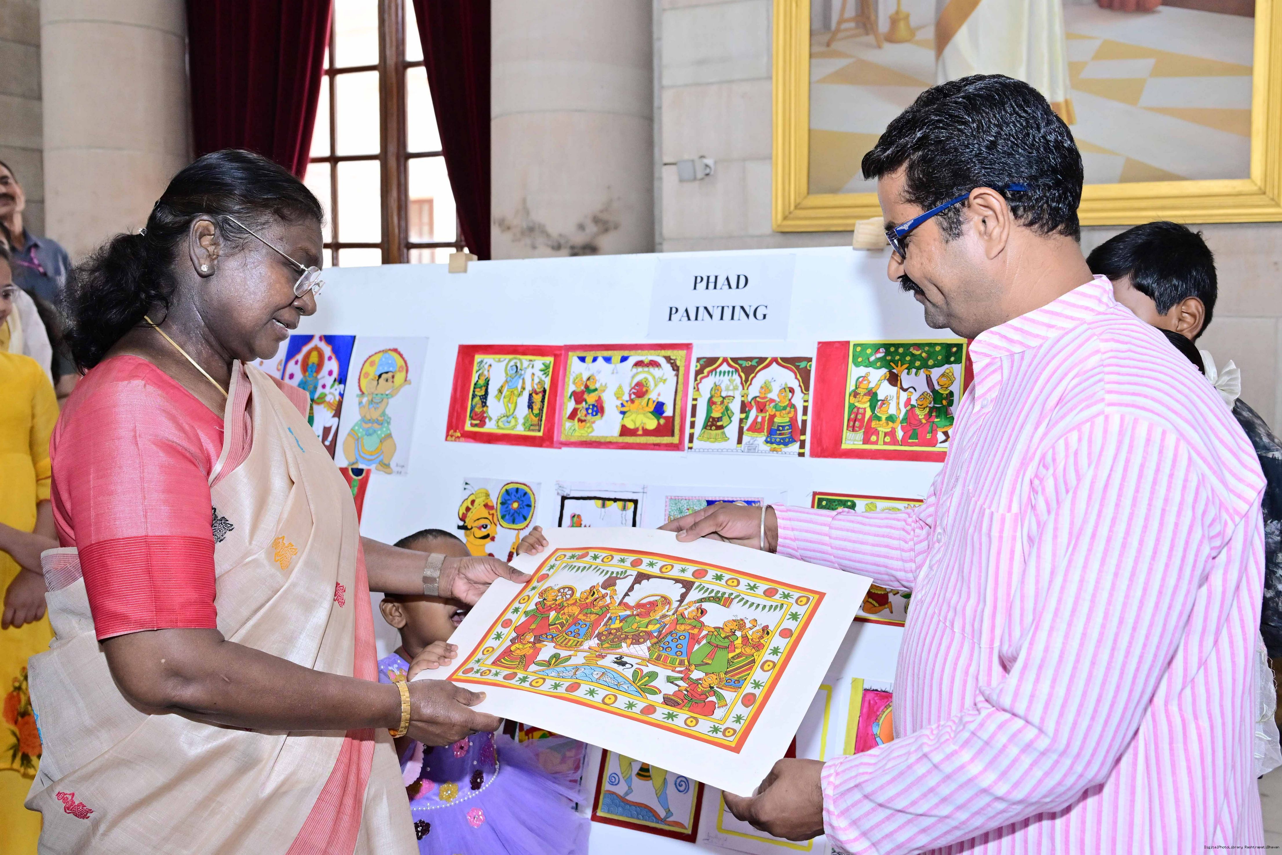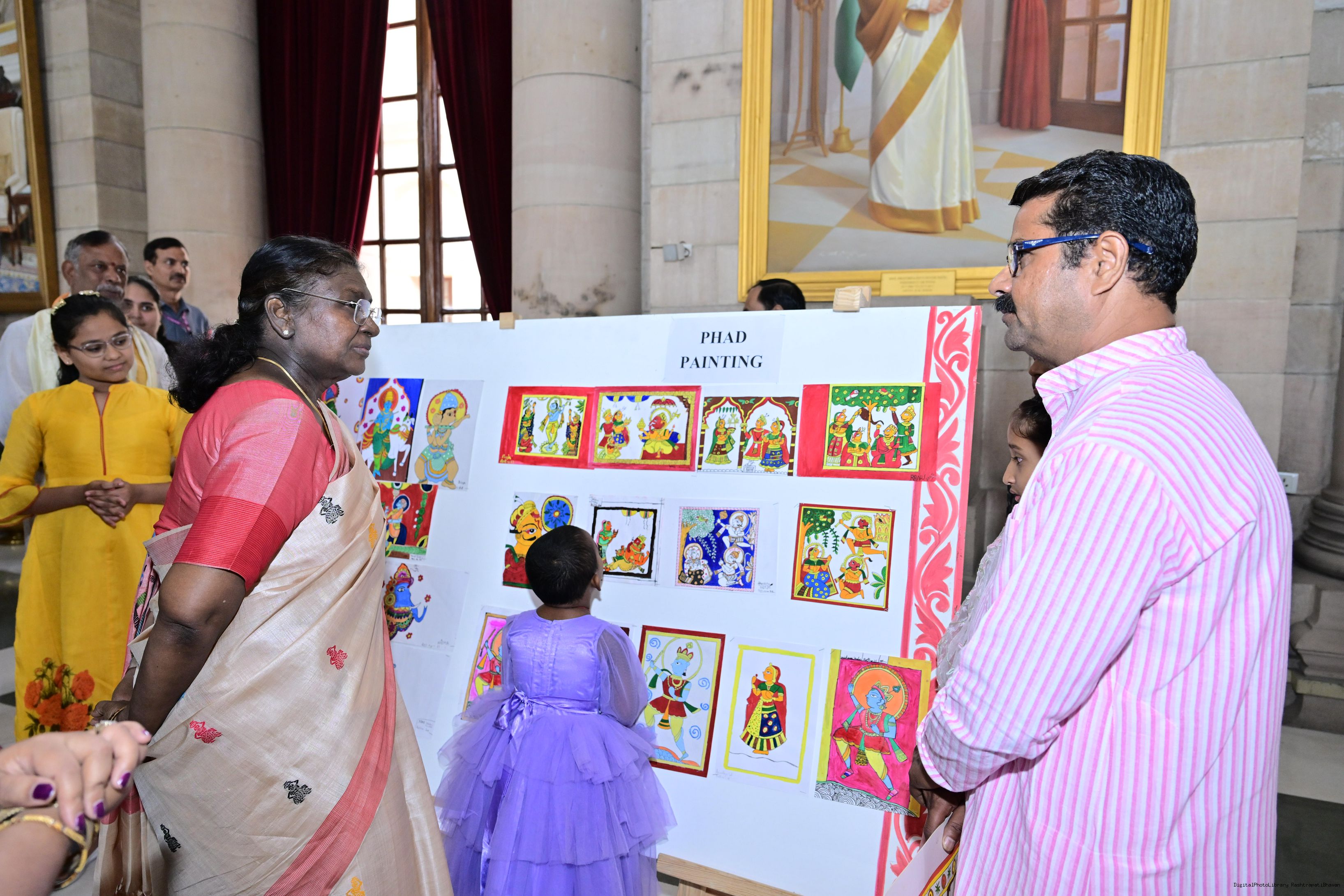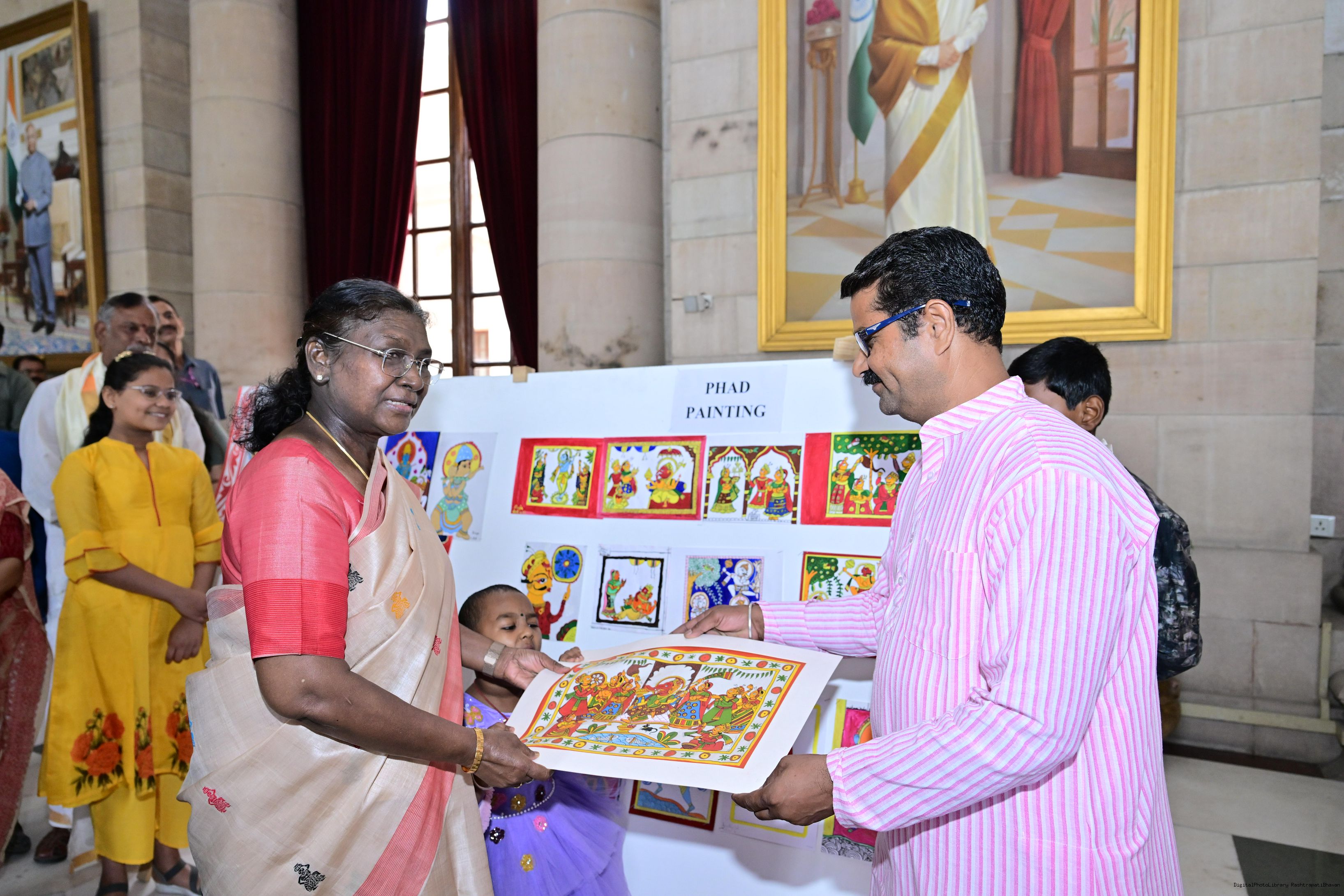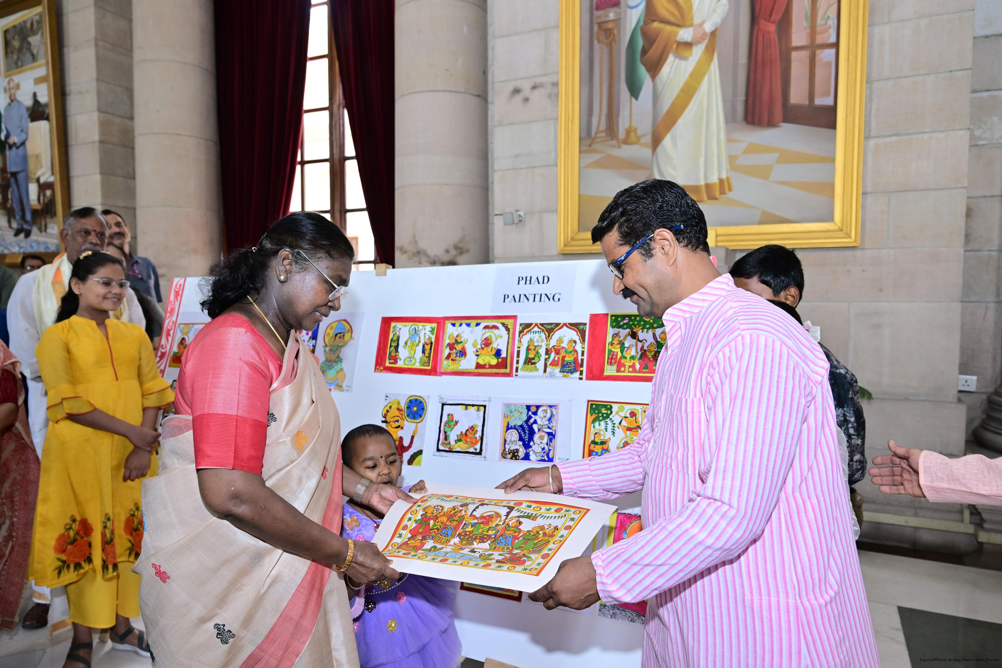 | Caption: | The President of India, Smt Droupadi Murmu interacted with photo opportunity with around 70 children from the Summer Workshop at President's Estate at Rashtrapati Bhavan on June 27, 2025. |