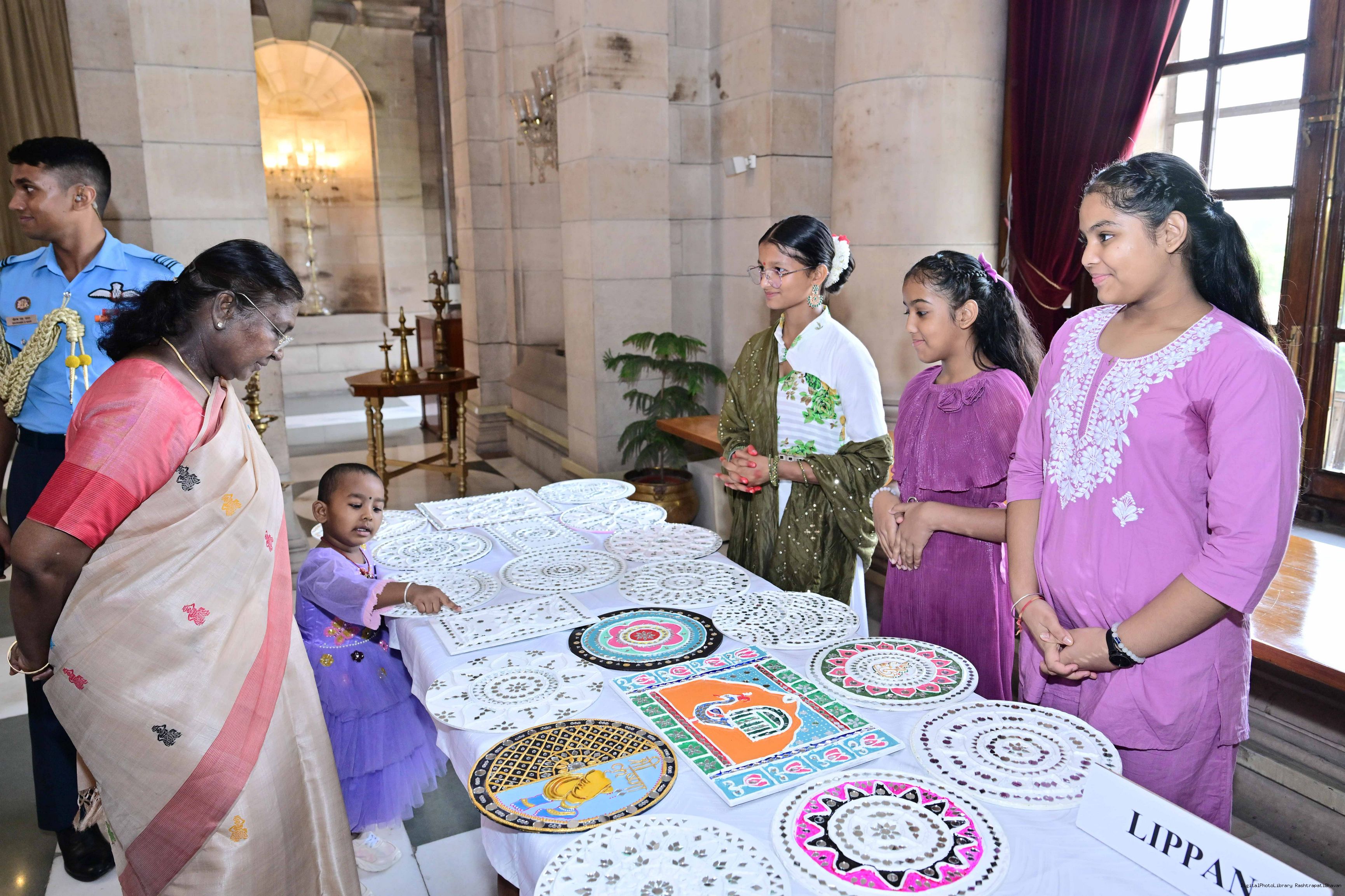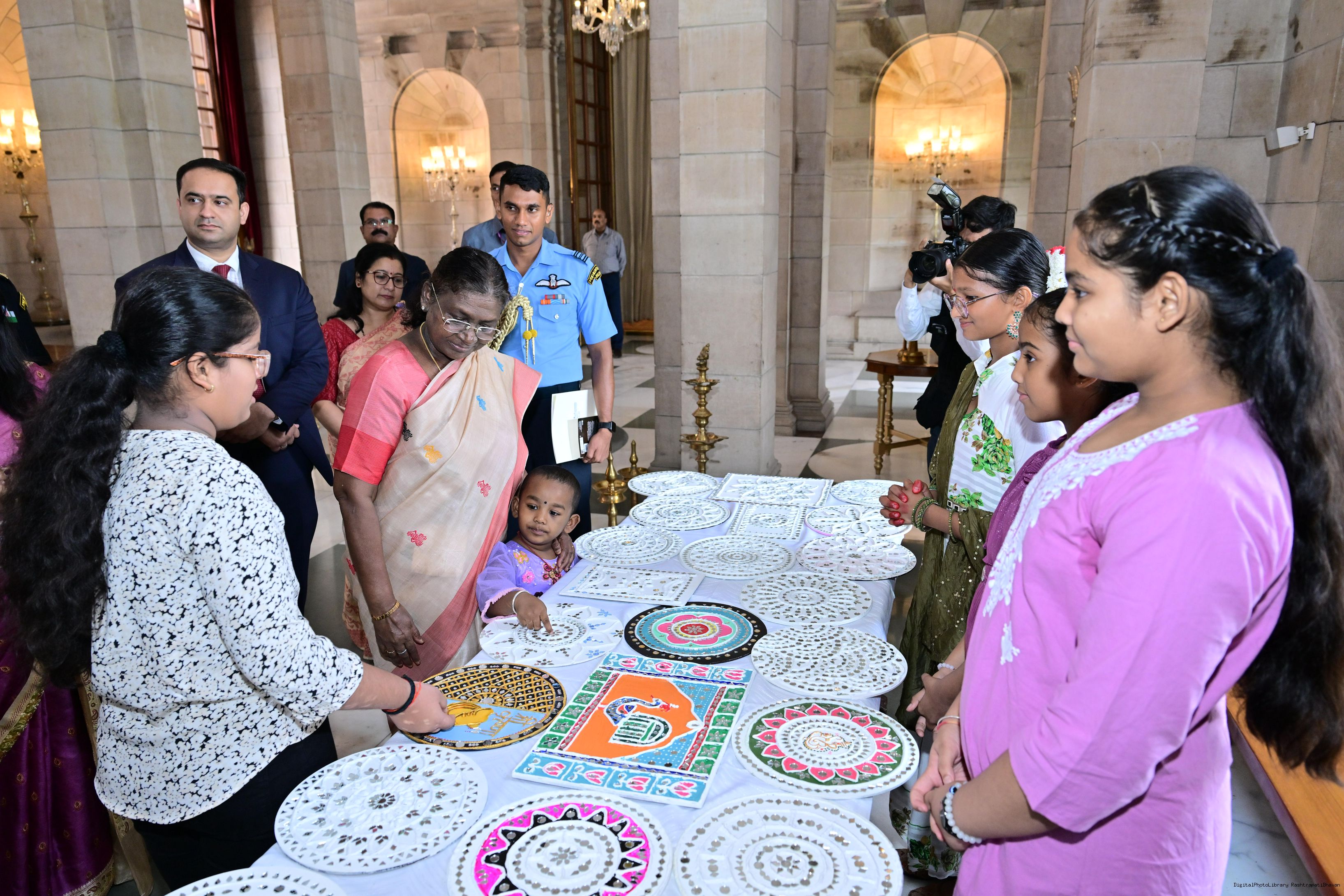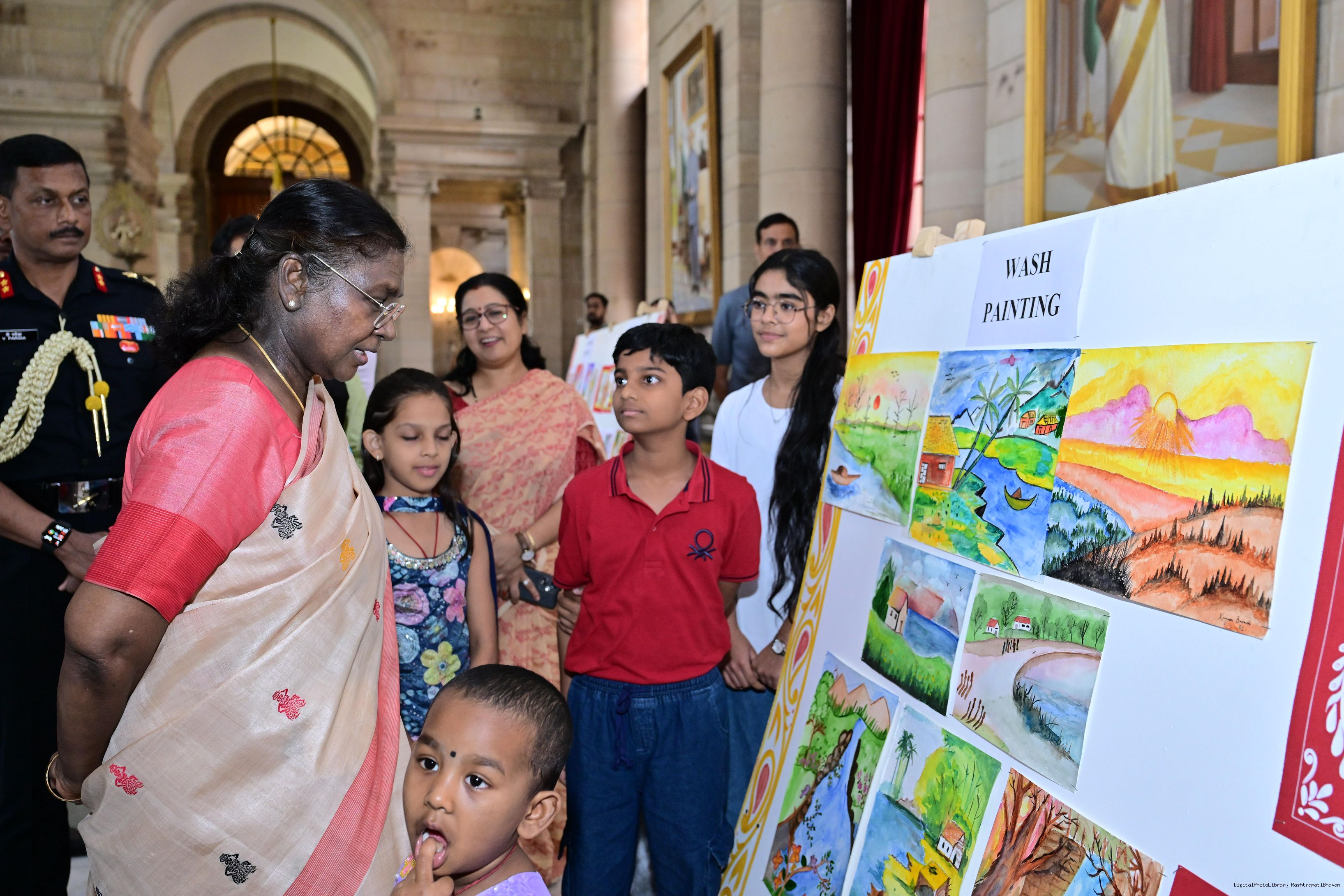 | Caption: | The President of India, Smt Droupadi Murmu interacted with photo opportunity with around 70 children from the Summer Workshop at President's Estate at Rashtrapati Bhavan on June 27, 2025. |