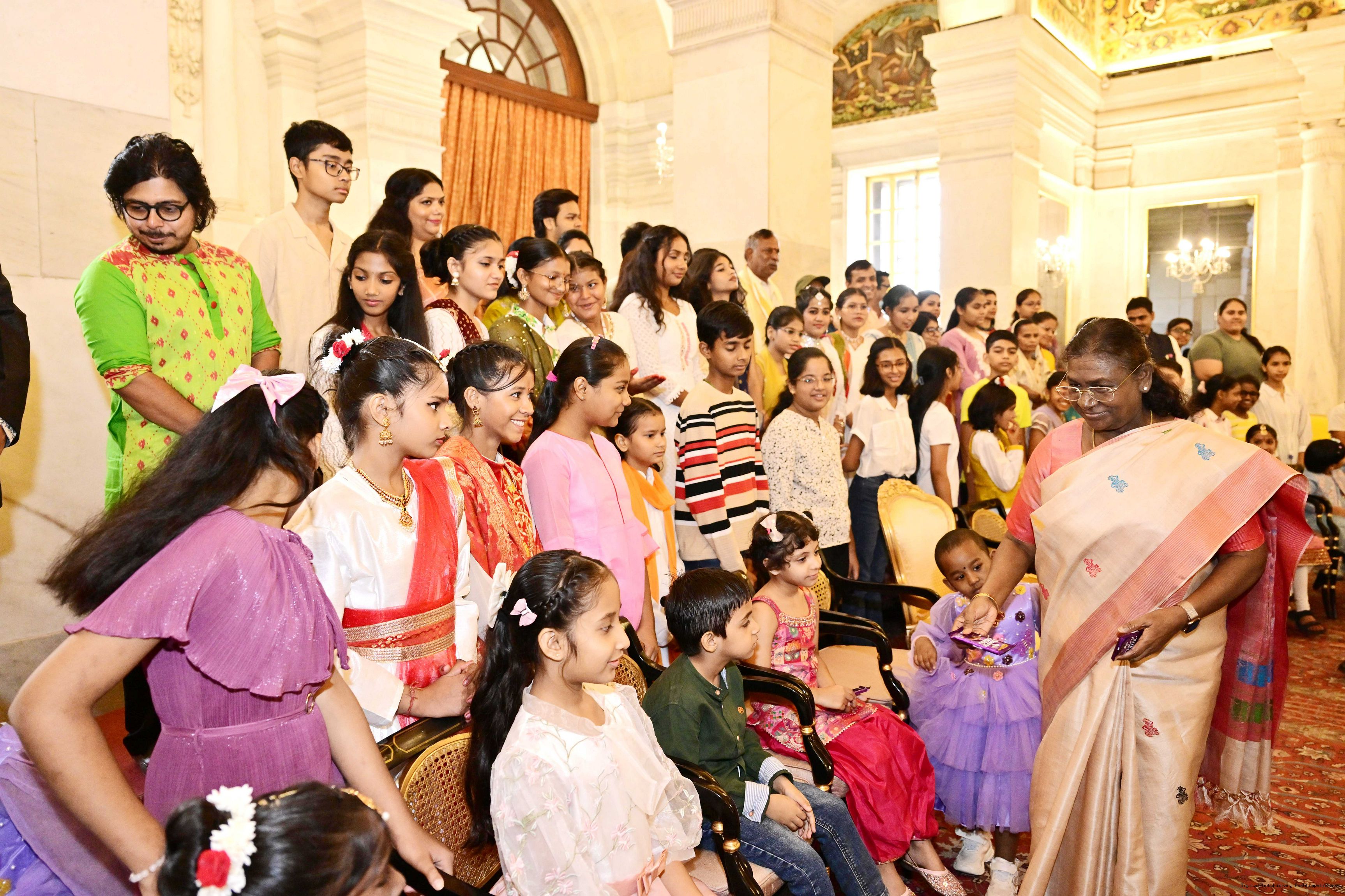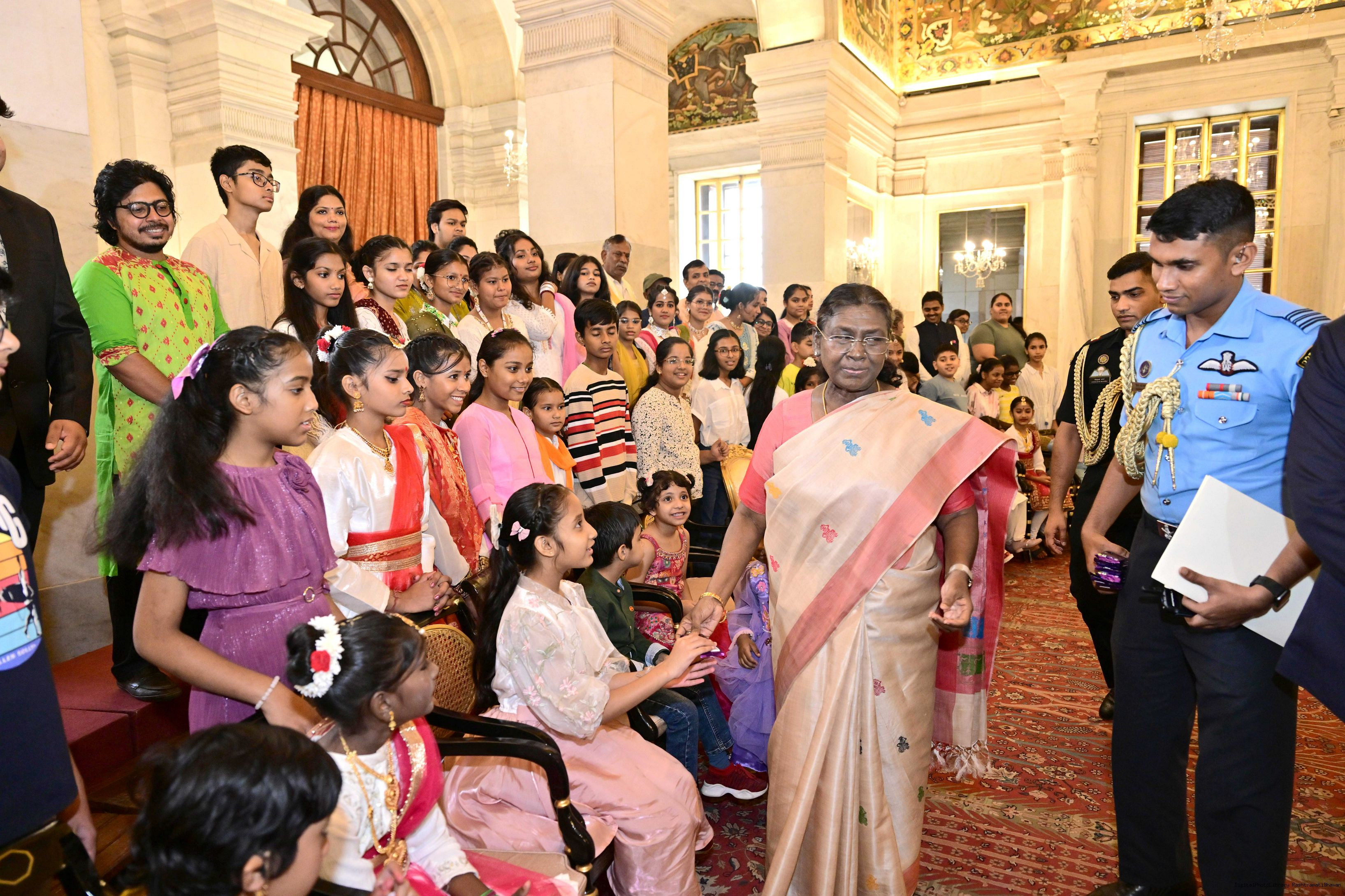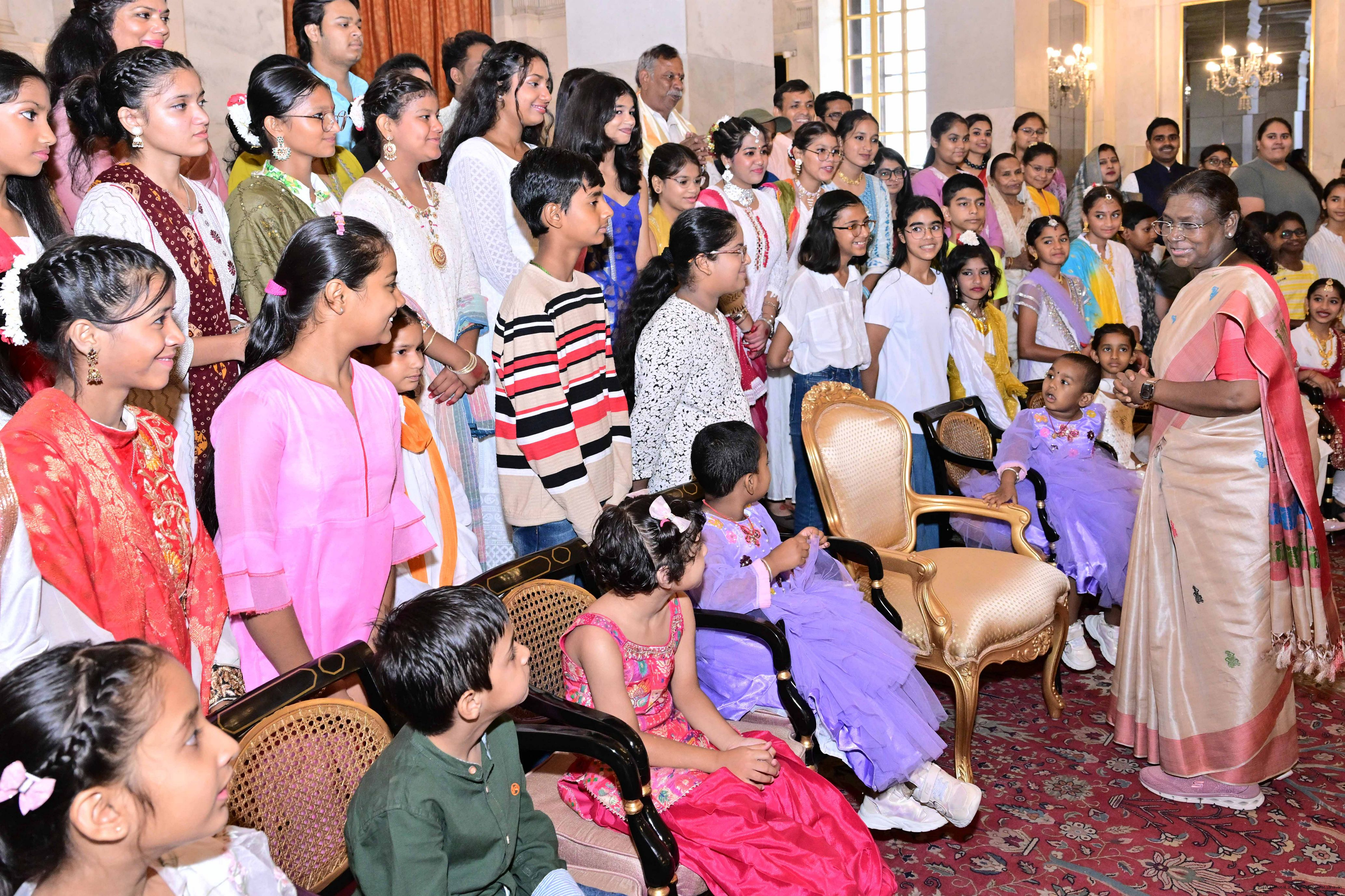 | Caption: | The President of India, Smt Droupadi Murmu interacted with photo opportunity with around 70 children from the Summer Workshop at President's Estate at Rashtrapati Bhavan on June 27, 2025. |