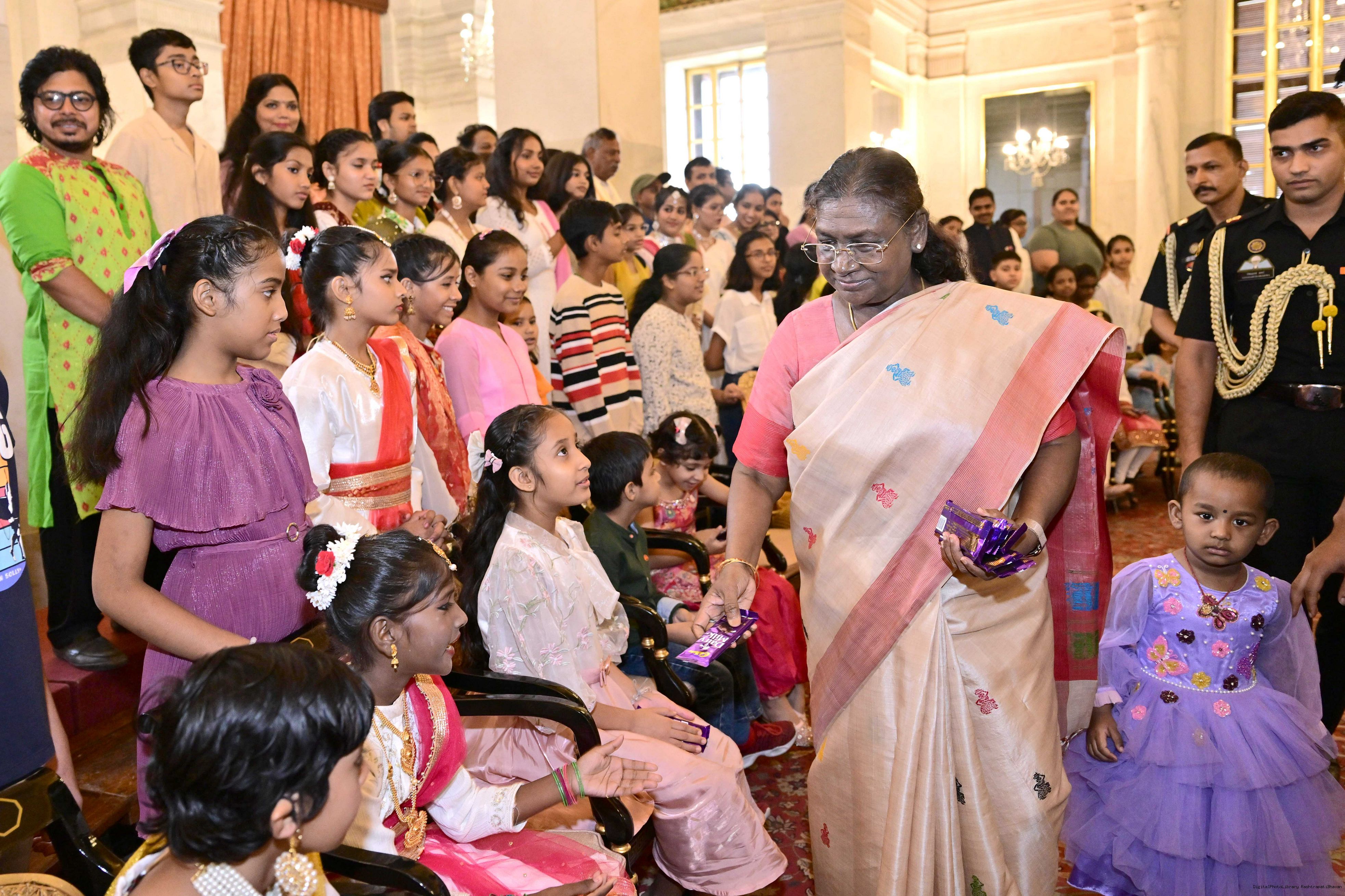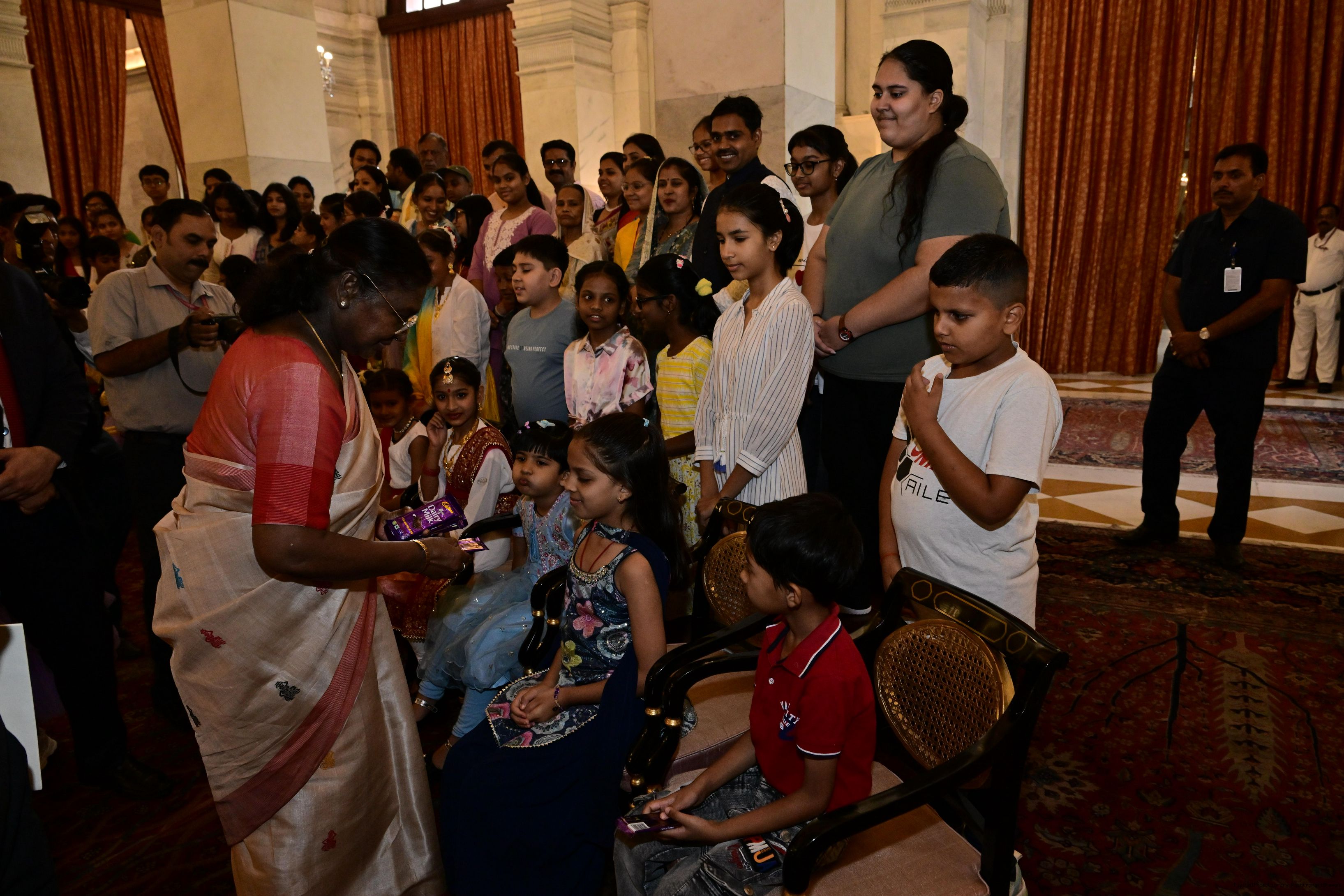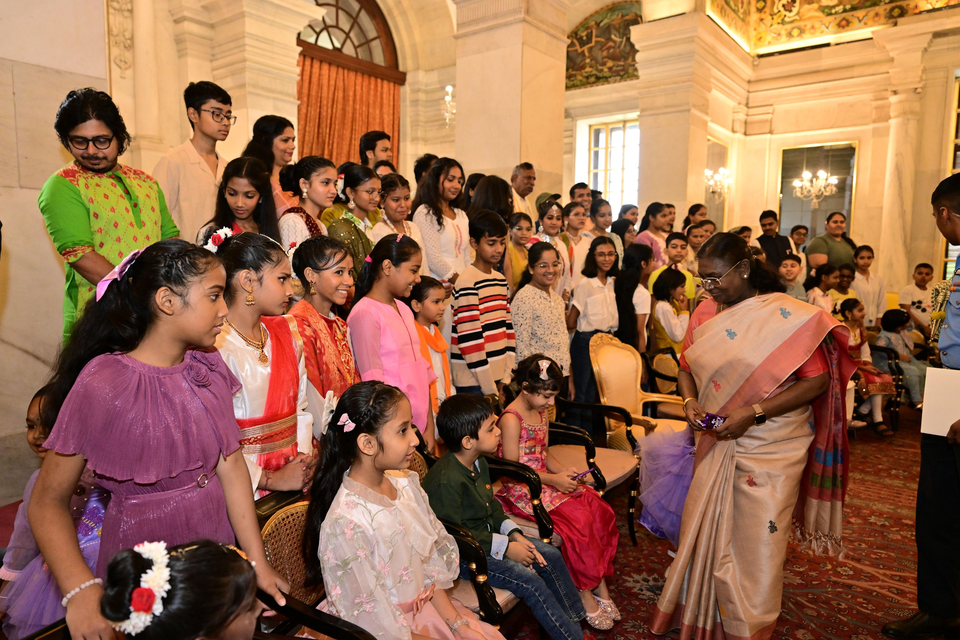 | Caption: | The President of India, Smt Droupadi Murmu interacted with photo opportunity with around 70 children from the Summer Workshop at President's Estate at Rashtrapati Bhavan on June 27, 2025. |