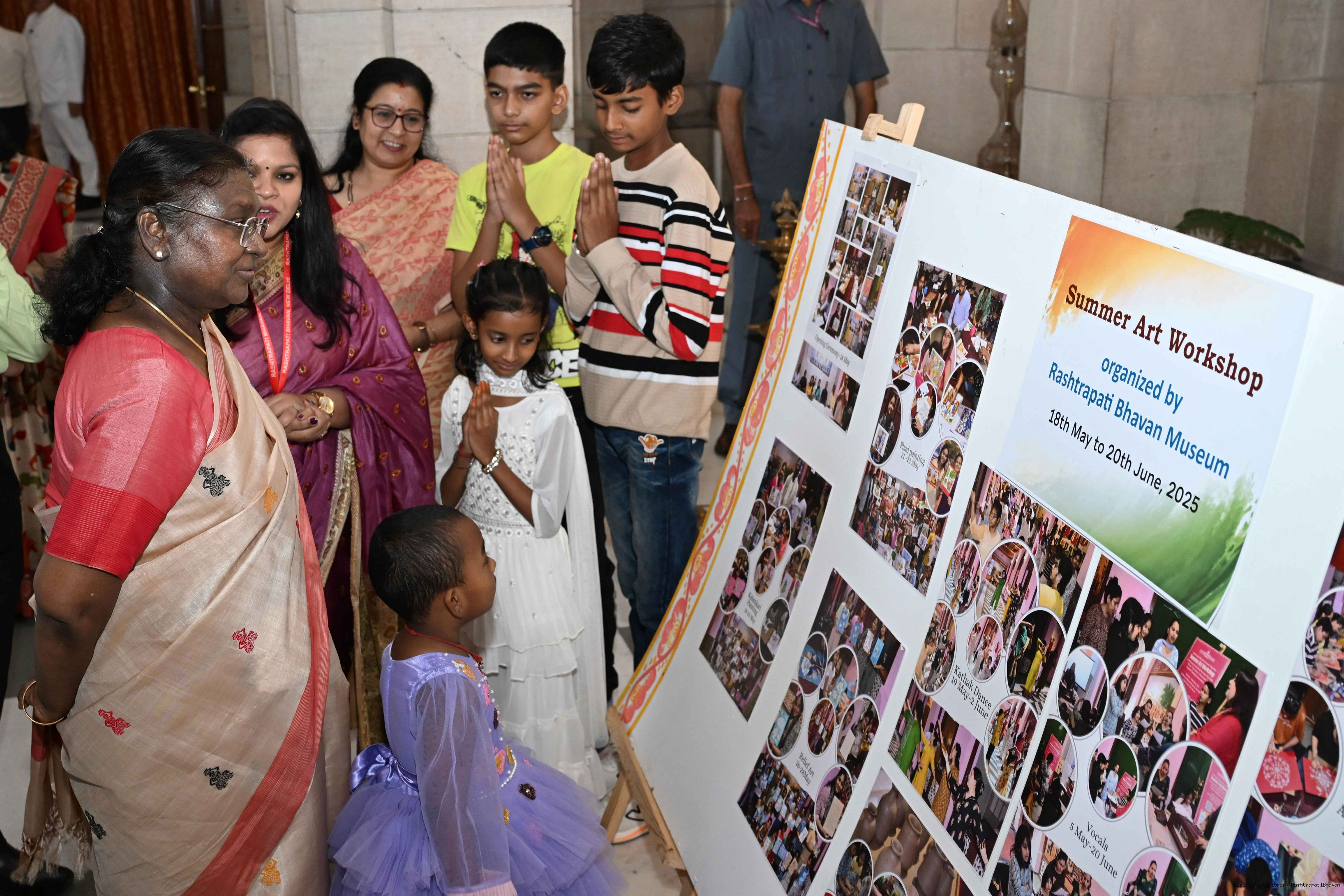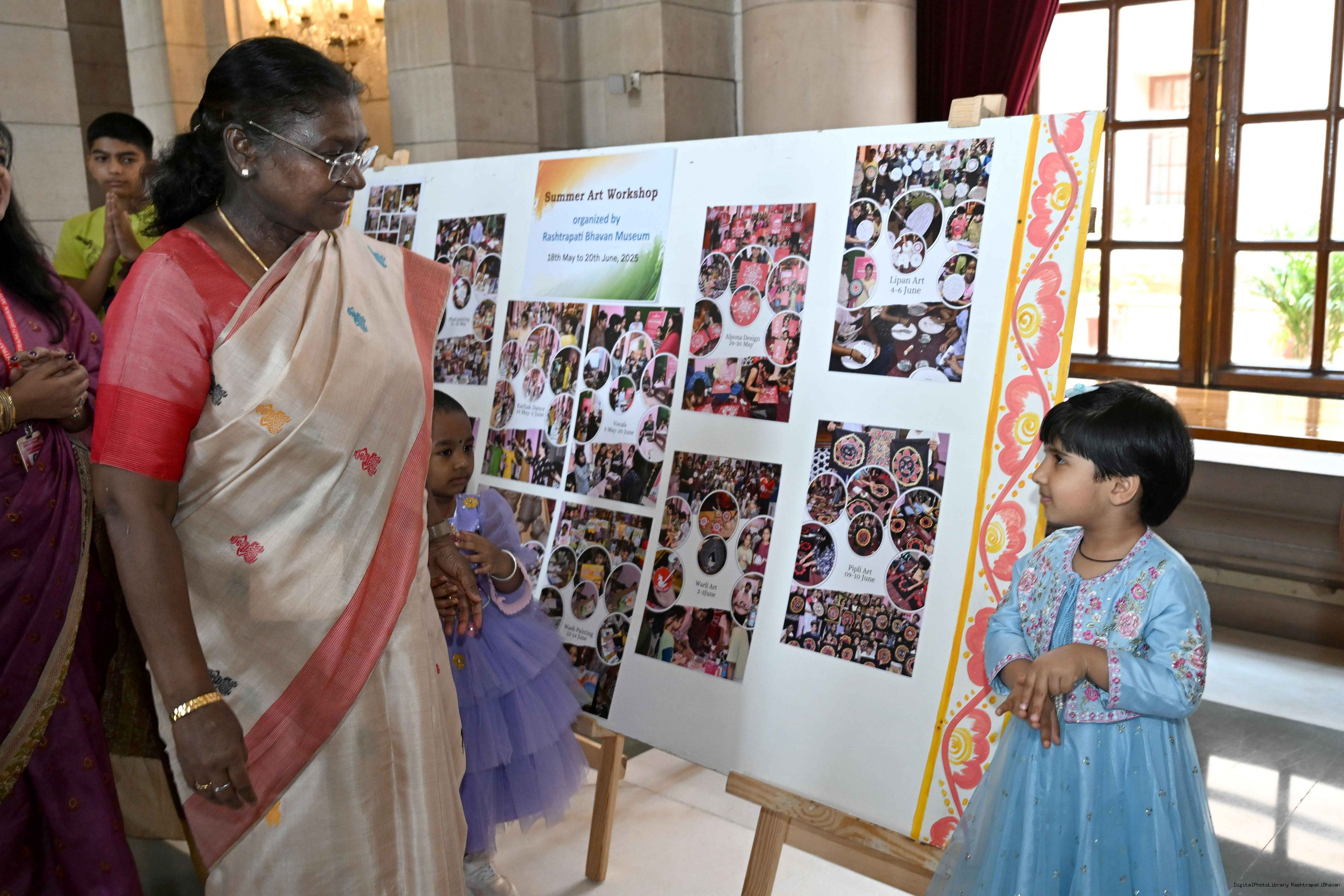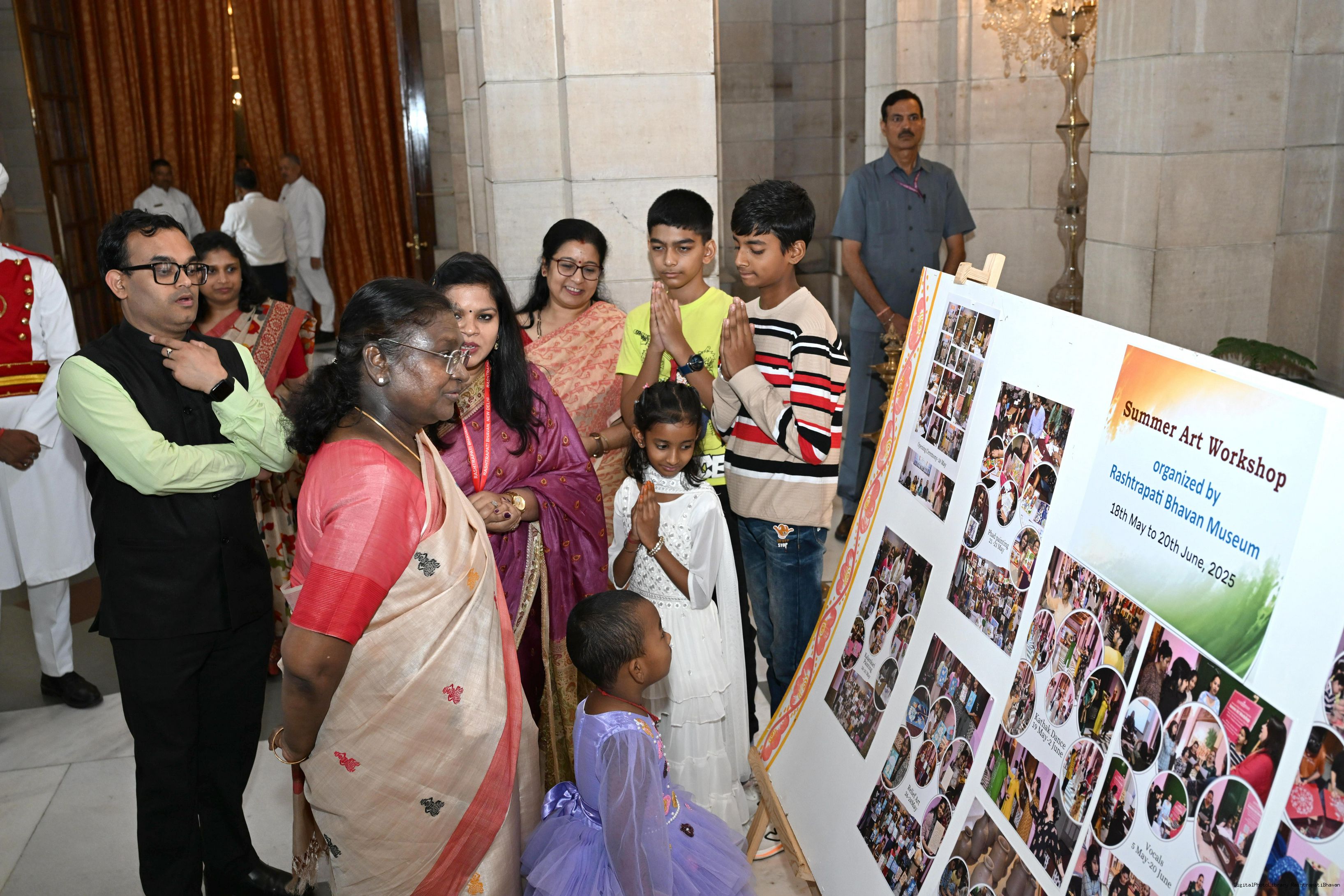 | Caption: | The President of India, Smt Droupadi Murmu interacted with photo opportunity with around 70 children from the Summer Workshop at President's Estate at Rashtrapati Bhavan on June 27, 2025. |