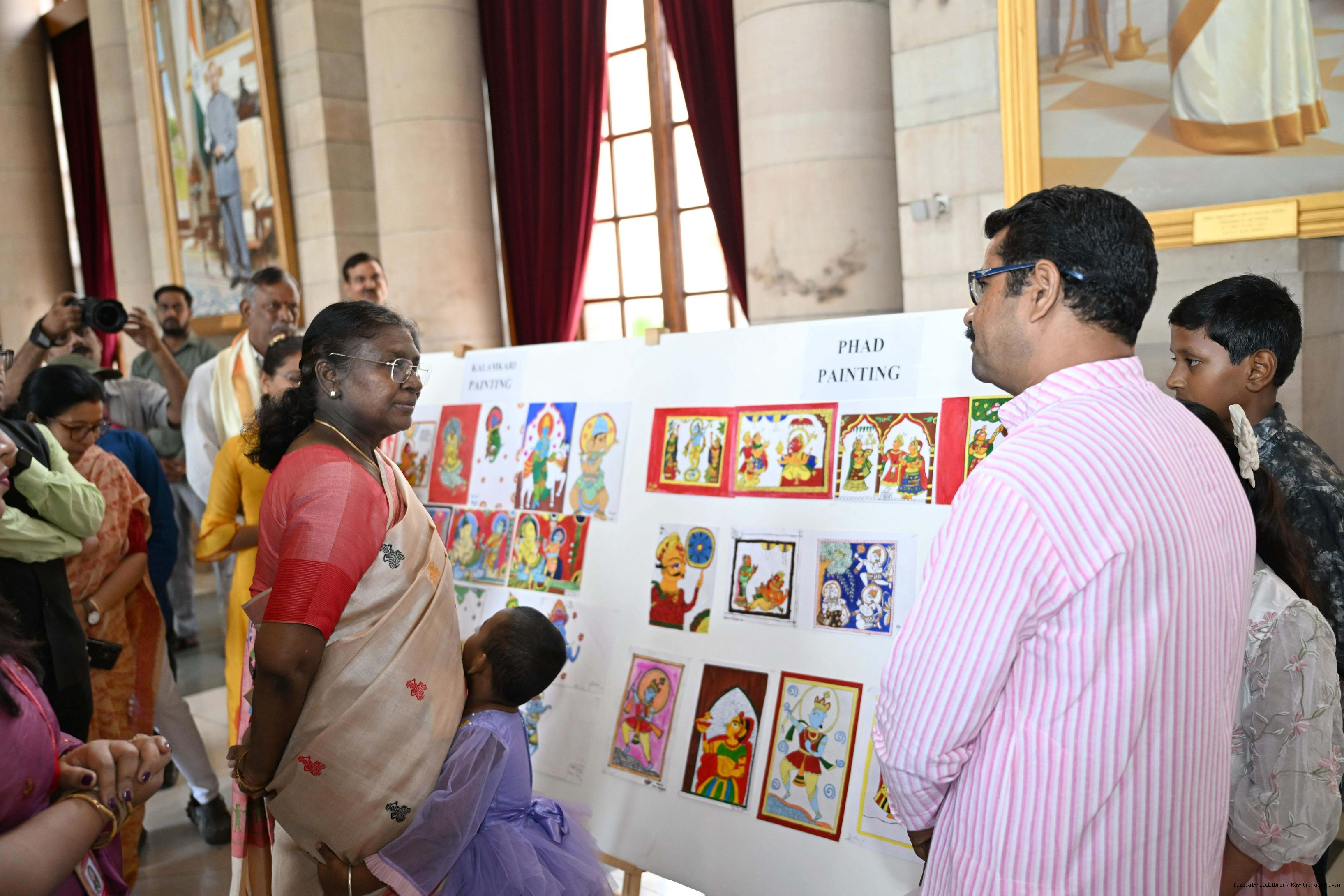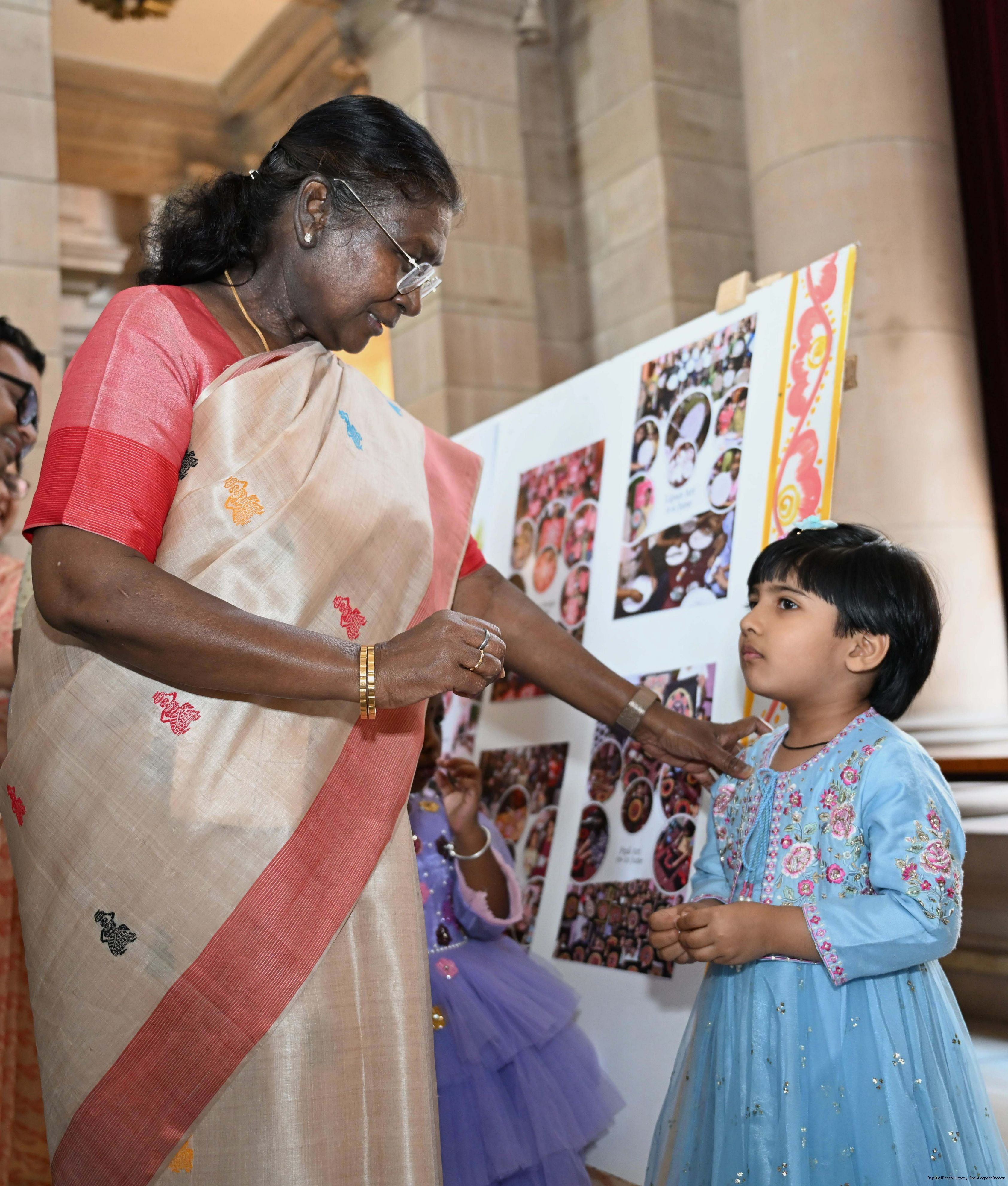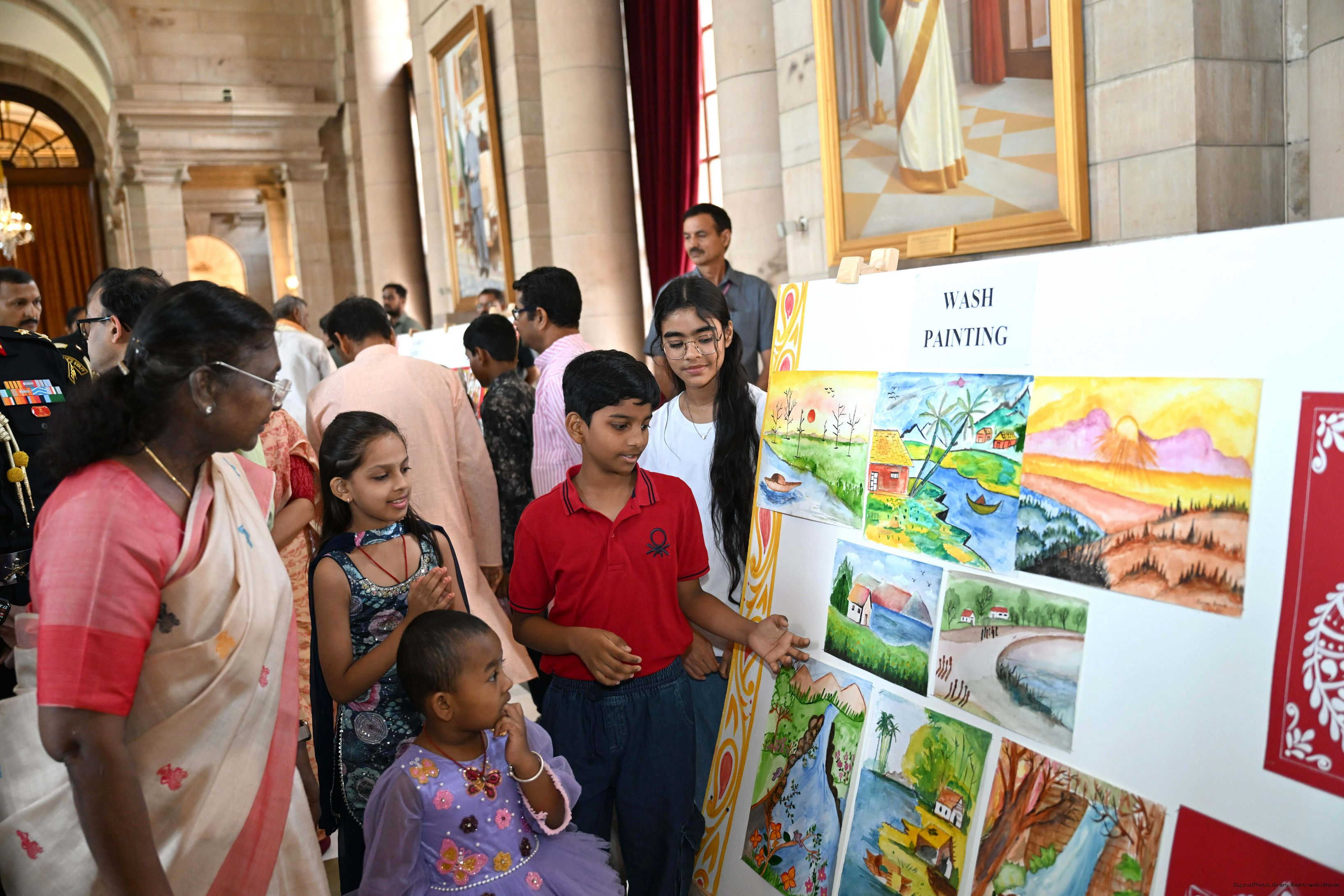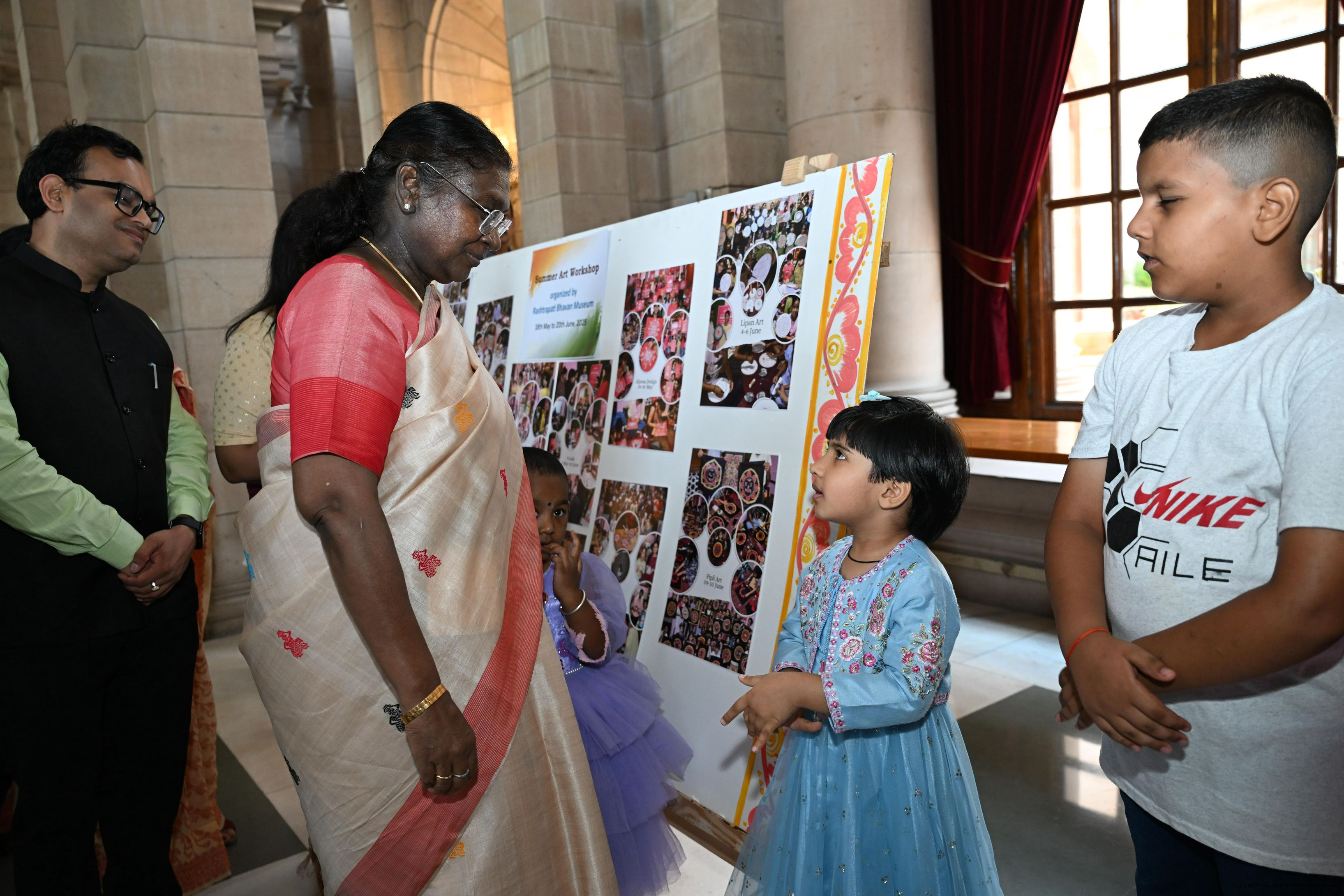 | Caption: | The President of India, Smt Droupadi Murmu interacted with photo opportunity with around 70 children from the Summer Workshop at President's Estate at Rashtrapati Bhavan on June 27, 2025. |