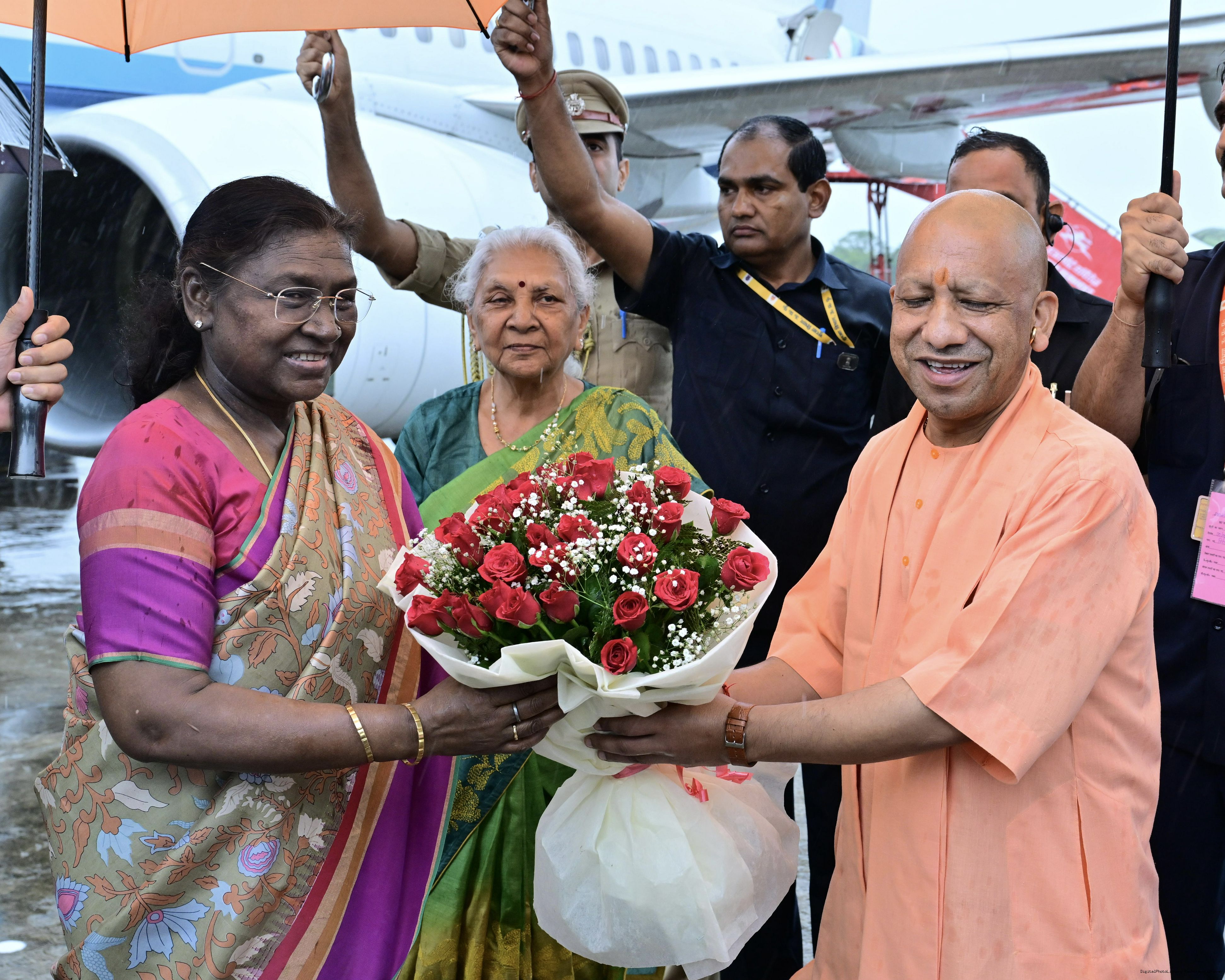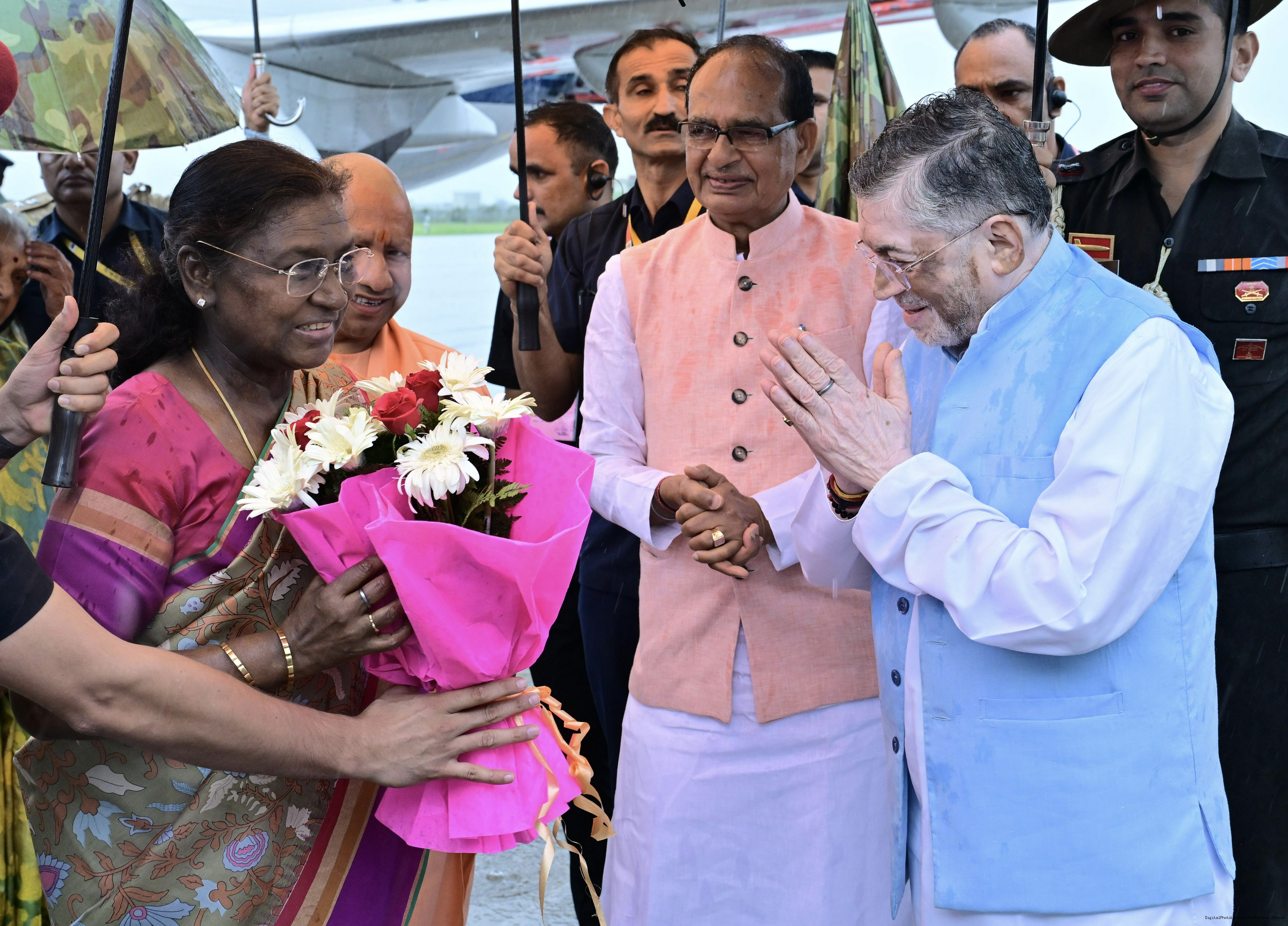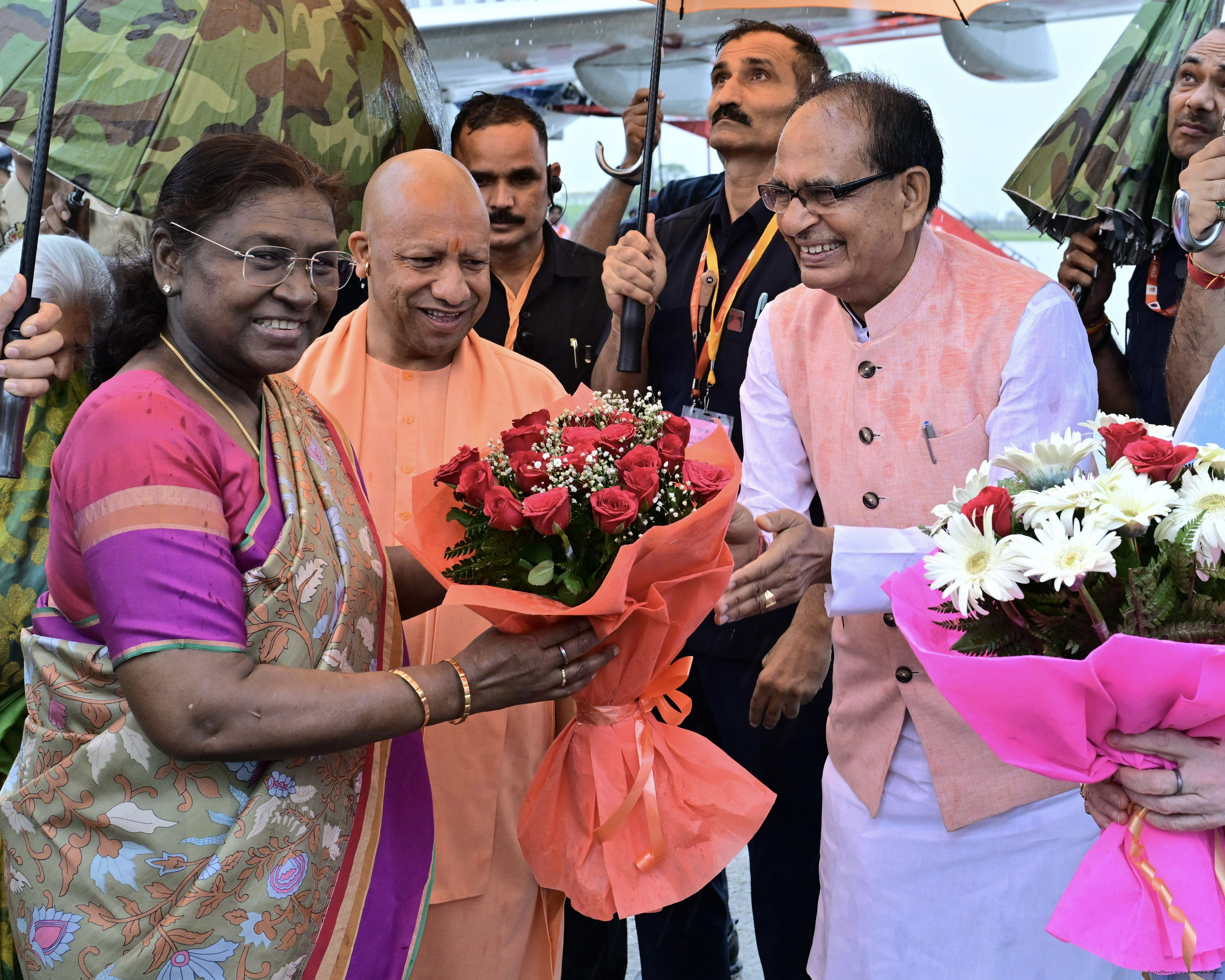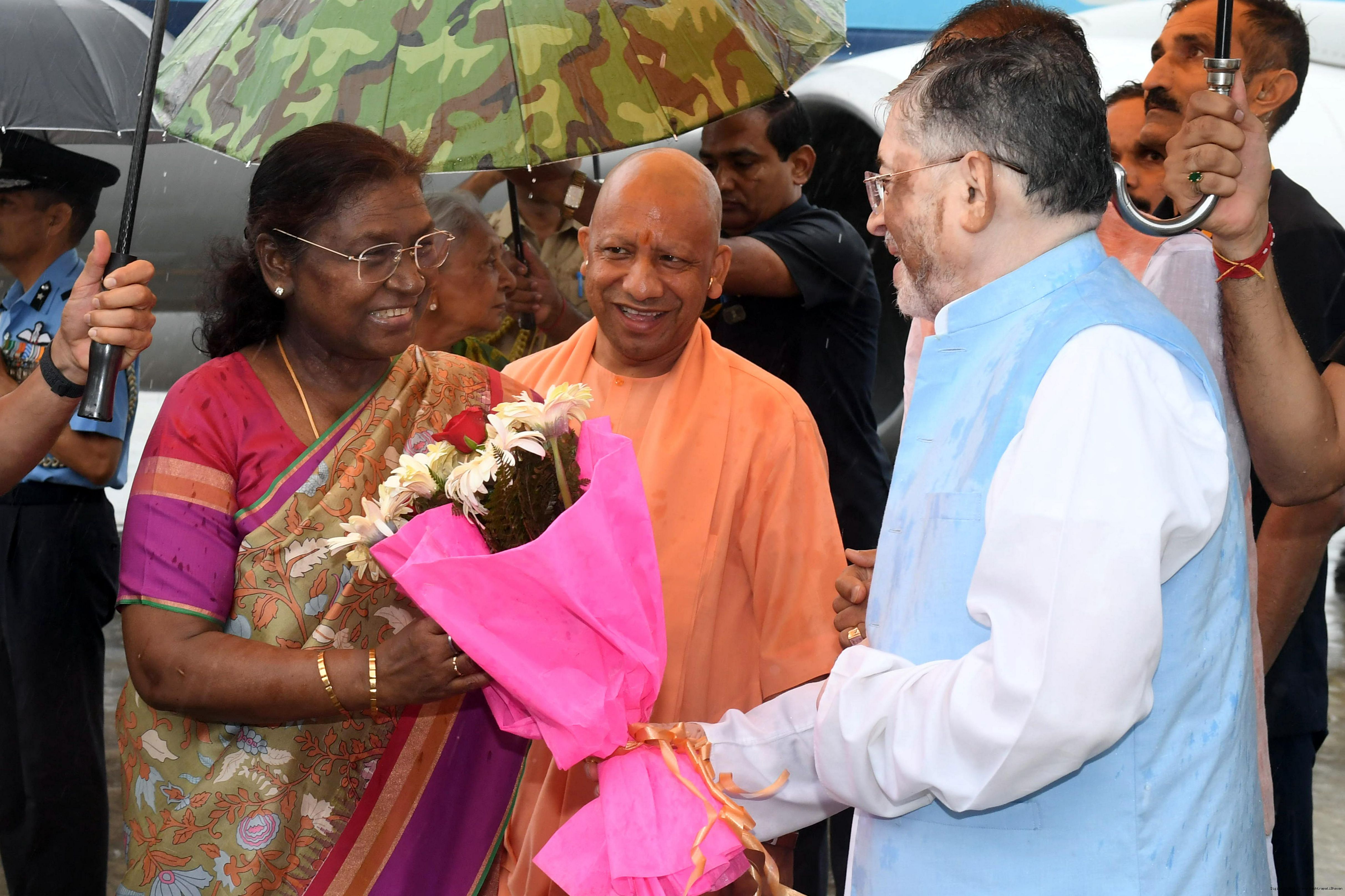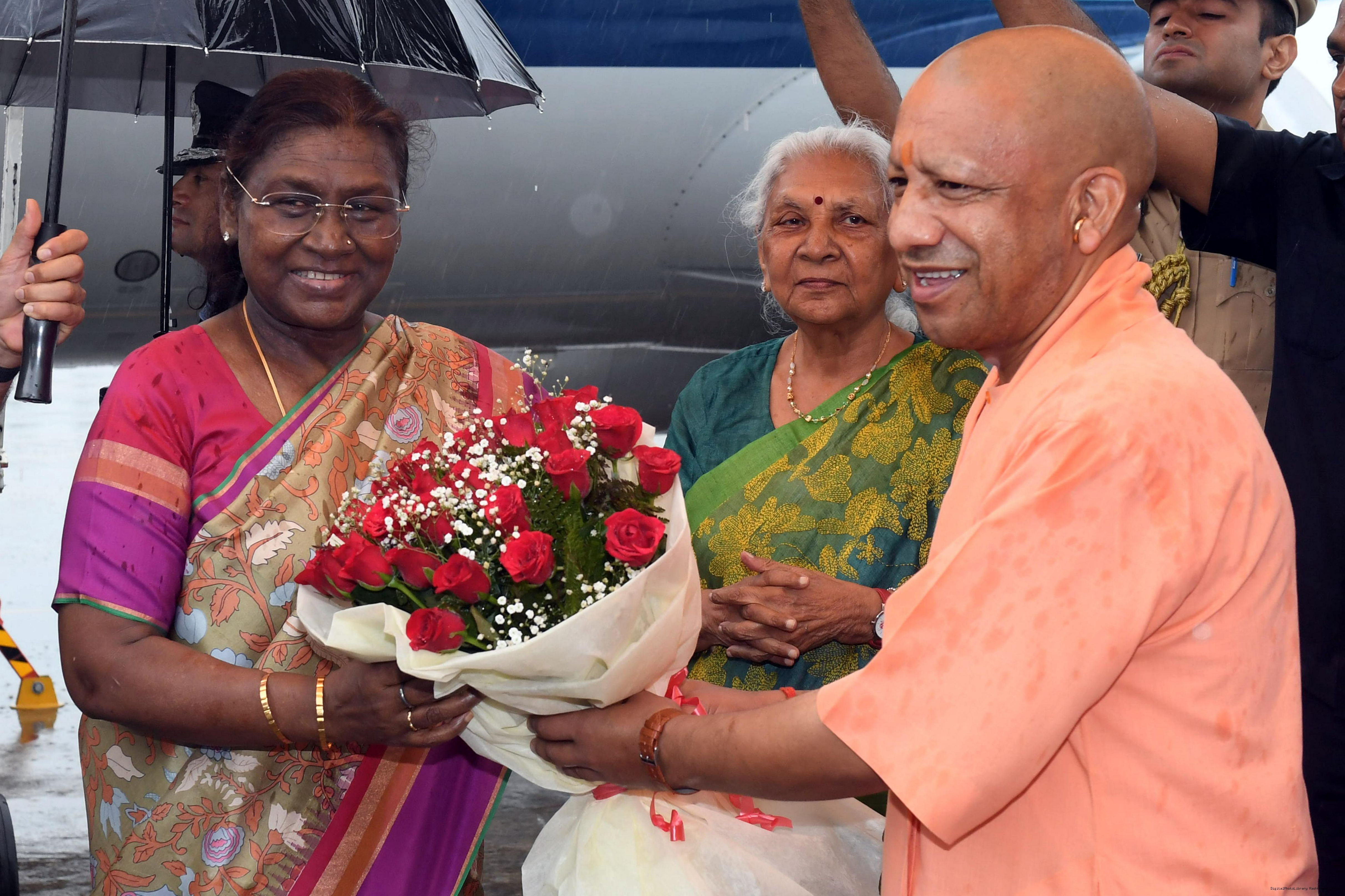 | Caption: | The Governor of Uttar Pradesh, Smt Anandiben Patel, Chief Minister Yogi Adityanath and Union Minister for Agriculture Farmers Welfare and Rural Development, Shri Shivraj Singh Chouhan received the President of India, Smt Droupadi Murmu on her arrival at Bareilly on June 30, 2025. |