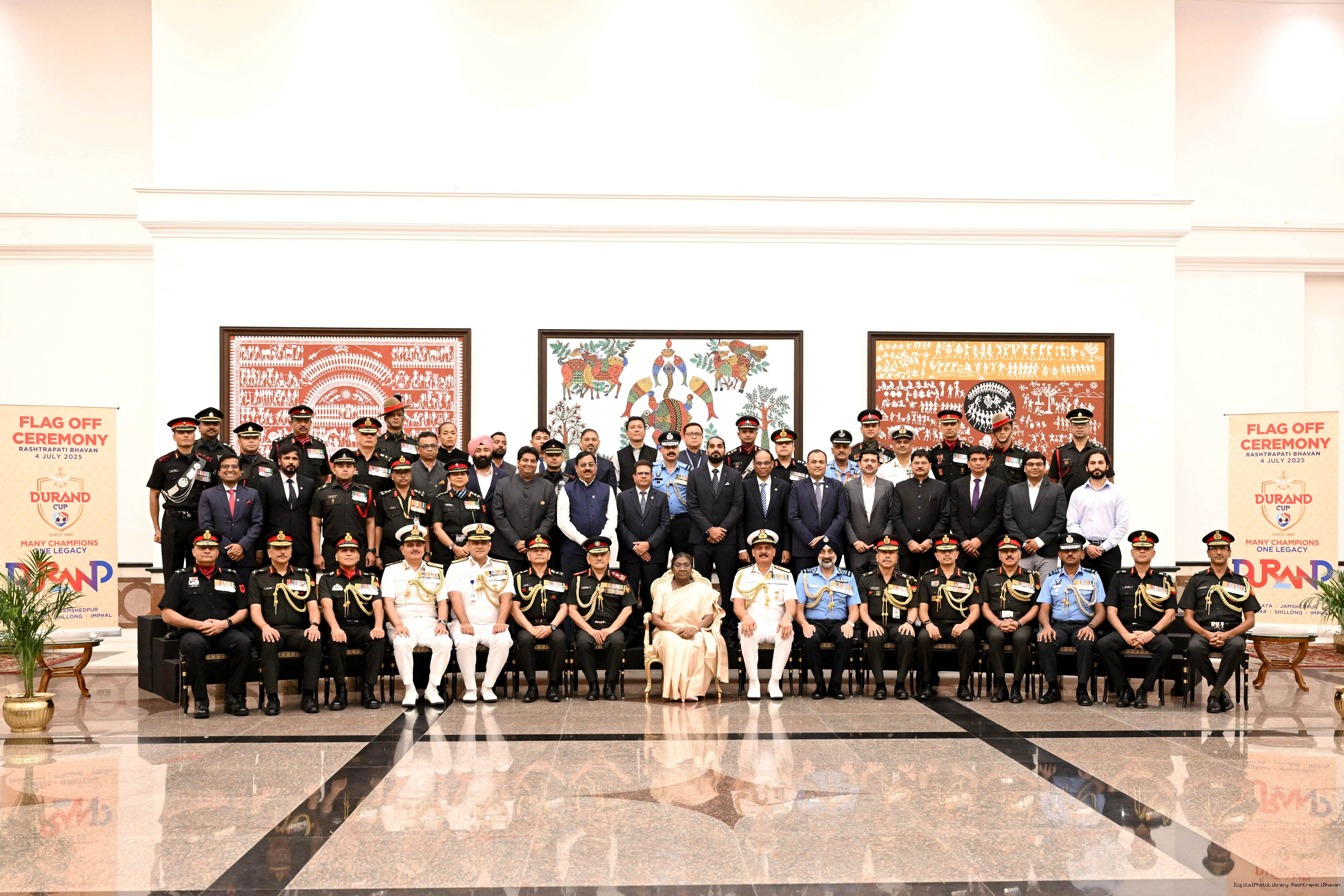 | Caption: | The President of India, Smt Droupadi Murmu unveiled and flagged off the Trophies of the Durand Cup Tournament 2025 at a function held at Rashtrapati Bhavan Cultural Centre on July 4, 2025. |