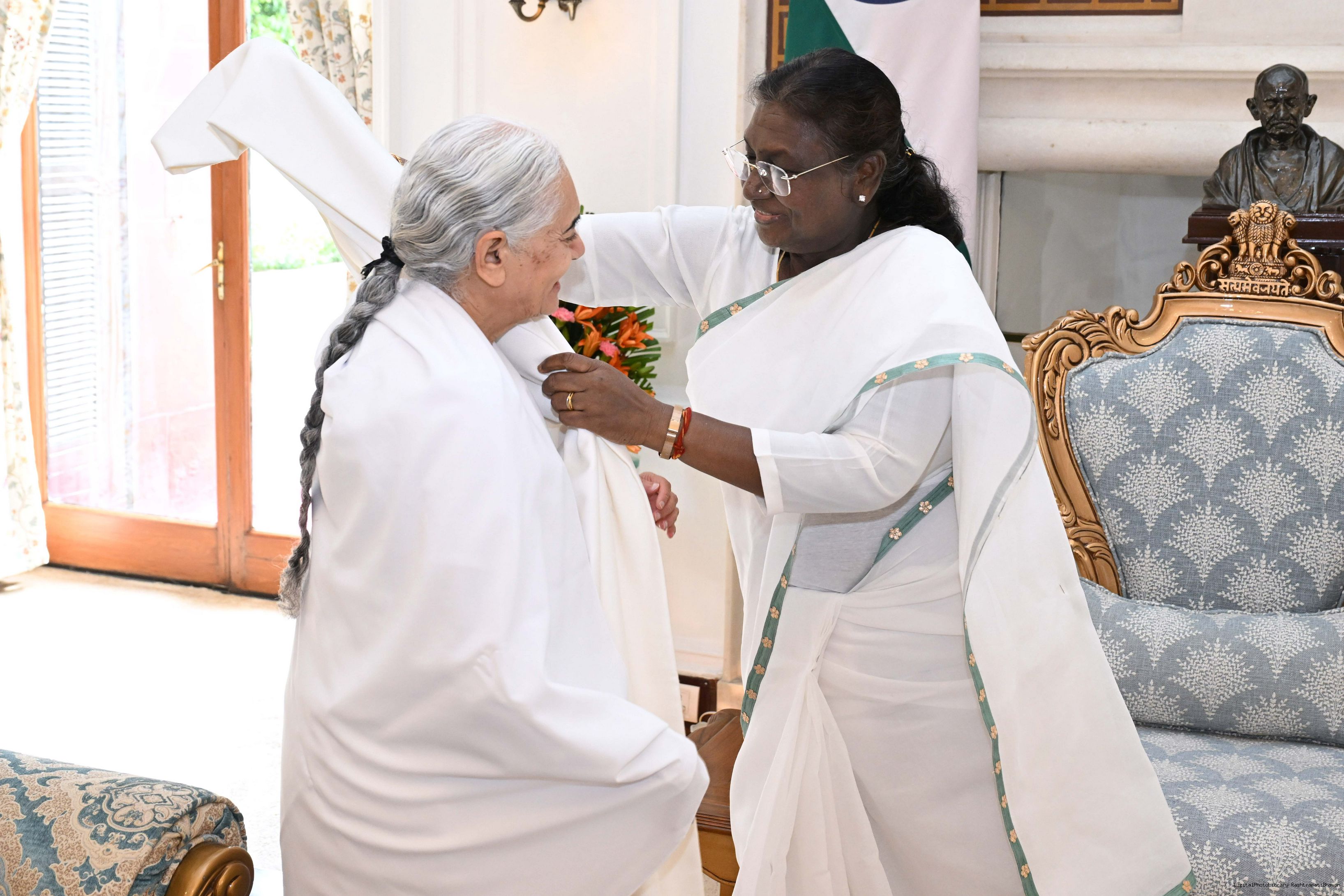 | Caption: | Rajyogini BK Jayanti, Additional Chief of Brahma Kumaris along with Rajyogini BK Asha and Nikita meeting with the President of India, Smt Droupadi Murmu at Rashtrapati Bhavan on July 7, 2025. |