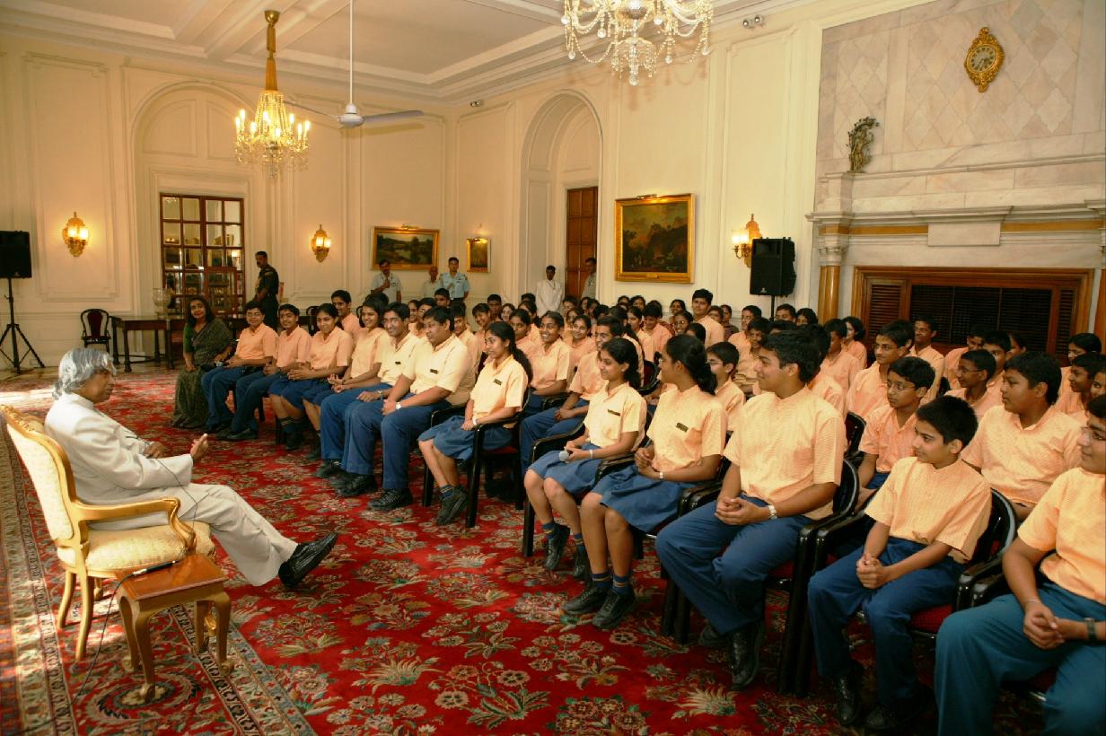 | Caption: | The Students from Sanskriti School Chanakyapuri calling on the President of India, Dr A P J Abdul Kalam at the Yellow Drawing Room of Rashtrapati Bhavan in New Delhi on Aug 18, 2004 |