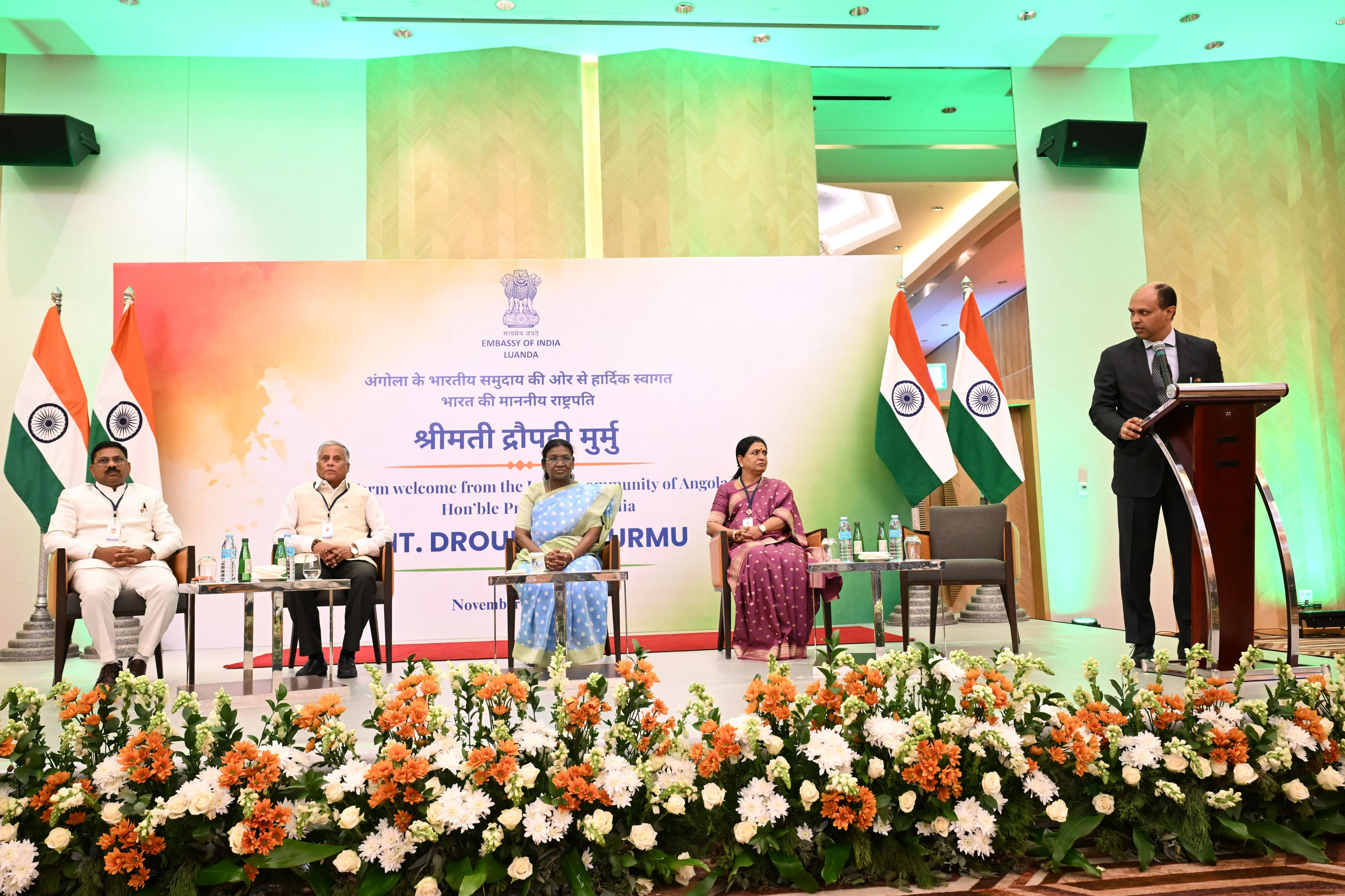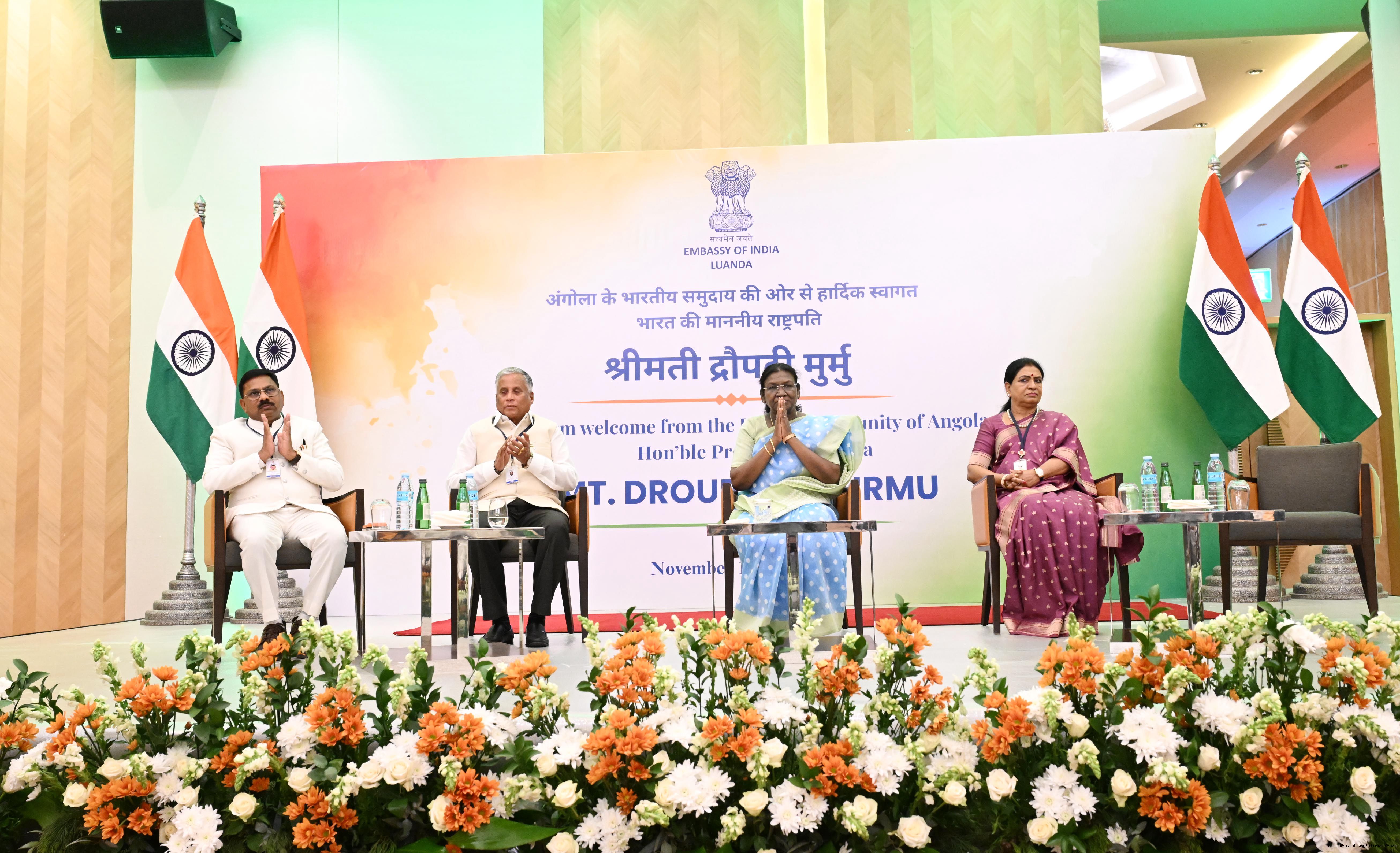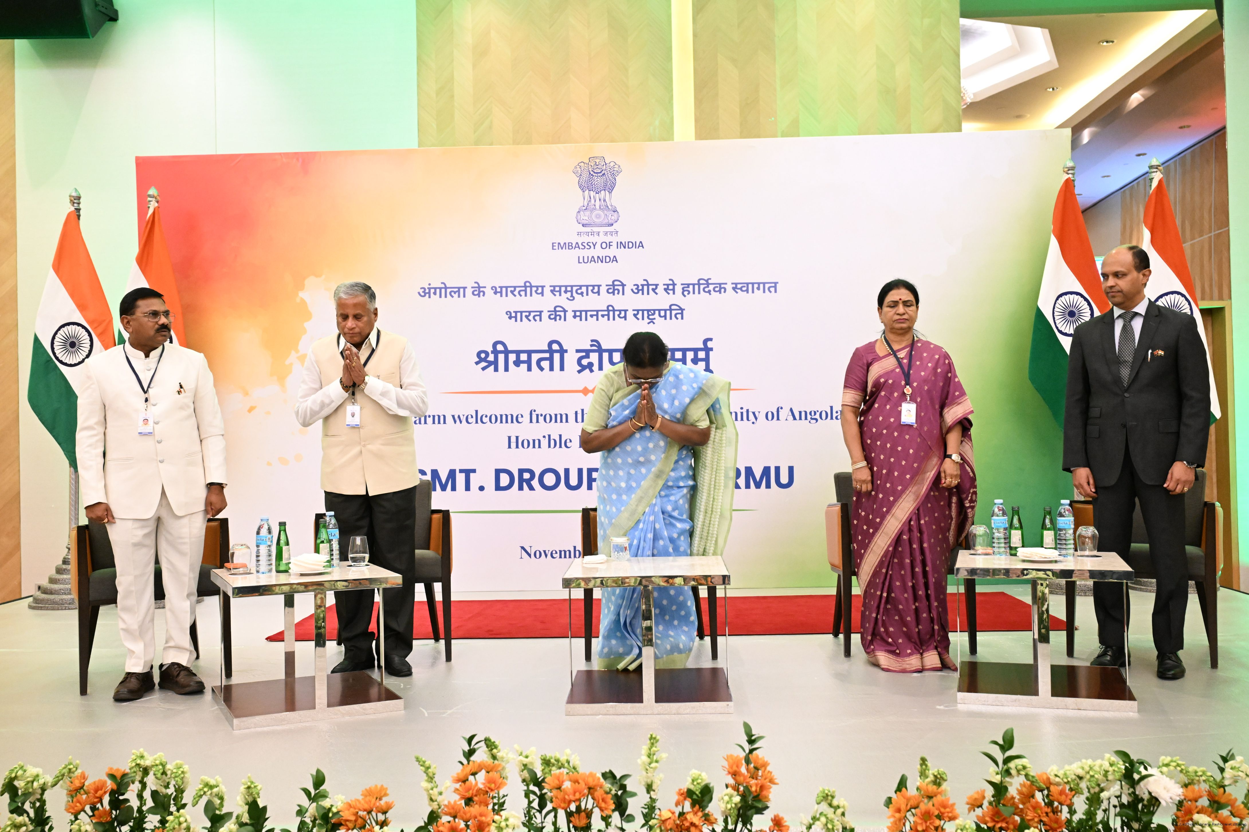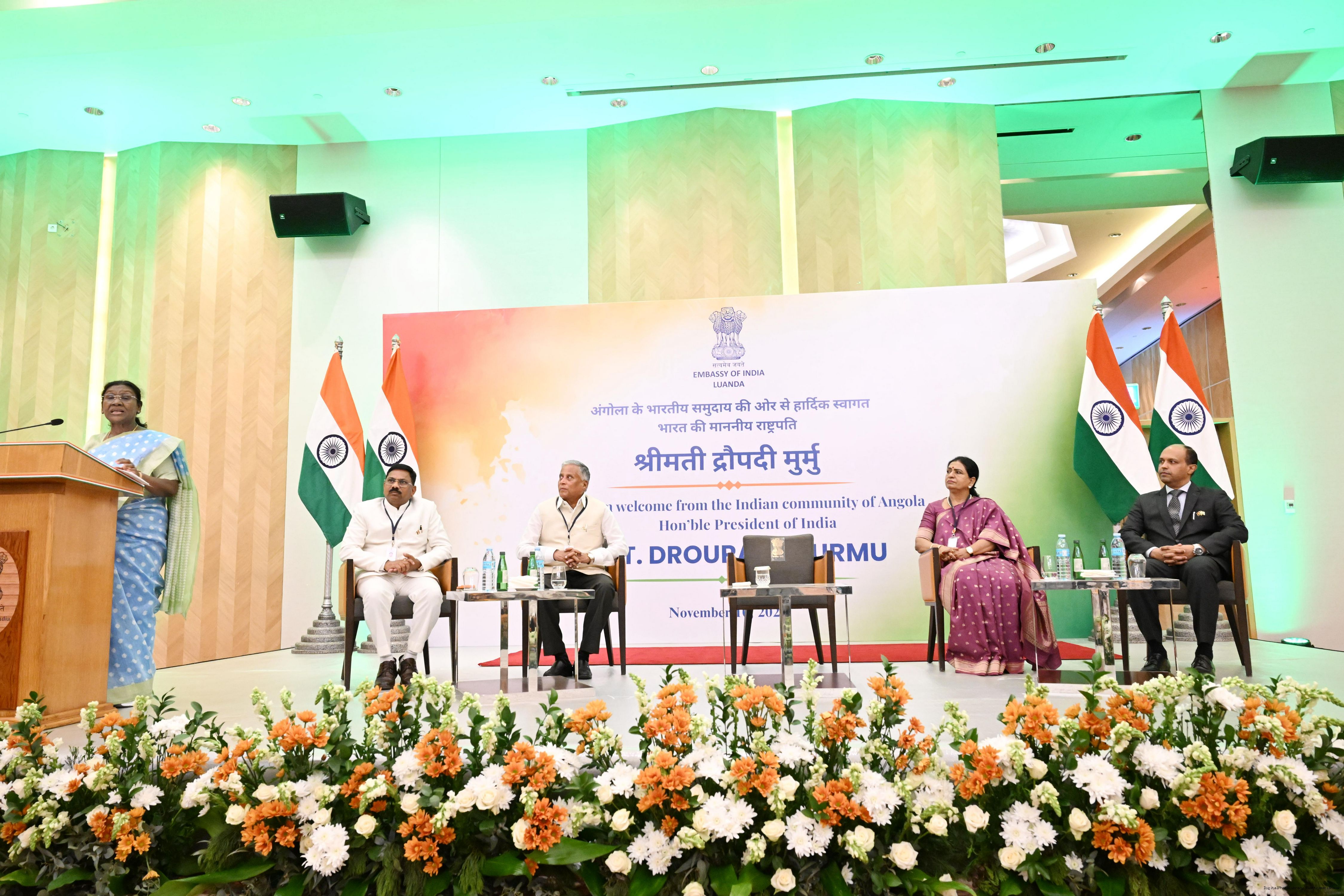 | Caption: | The President of India, Smt. Droupadi Murmu addressed the members of the Indian Community at a Reception hosted by the Ambassador of India to Angola at Luanda on November 10, 2025. |