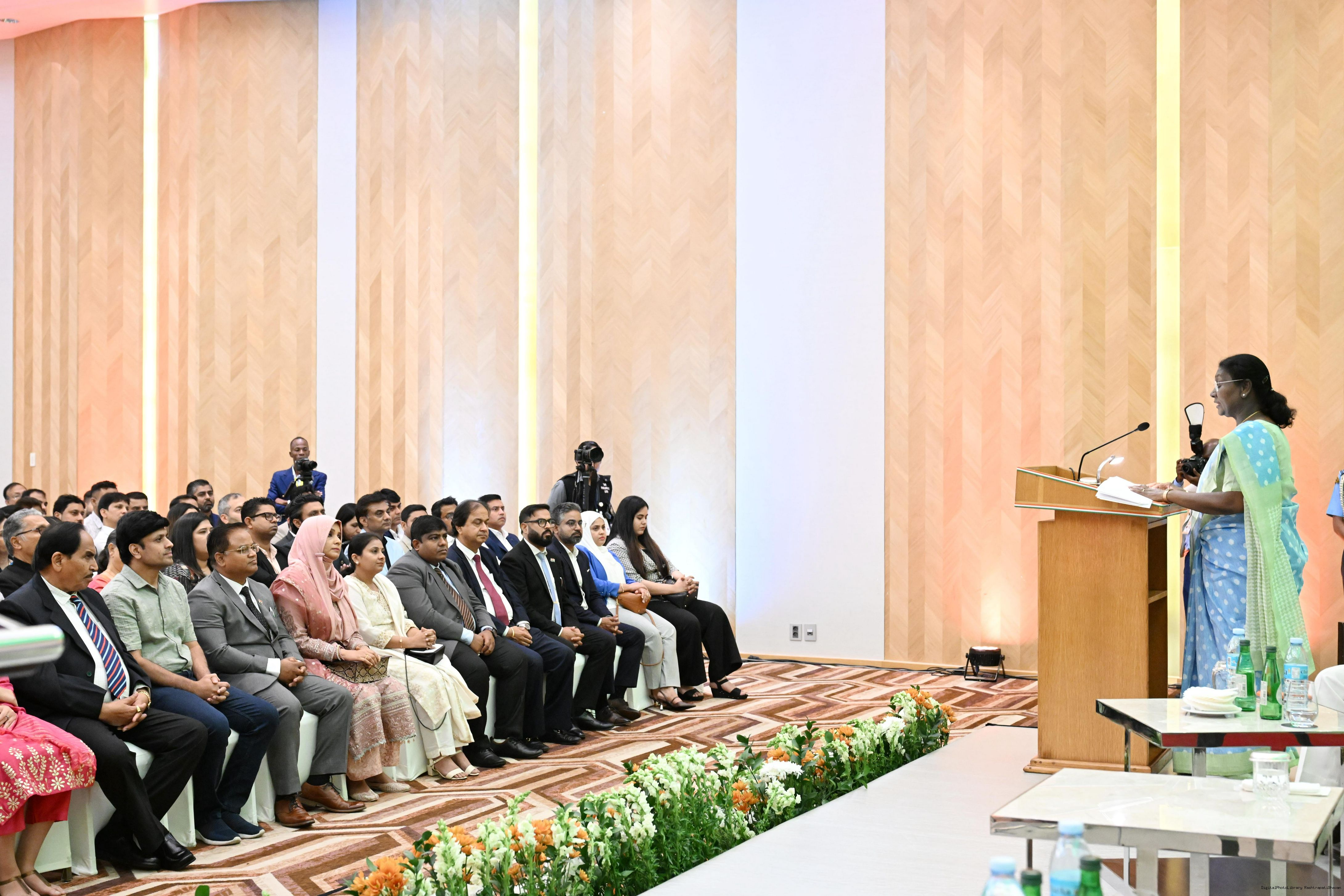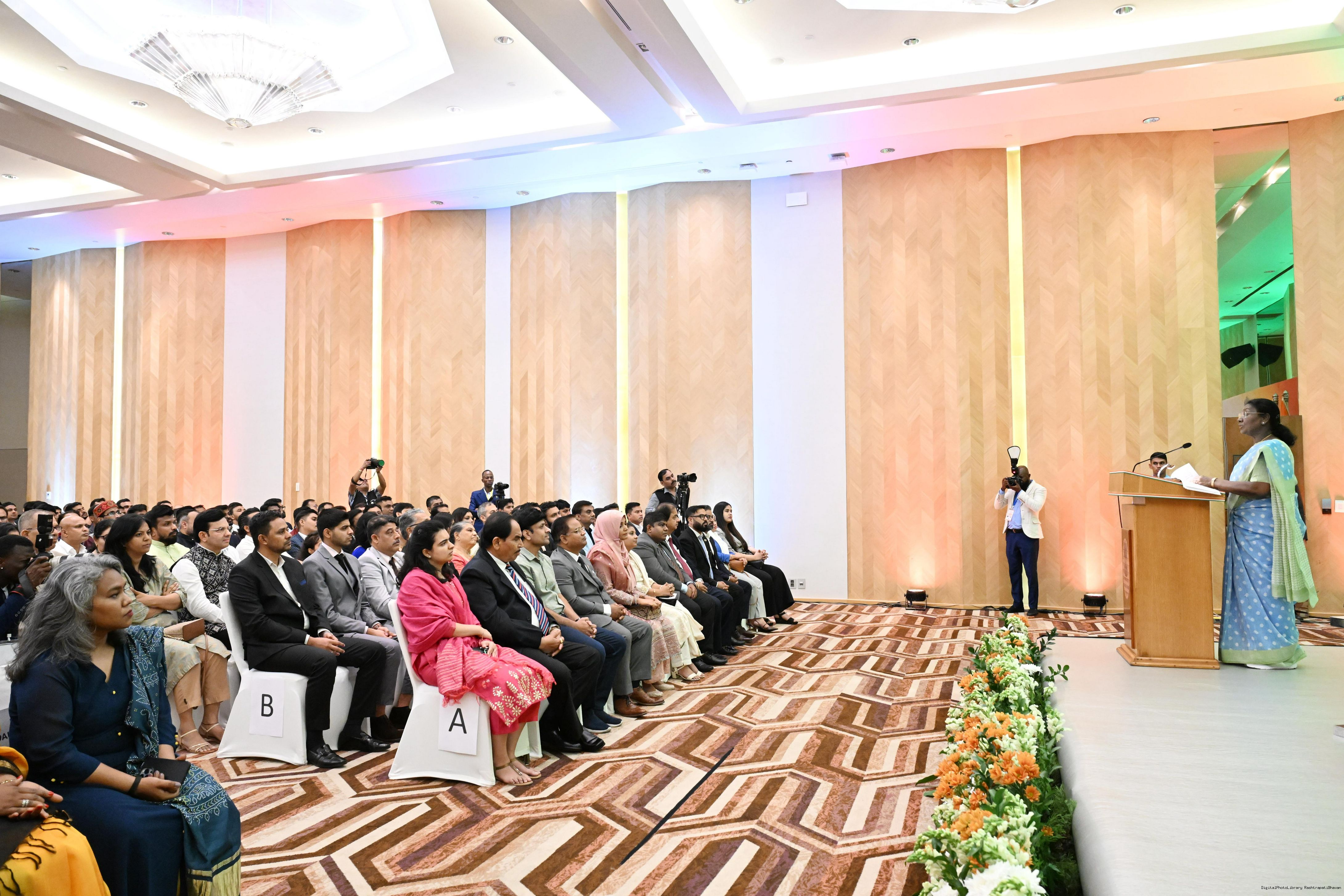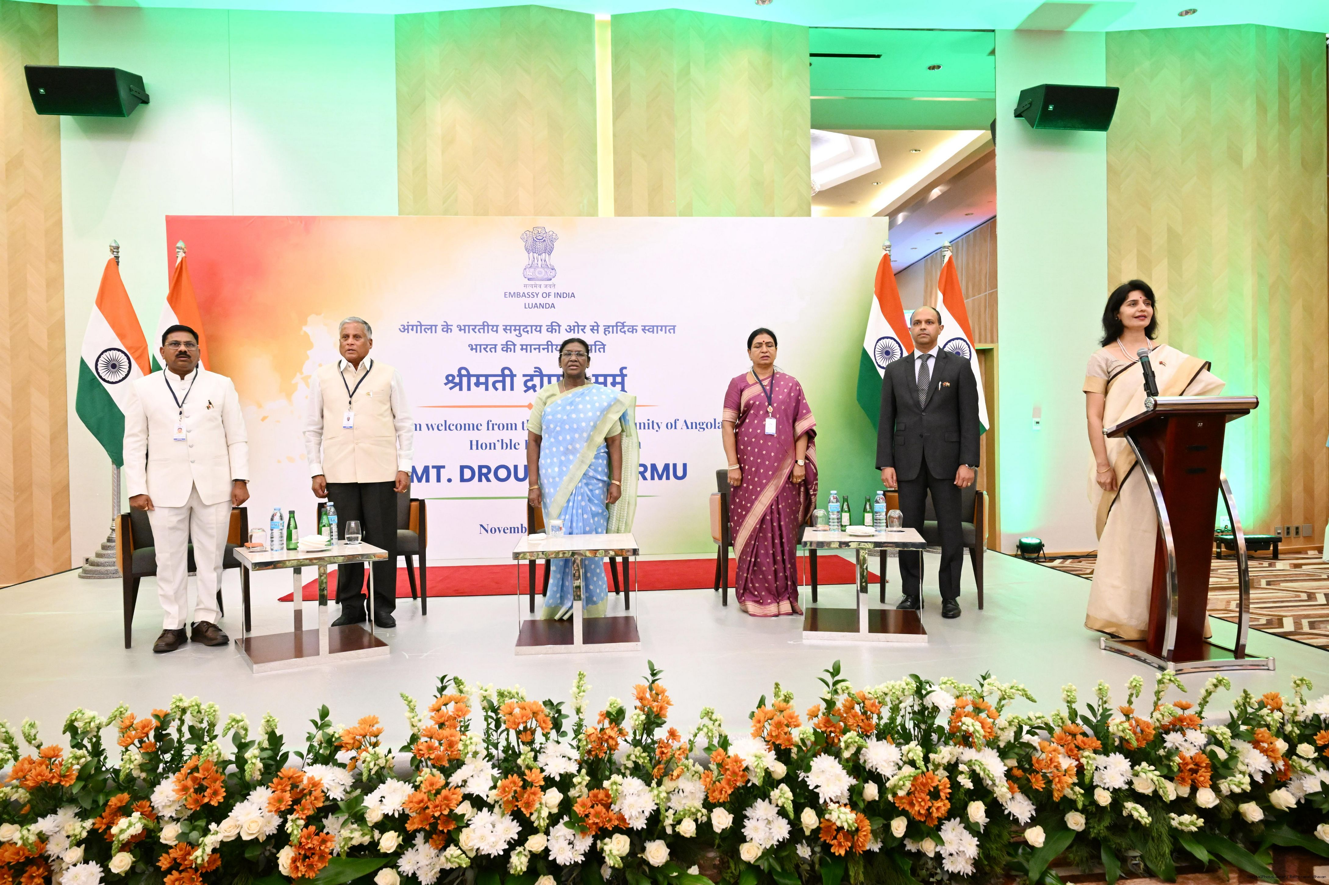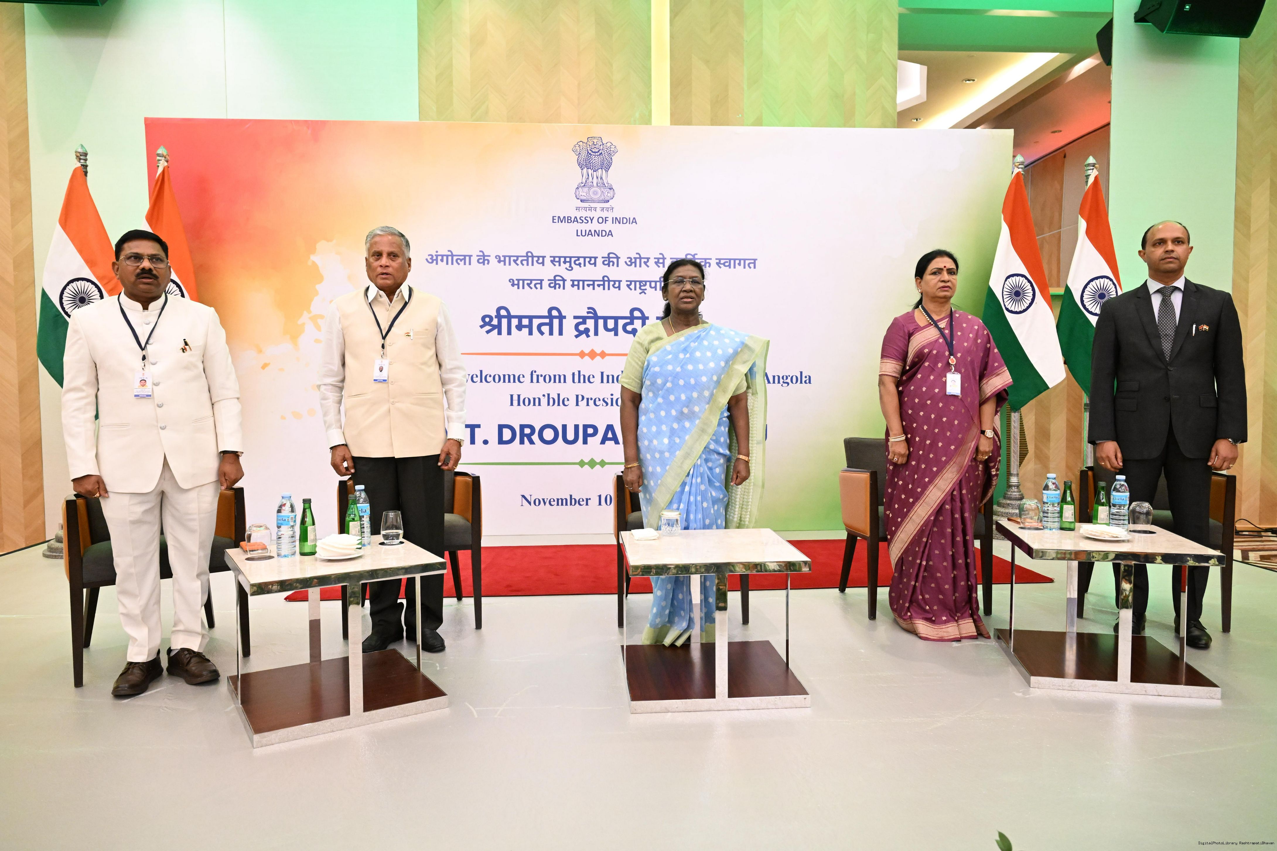 | Caption: | The President of India, Smt. Droupadi Murmu addressed the members of the Indian Community at a Reception hosted by the Ambassador of India to Angola at Luanda on November 10, 2025. |
