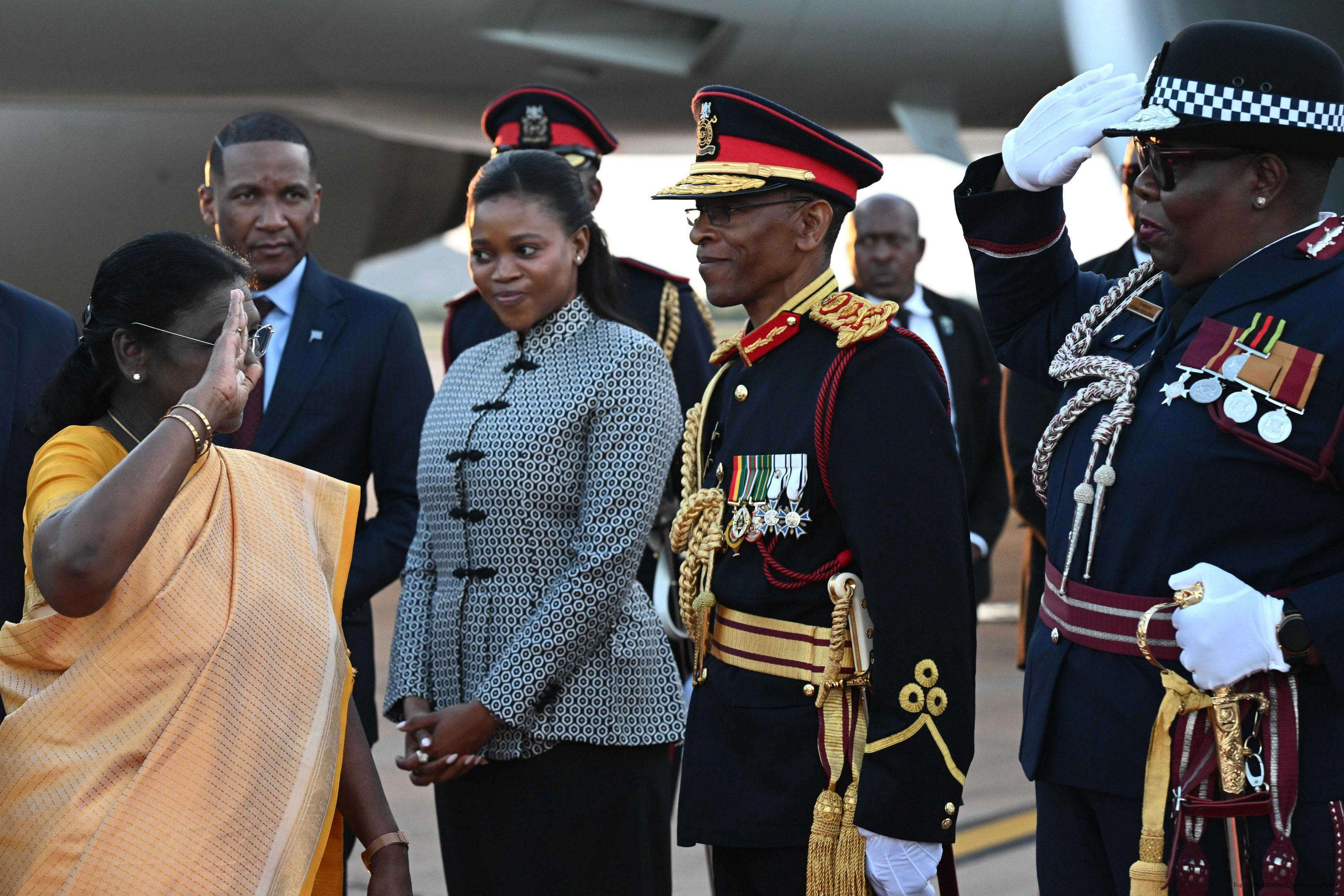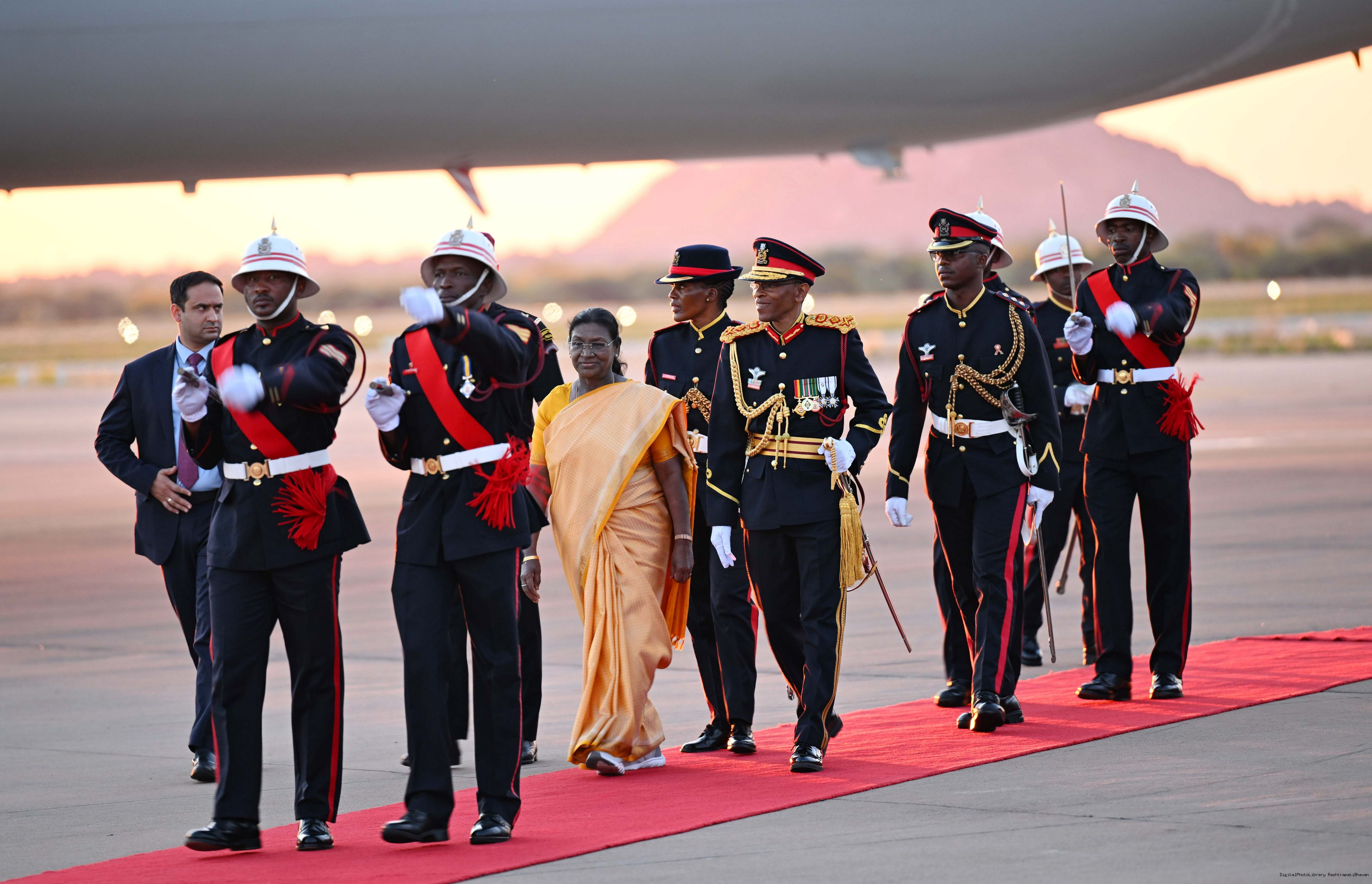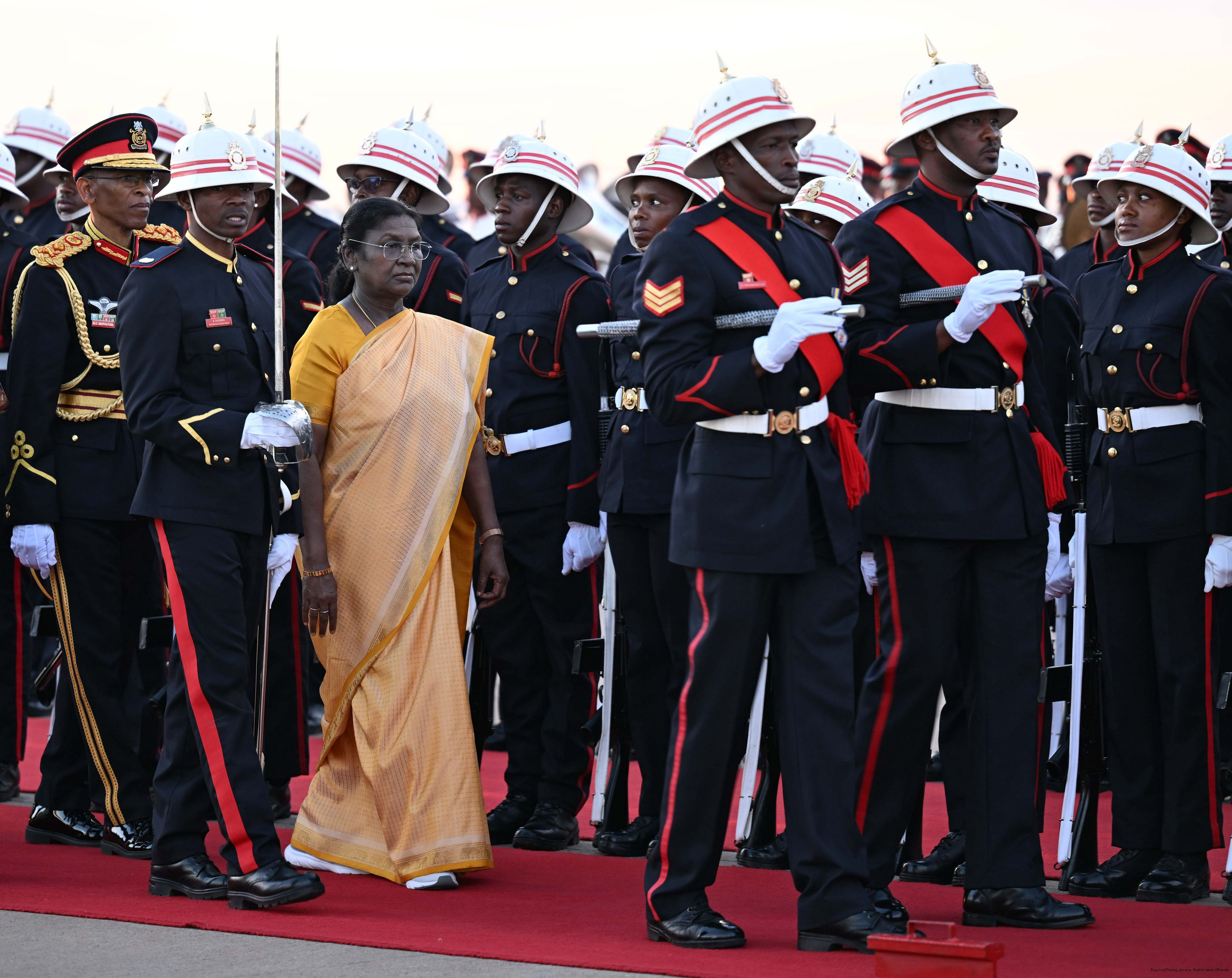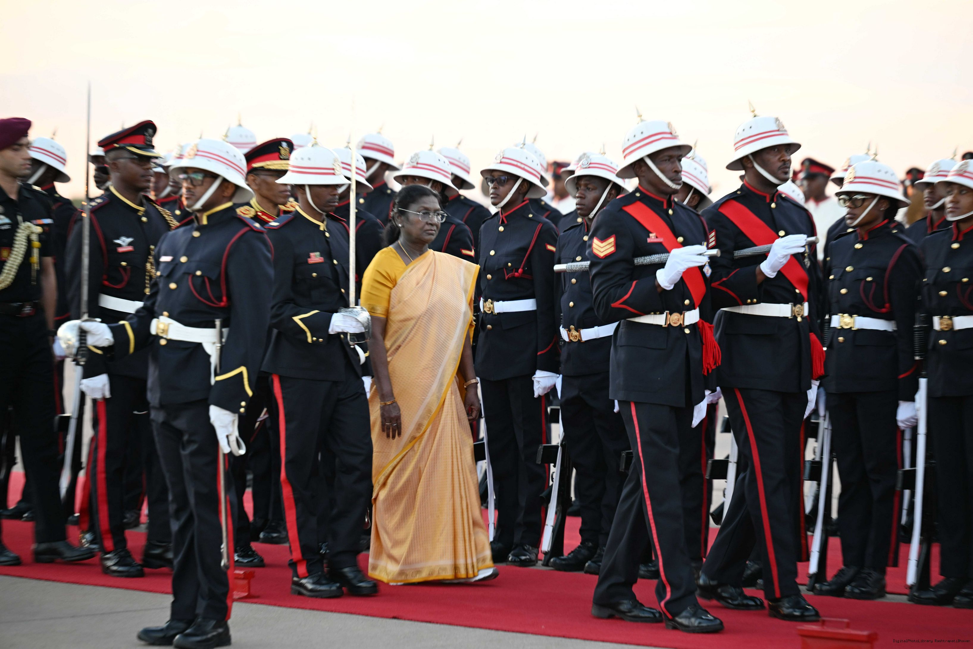 | Caption: | The President of India, Smt. Draupadi Murmu was ceremonially received and presented with a Guard of Honour by His Excellency Advocate Duma Gideon Boko, the President of Botswana at the Sir Seretse Khama International Airport, Gaborone, Botswana on November 11, 2025. |