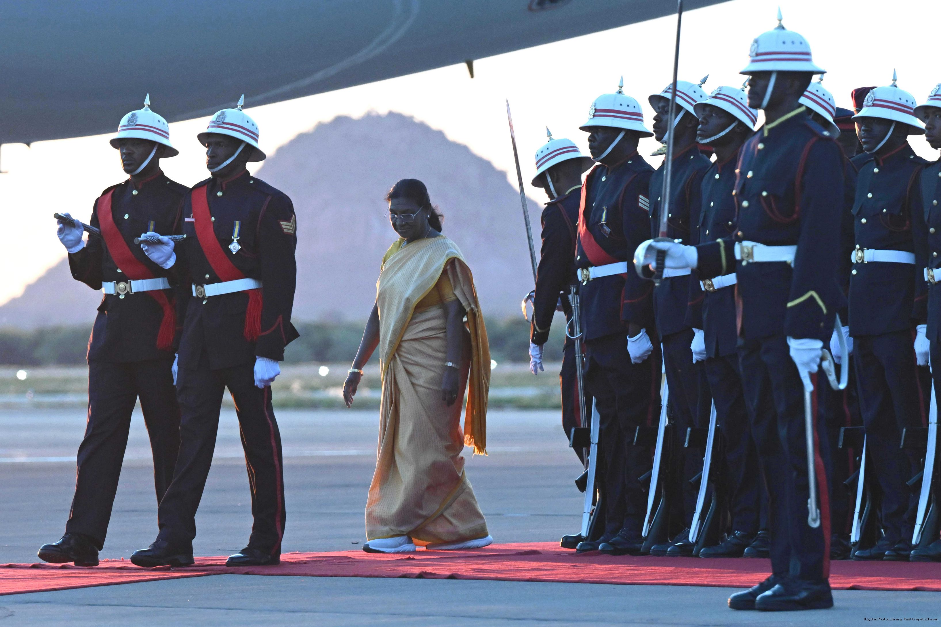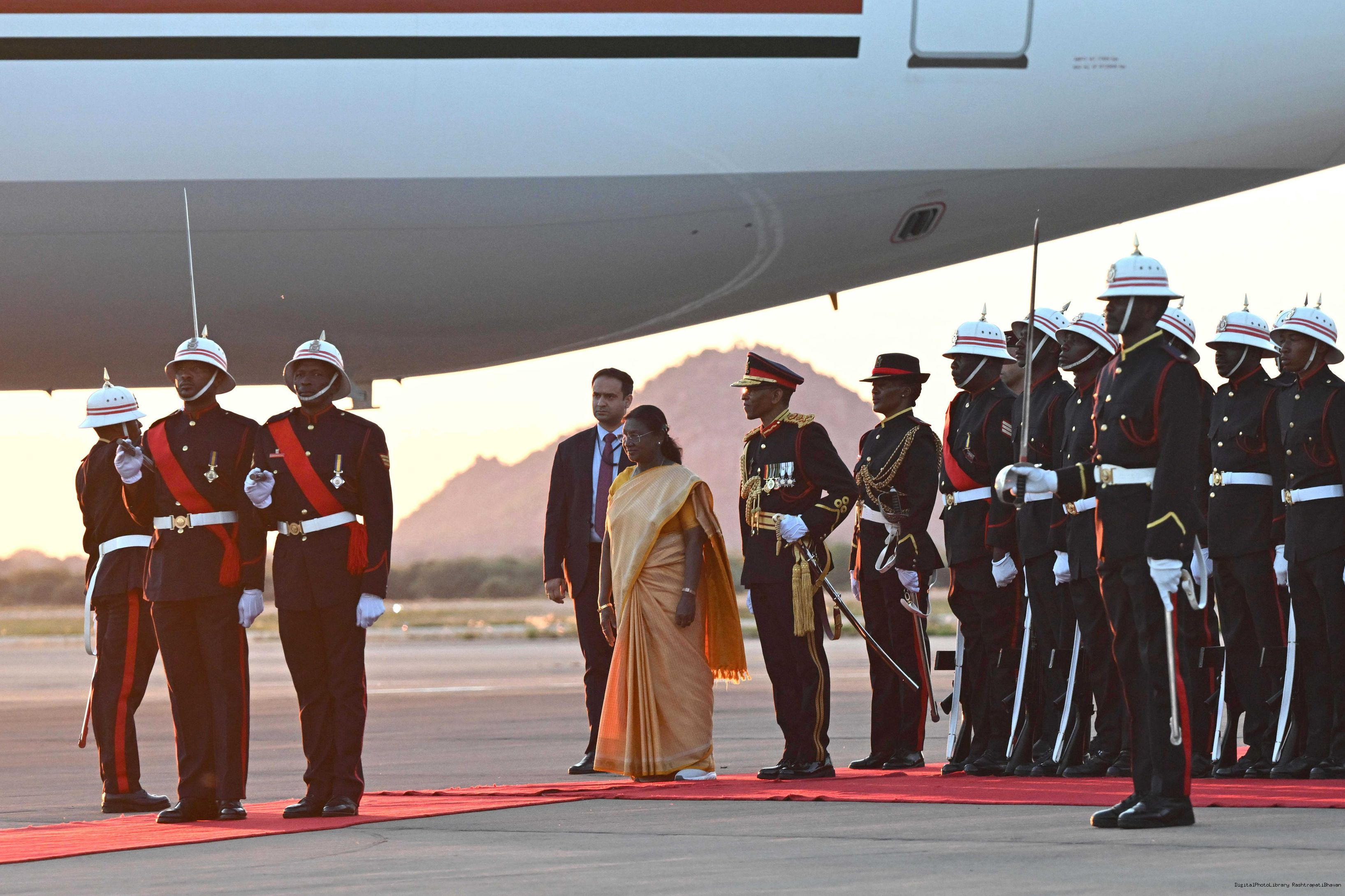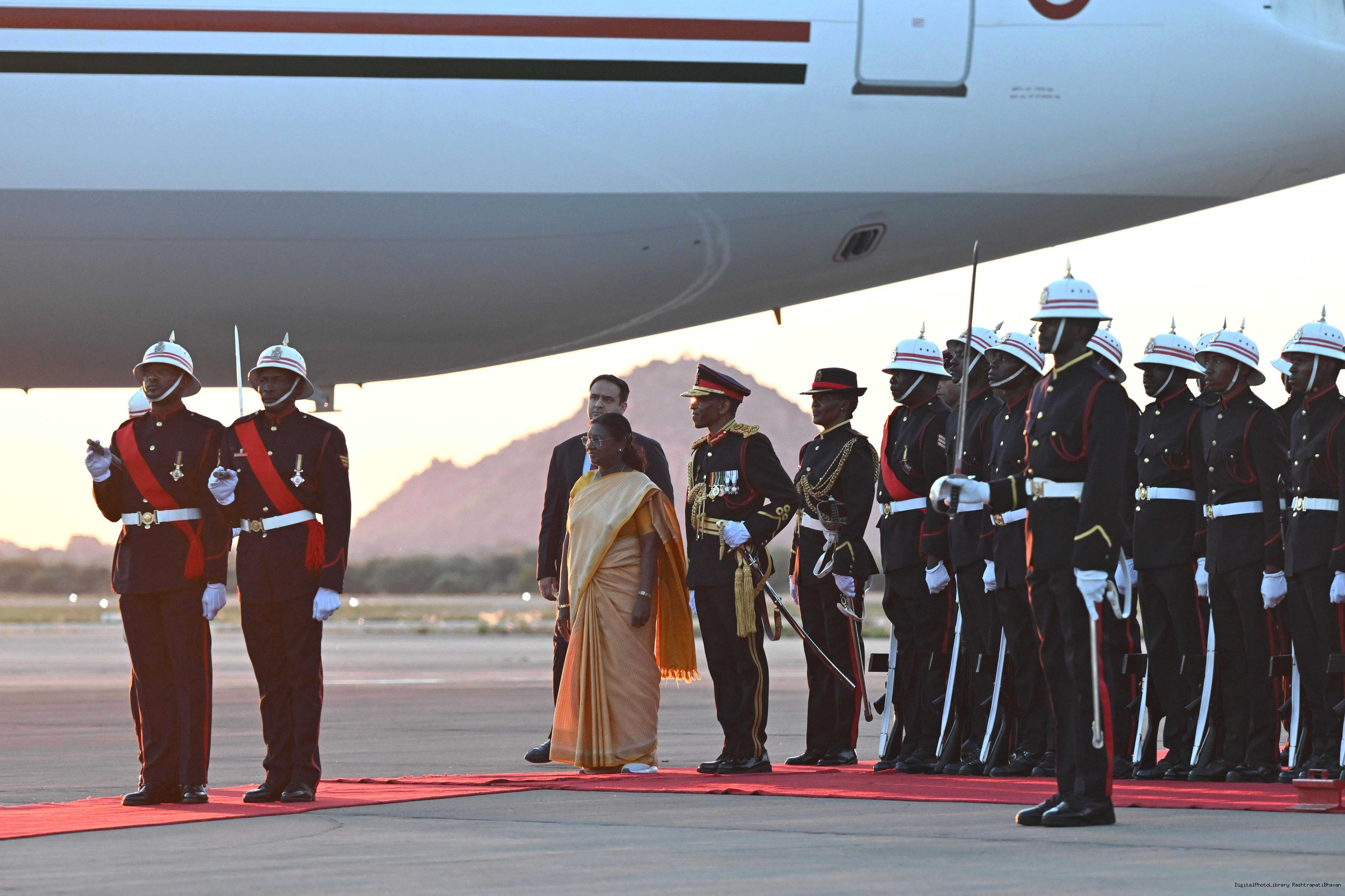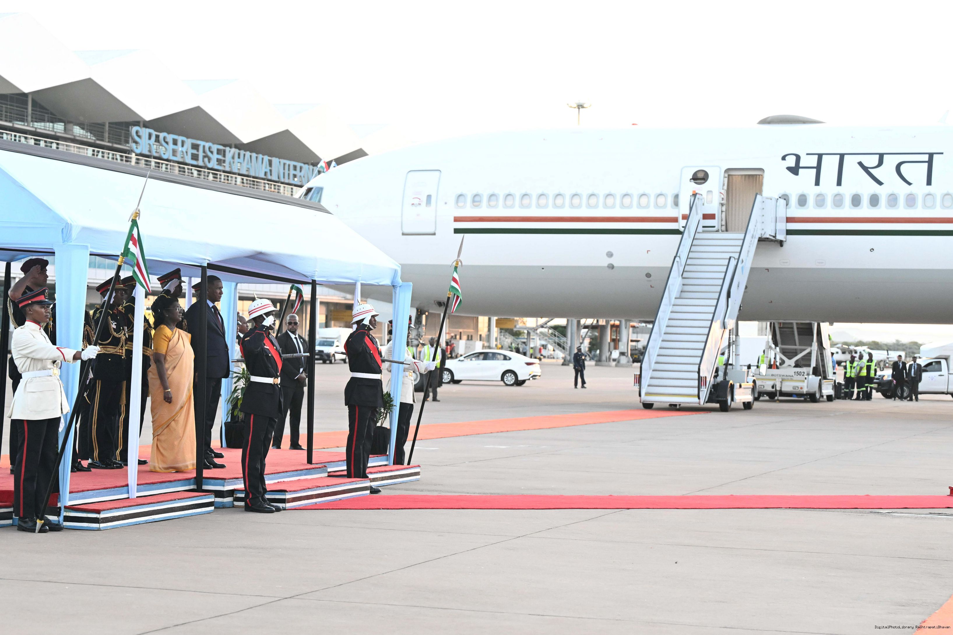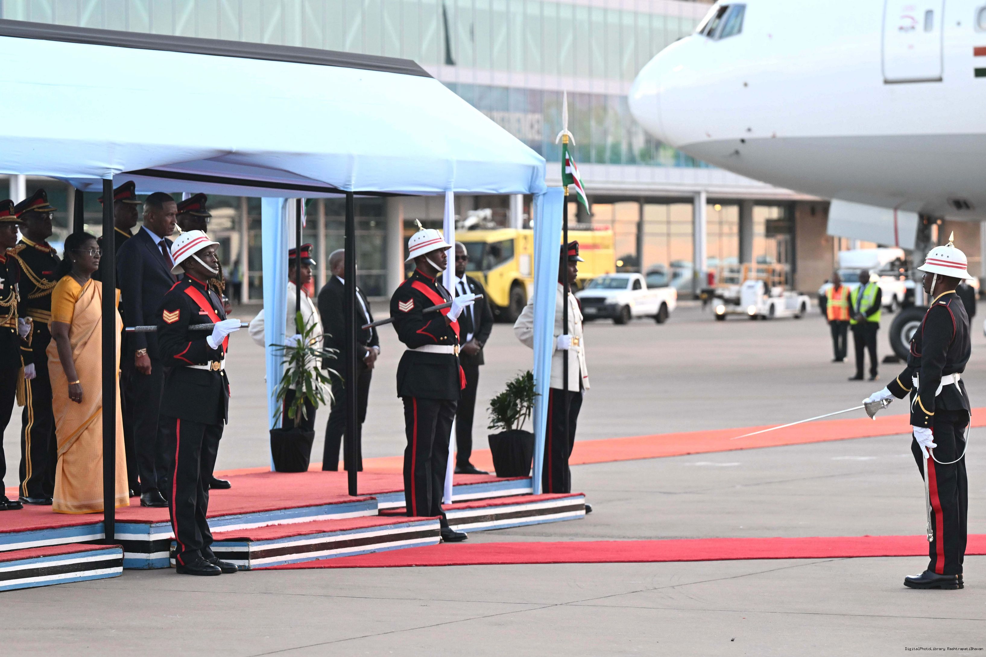 | Caption: | The President of India, Smt. Draupadi Murmu was ceremonially received and presented with a Guard of Honour by His Excellency Advocate Duma Gideon Boko, the President of Botswana at the Sir Seretse Khama International Airport, Gaborone, Botswana on November 11, 2025. |