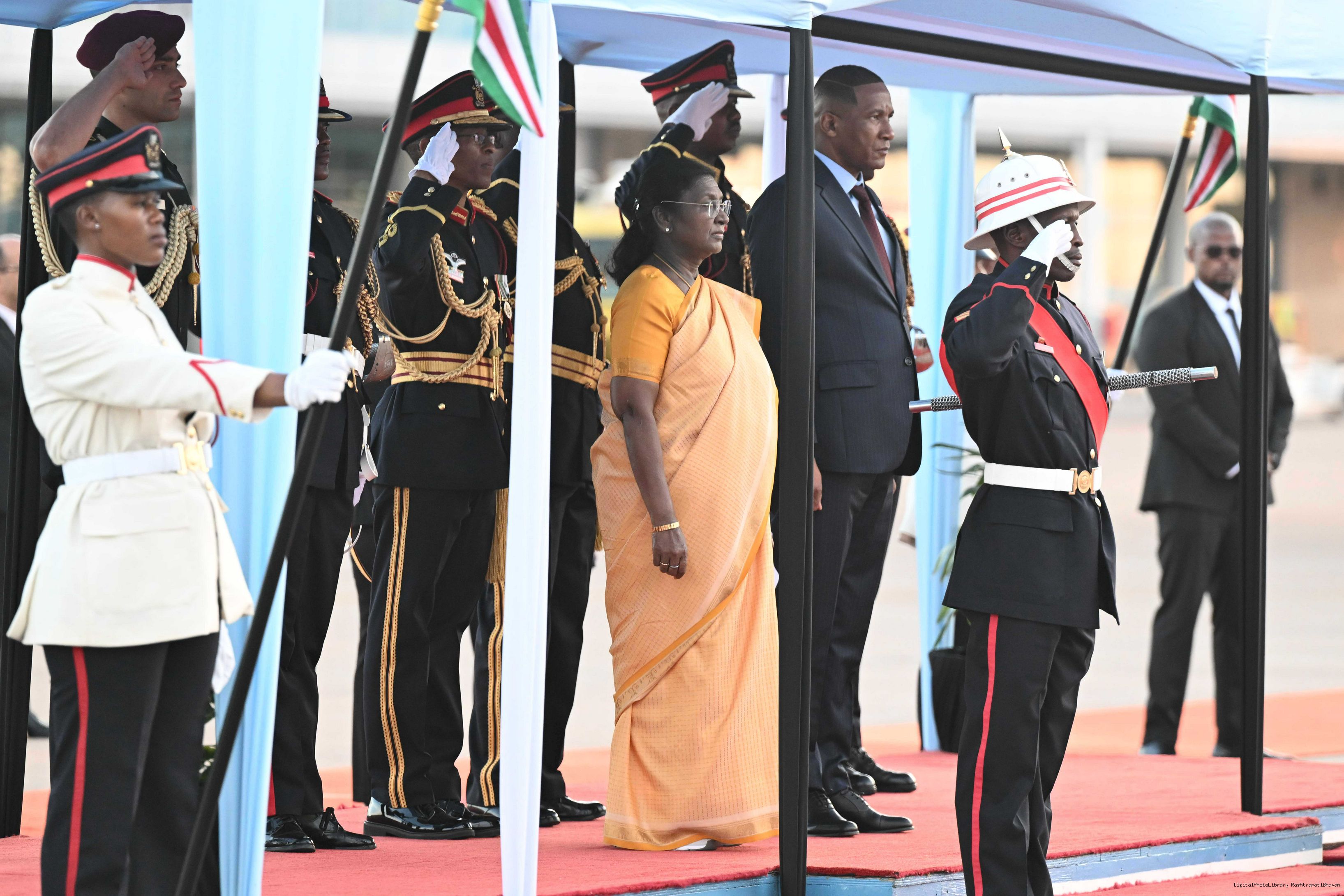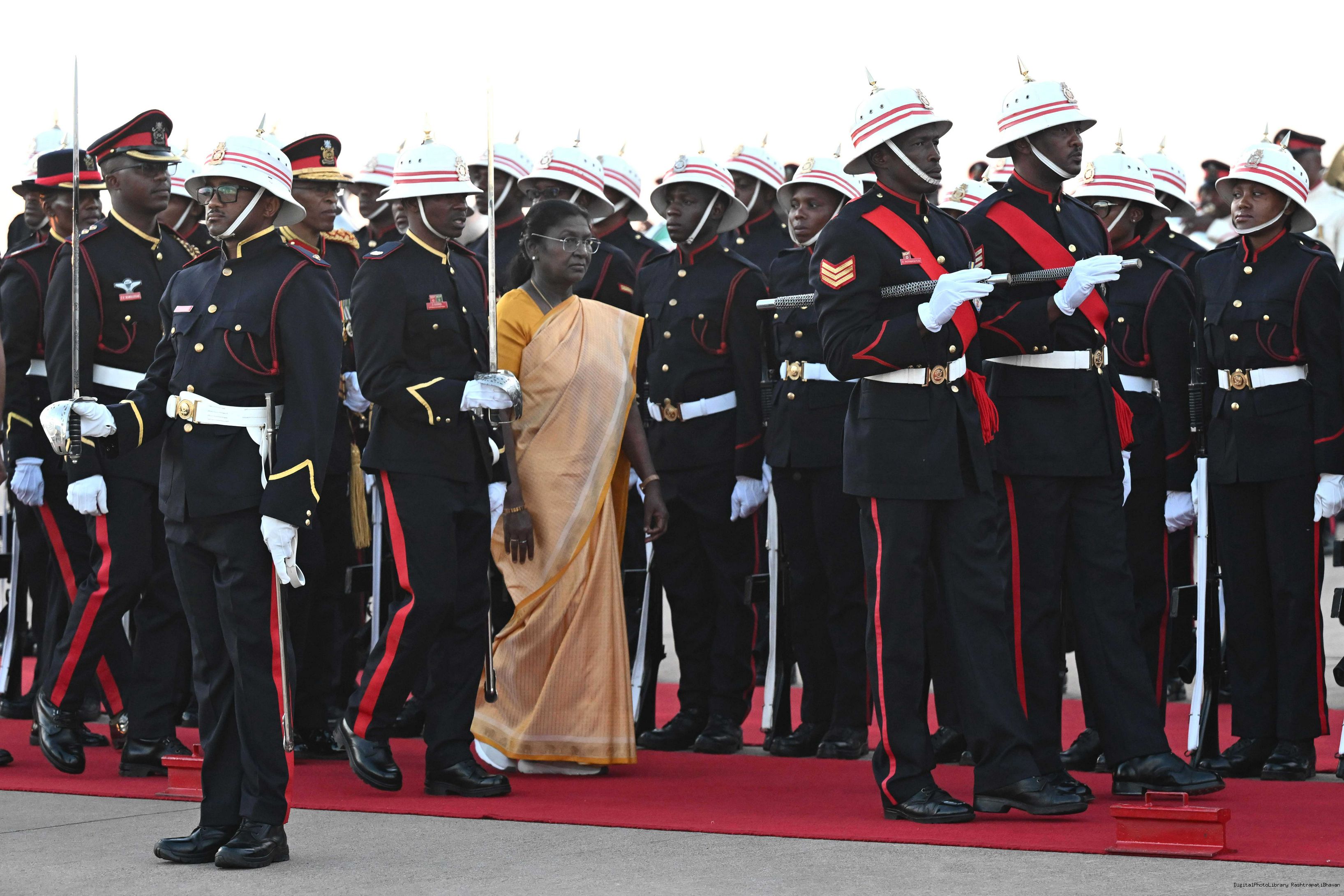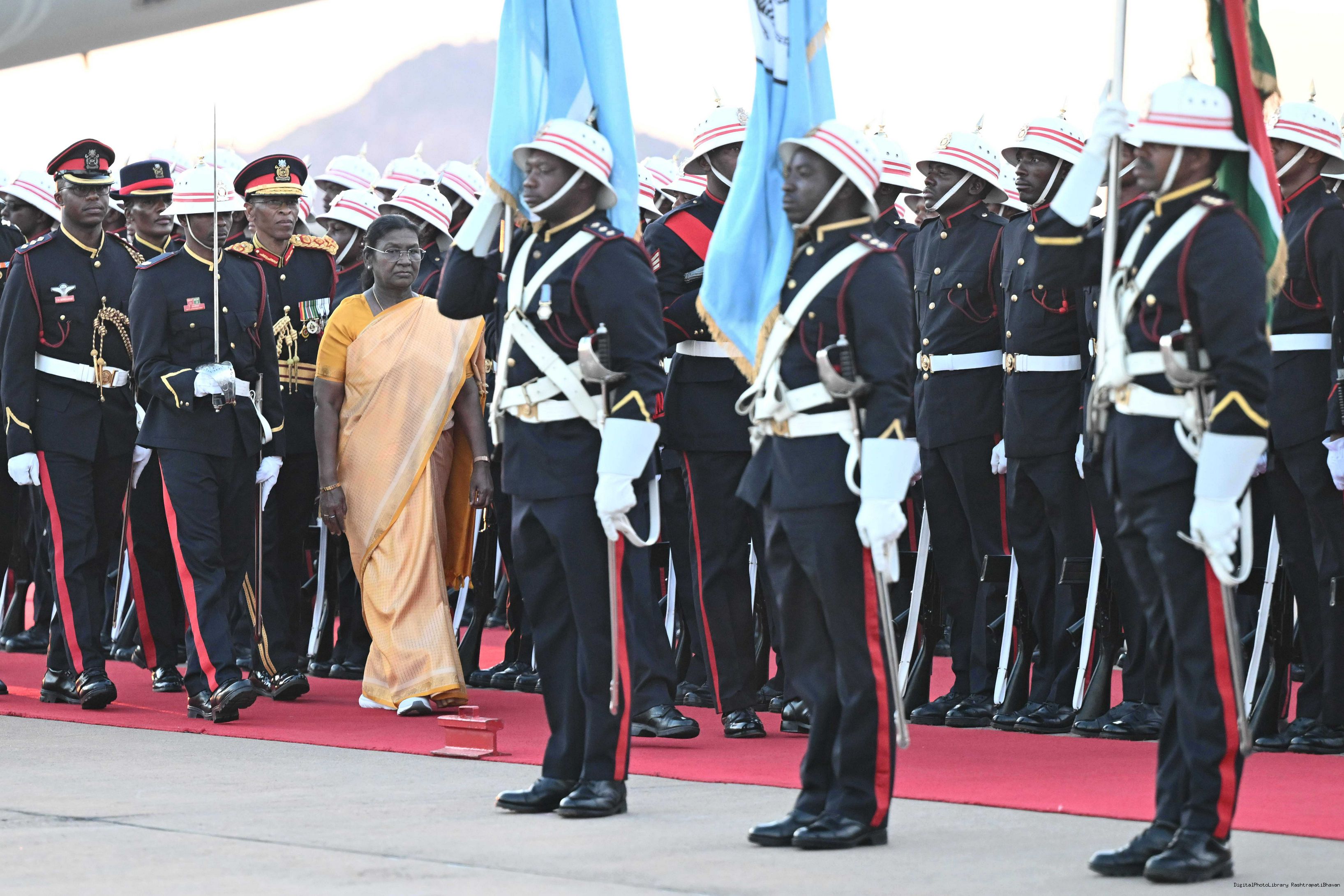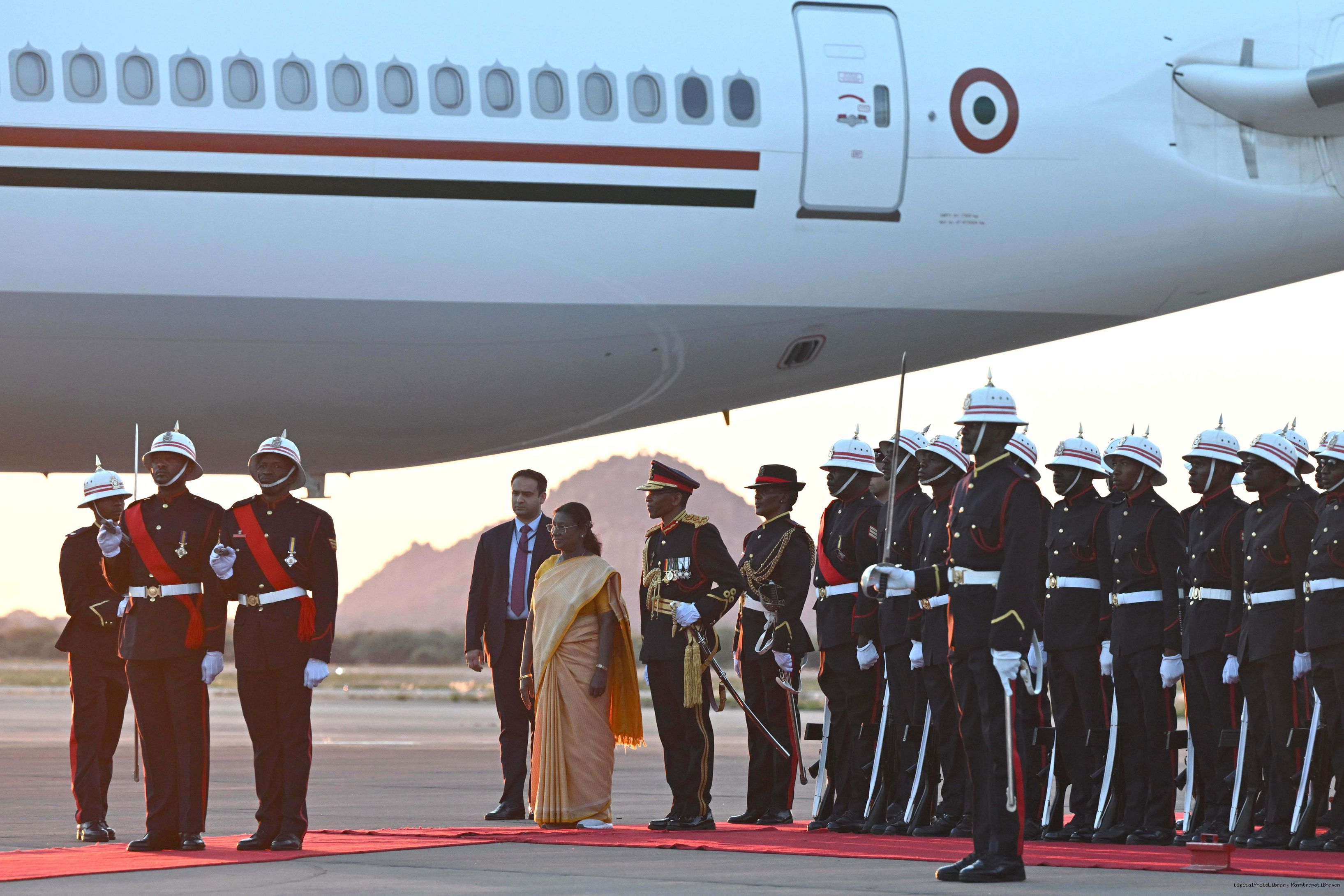 | Caption: | The President of India, Smt. Draupadi Murmu was ceremonially received and presented with a Guard of Honour by His Excellency Advocate Duma Gideon Boko, the President of Botswana at the Sir Seretse Khama International Airport, Gaborone, Botswana on November 11, 2025. |