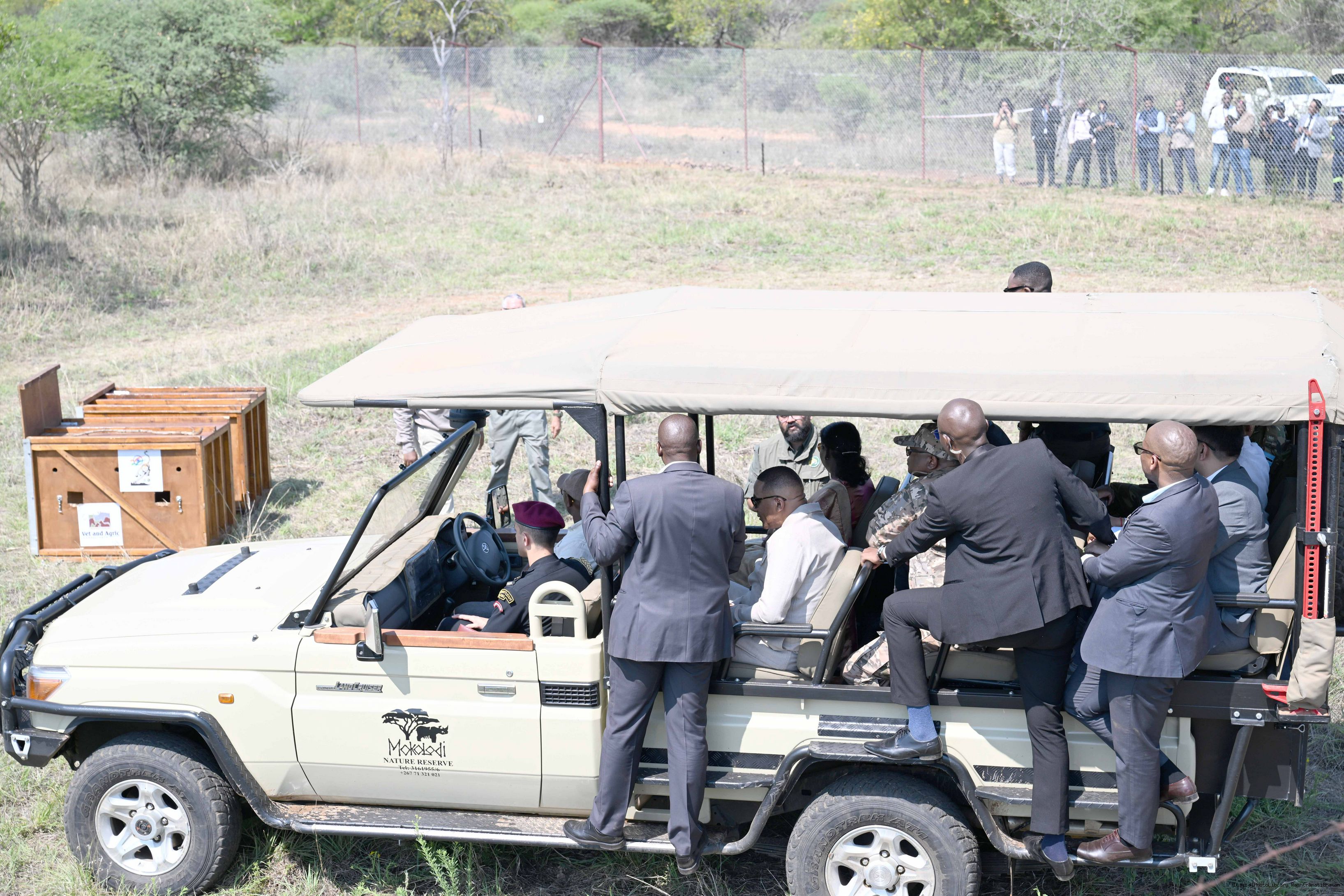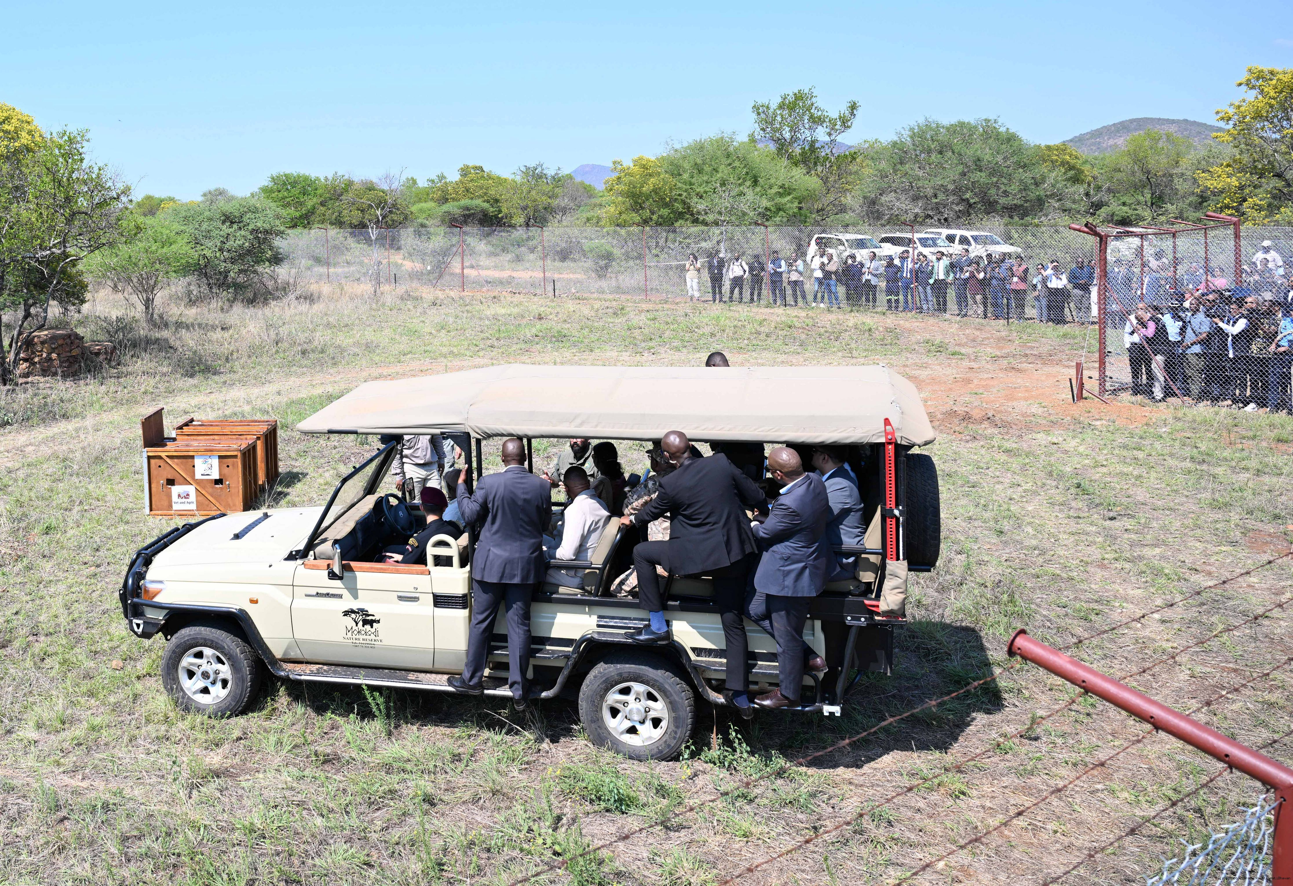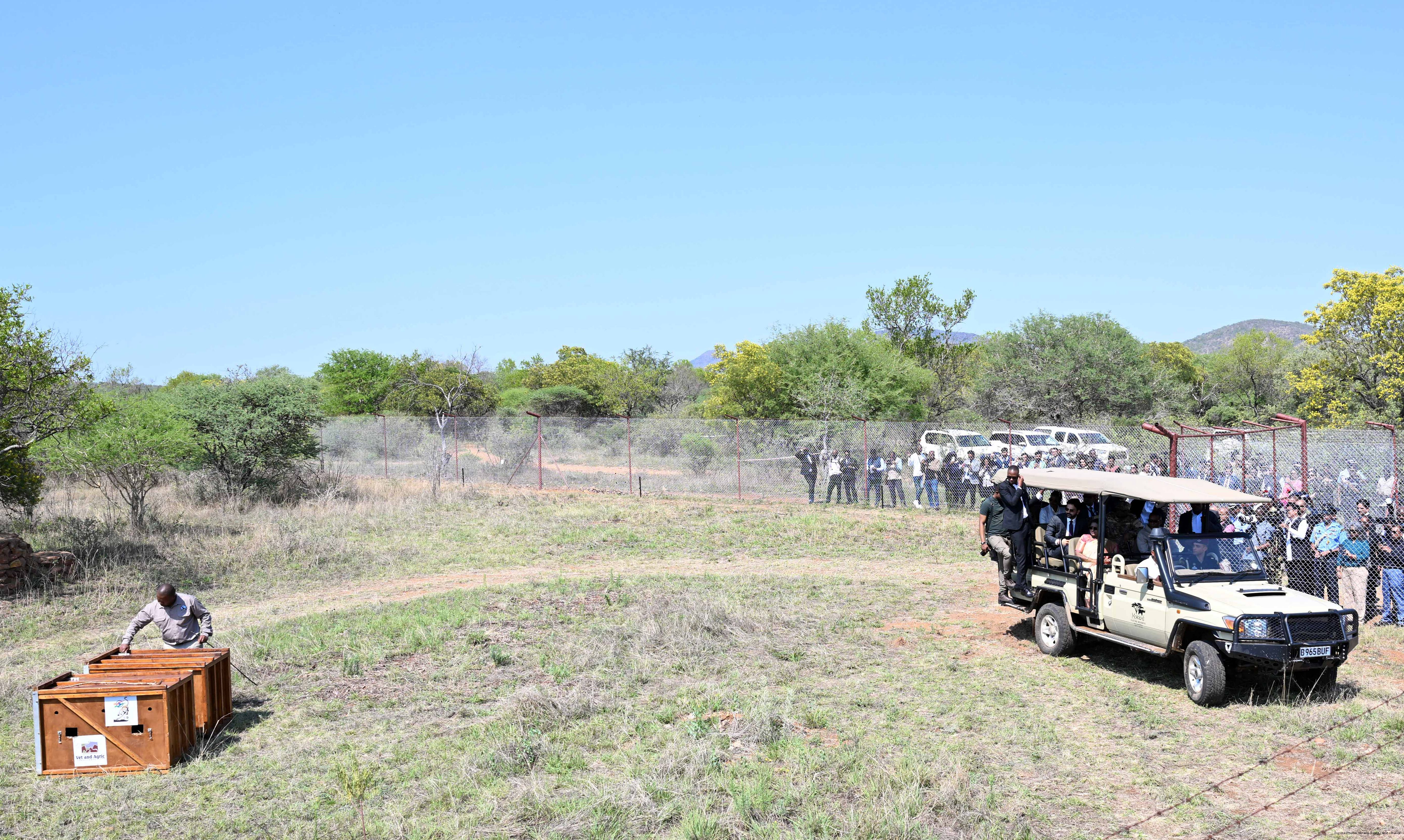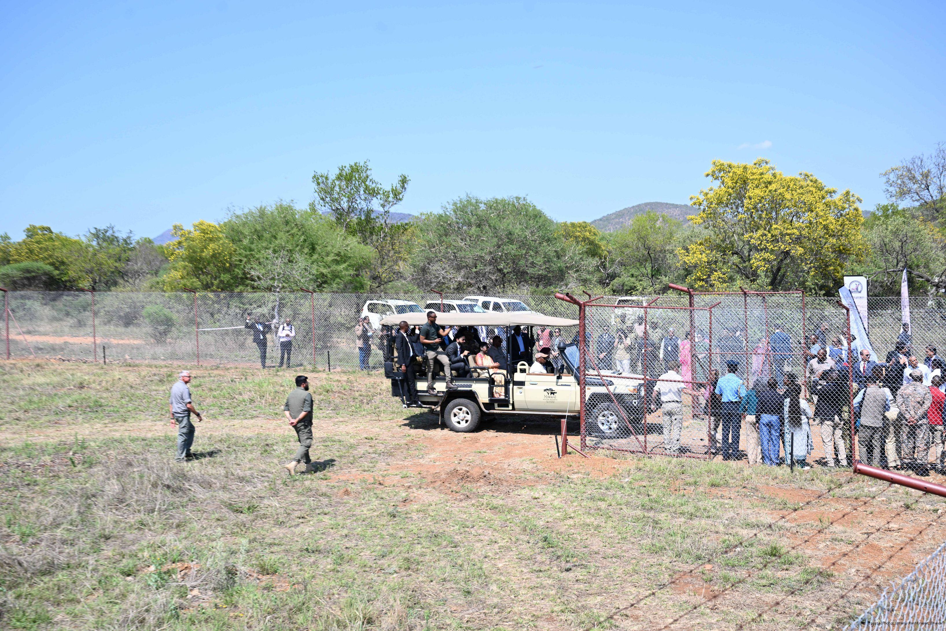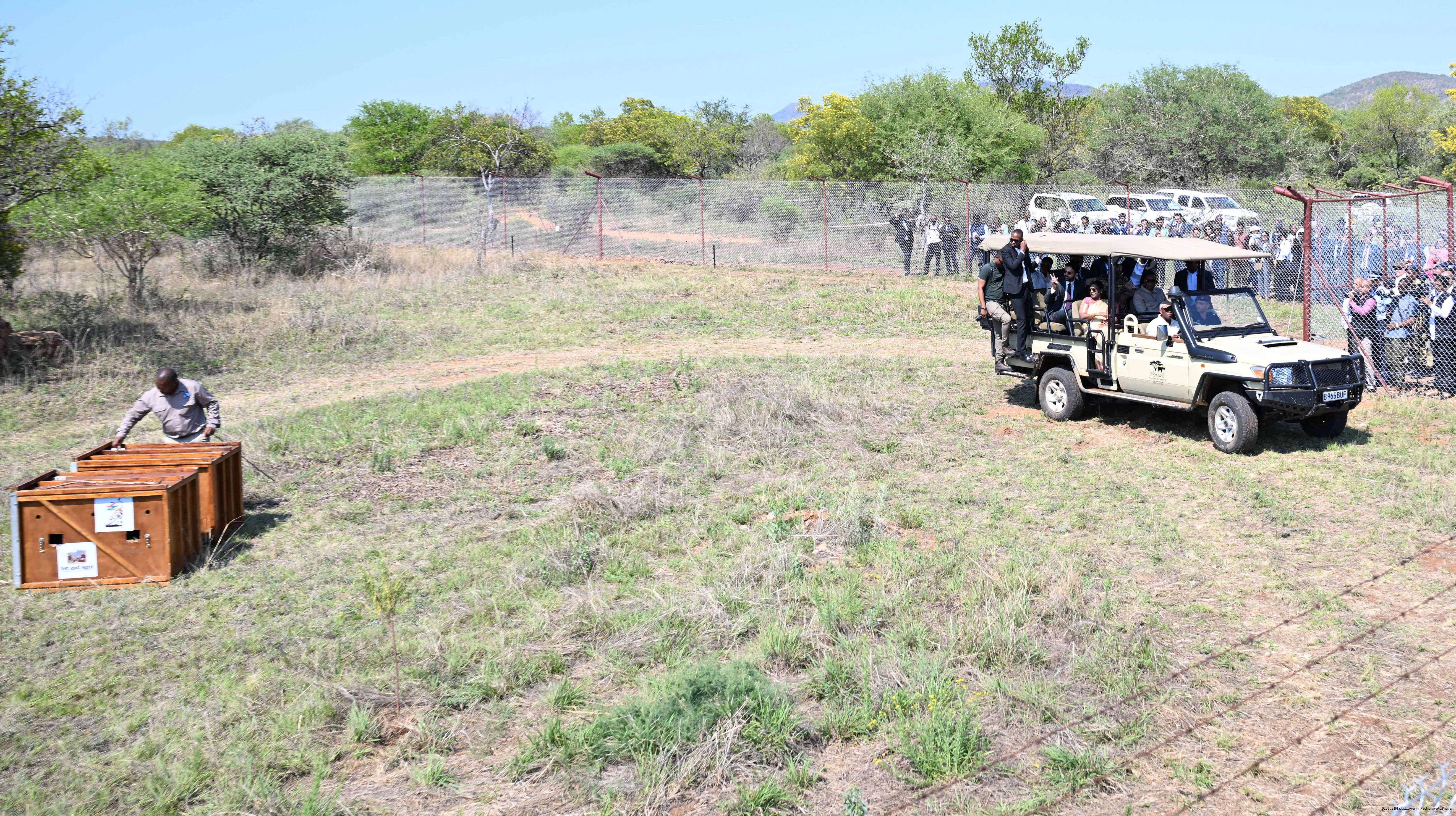 | Caption: | The President of India, Smt Droupadi Murmu and President Duma Gideon Boko witnessed the release of captured cheetahs originating from Botswana's Ghanzi region into the quarantine facility by experts from India and Botswana on November 12, 2025. |
