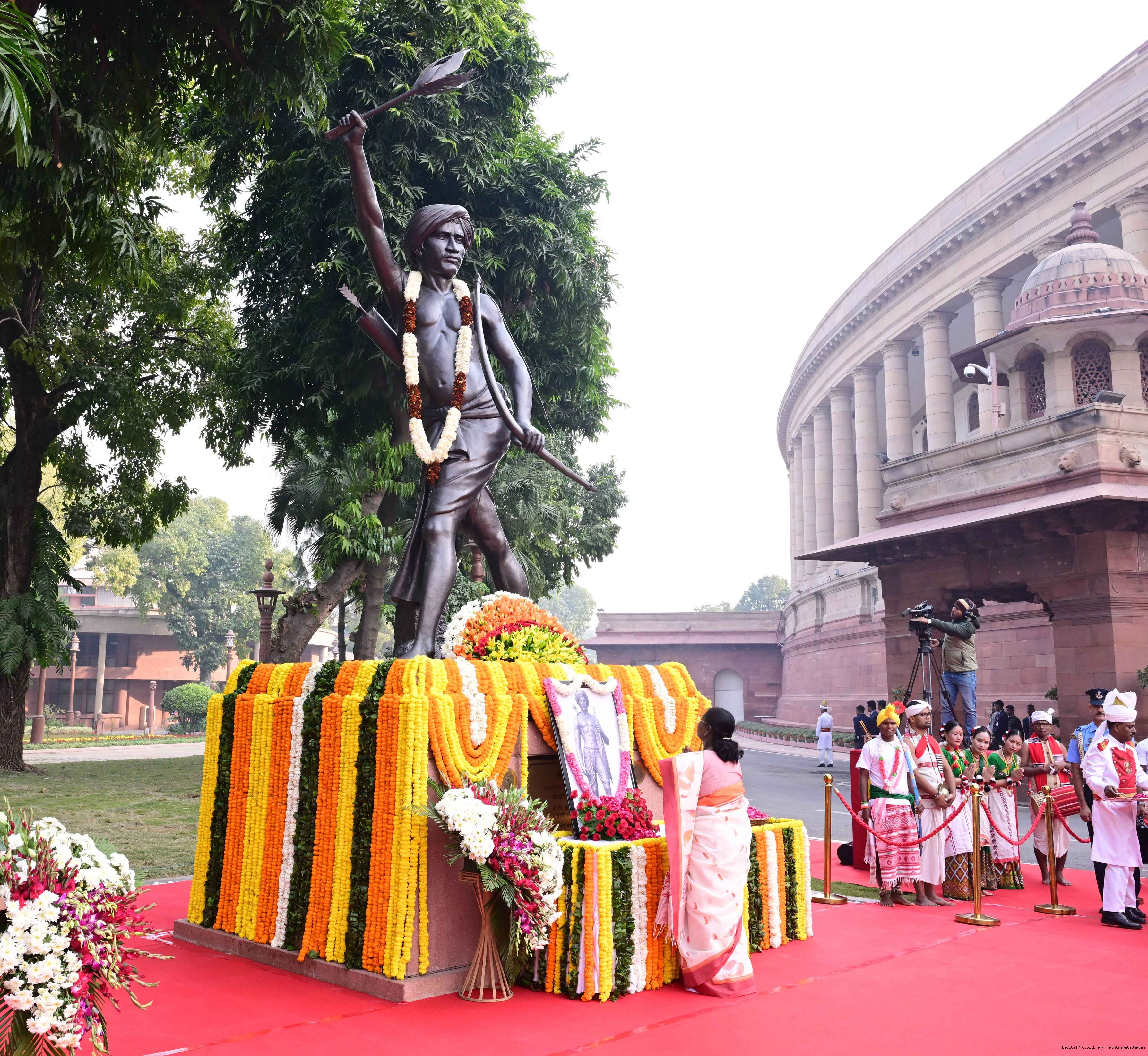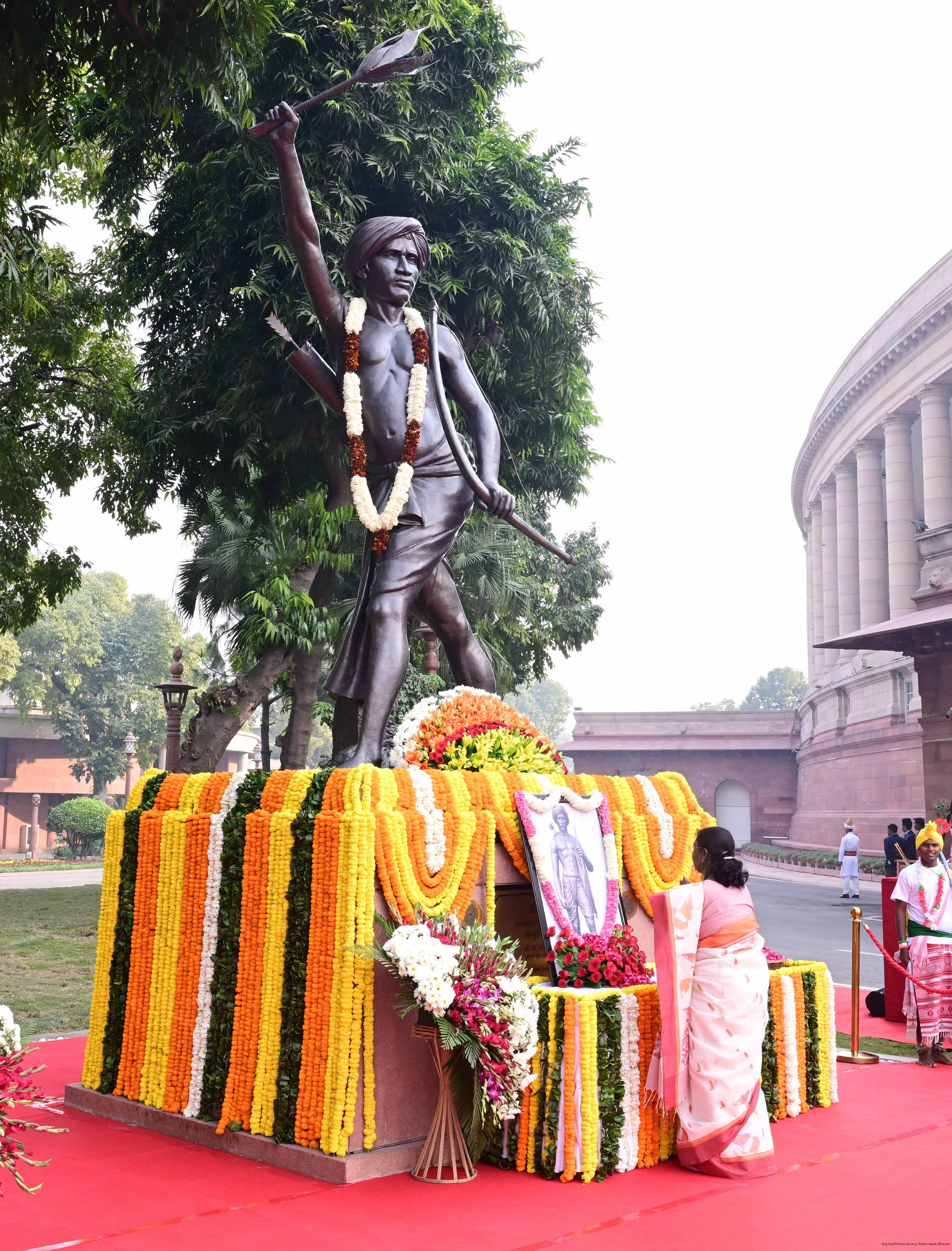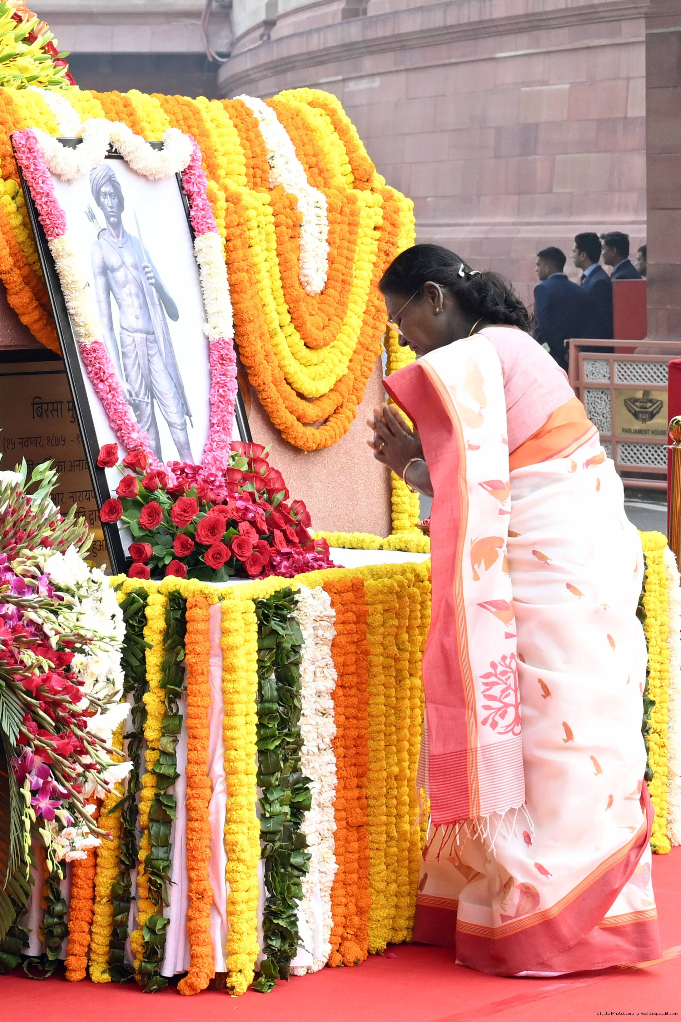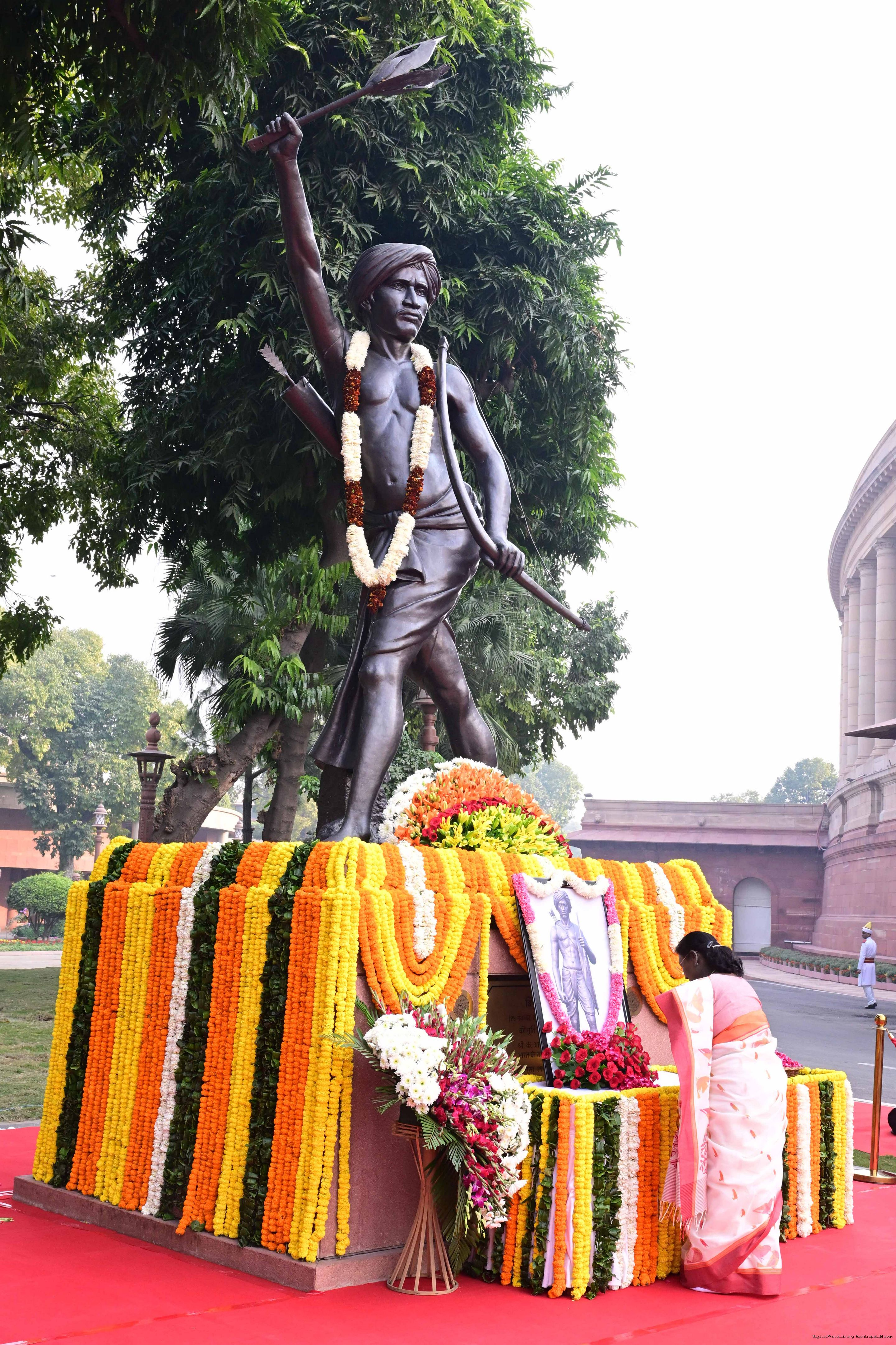 | Caption: | The President of India Smt. Droupadi Murmu paid floral tributes to Bhagwan Birsa Munda at Parliament House, New Delhi on his birth anniversary celebrated as Janjatiya Gaurav Divas on November 15, 2025. |