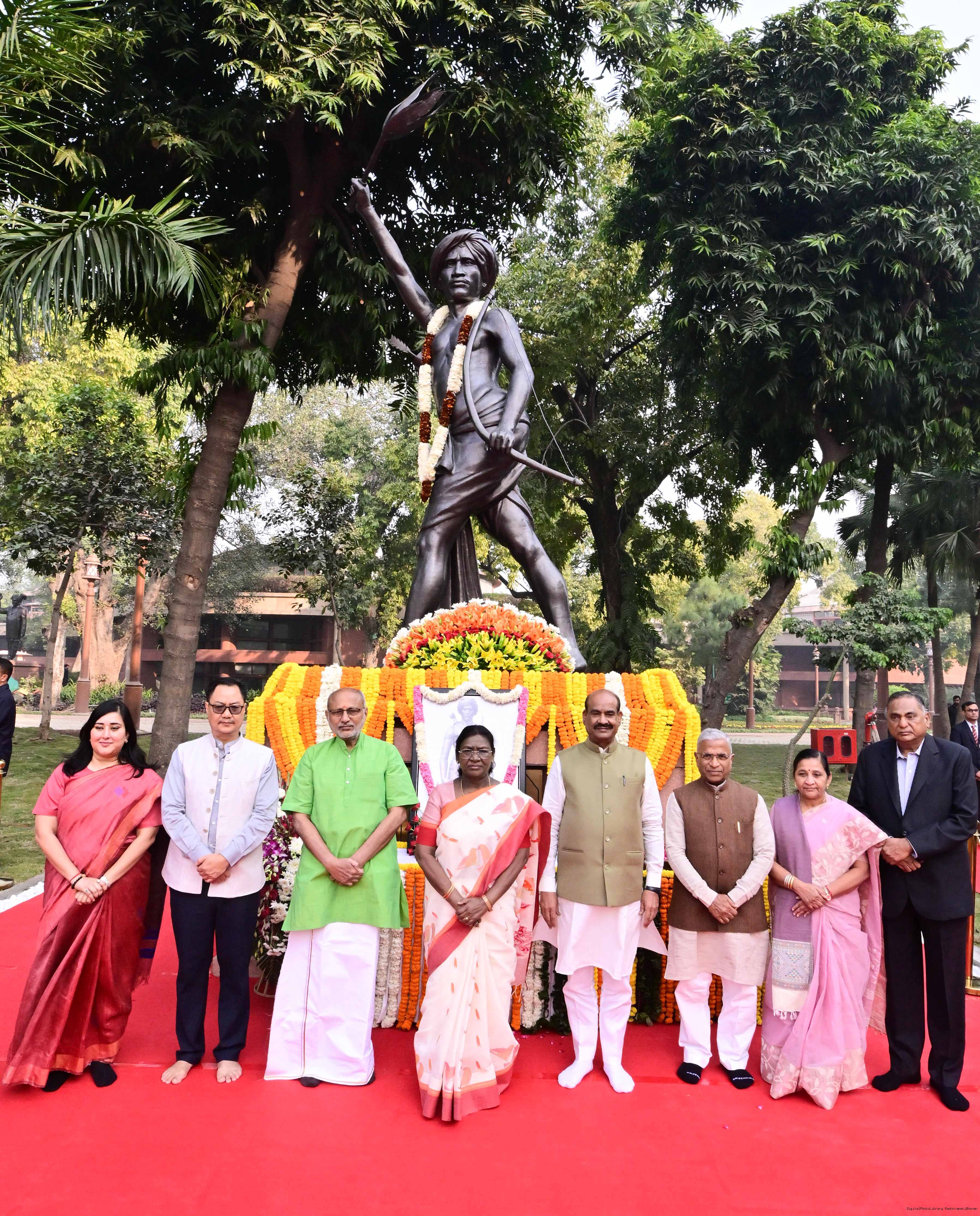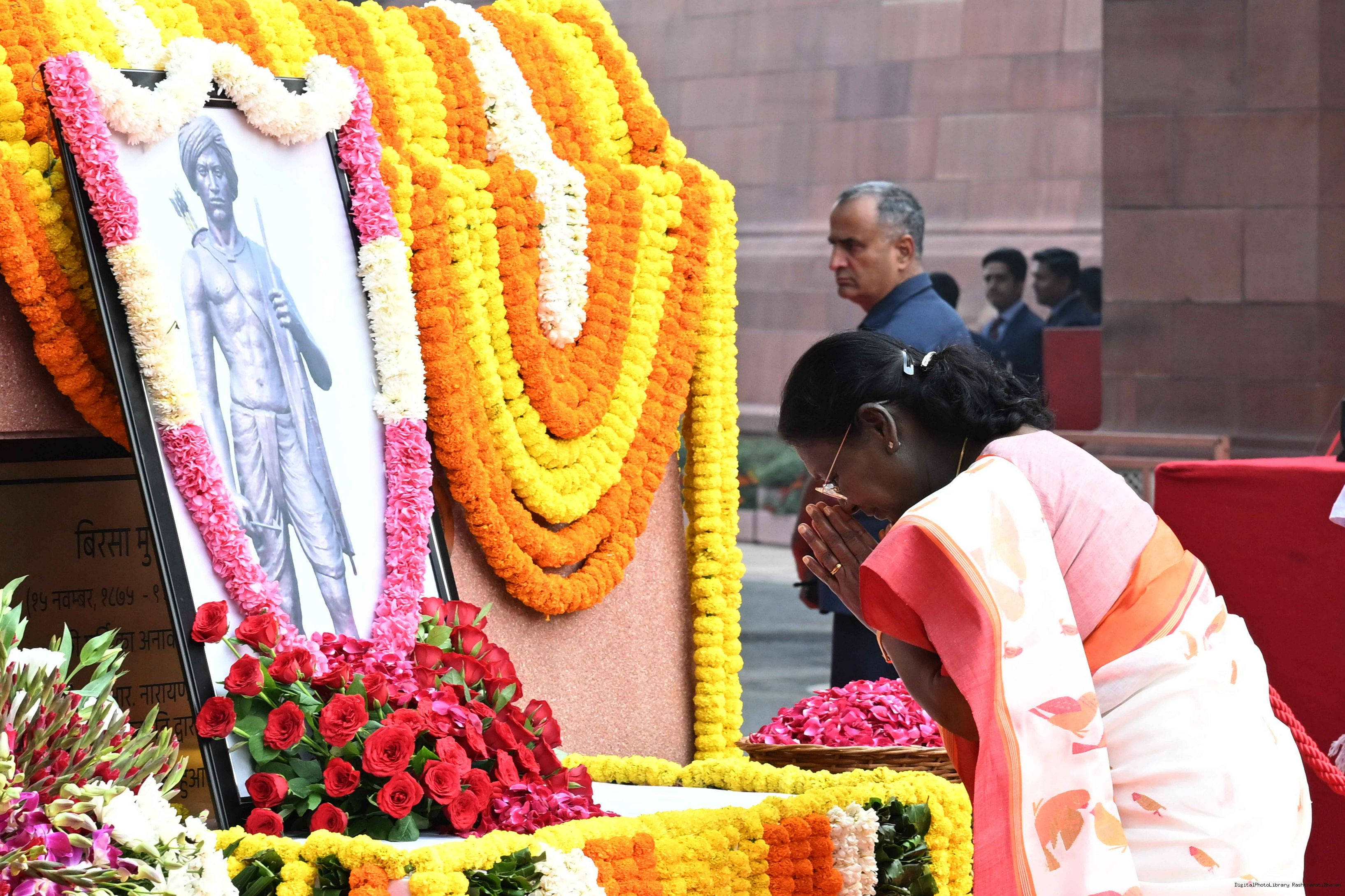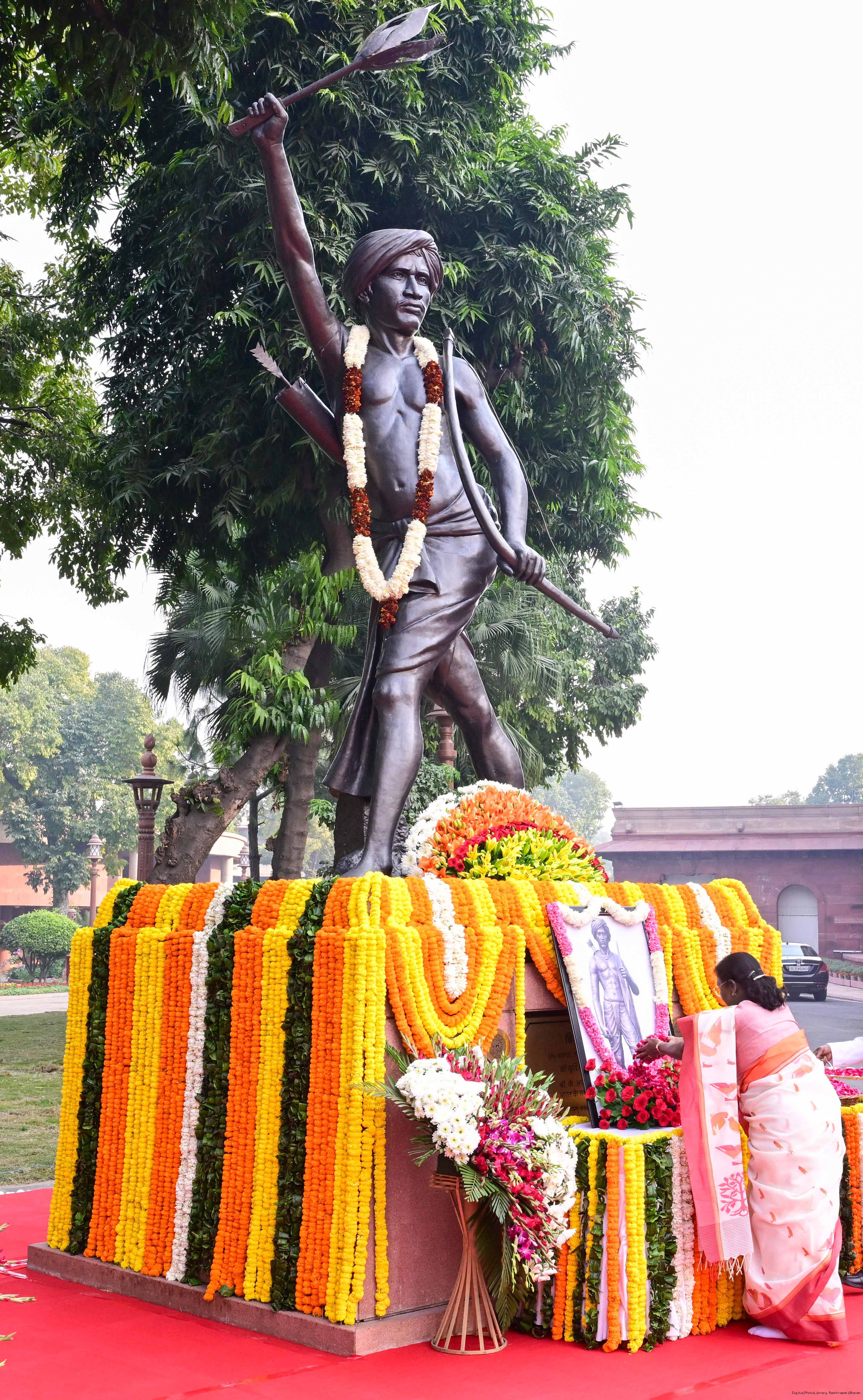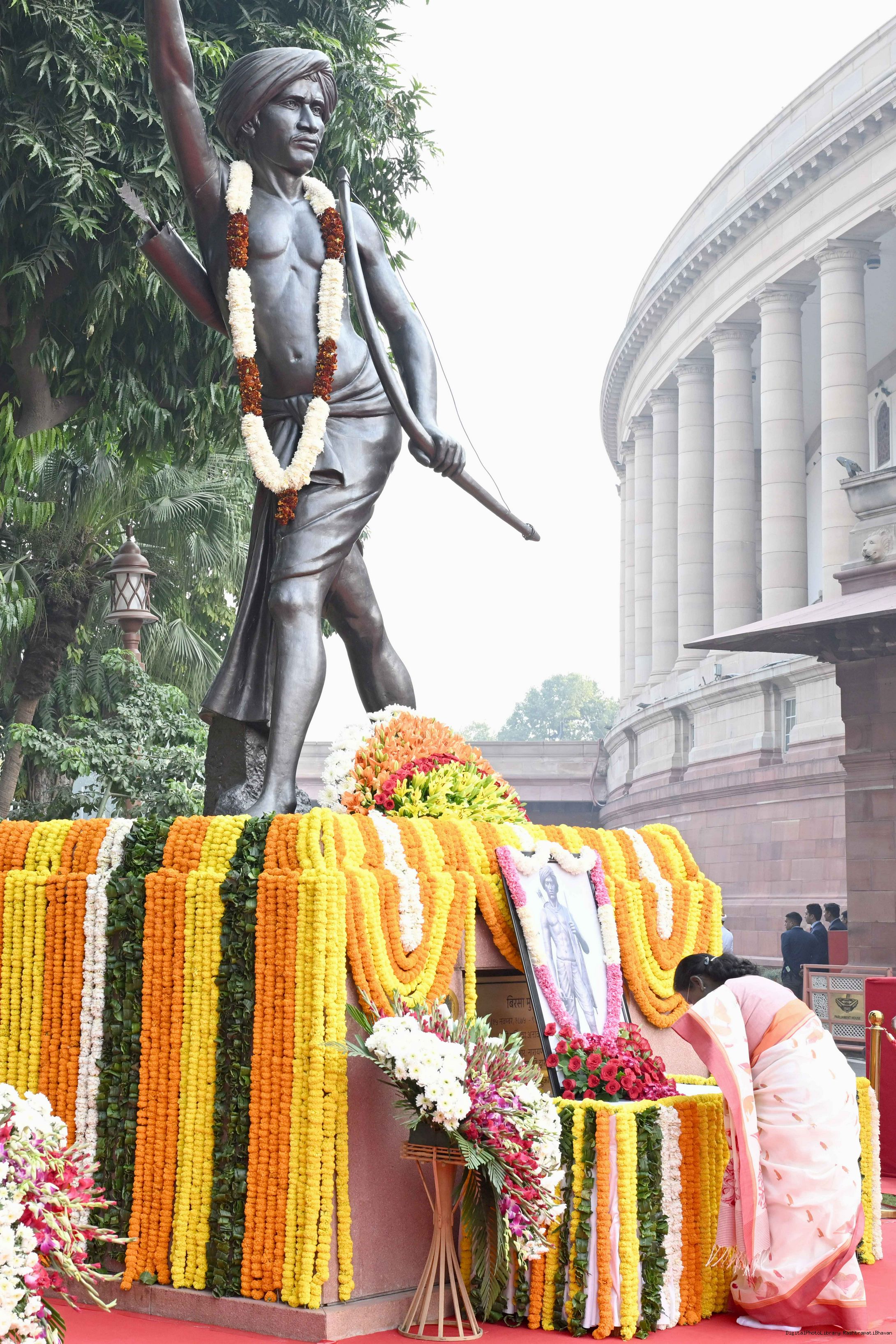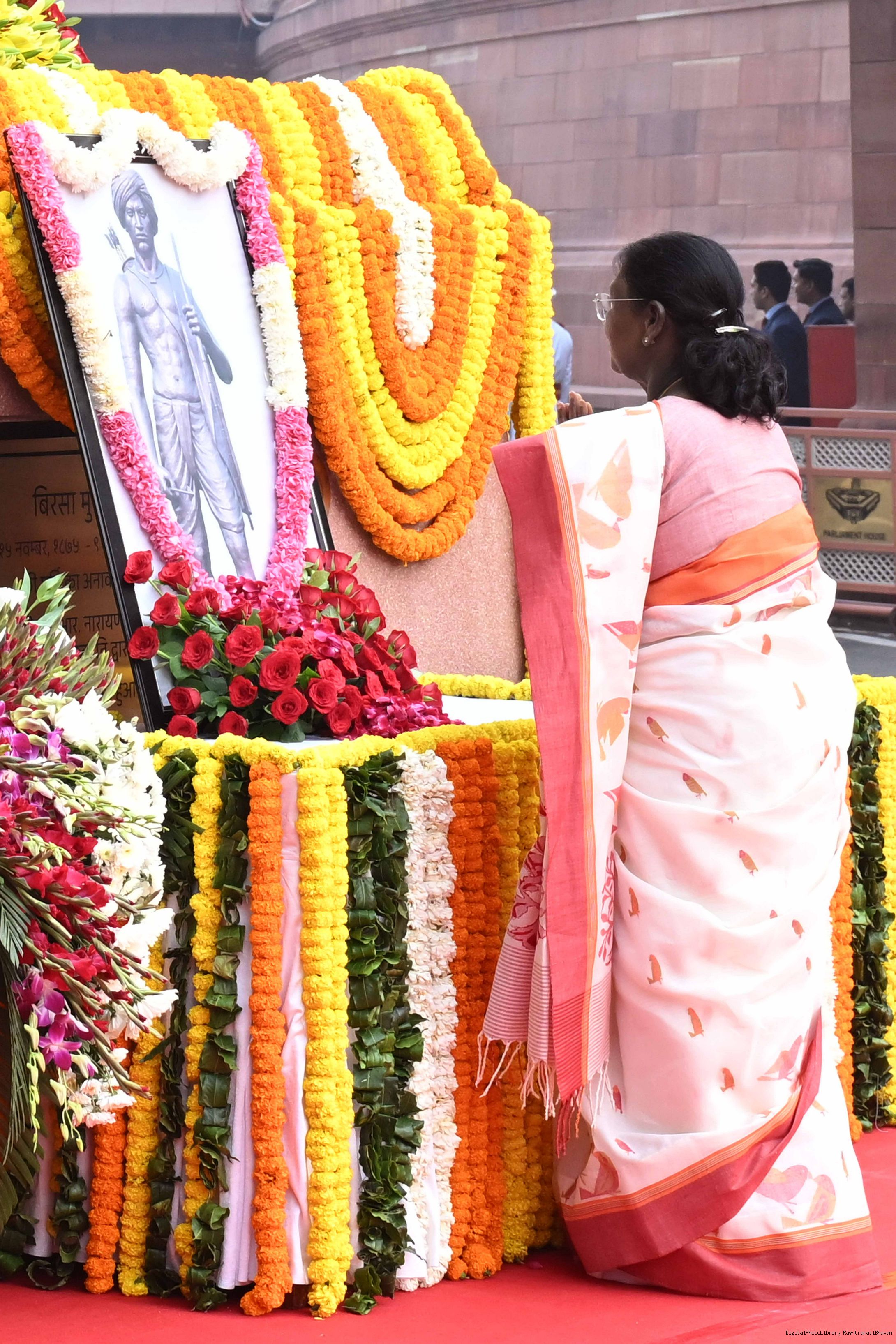 | Caption: | The President of India Smt. Droupadi Murmu paid floral tributes to Bhagwan Birsa Munda at Parliament House, New Delhi on his birth anniversary celebrated as Janjatiya Gaurav Divas on November 15, 2025. |