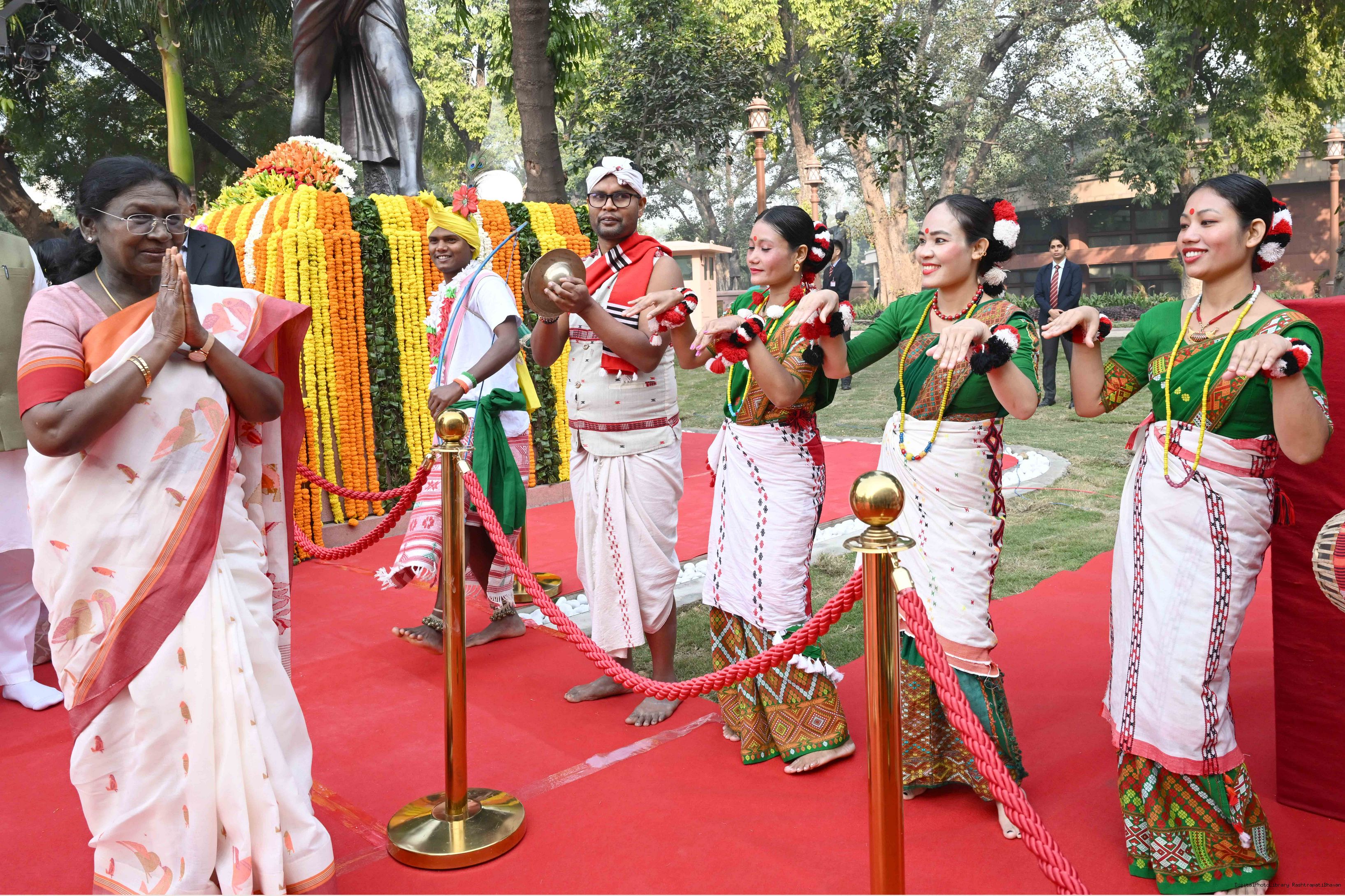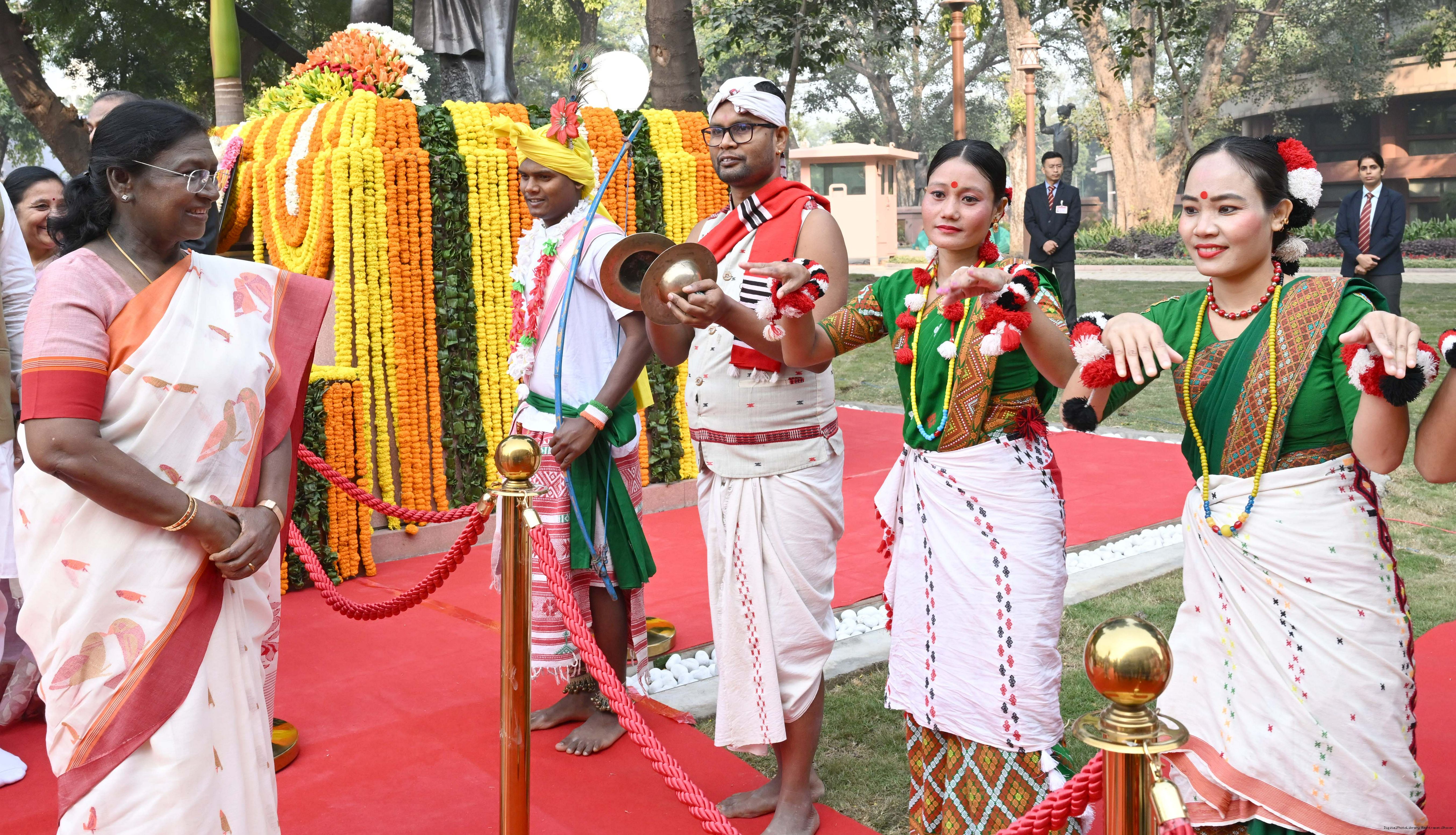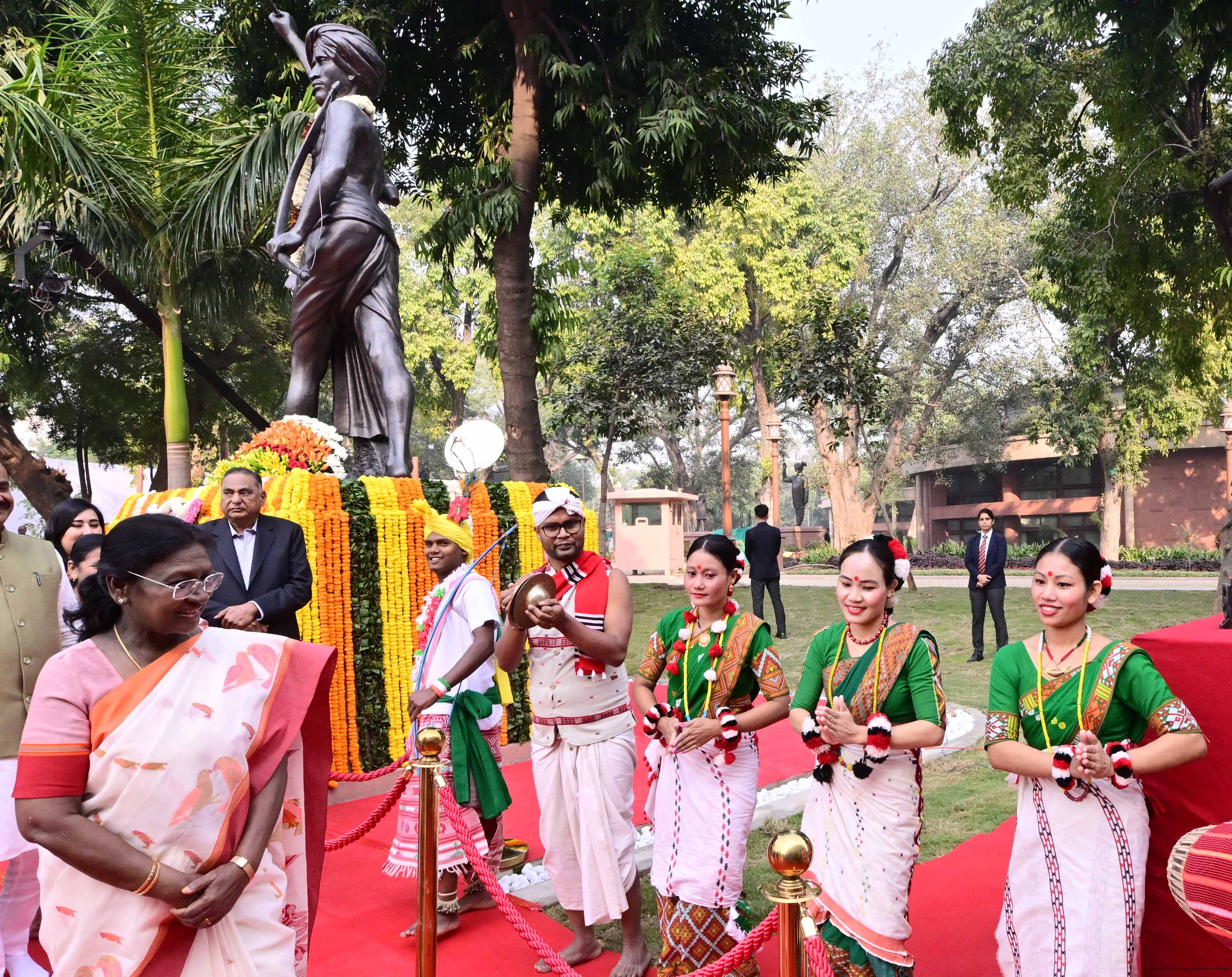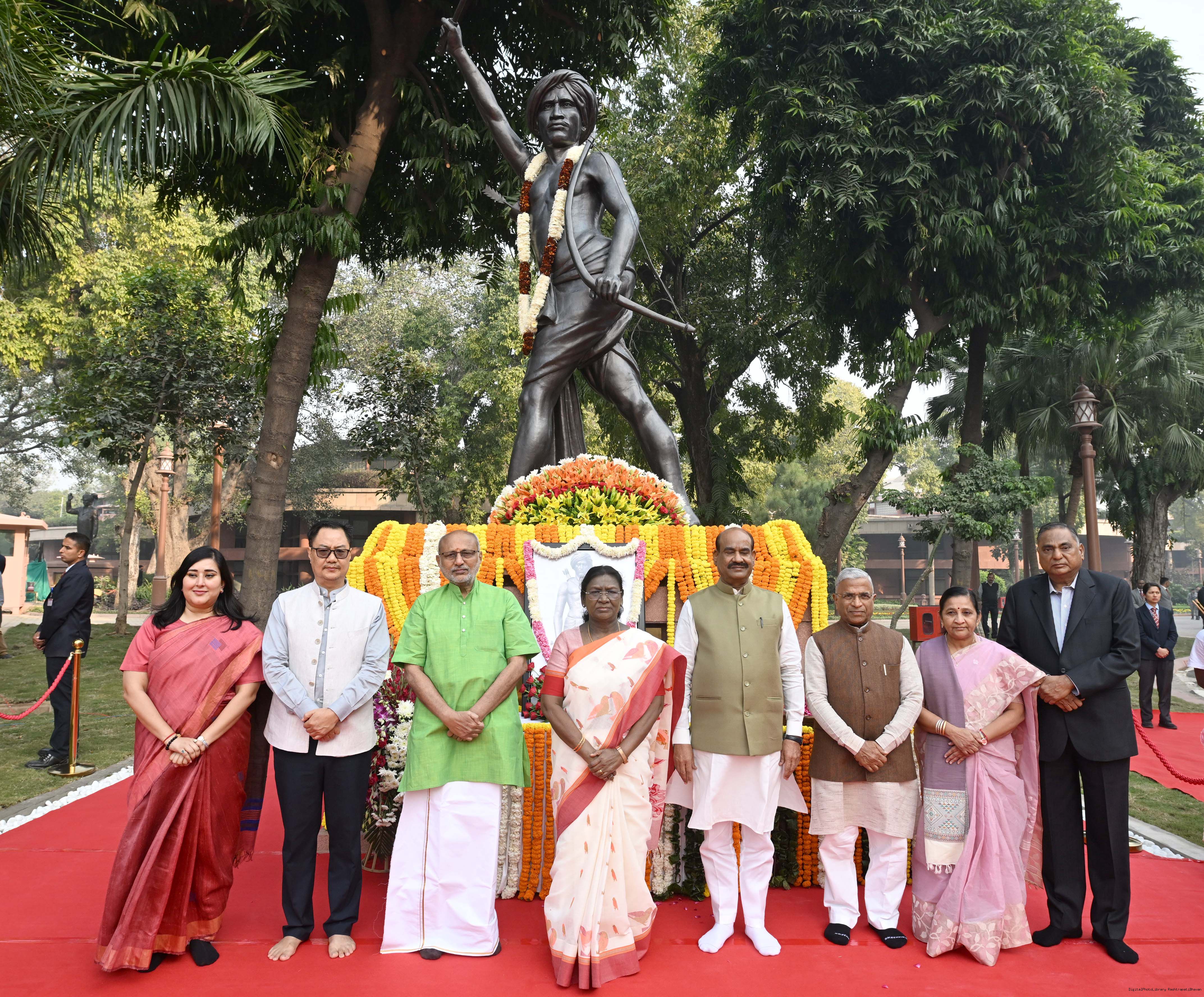 | Caption: | The President of India Smt. Droupadi Murmu paid floral tributes to Bhagwan Birsa Munda at Parliament House, New Delhi on his birth anniversary celebrated as Janjatiya Gaurav Divas on November 15, 2025. |