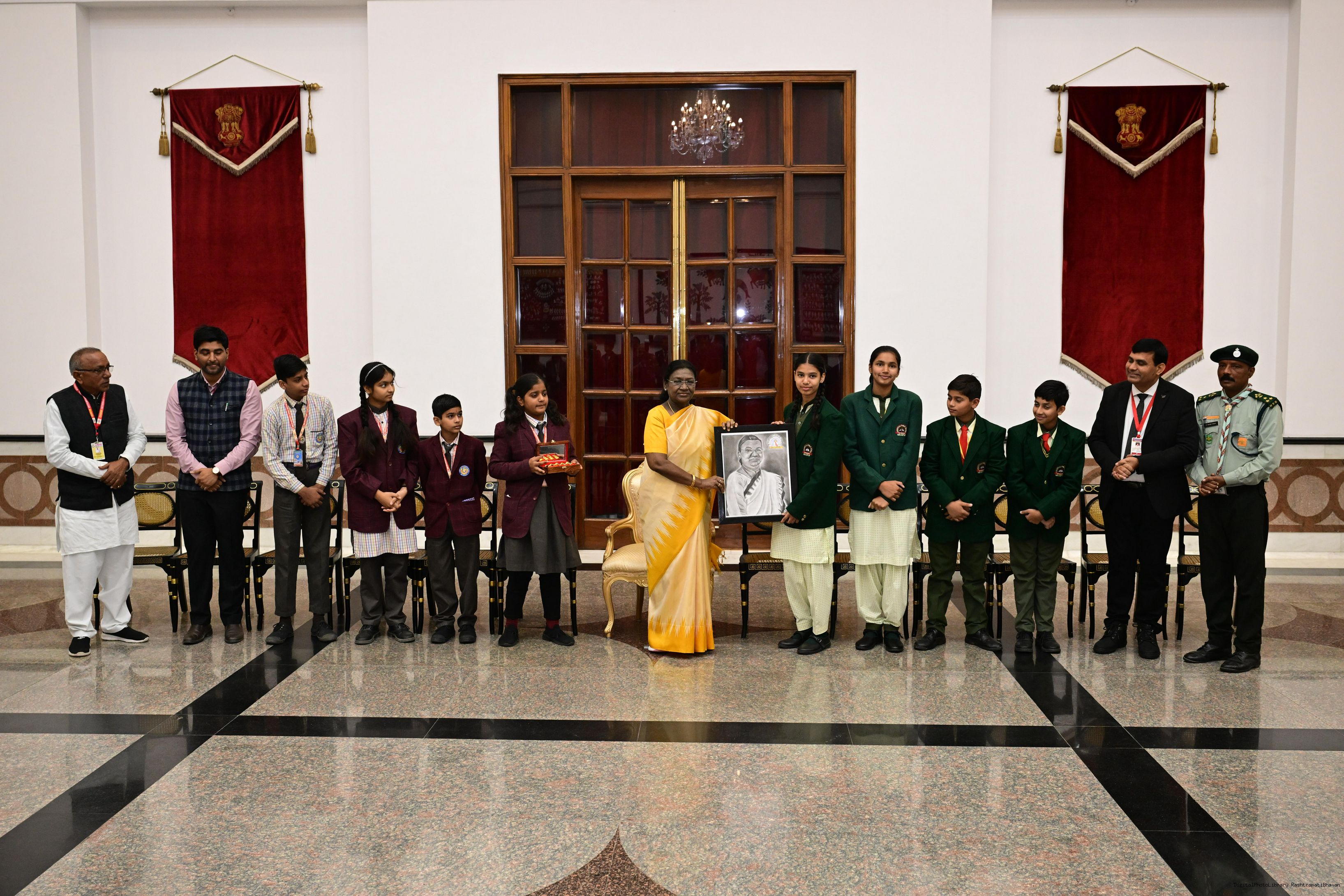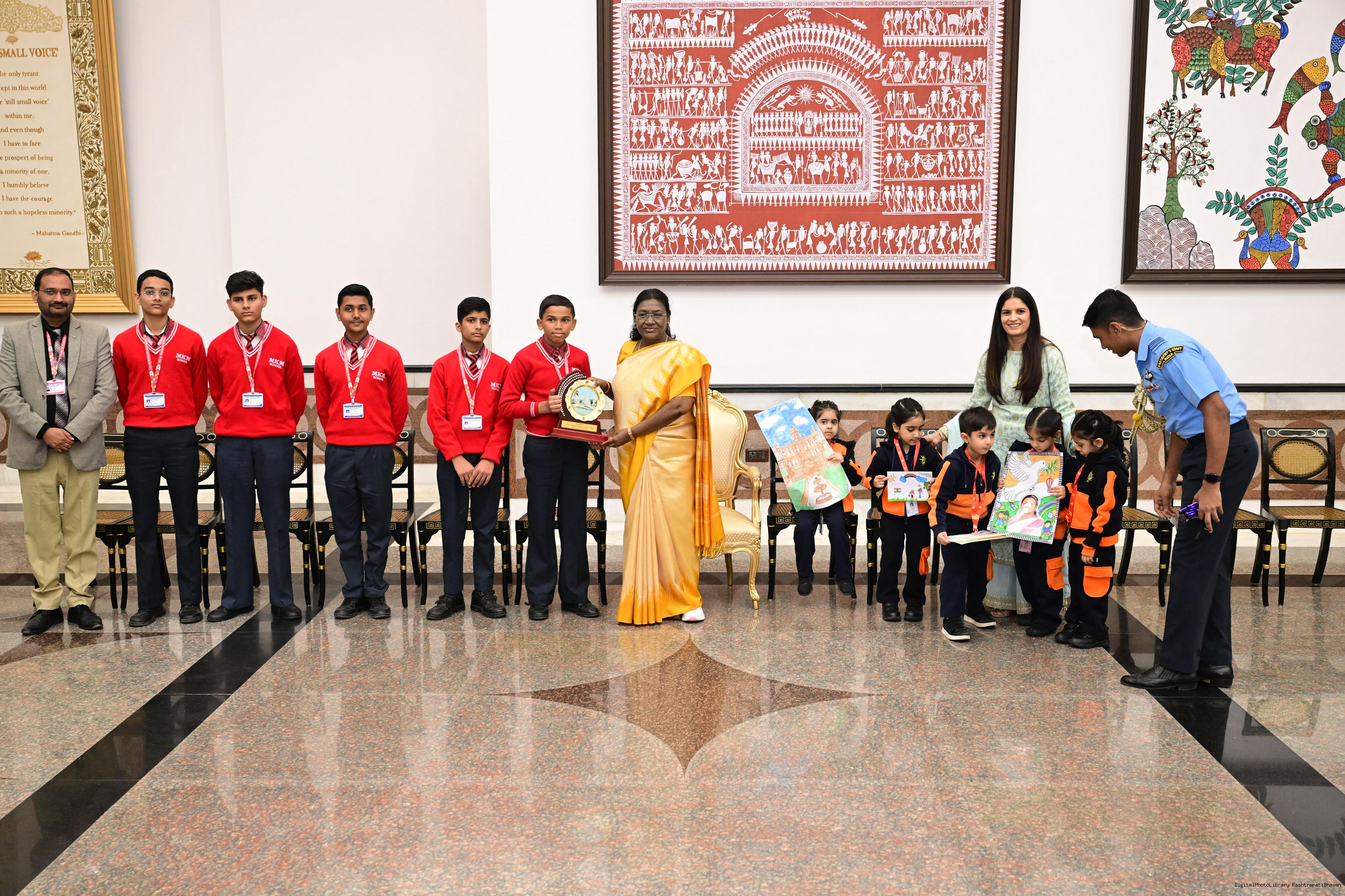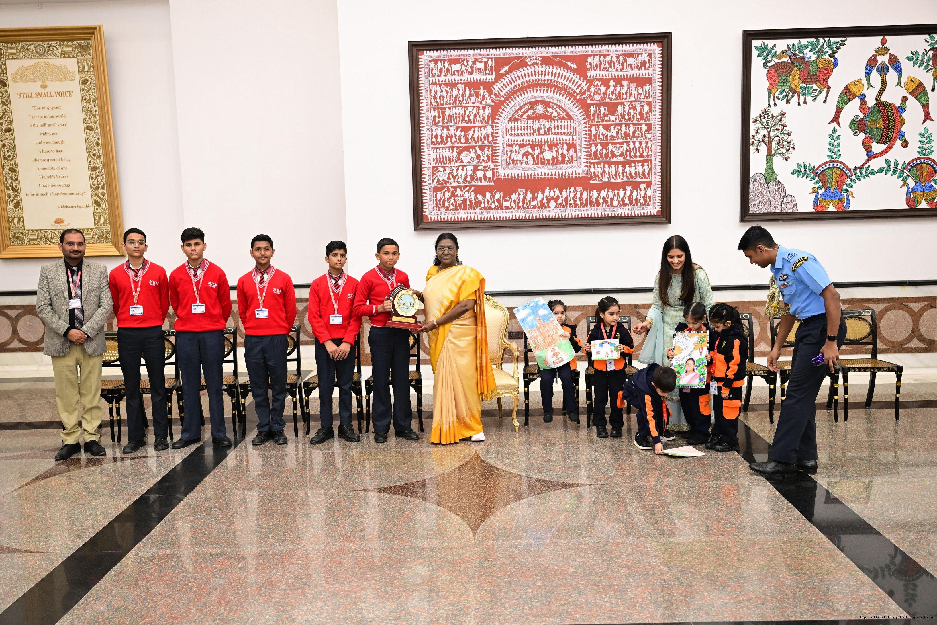 | Caption: | On the occasion of Children's Day, The President of India, Smt Droupadi Murmu interacted with children from various schools and organisations at Rashtrapati Bhavan Cultural Centre on November 14, 2025. |