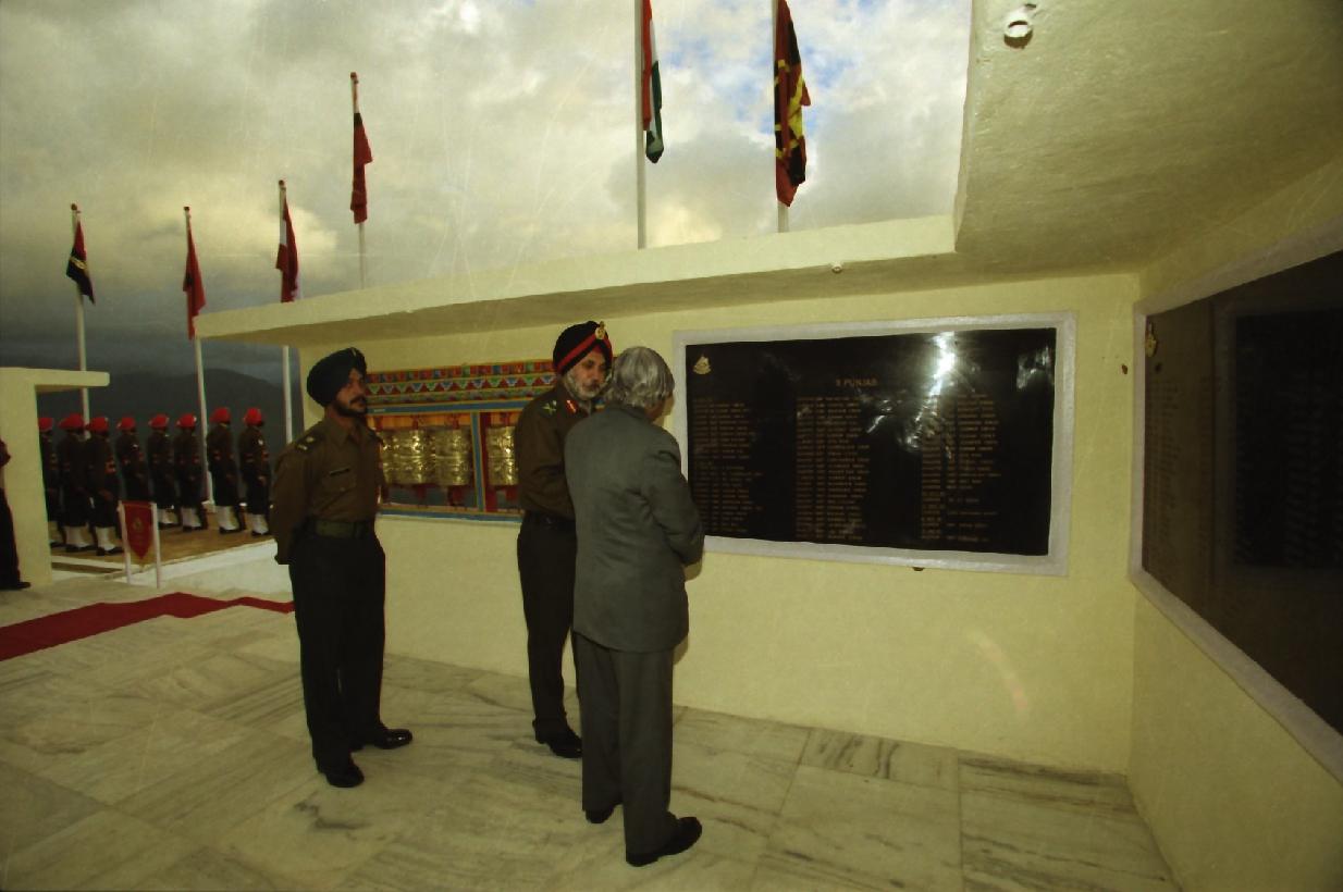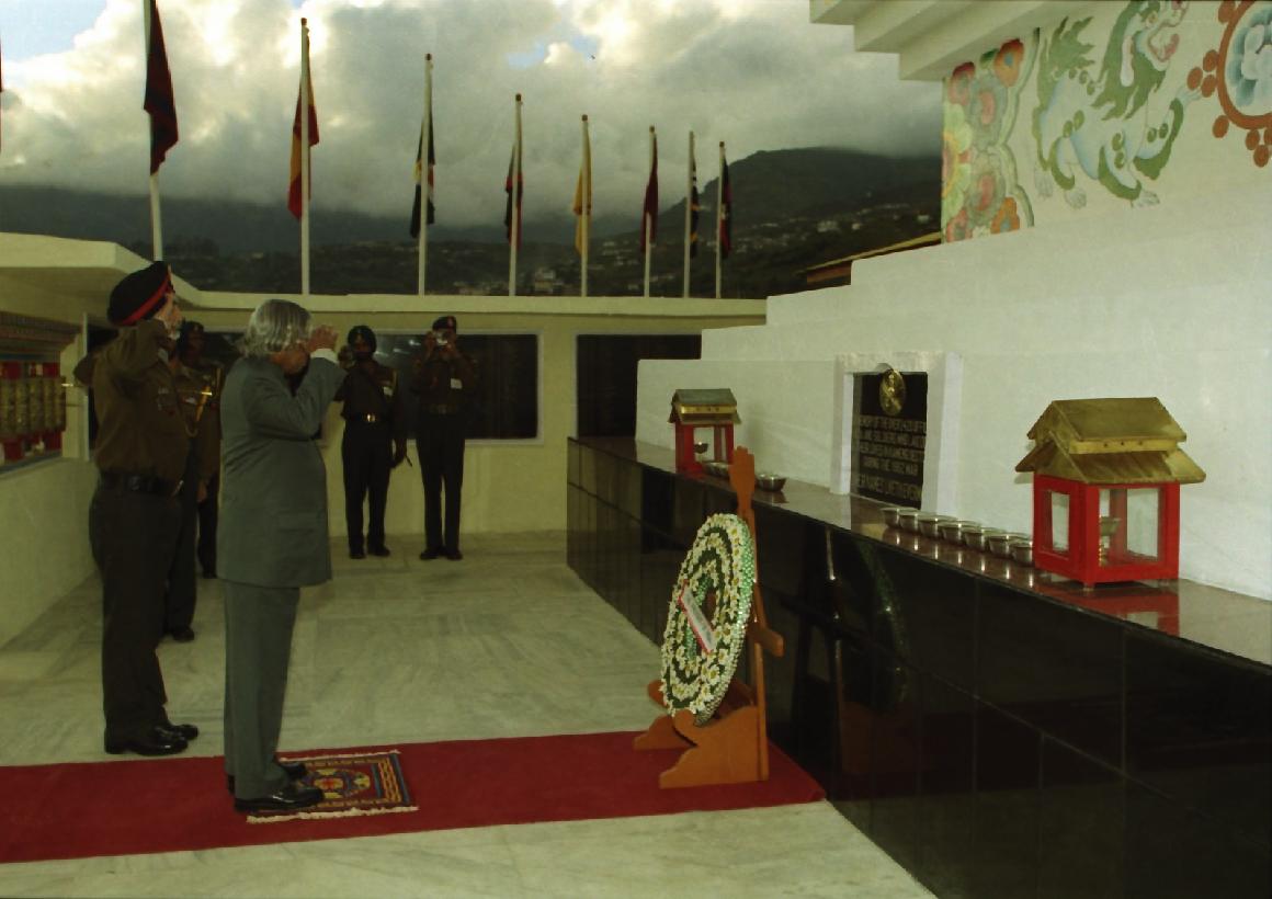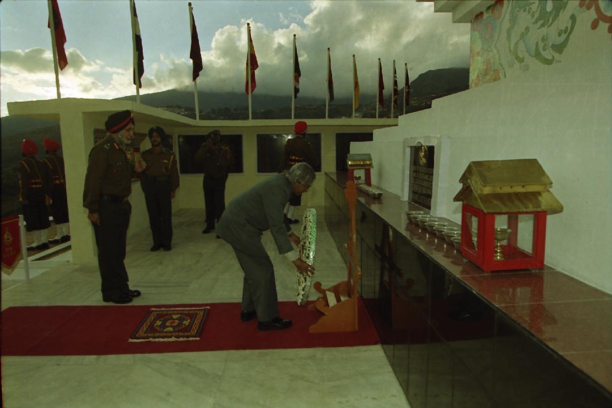 | Caption: | The President of India, Dr A P J Abdul Kalam laying the wreath at Yid-Gha Choszen (Abode of Dharma) at Tawang in Arunachal Pradesh on Oct 14, 2002 |