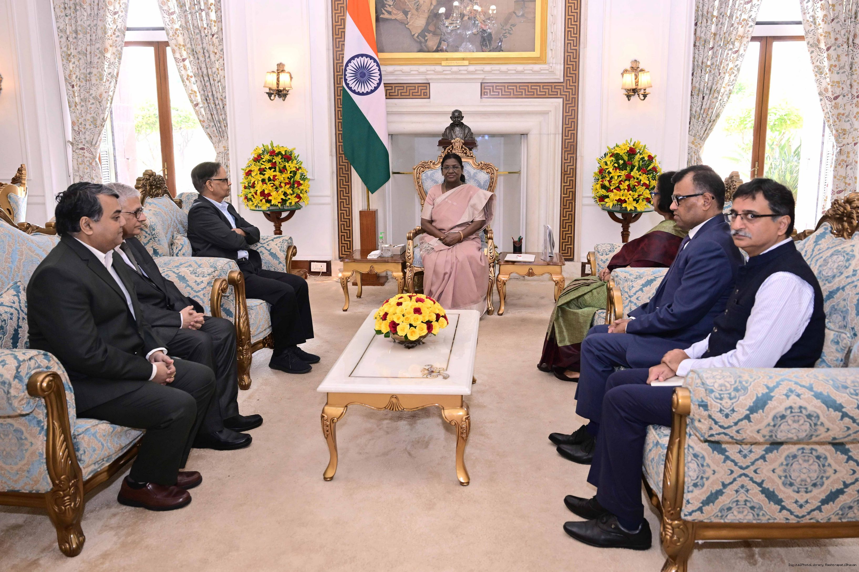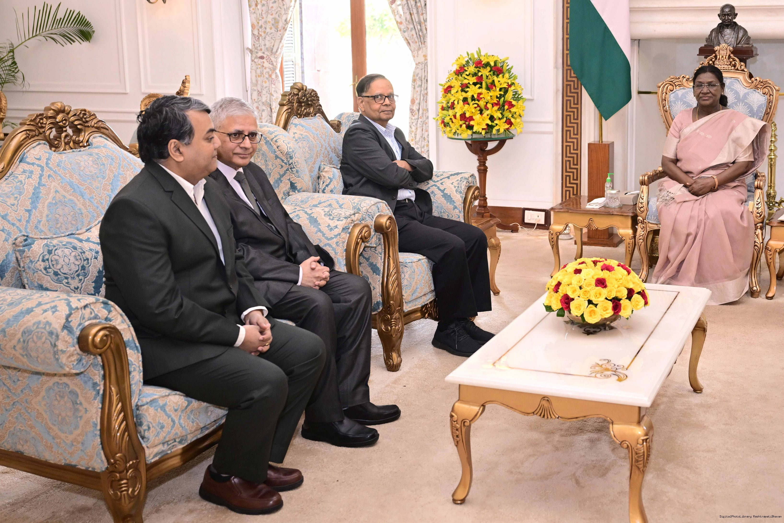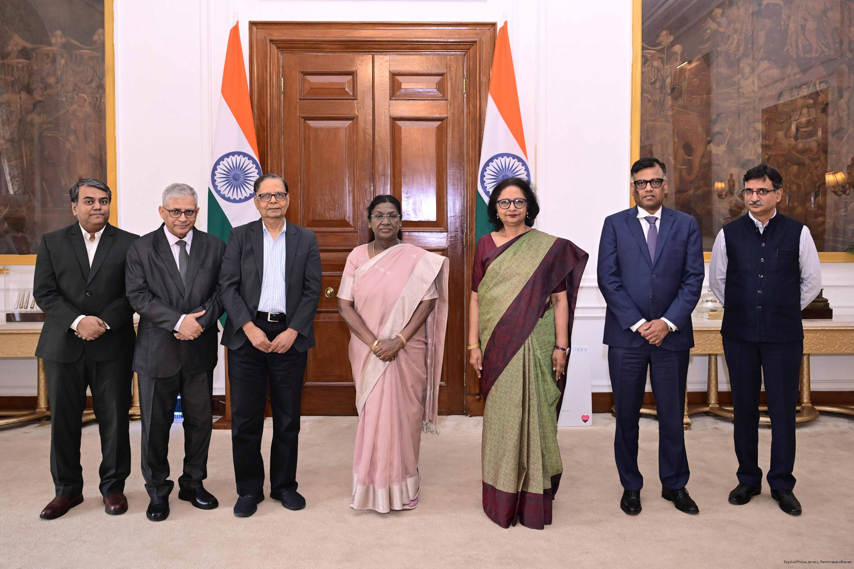 | Caption: | Members of the 16th Finance Commission, led by its Chairman, Dr Arvind Panagariya, called on the President of India, Smt. Droupadi Murmu and submitted the Commission's report for 2026-31 at Rashtrapati Bhavan on November 17, 2025. |
