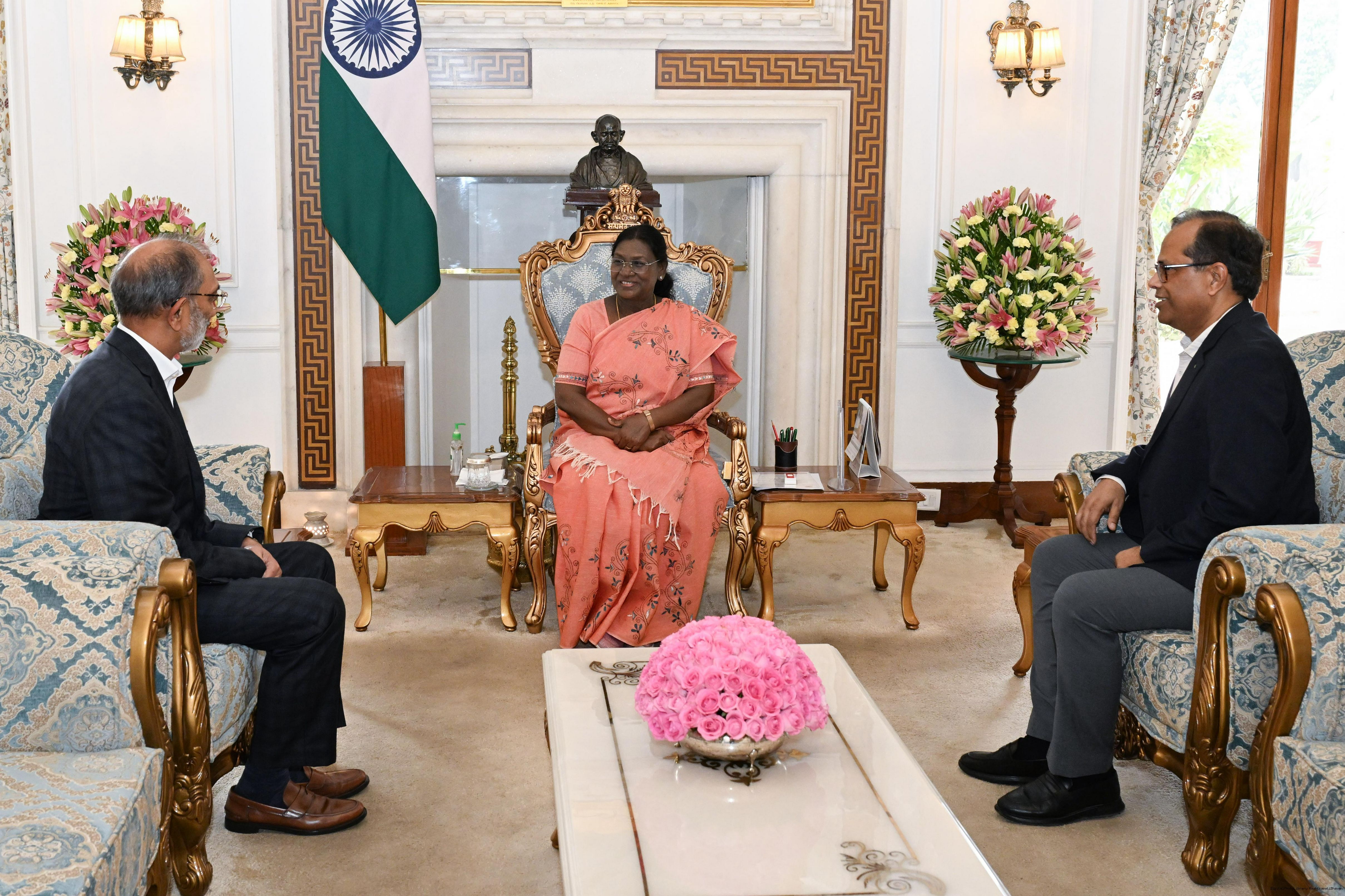 | Caption: | Shri Ashutosh Jha, Political Editor Dainik Jagran along with Editor-in-Chief Shri Sanjay Gupta meeting with the President of India, Smt. Droupadi Murmu at Rashtrapati Bhavan on November 18, 2025. |