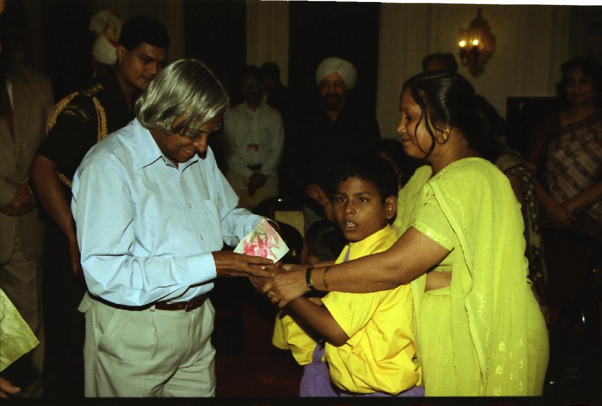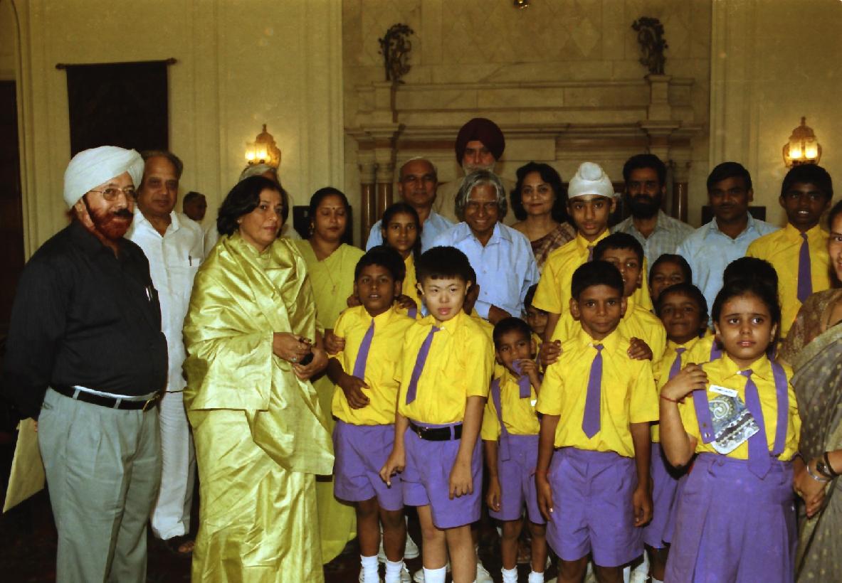 | Caption: | The President of India, Dr A P J Abdul Kalam meeting with the Students and Staff of MASOOM, School for Mentally Challenged Children at the Yellow Drawing Room of Rashtrapati Bhavan in New Delhi on Oct 18, 2002 |