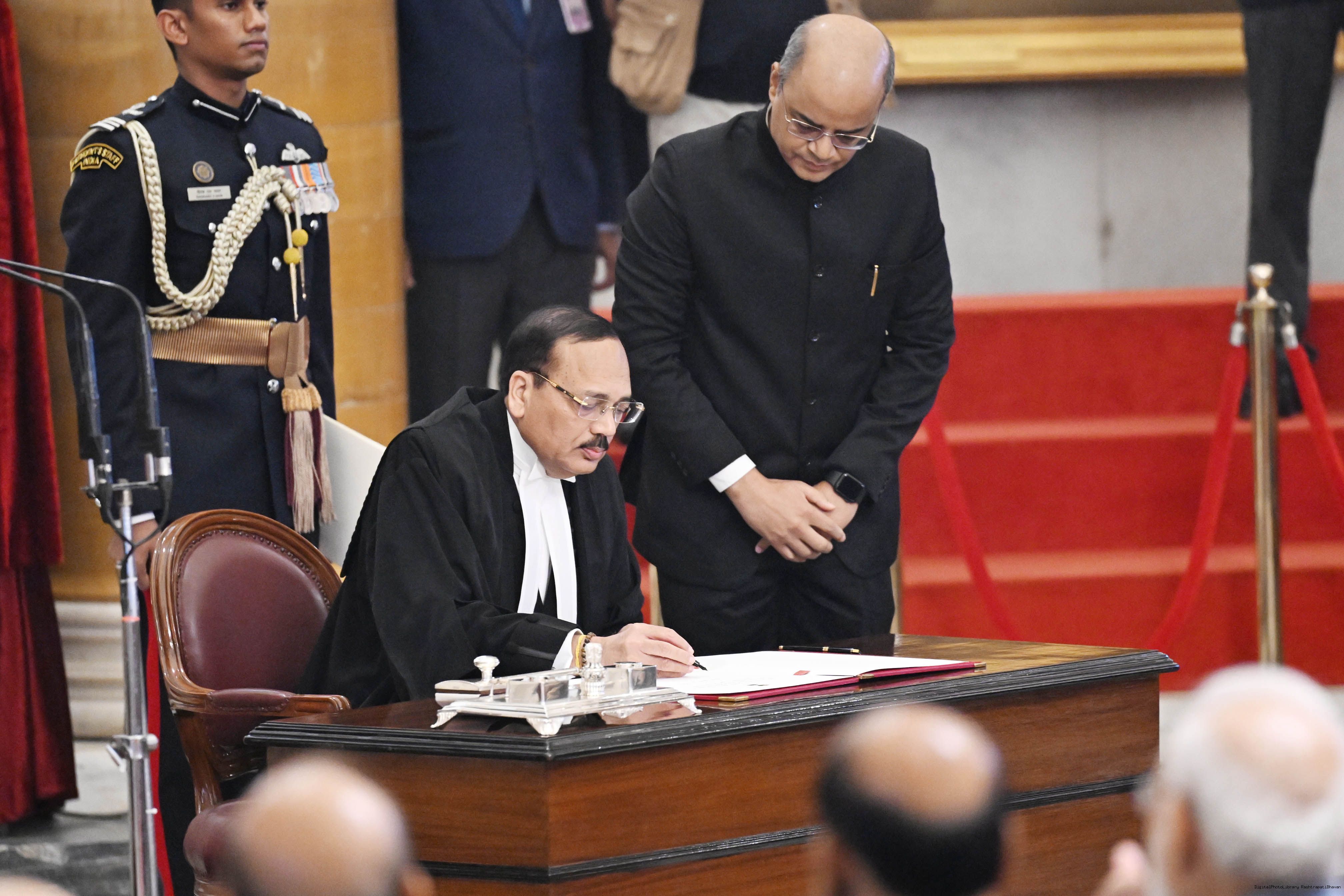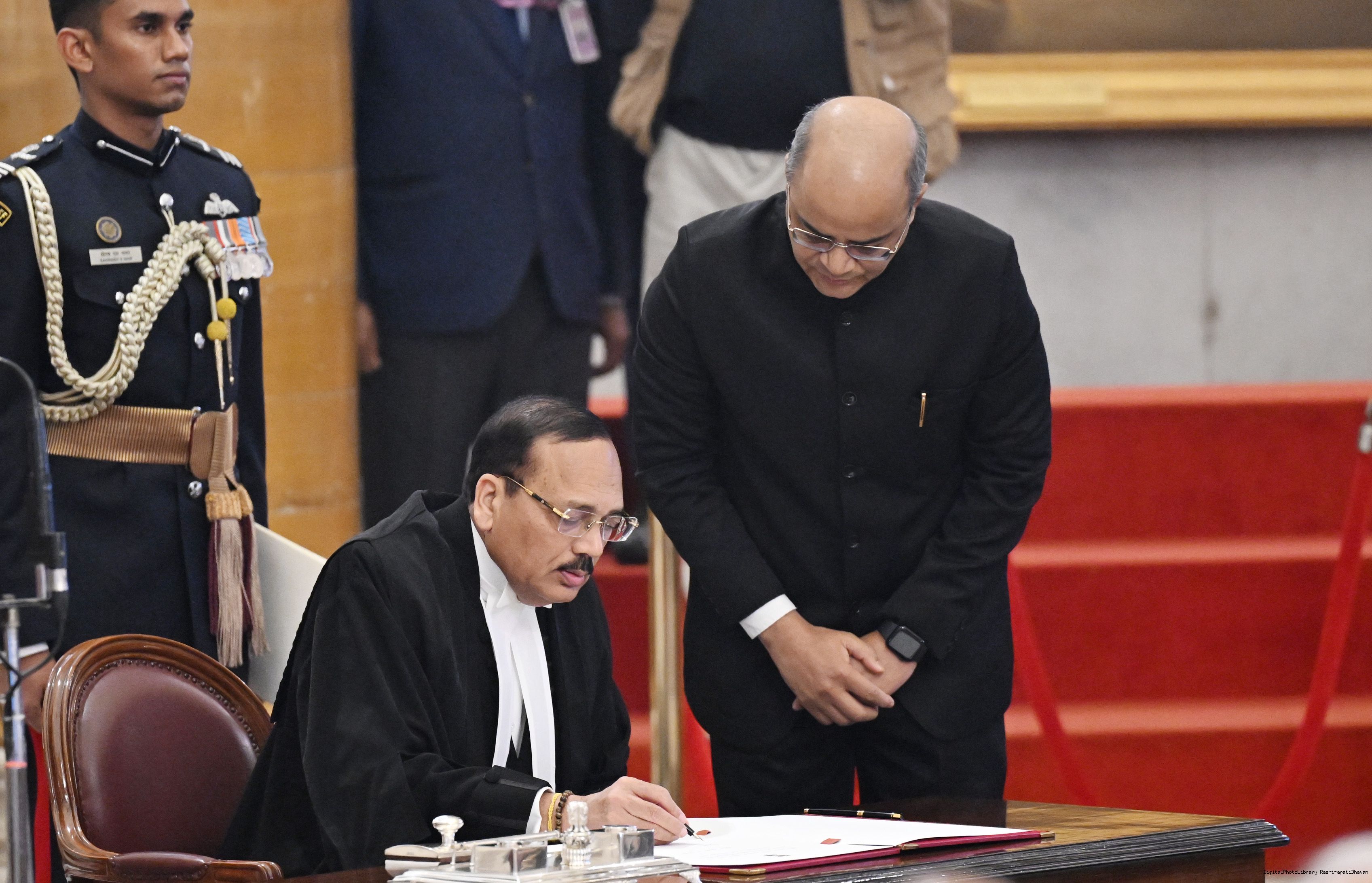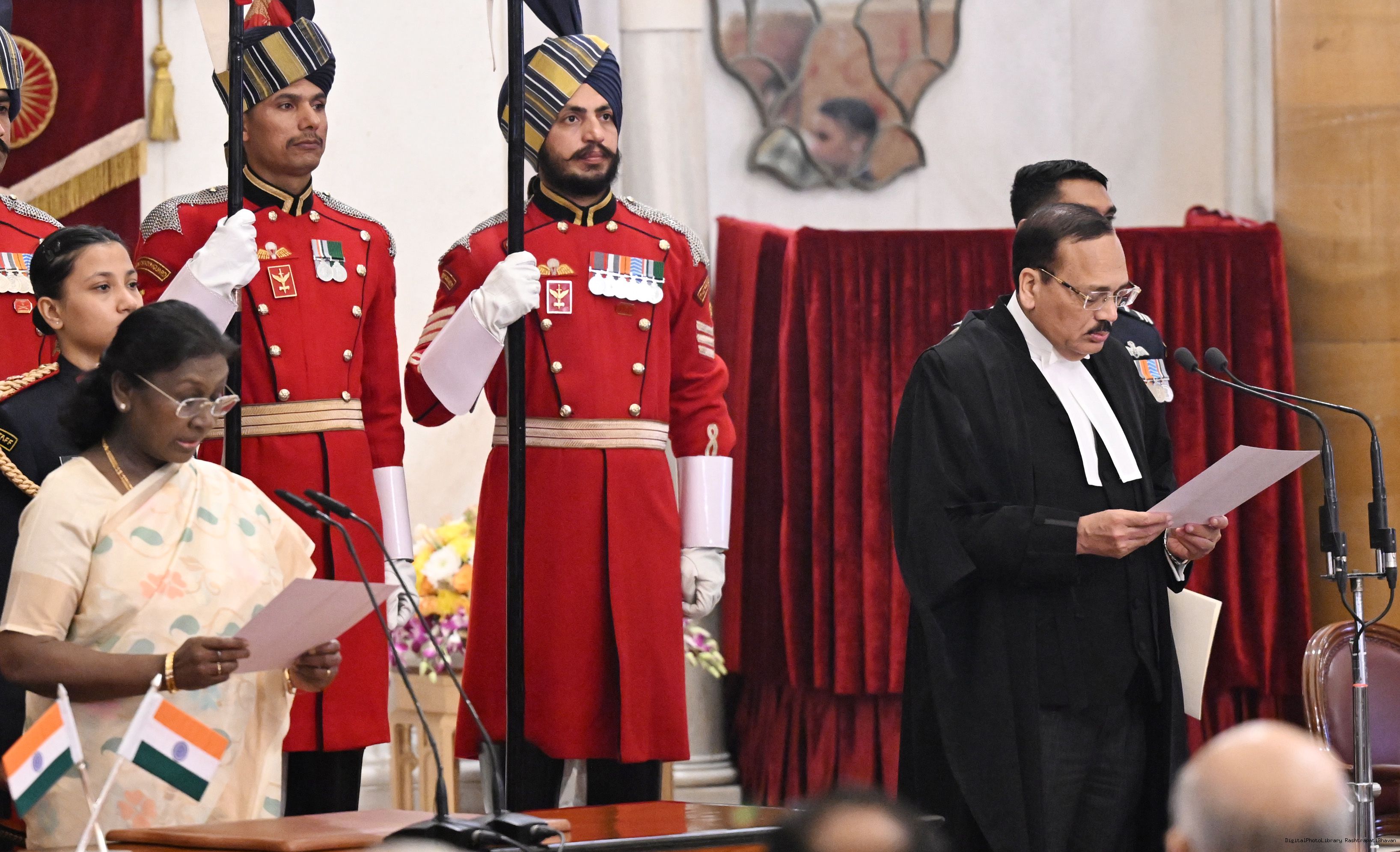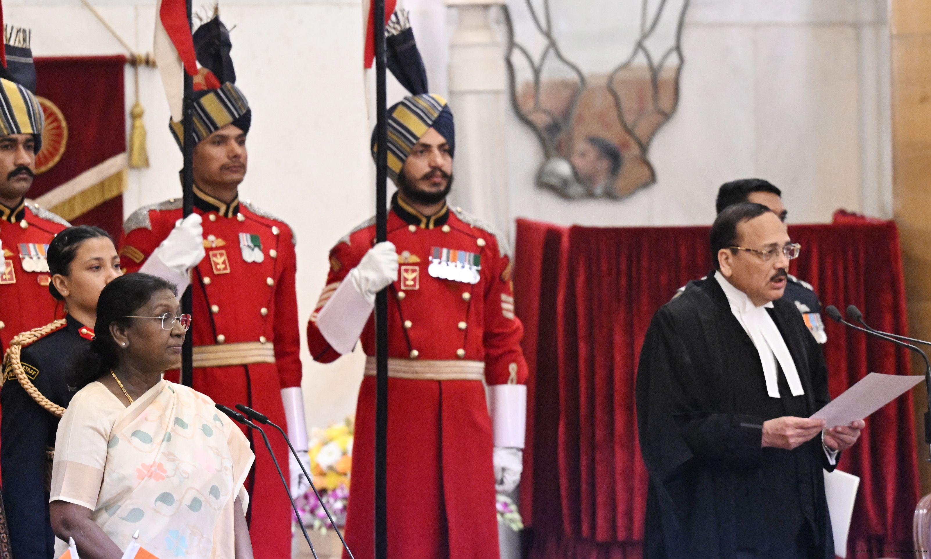 | Caption: | The President of India, Smt. Droupadi Murmu administered the oath of office to Shri Justice Surya Kant as the Chief Justice of the Supreme Court of India, at a Swearing-in-Ceremony in Rashtrapati Bhavan, New Delhi on November 24, 2025. |