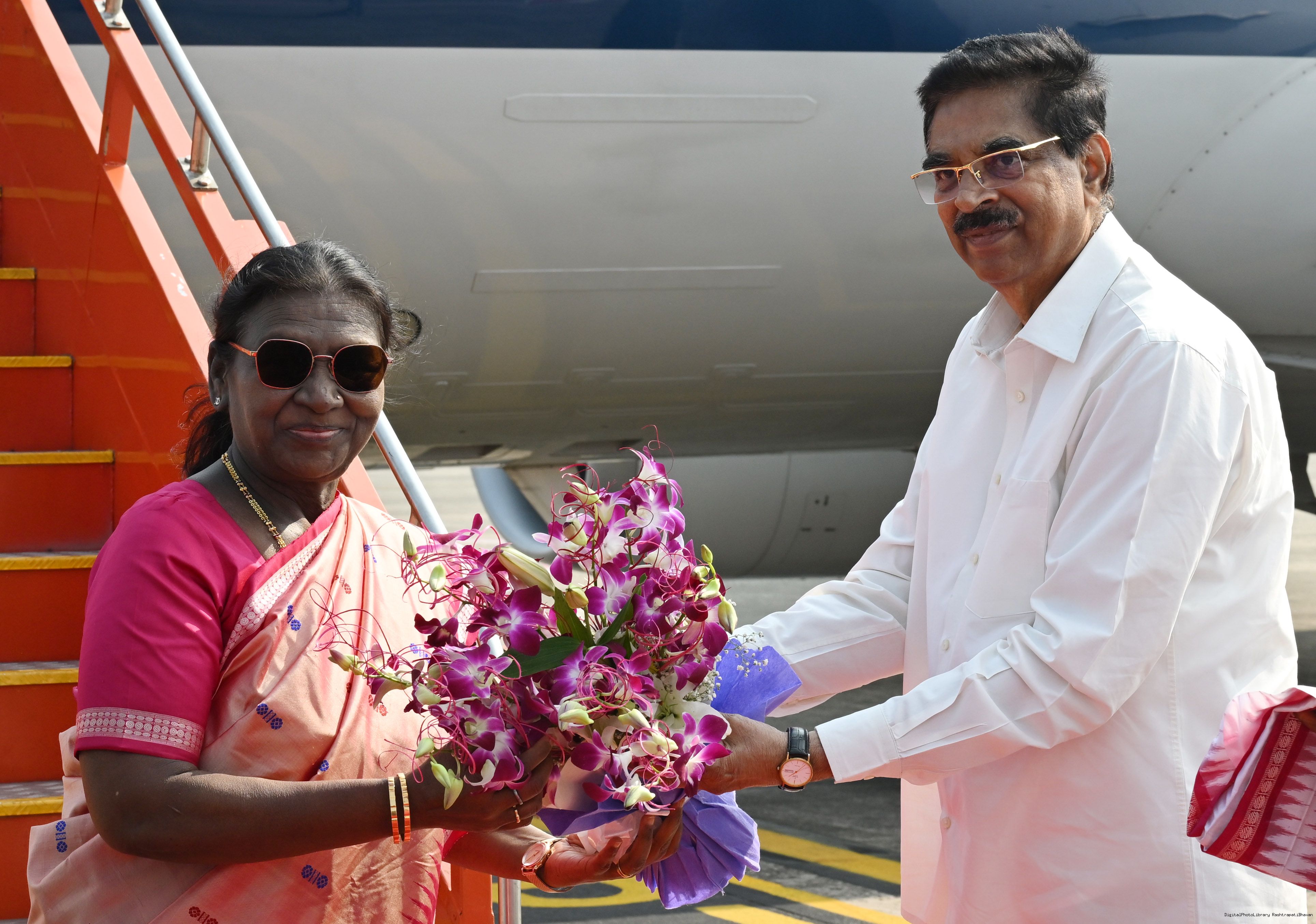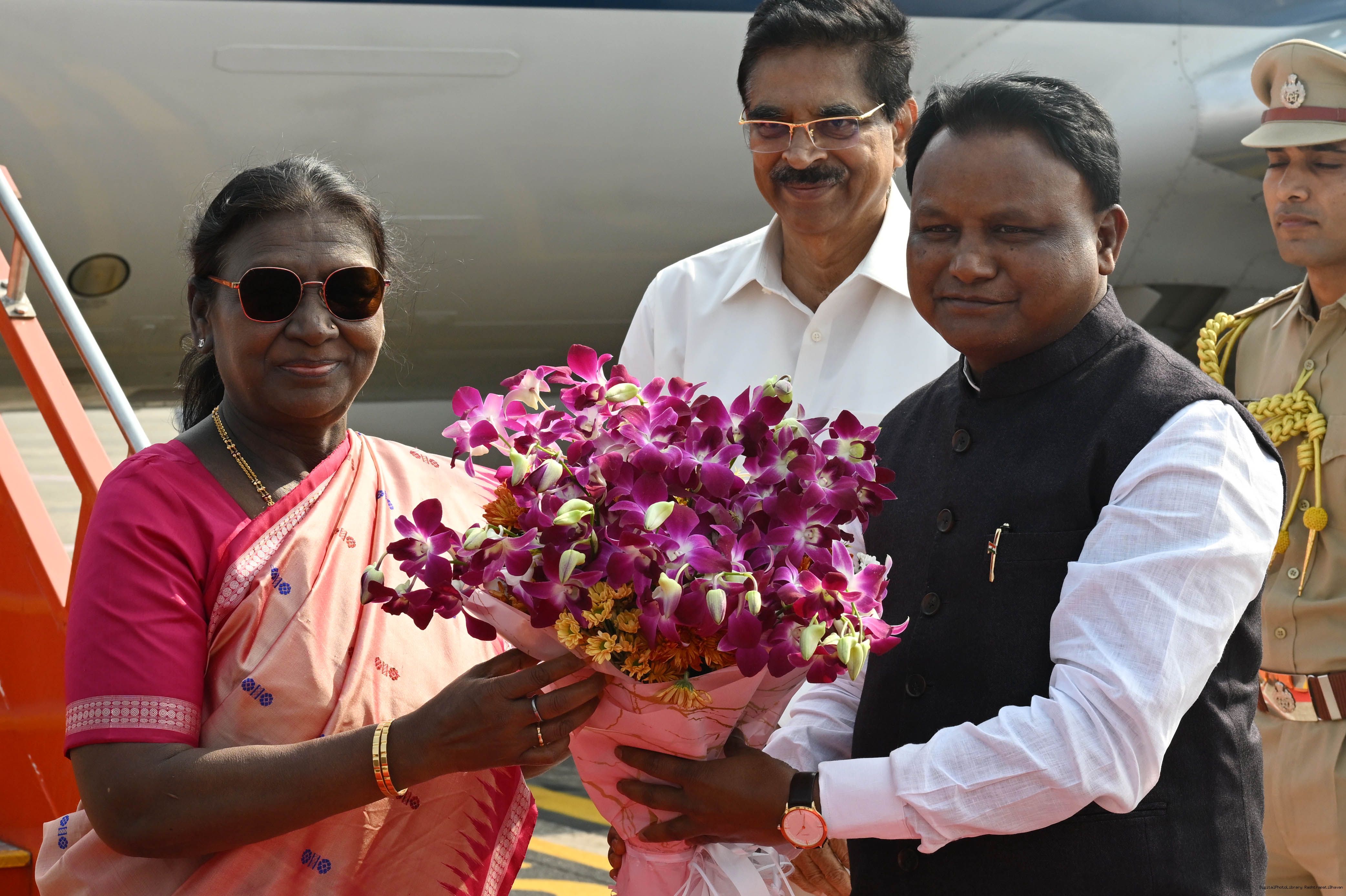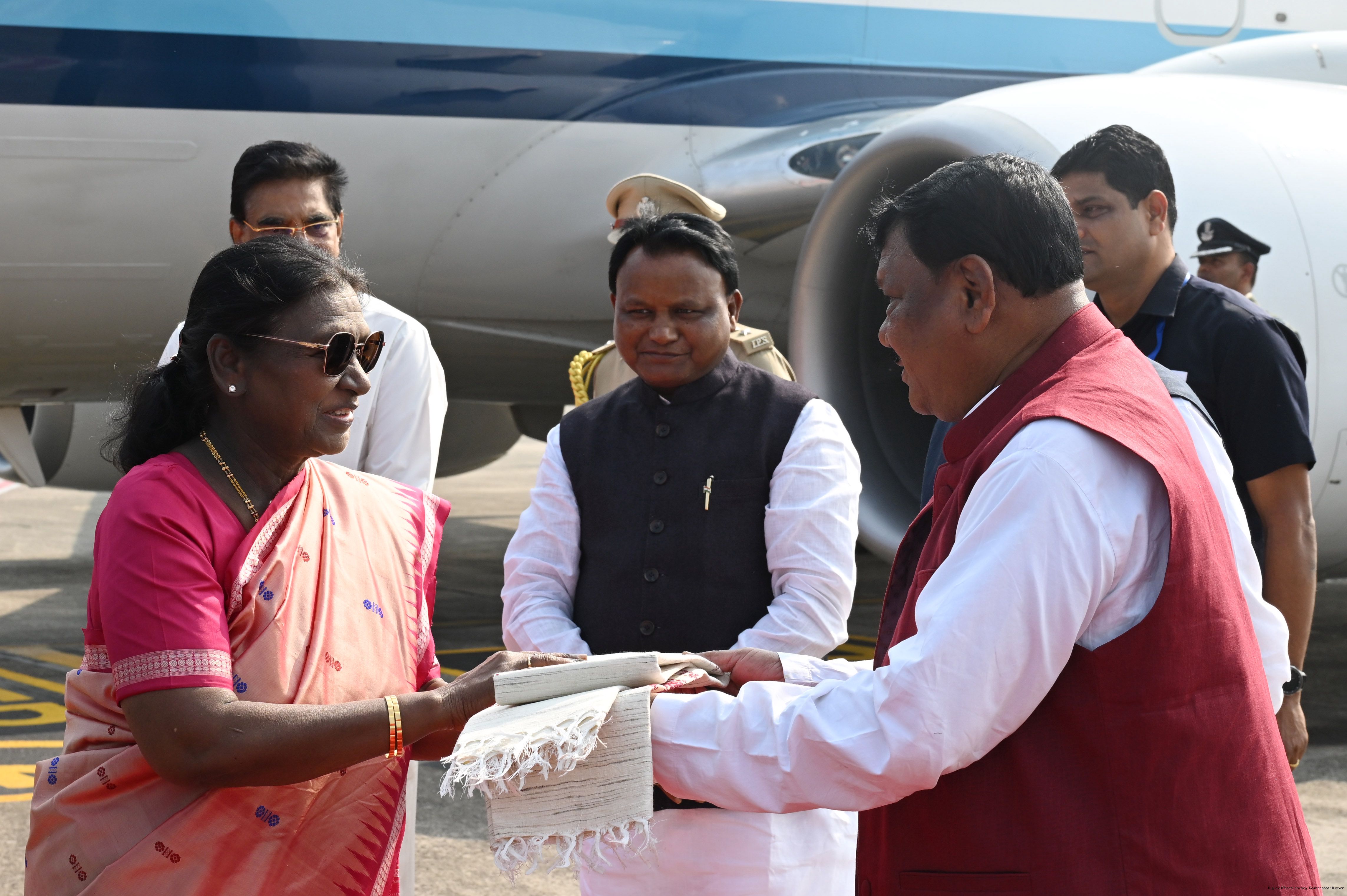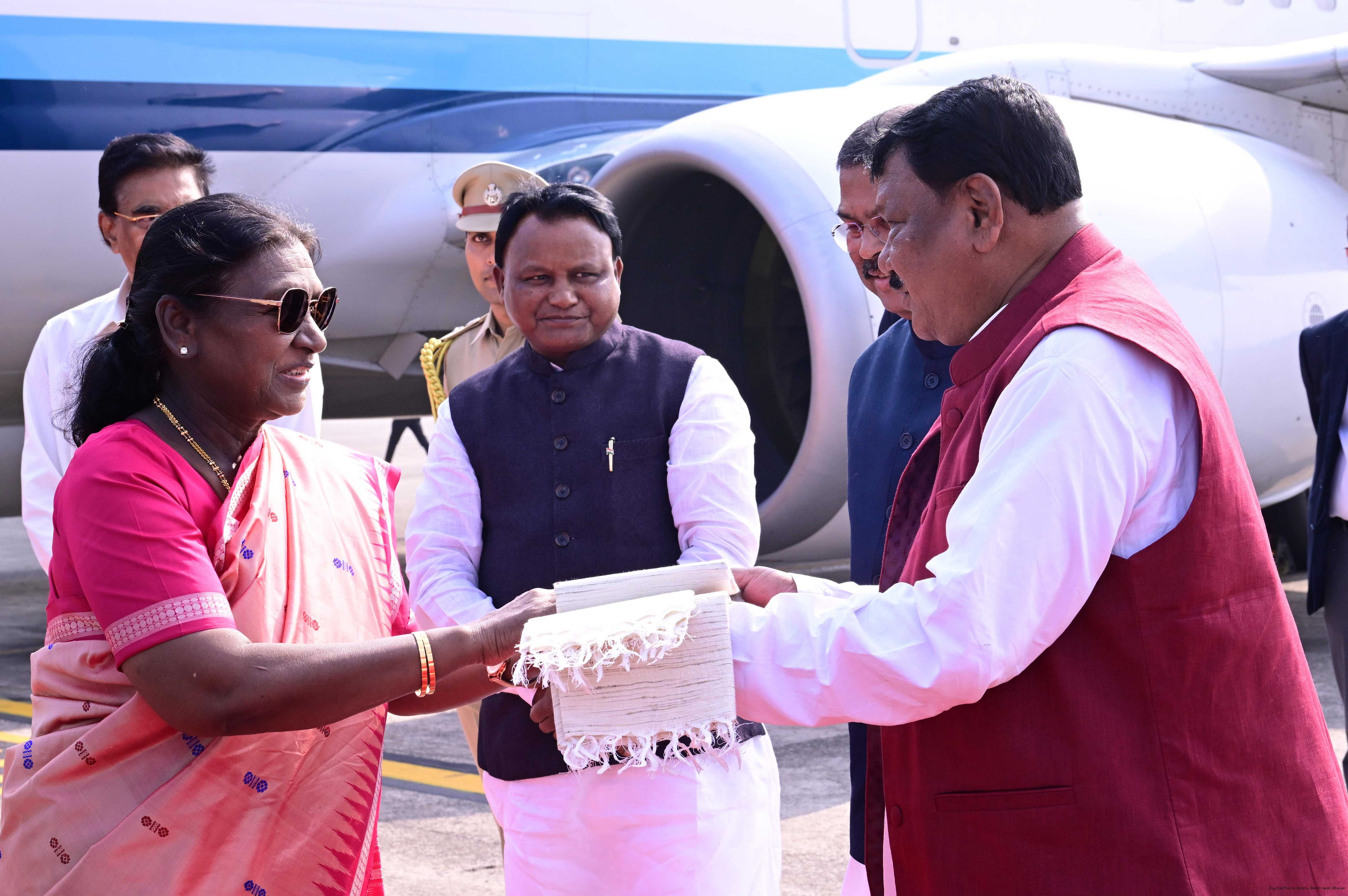| Caption: | The Governor of Odisha, Dr Hari Babu Kambhampati, Chief Minister, Shri Mohan Charan Majhi, Union Education Minister, Shri Dharmendra Pradhan and Union Minister for Tribal Affairs, Shri Jual Oram received the President of India, Smt. Droupadi Murmu on her arrival in Bhubaneswar, Odisha on November 27, 2025. |