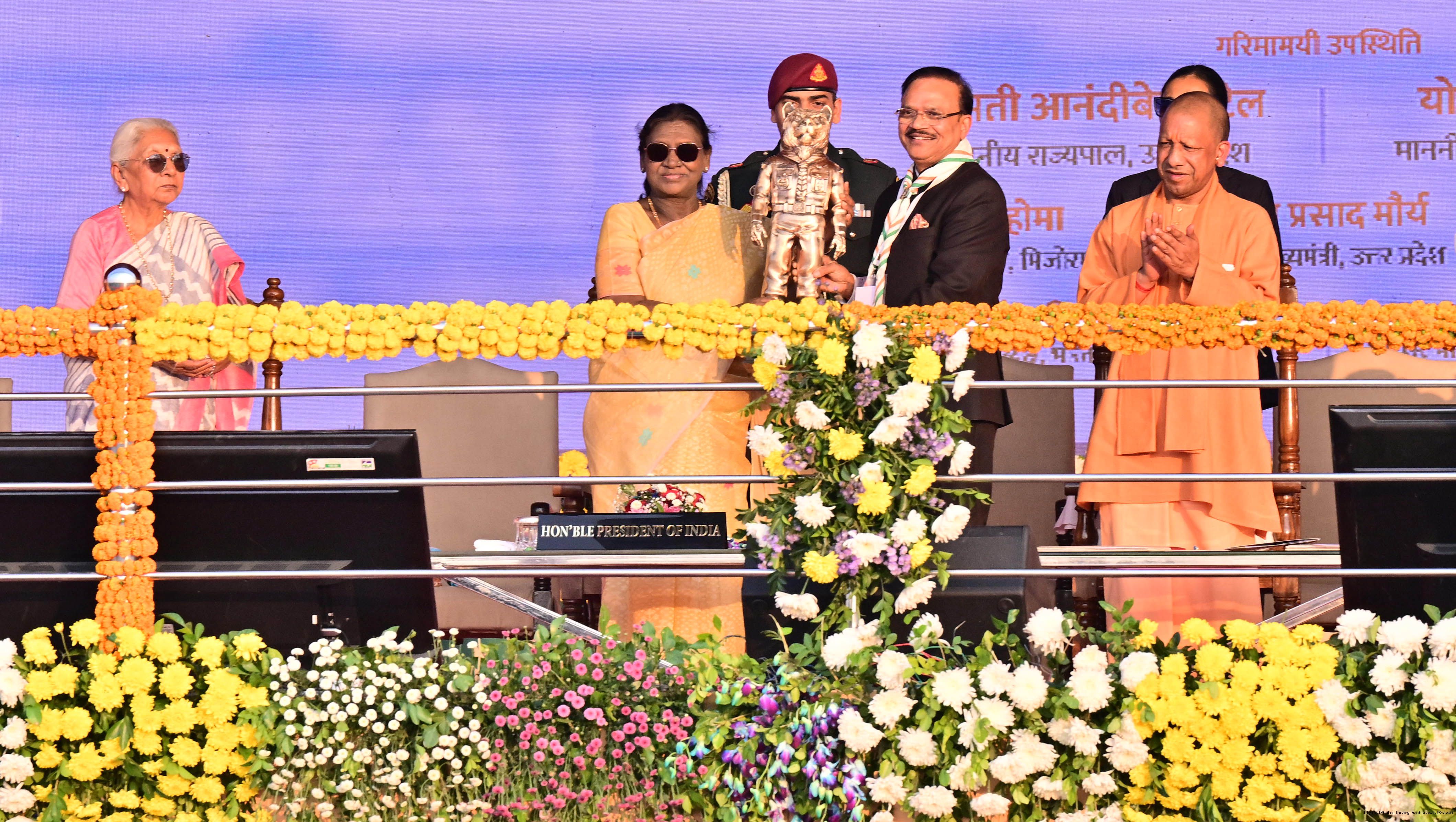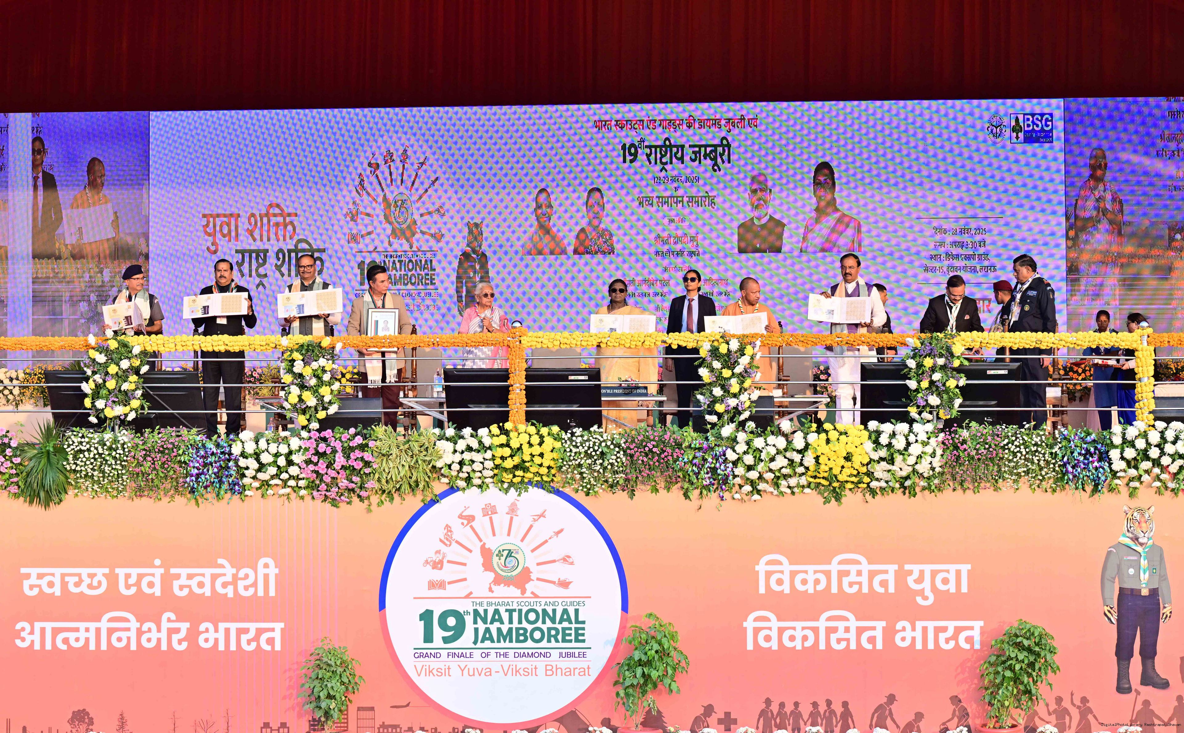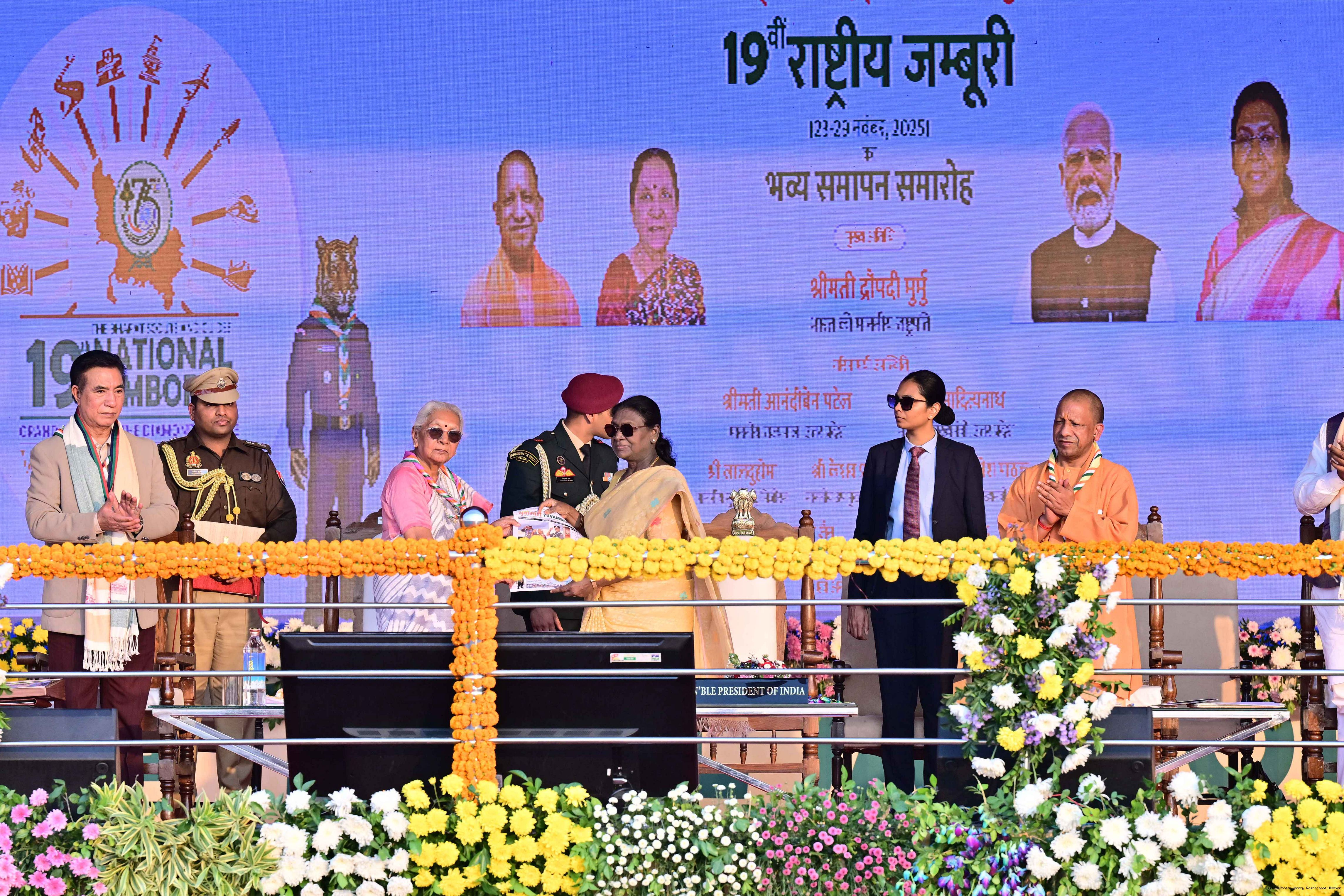 | Caption: | The President of India, Smt Droupadi Murmu, graced the closing ceremony of the Diamond Jubilee Celebrations of Bharat Scouts and Guides and addressed its 19th National Jamboree at Lucknow, Uttar Pradesh, on November 28, 2025. |