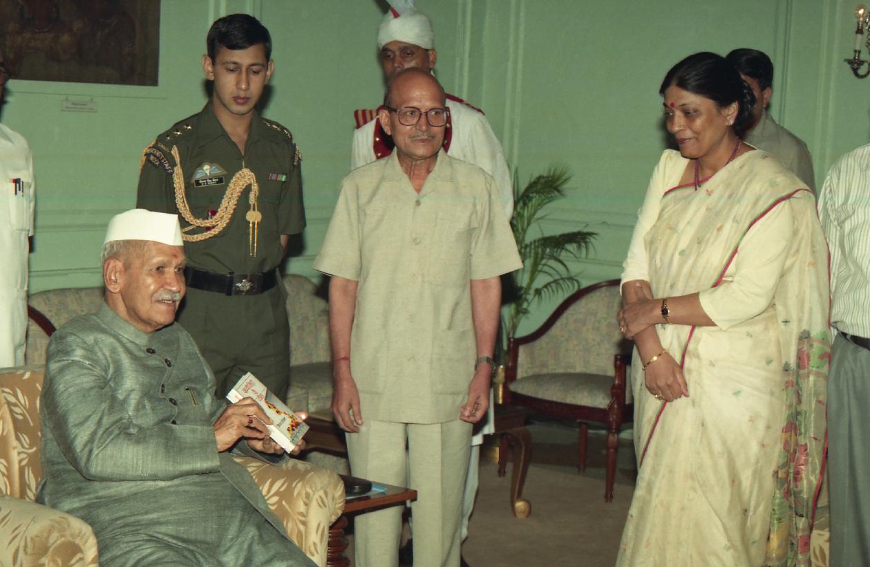 | Caption: | The President of India, Dr. Shankar Dayal Sharma receiving a copy of the book "Kachi Mitti Ke Log" from Smt. Vijaya Goel at Rashtrapati Bhavan in New Delhi on September 12, 1996. |