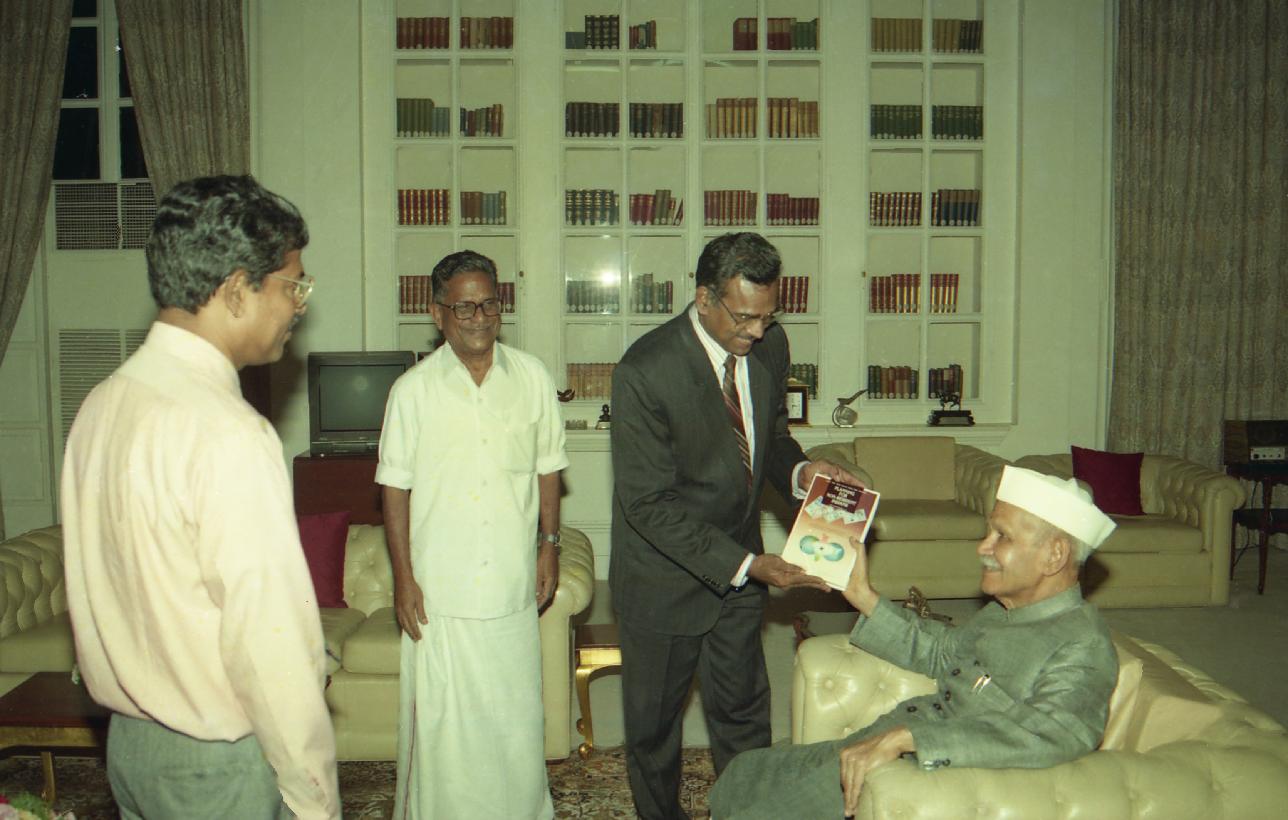 | Caption: | The President of India, Dr. Shankar Dayal Sharma receiving a copy of the book from Shri V.V. Raghava with others at Rashtrapati Bhavan in New Delhi on September 12, 1996. |