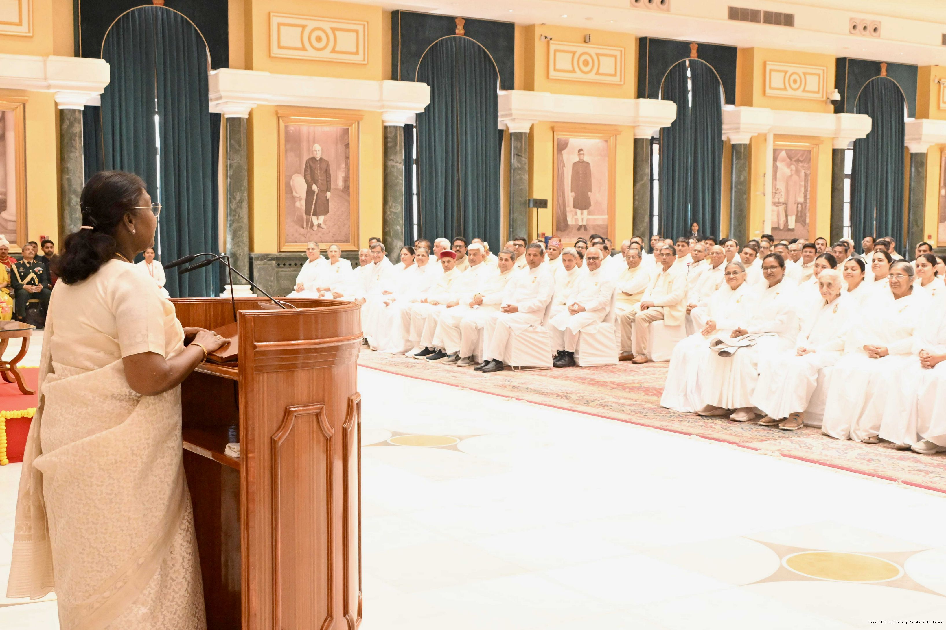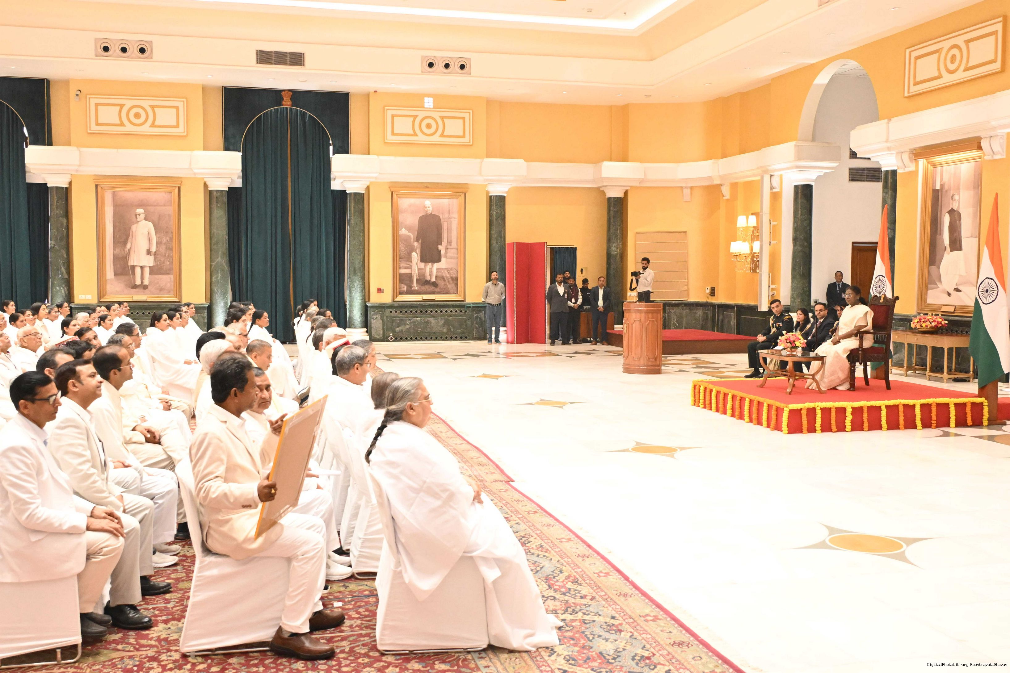 | Caption: | The President of India, Smt. Droupadi Murmu interacted and posing a group photograph with groups of Brahmkumaris at Rashtrapati Bhavan on December 2, 2025. |