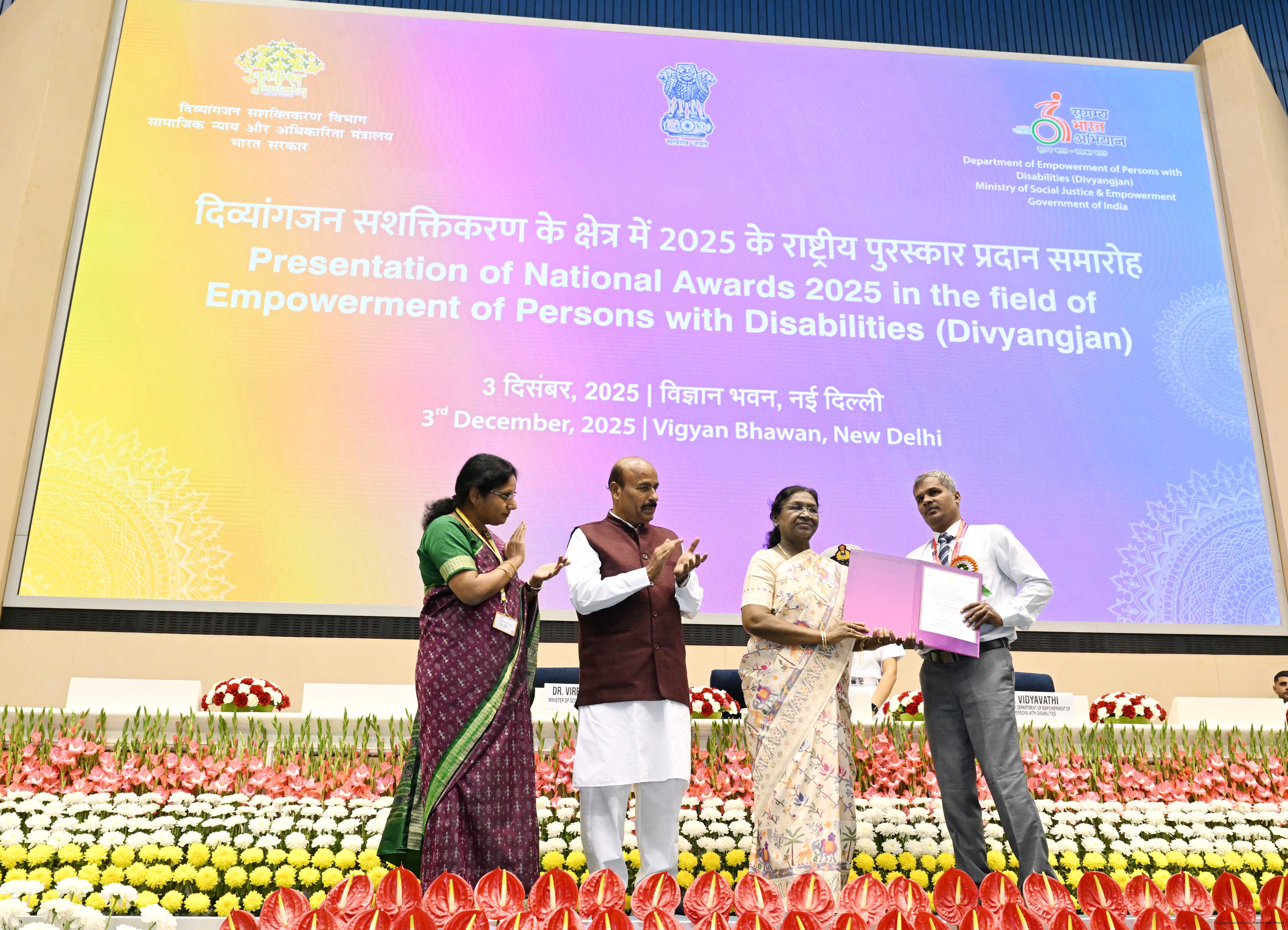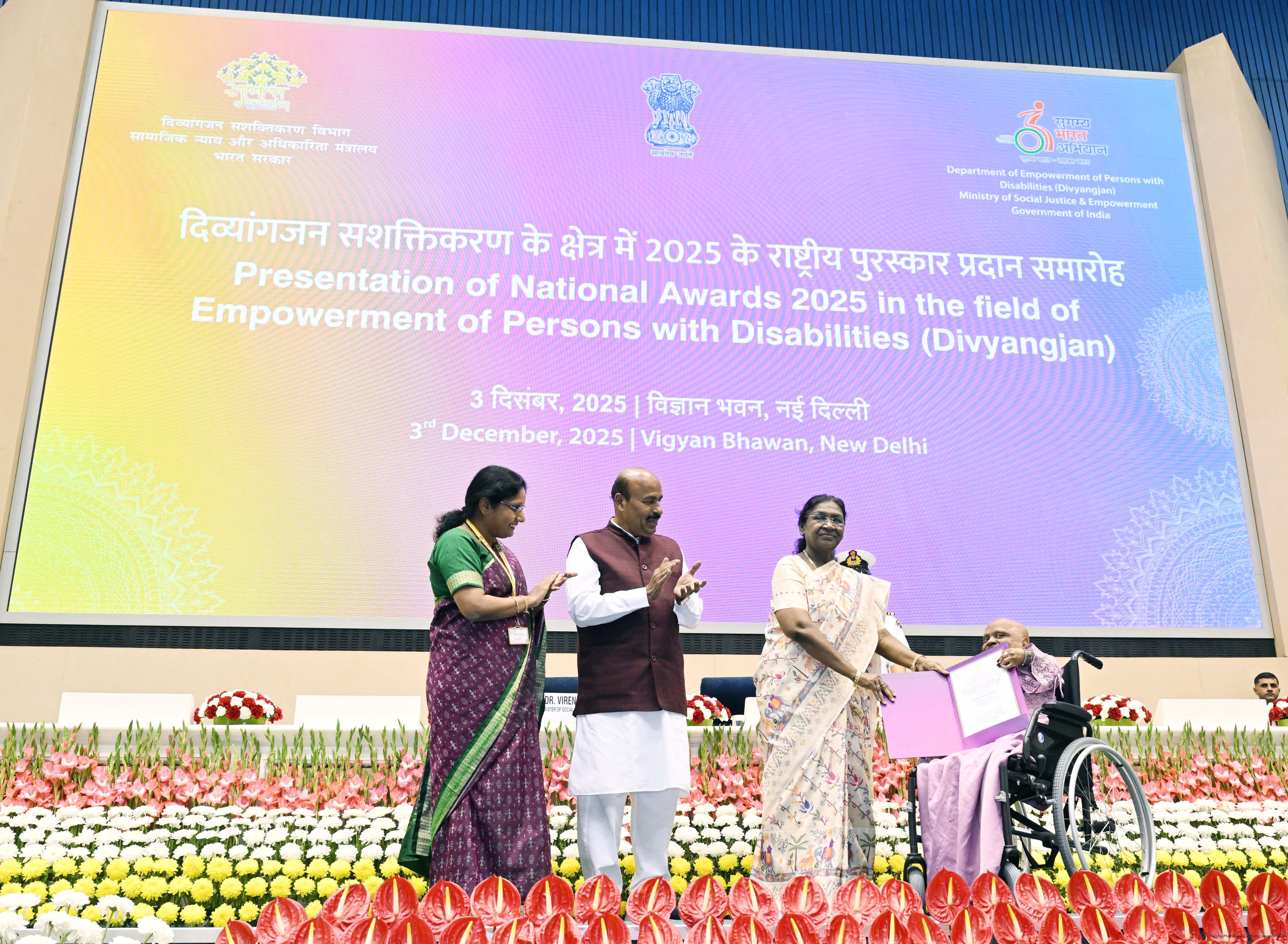 | Caption: | The President of India, Smt Droupadi Murmu, presented the National Awards for the Empowerment of Persons with Disabilities for the year 2025 in New Delhi on December 3, 2025 on the occasion of the International Day of Persons with Disabilities. |