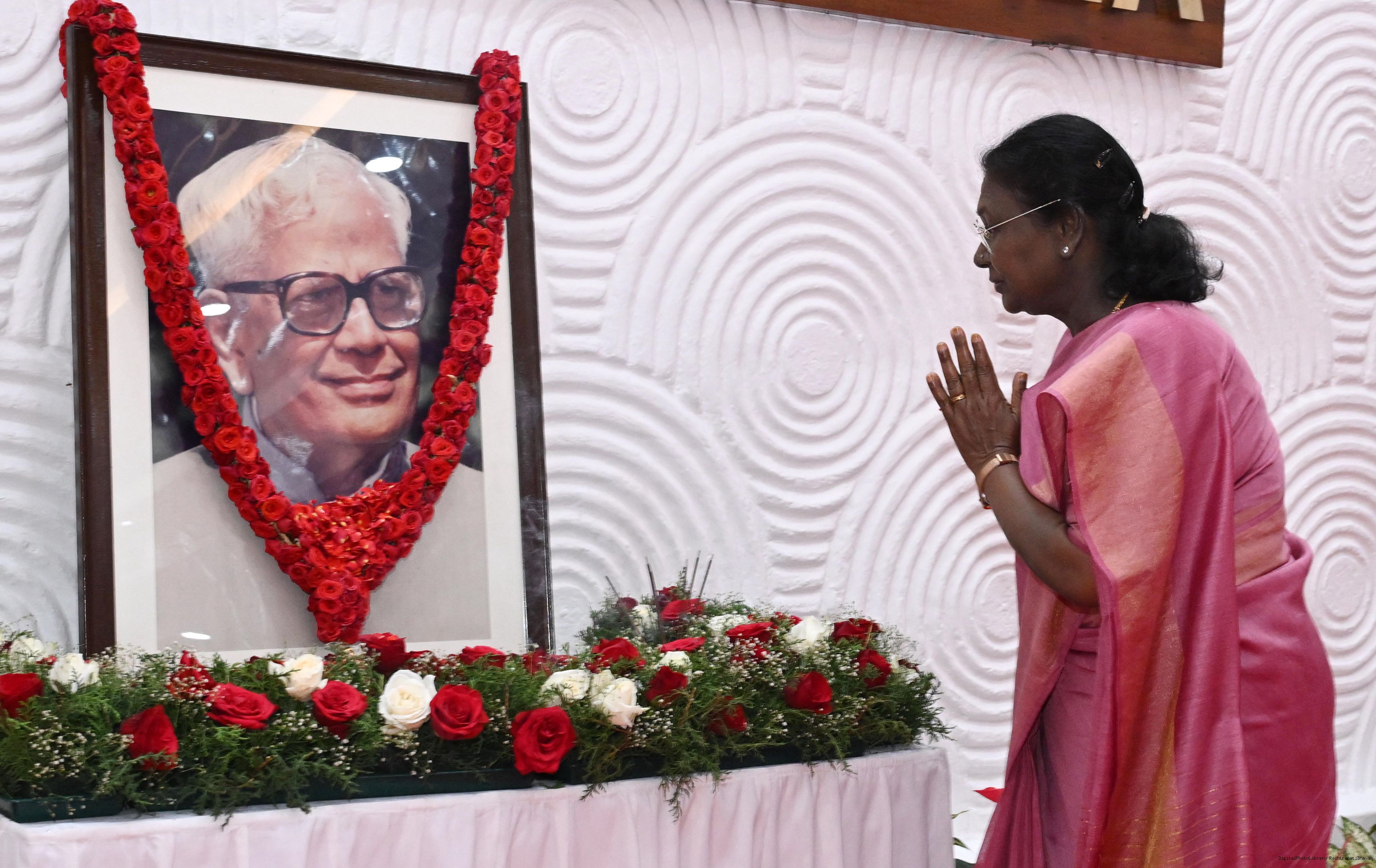| Caption: | The President of India, Smt Droupadi Murmu paid floral tributes to Shri R. Venkataraman, former President of India, on his birth anniversary at Lok Bhavan, Thiruvananthapuram on December 4, 2025. |