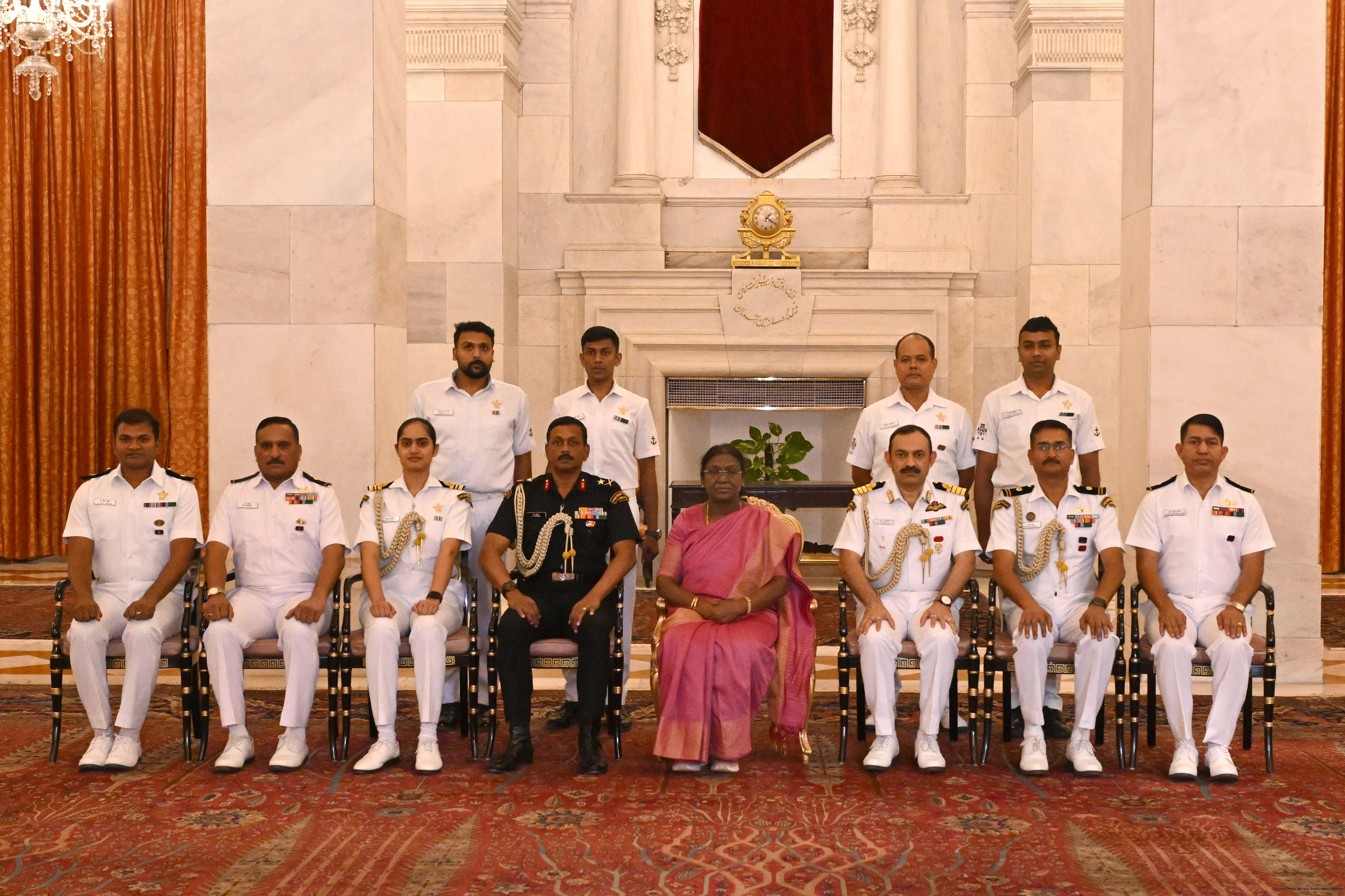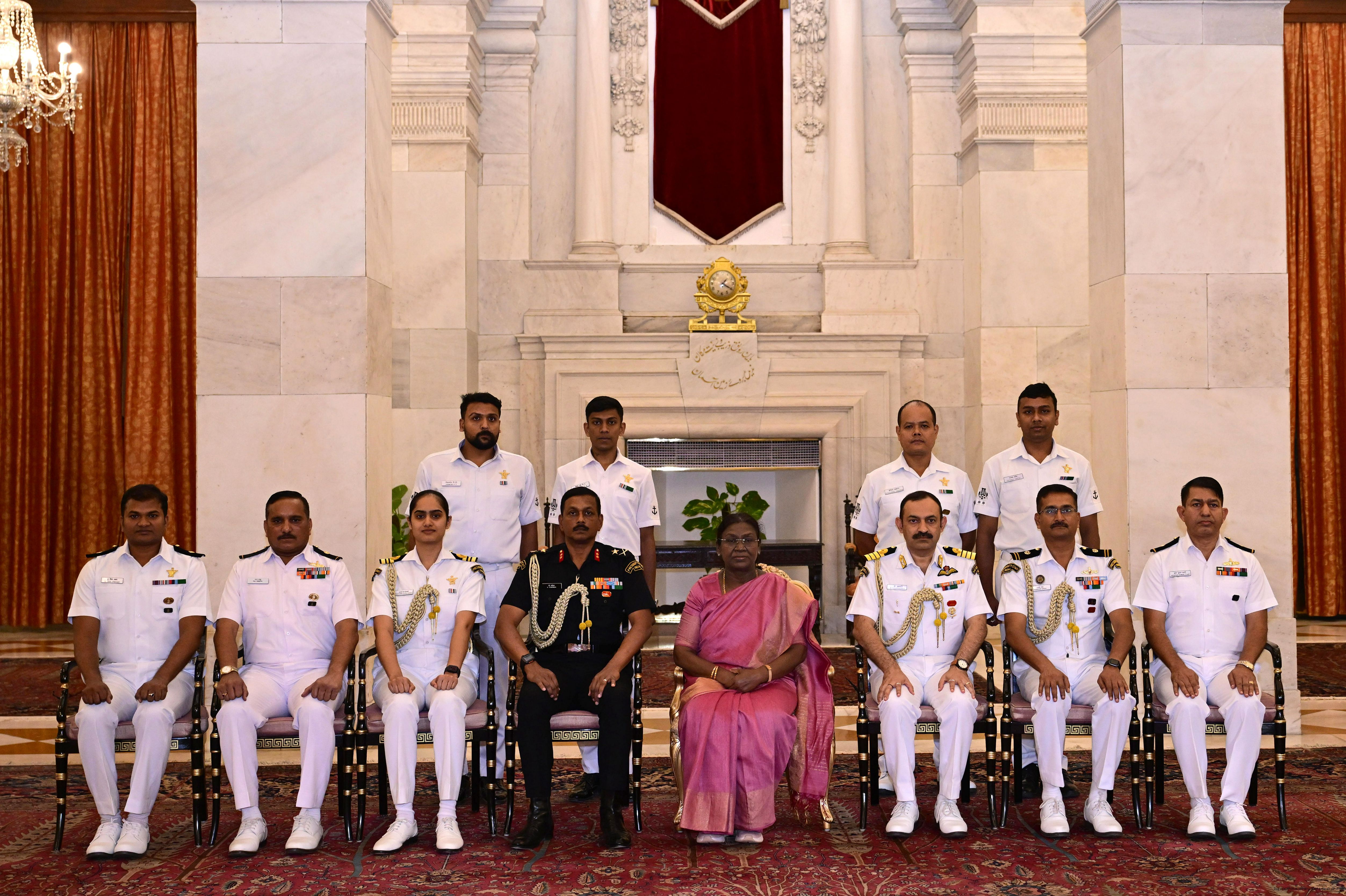| Caption: | The President of India, Smt Droupadi Murmu posing a group photograph with Naval personnel attached with Rashtrapati Bhavan on December 4, 2025. |