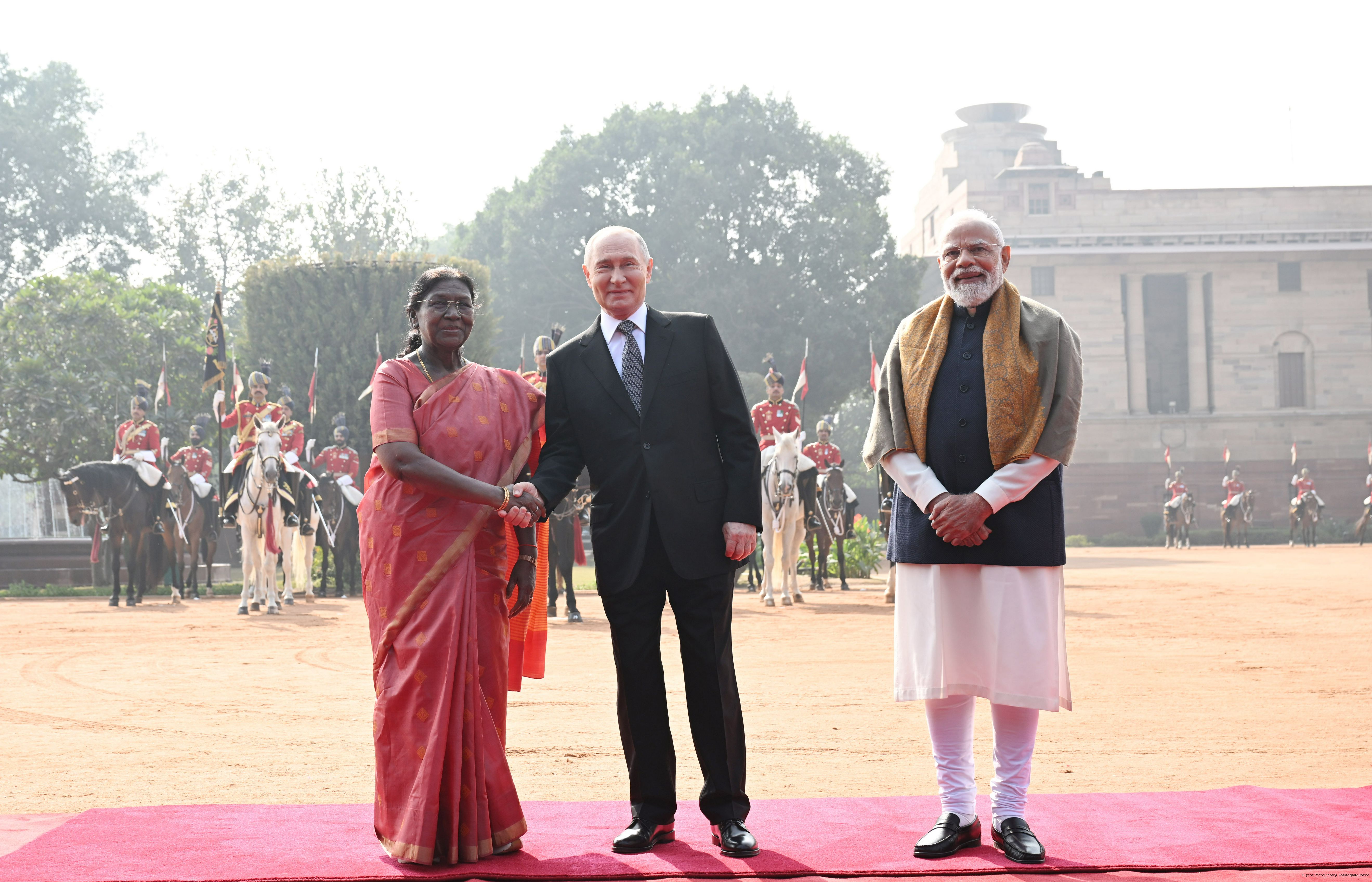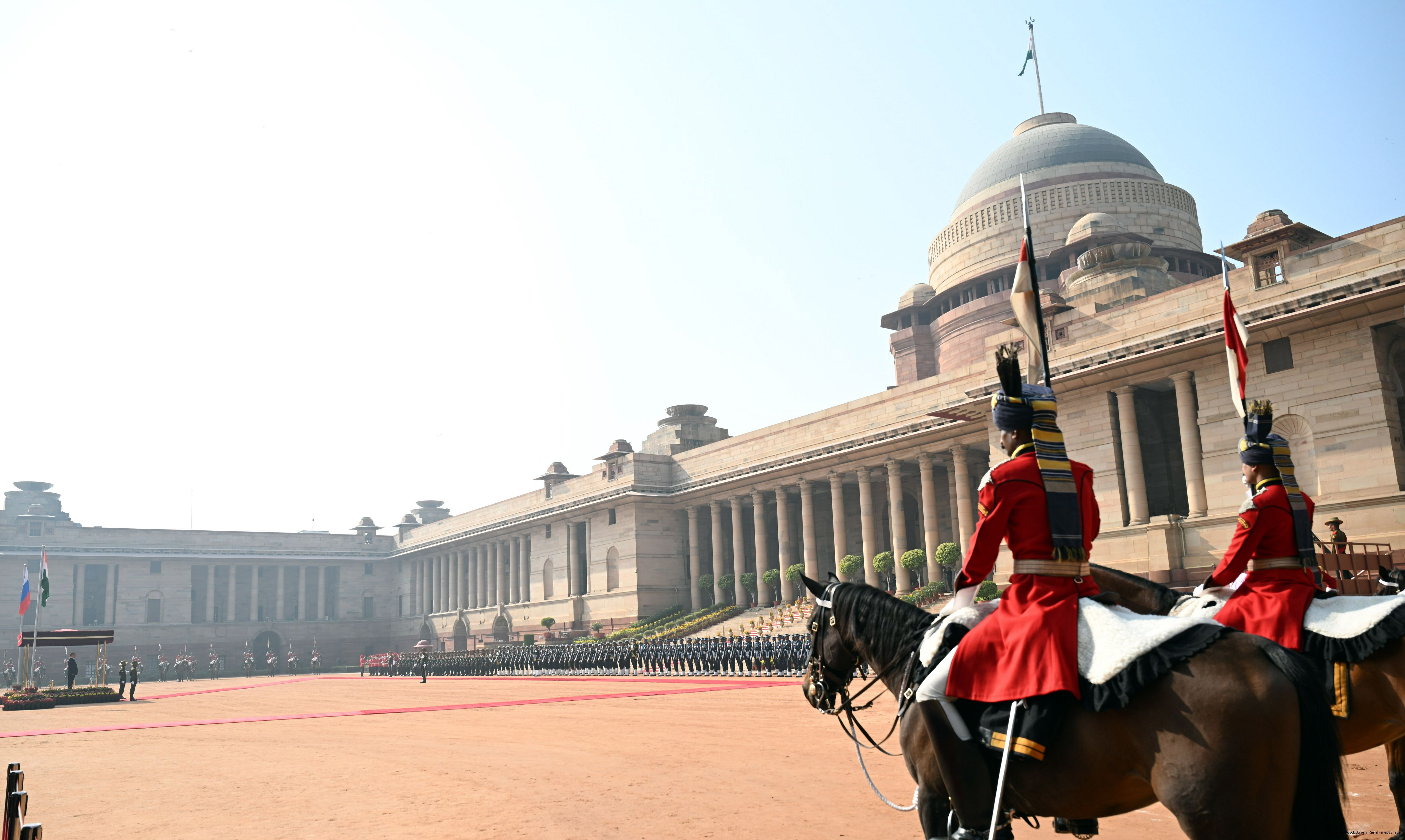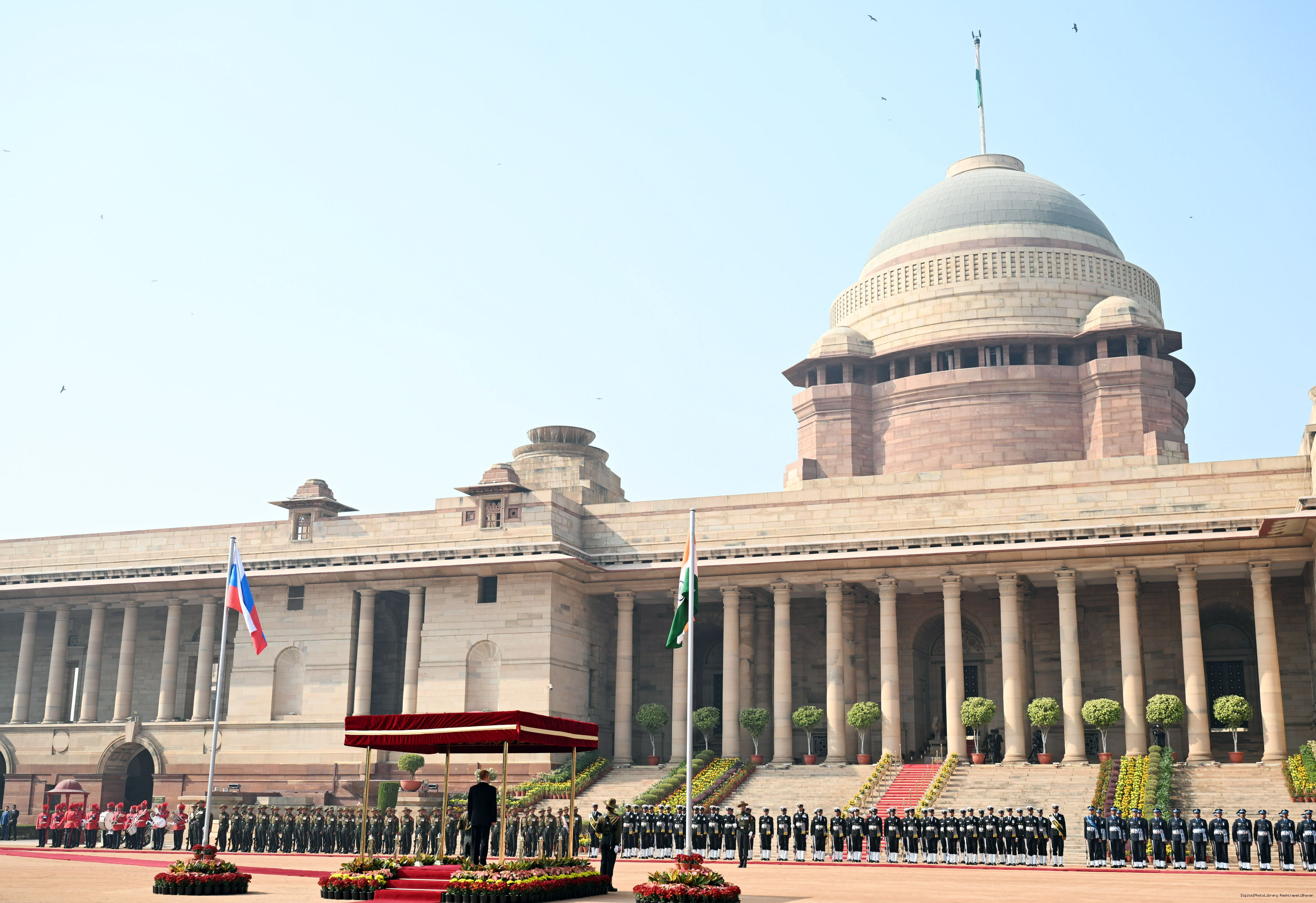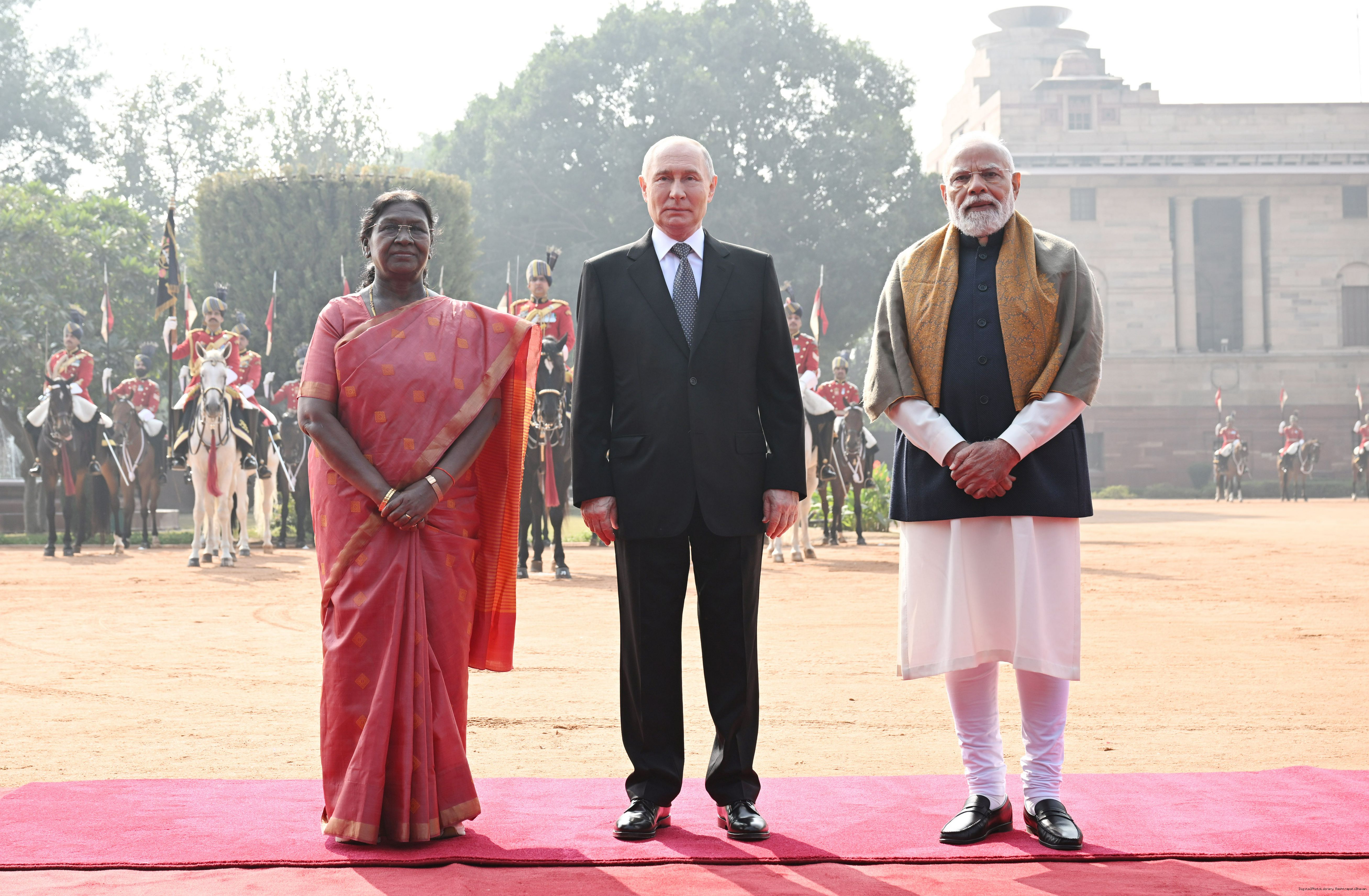 | Caption: | The President of India, Smt. Droupadi Murmu accorded a ceremonial welcome to H.E. Mr Vladimir Putin, President of the Russian Federation, at Rashtrapati Bhavan on December 5, 2025. |
