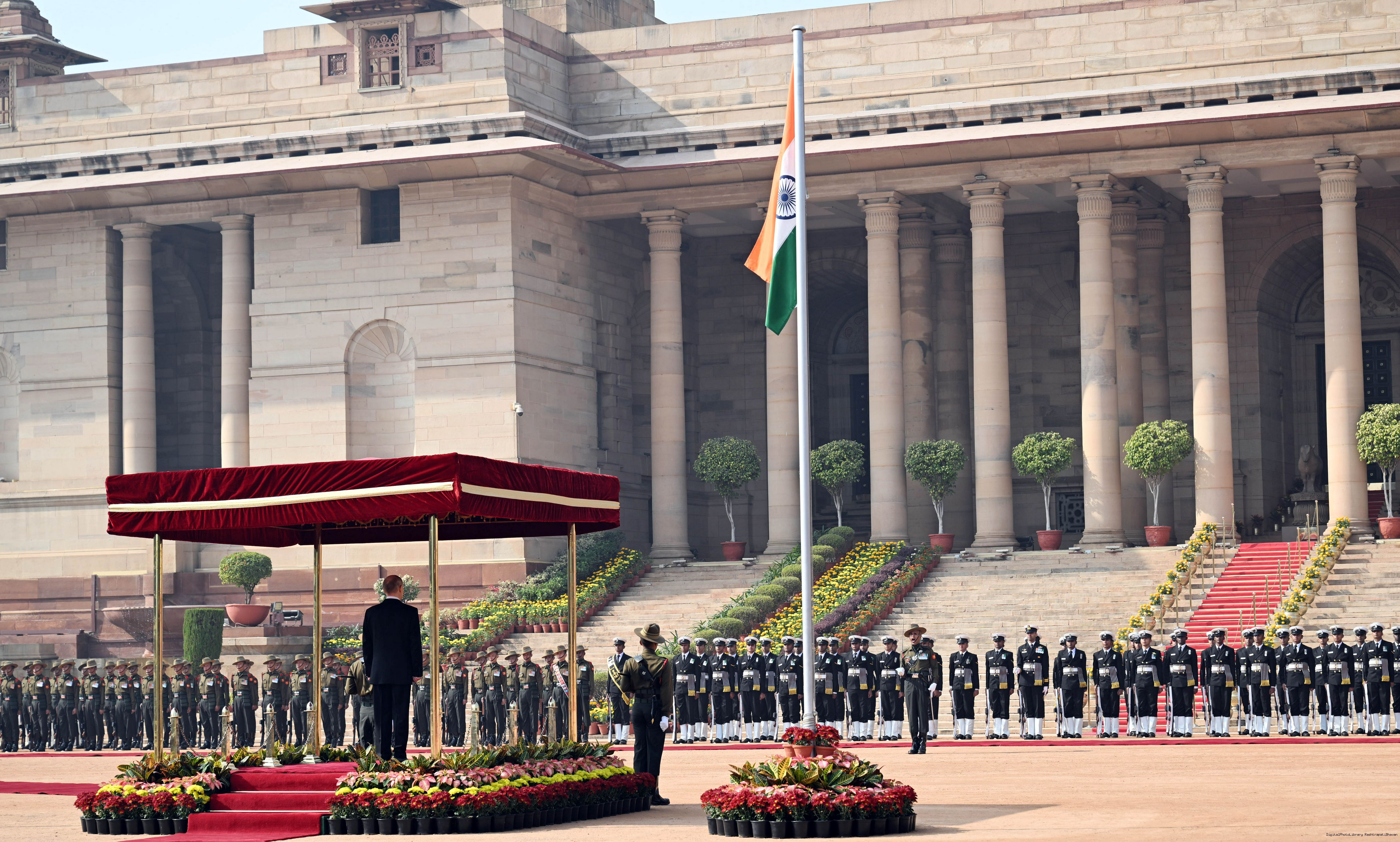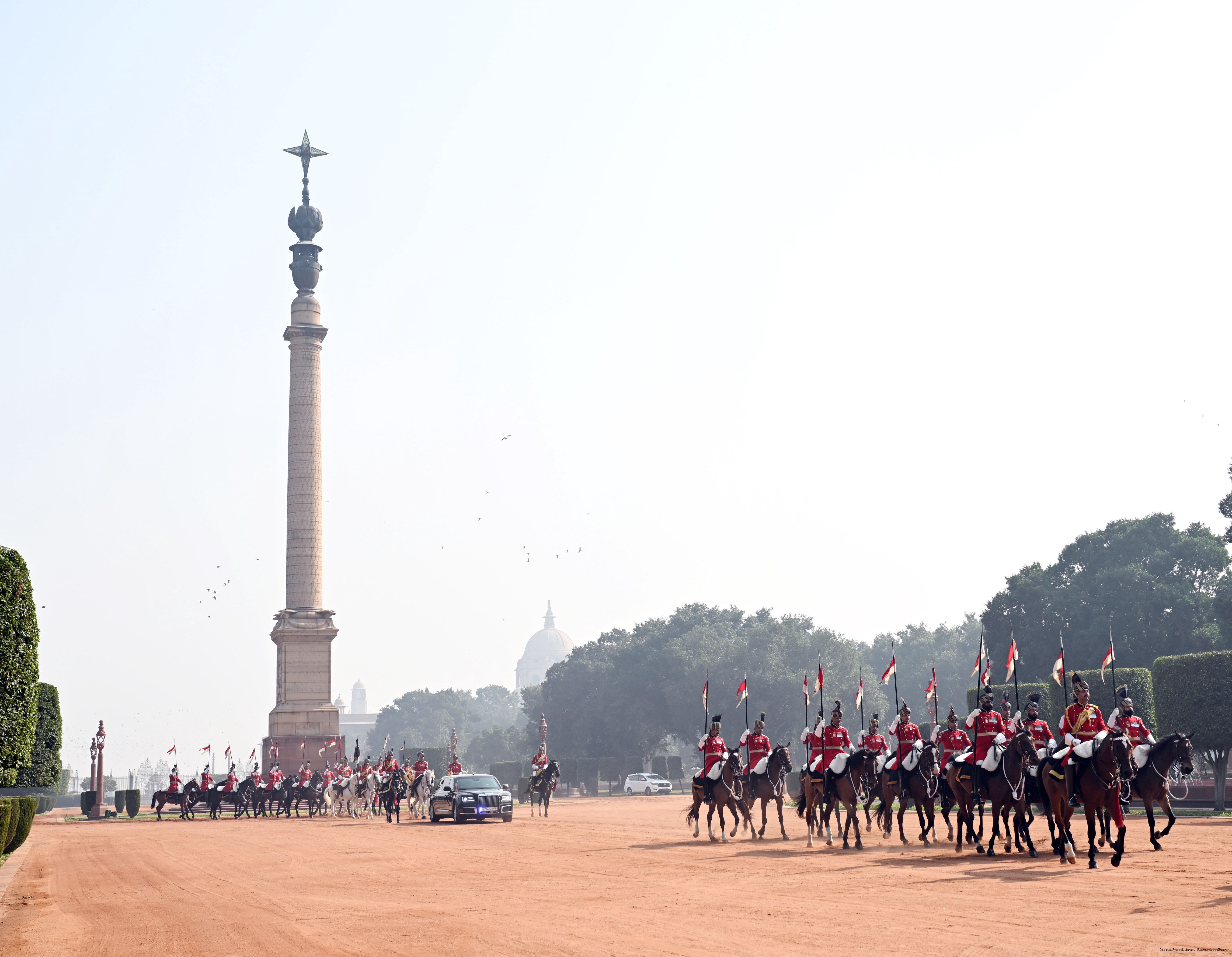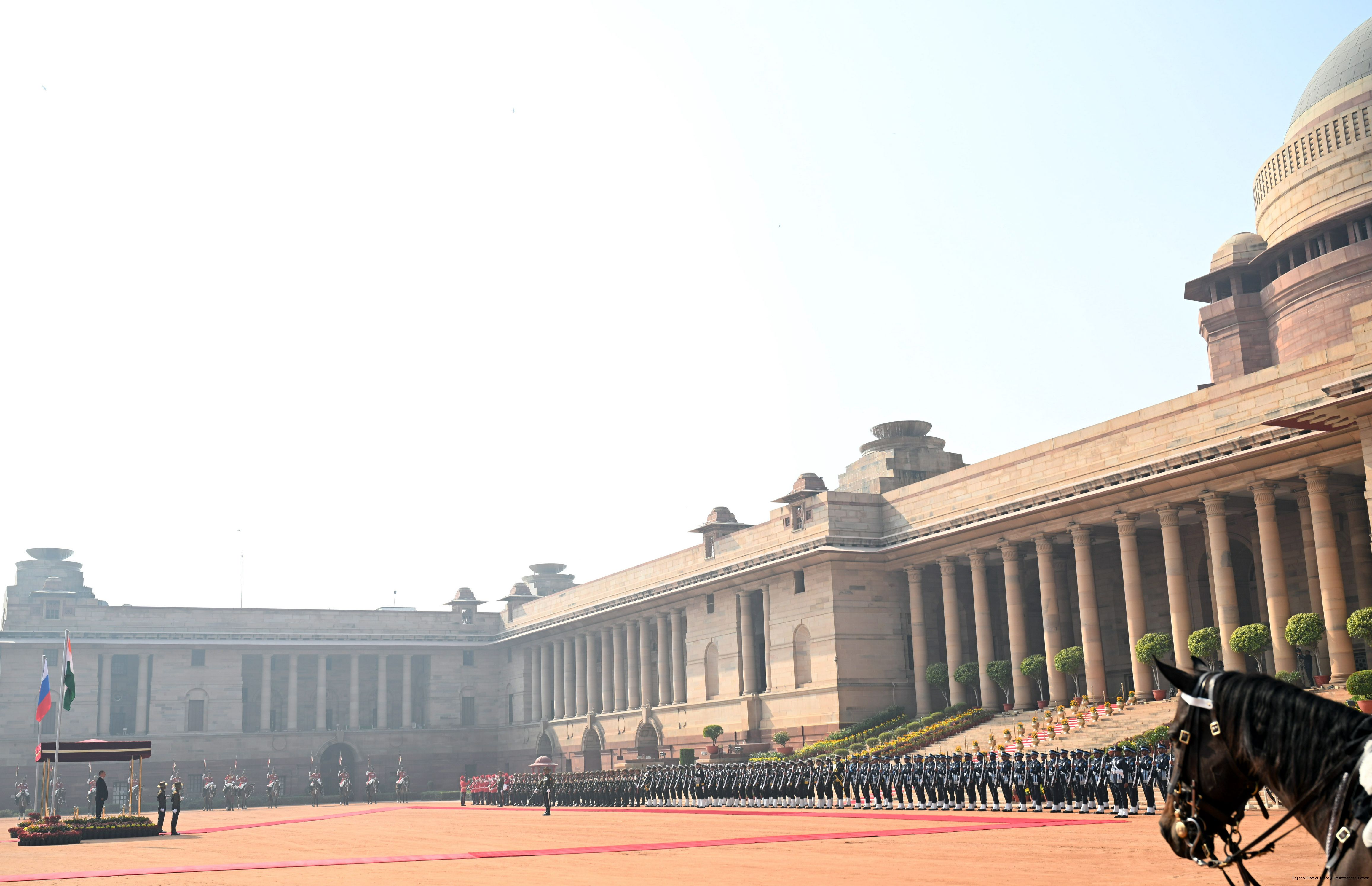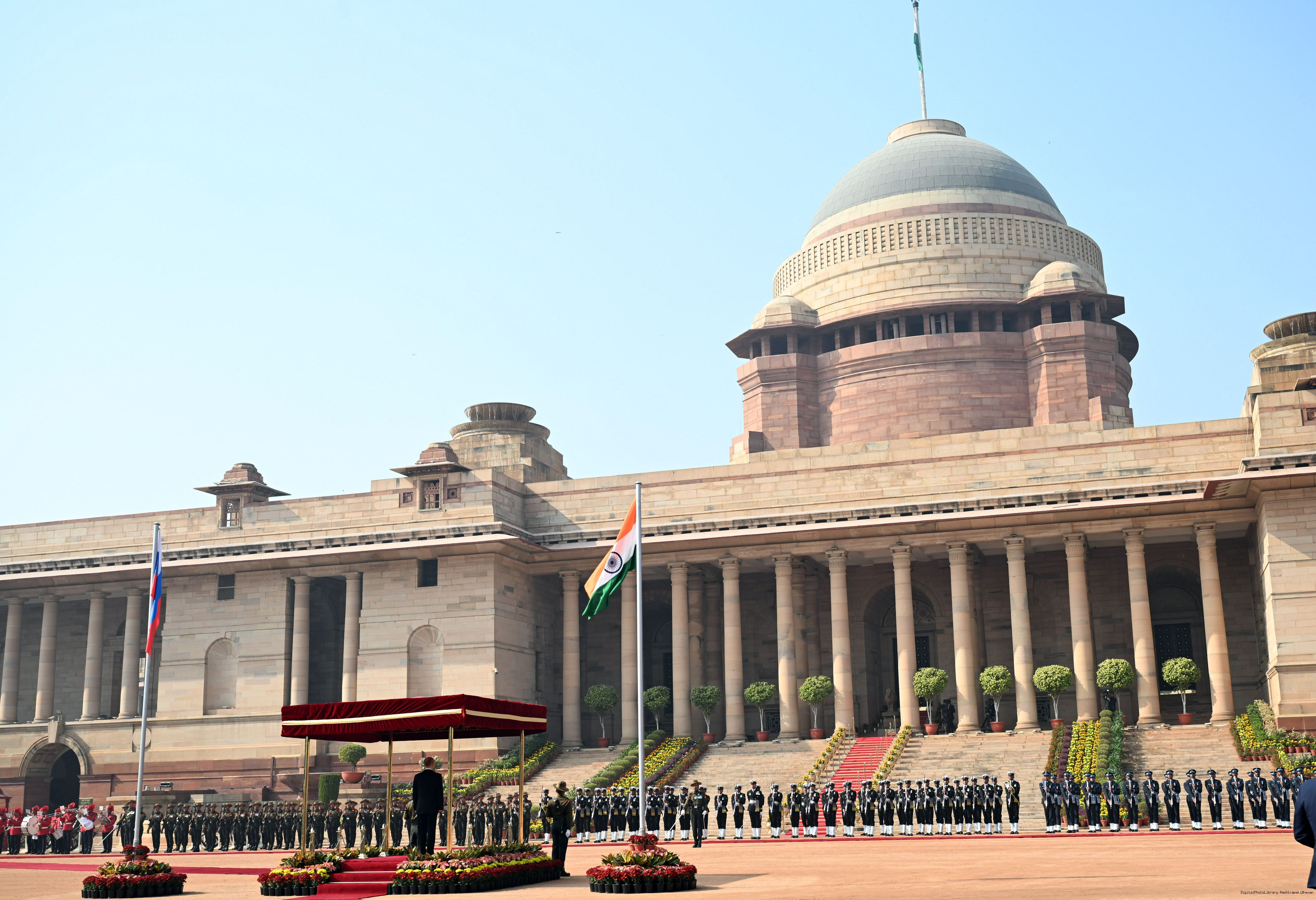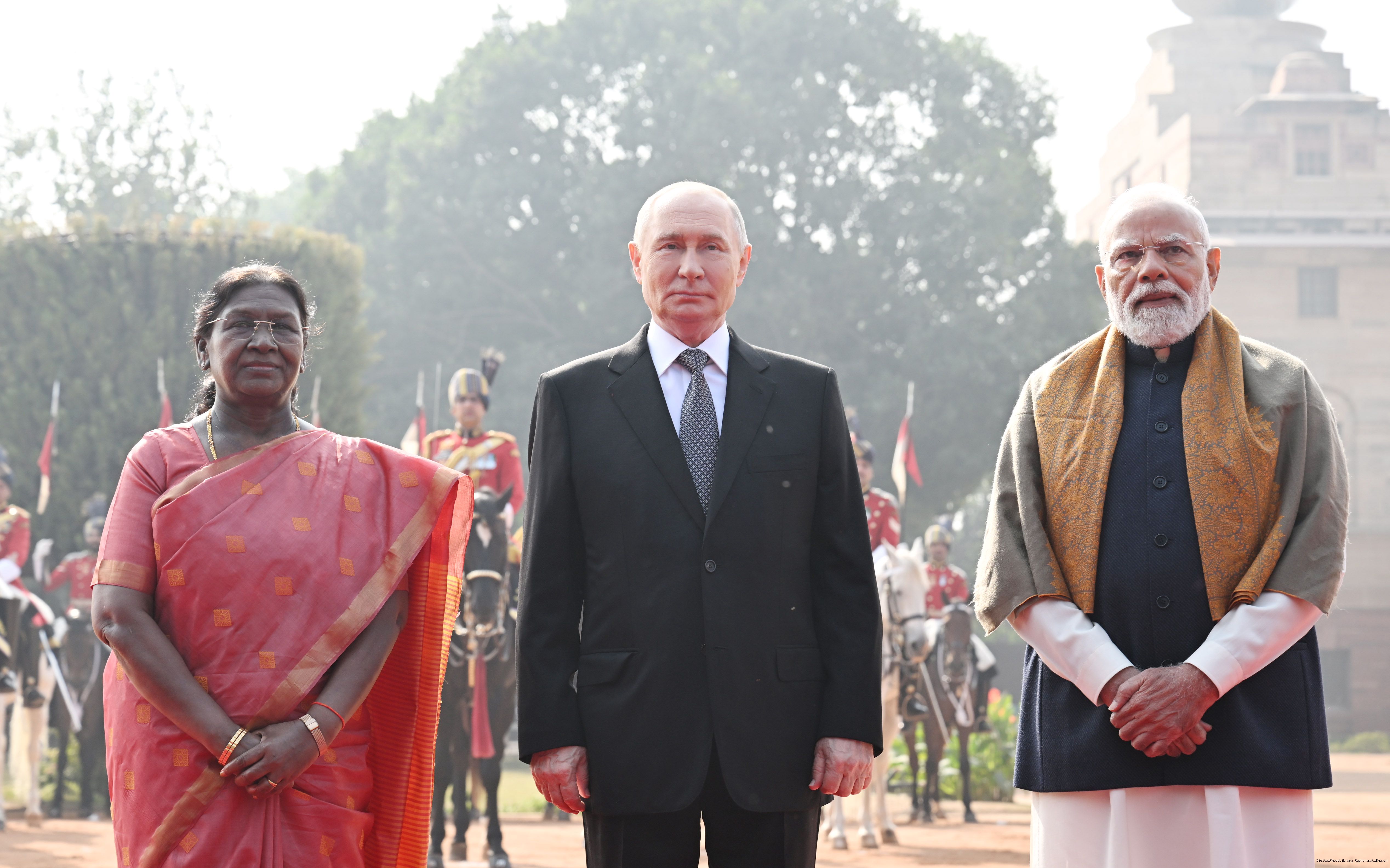| Caption: | The President of India, Smt. Droupadi Murmu accorded a ceremonial welcome to H.E. Mr Vladimir Putin, President of the Russian Federation, at Rashtrapati Bhavan on December 5, 2025. |