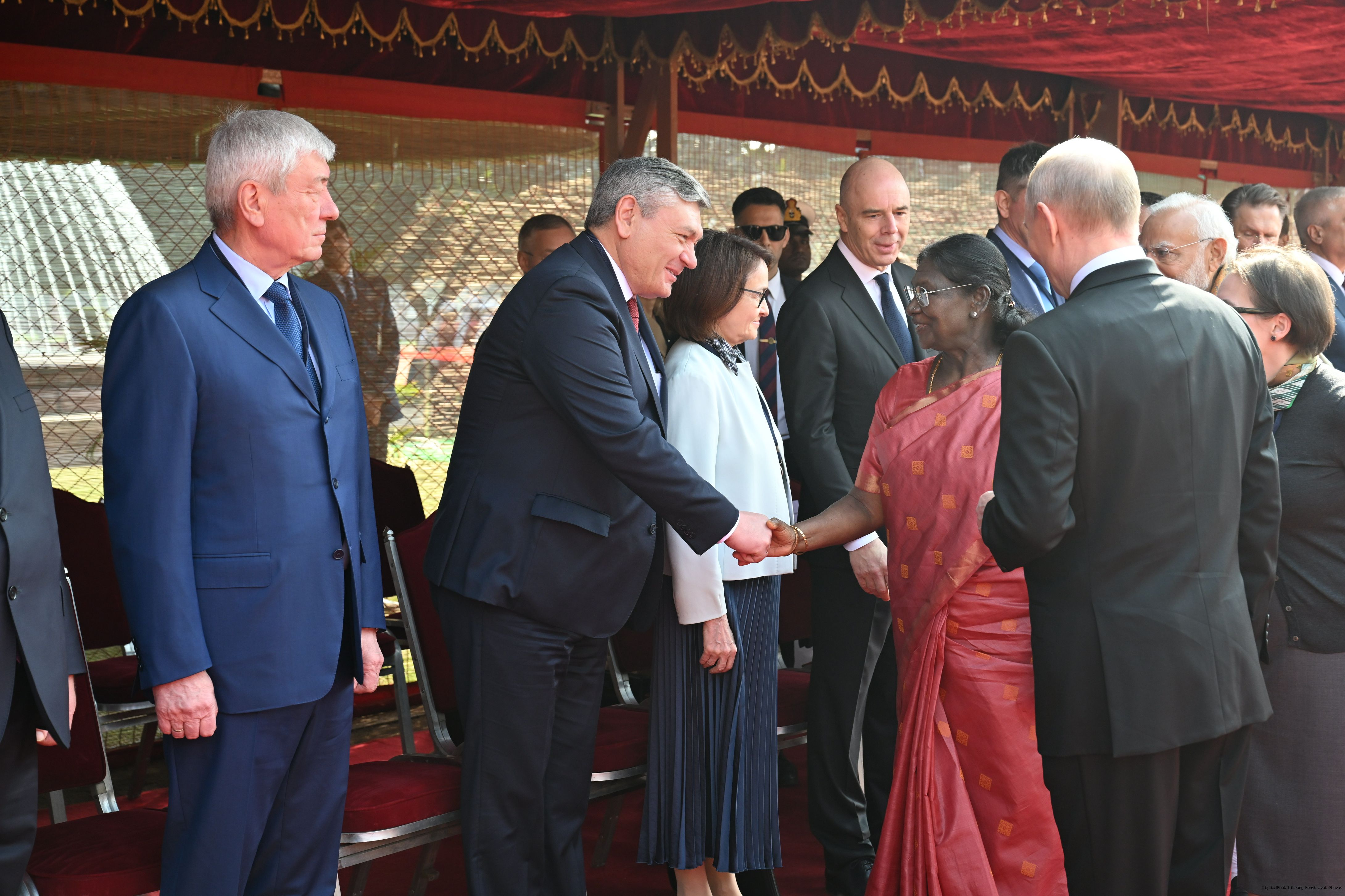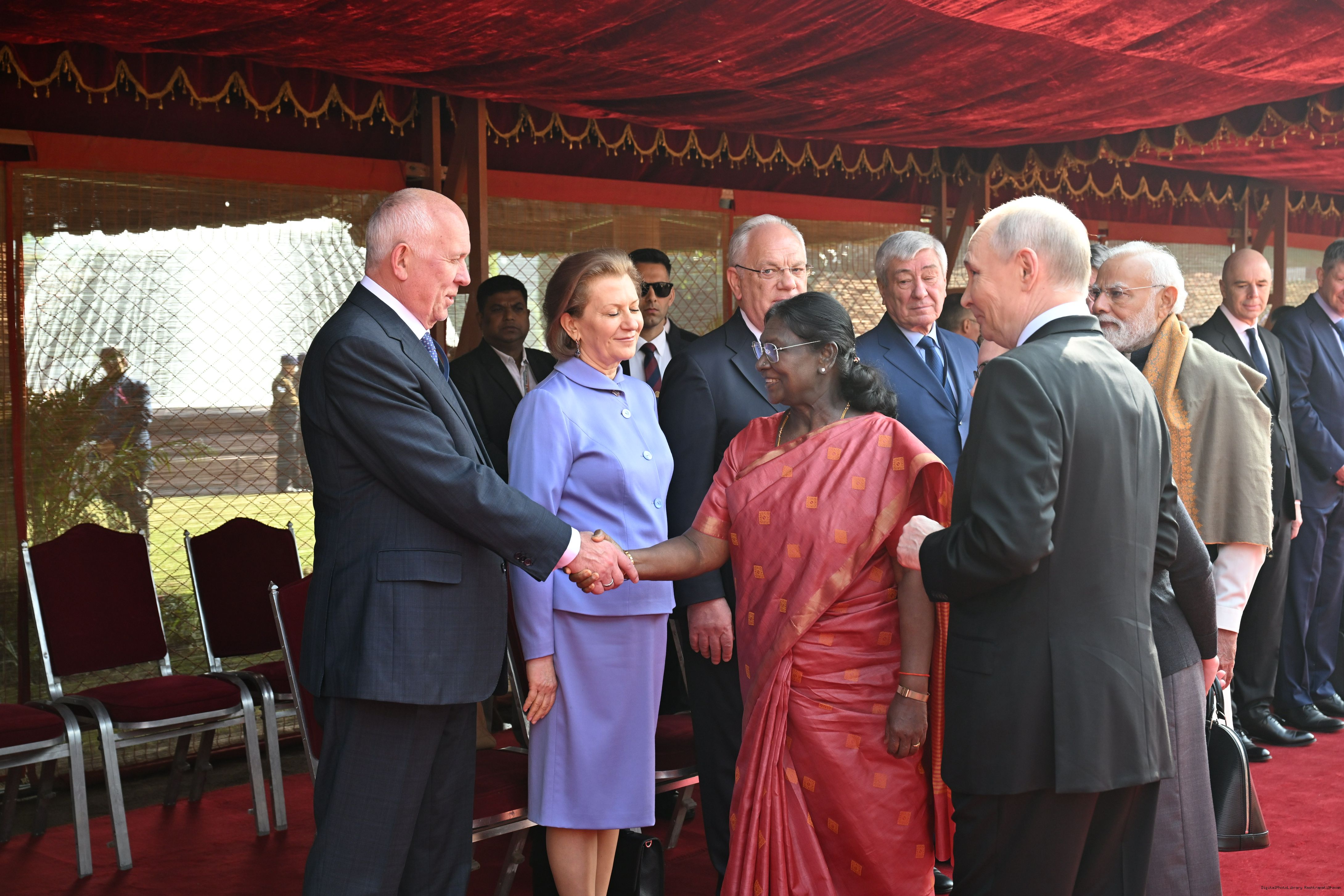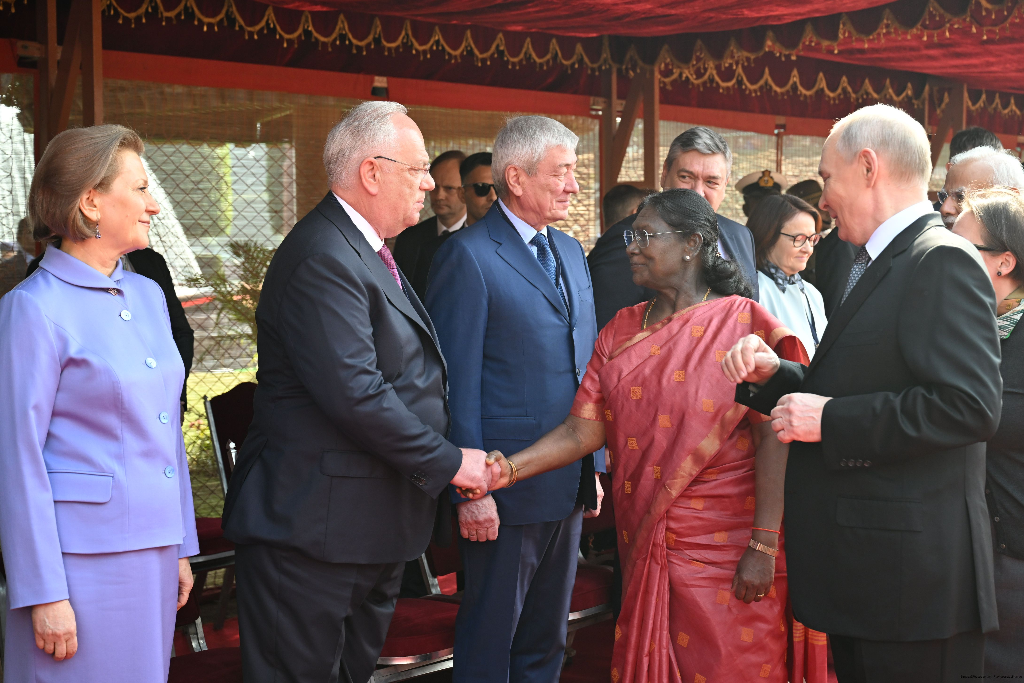 | Caption: | The President of India, Smt. Droupadi Murmu accorded a ceremonial welcome to H.E. Mr Vladimir Putin, President of the Russian Federation, at Rashtrapati Bhavan on December 5, 2025. |