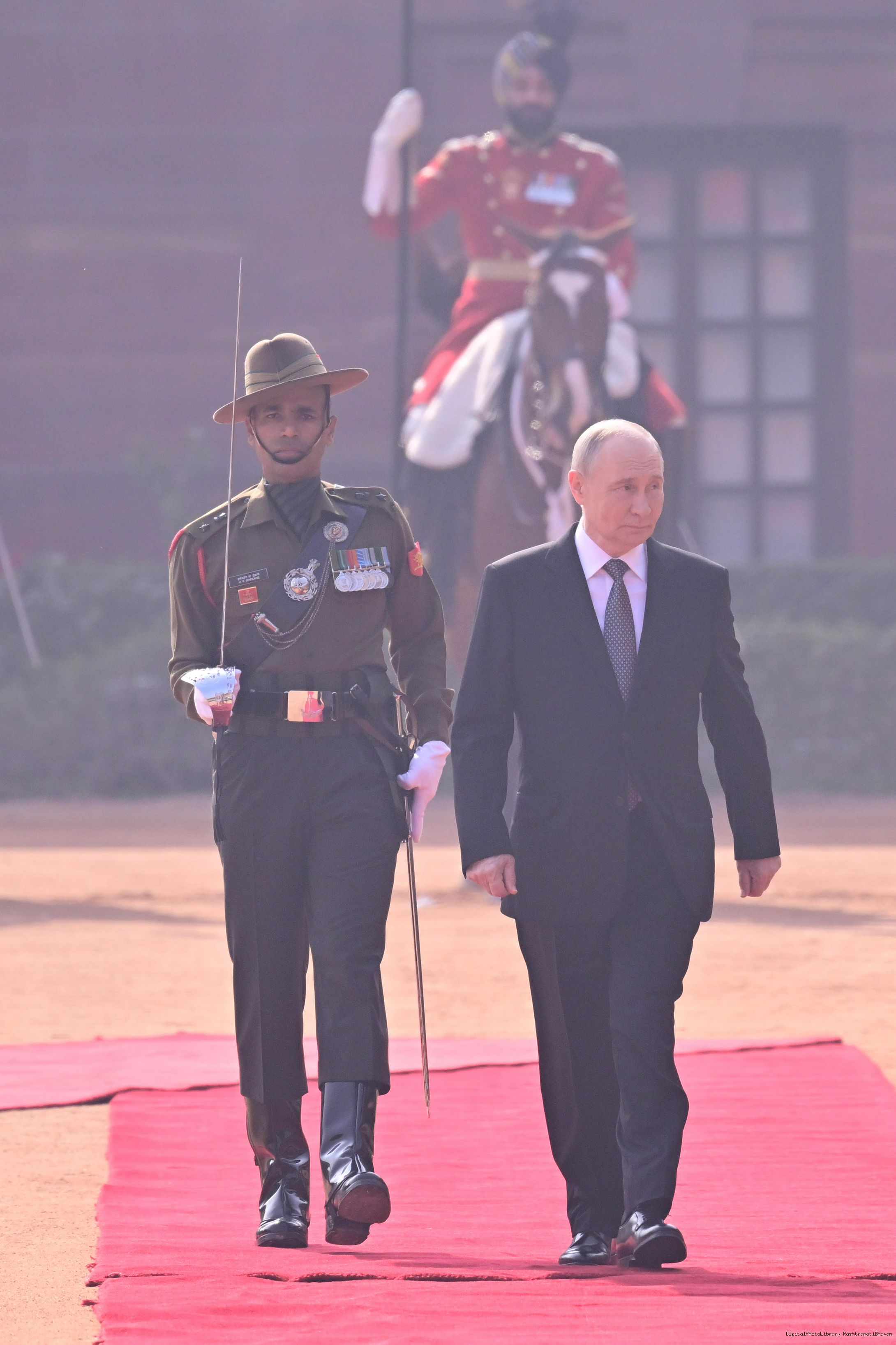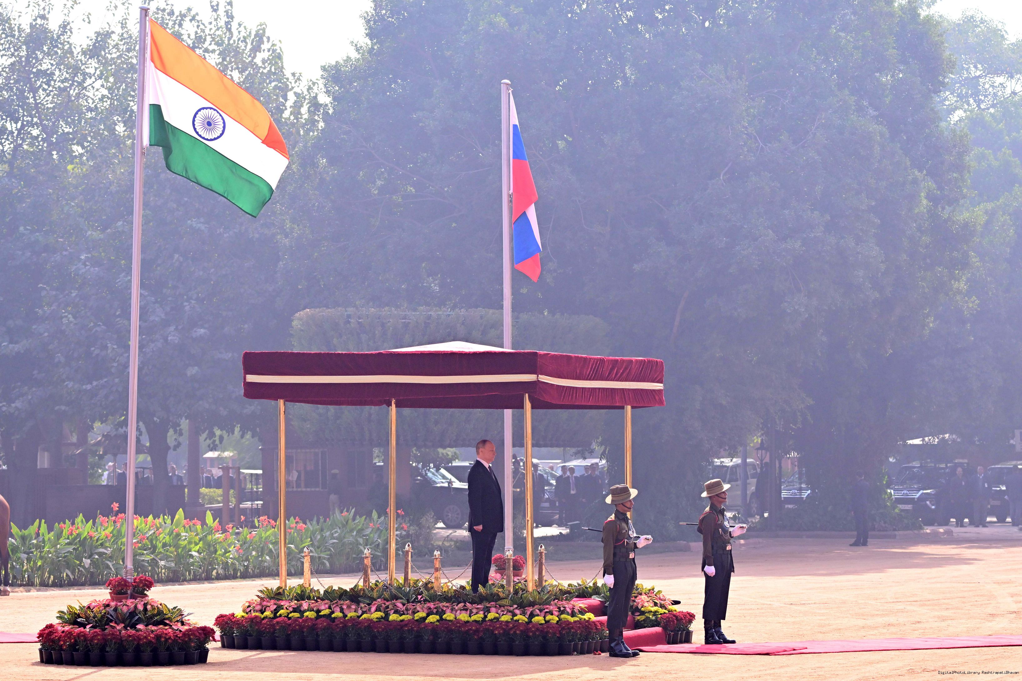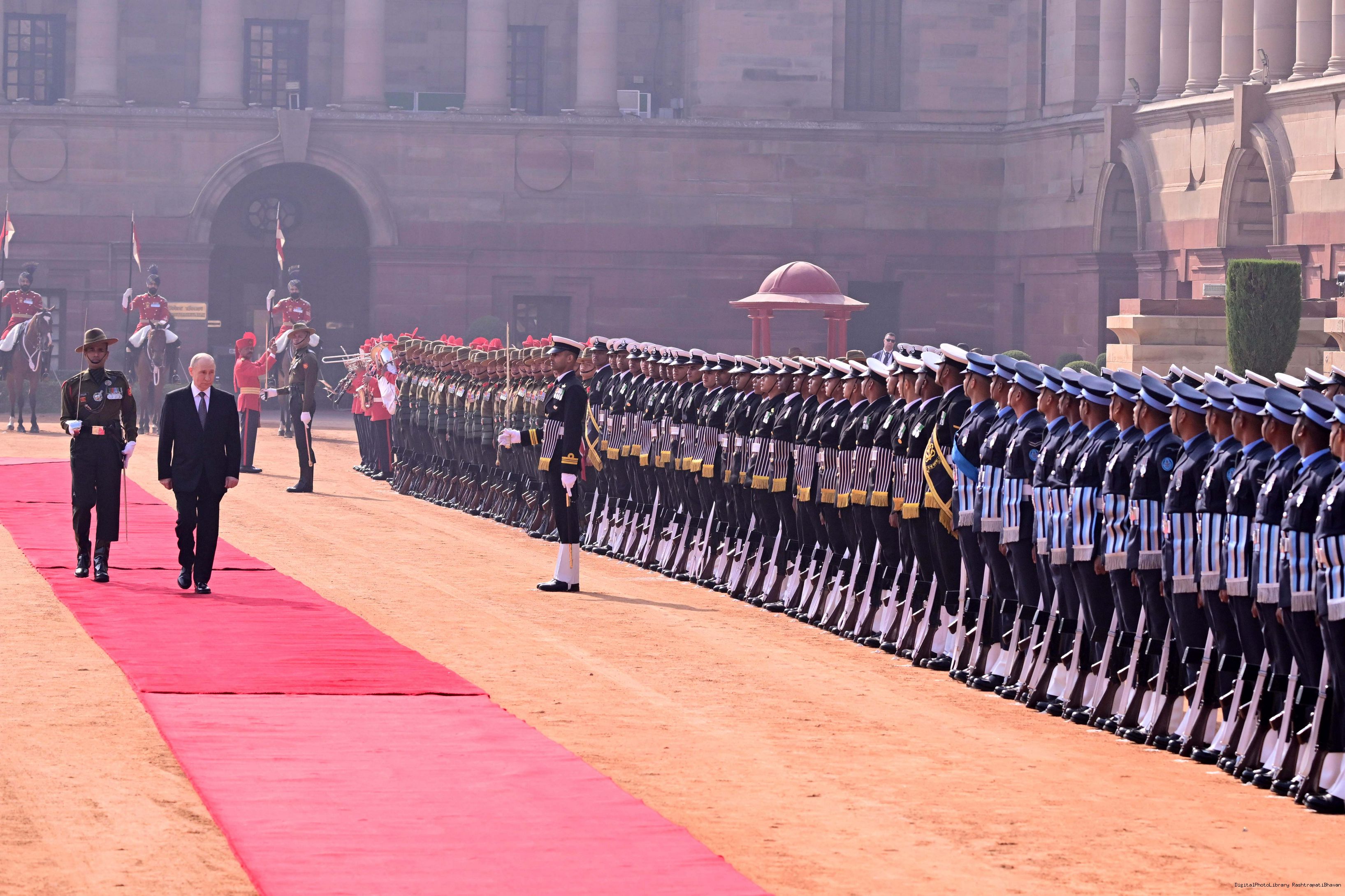 | Caption: | The President of India, Smt. Droupadi Murmu accorded a ceremonial welcome to H.E. Mr Vladimir Putin, President of the Russian Federation, at Rashtrapati Bhavan on December 5, 2025. |