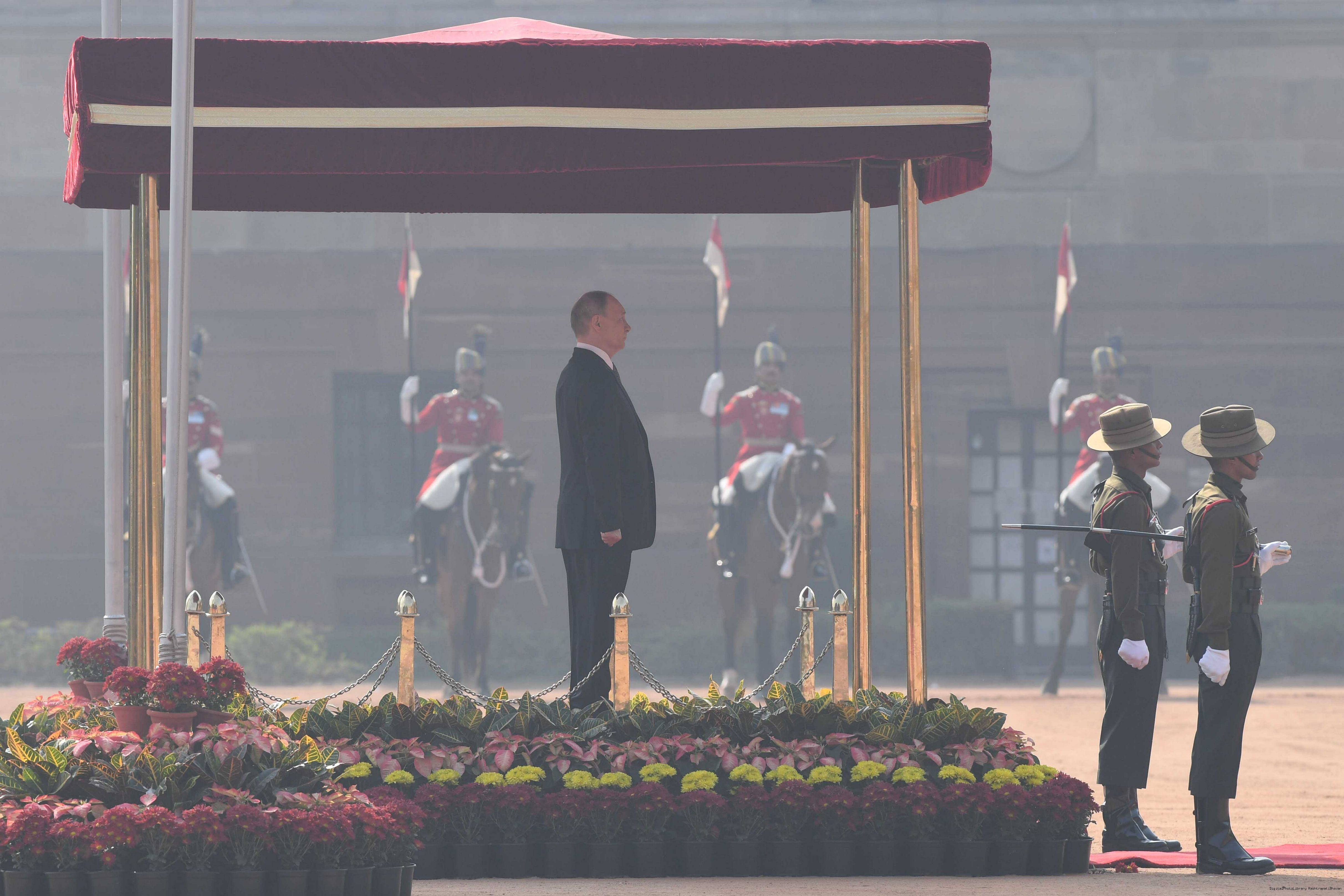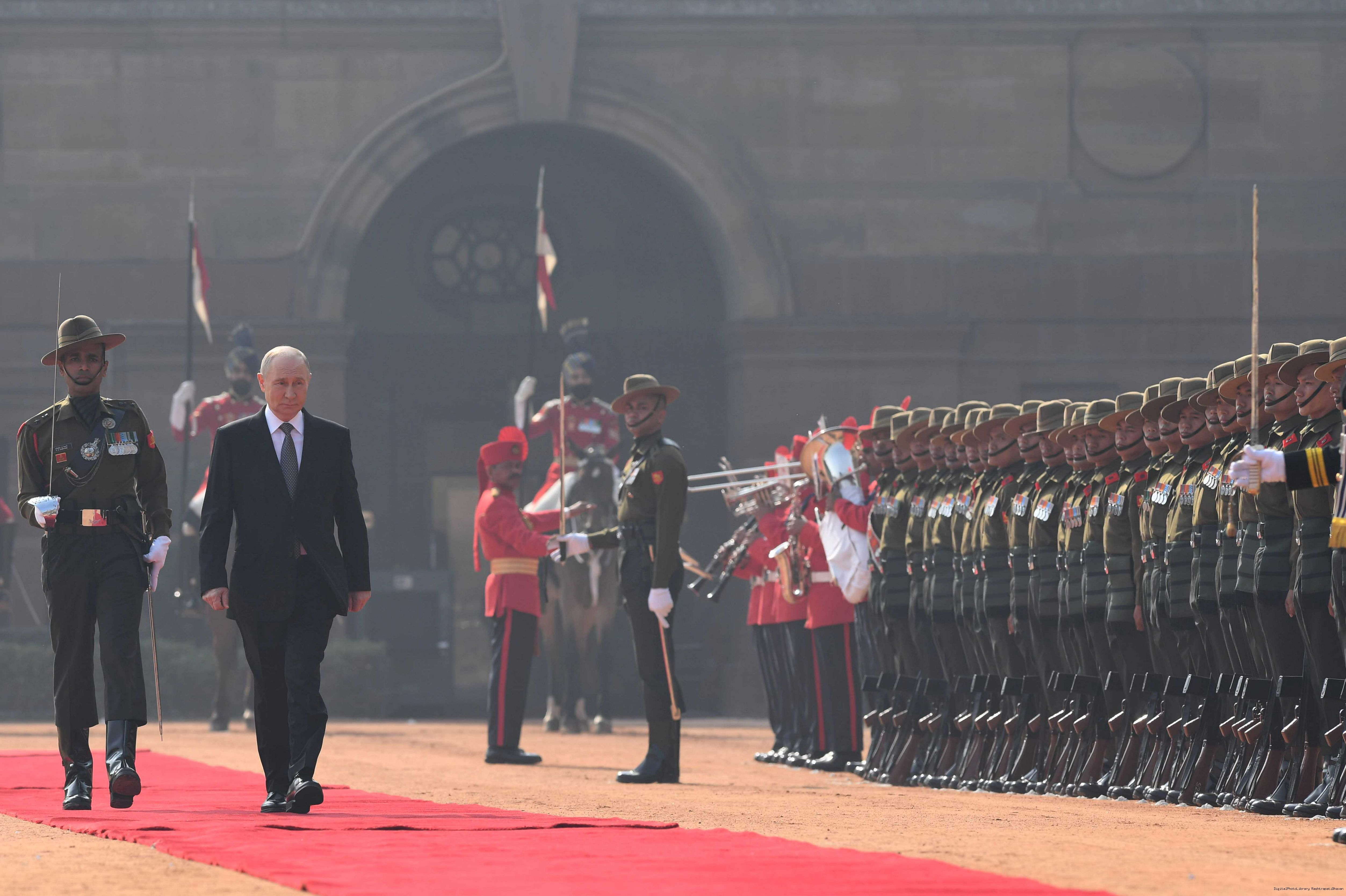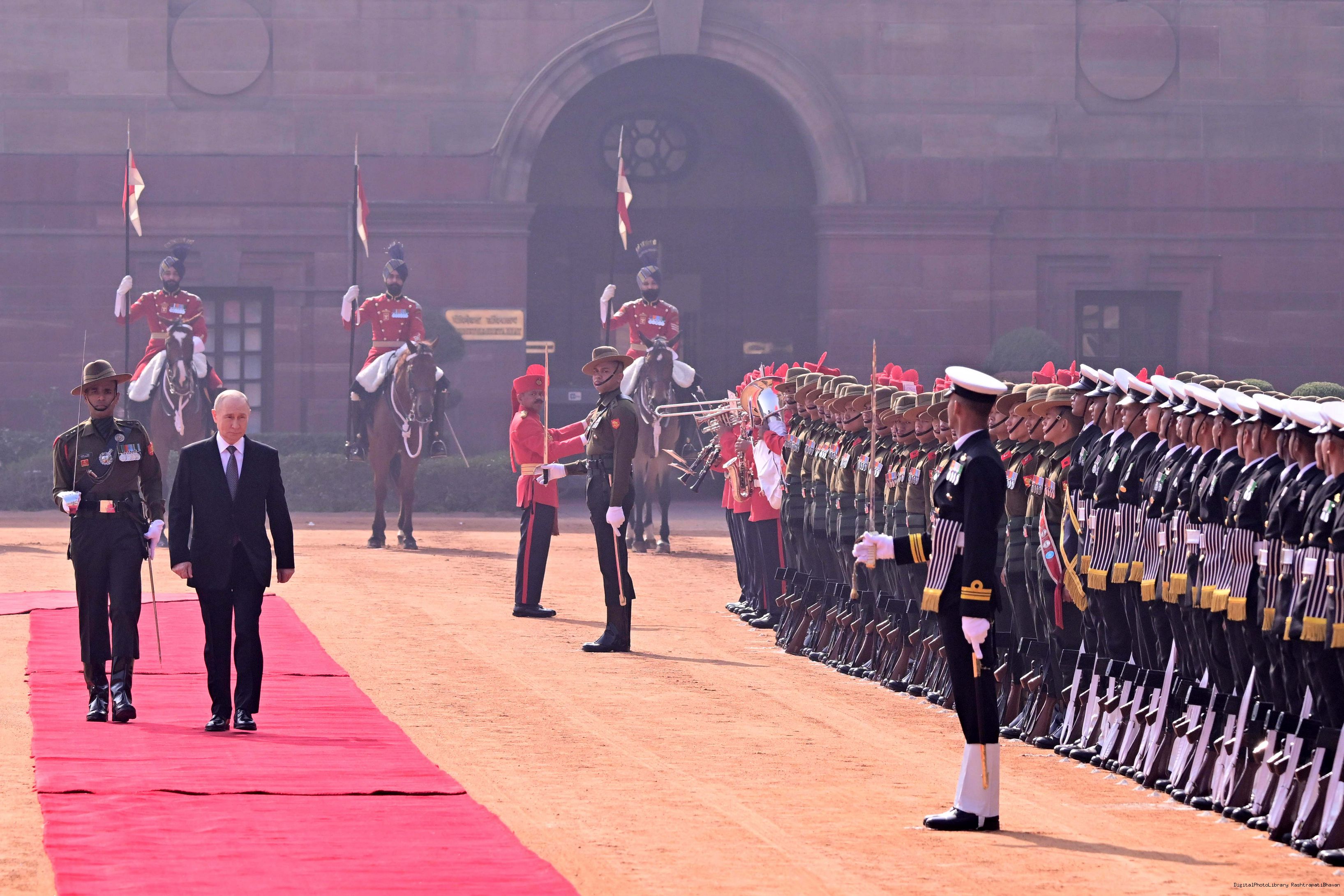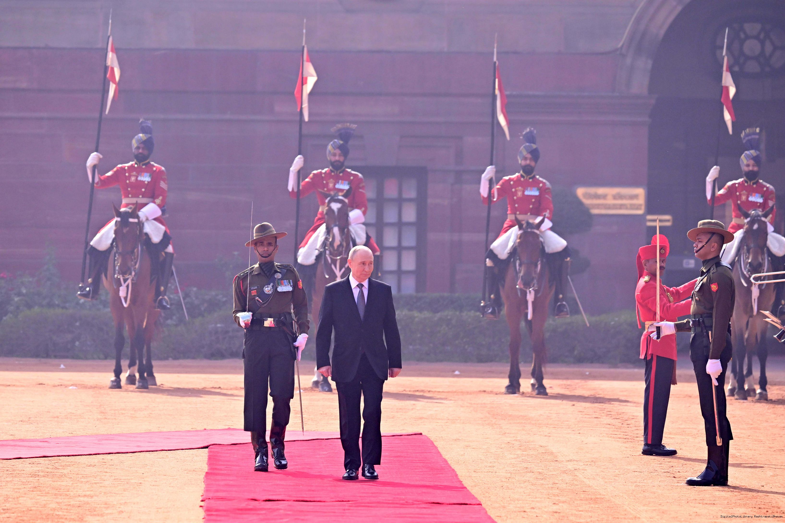 | Caption: | The President of India, Smt. Droupadi Murmu accorded a ceremonial welcome to H.E. Mr Vladimir Putin, President of the Russian Federation, at Rashtrapati Bhavan on December 5, 2025. |