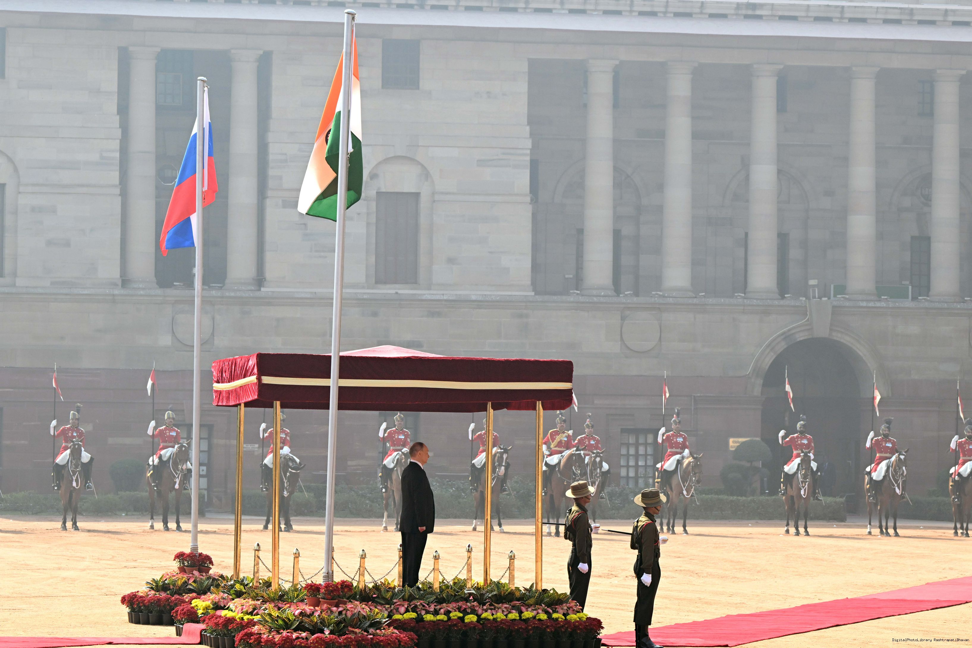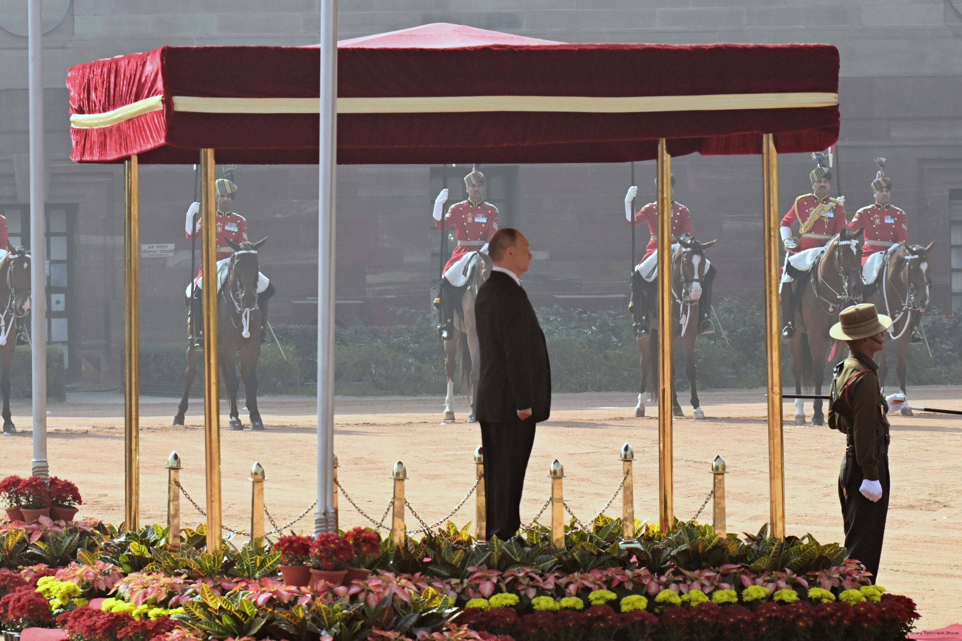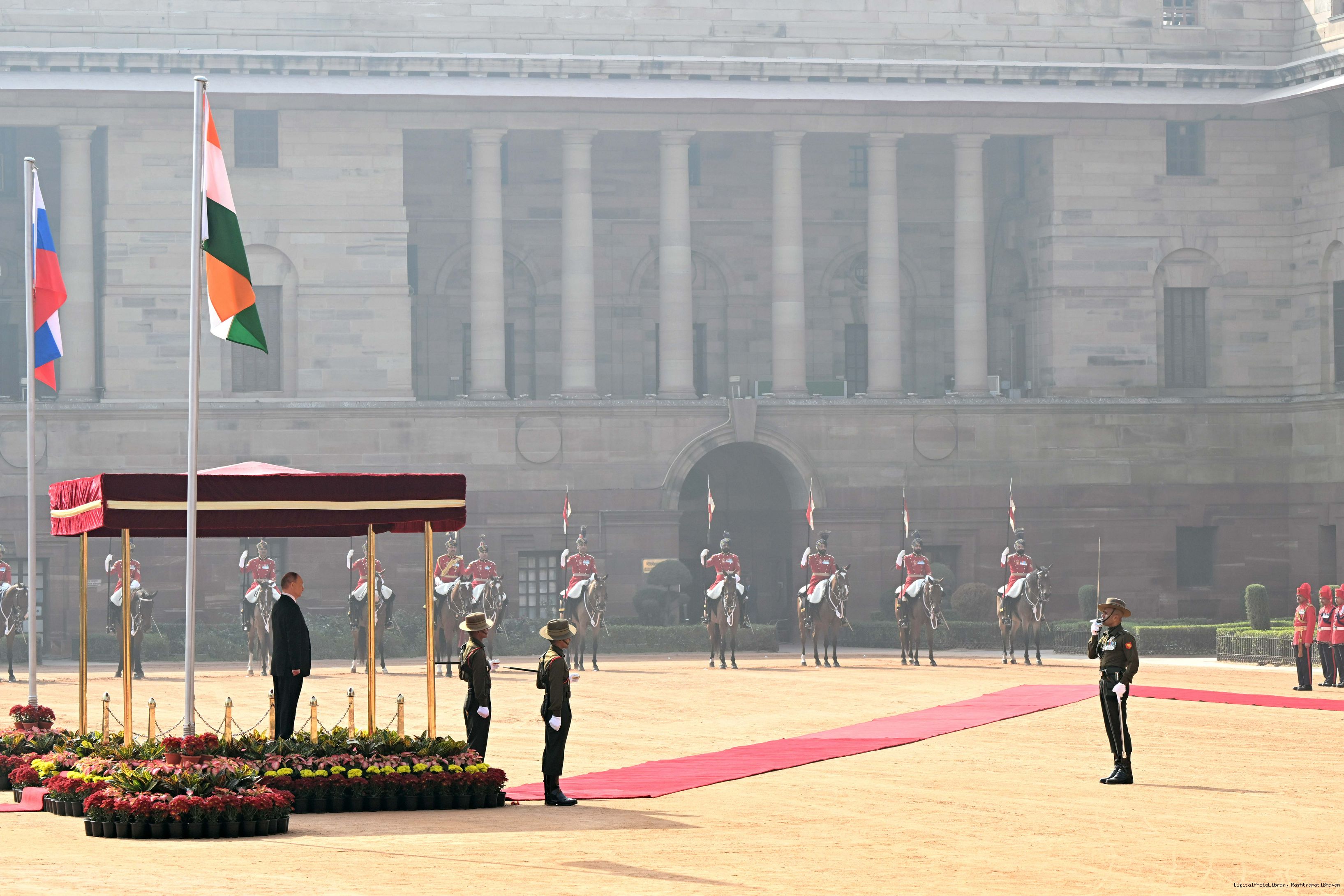 | Caption: | The President of India, Smt. Droupadi Murmu accorded a ceremonial welcome to H.E. Mr Vladimir Putin, President of the Russian Federation, at Rashtrapati Bhavan on December 5, 2025. |